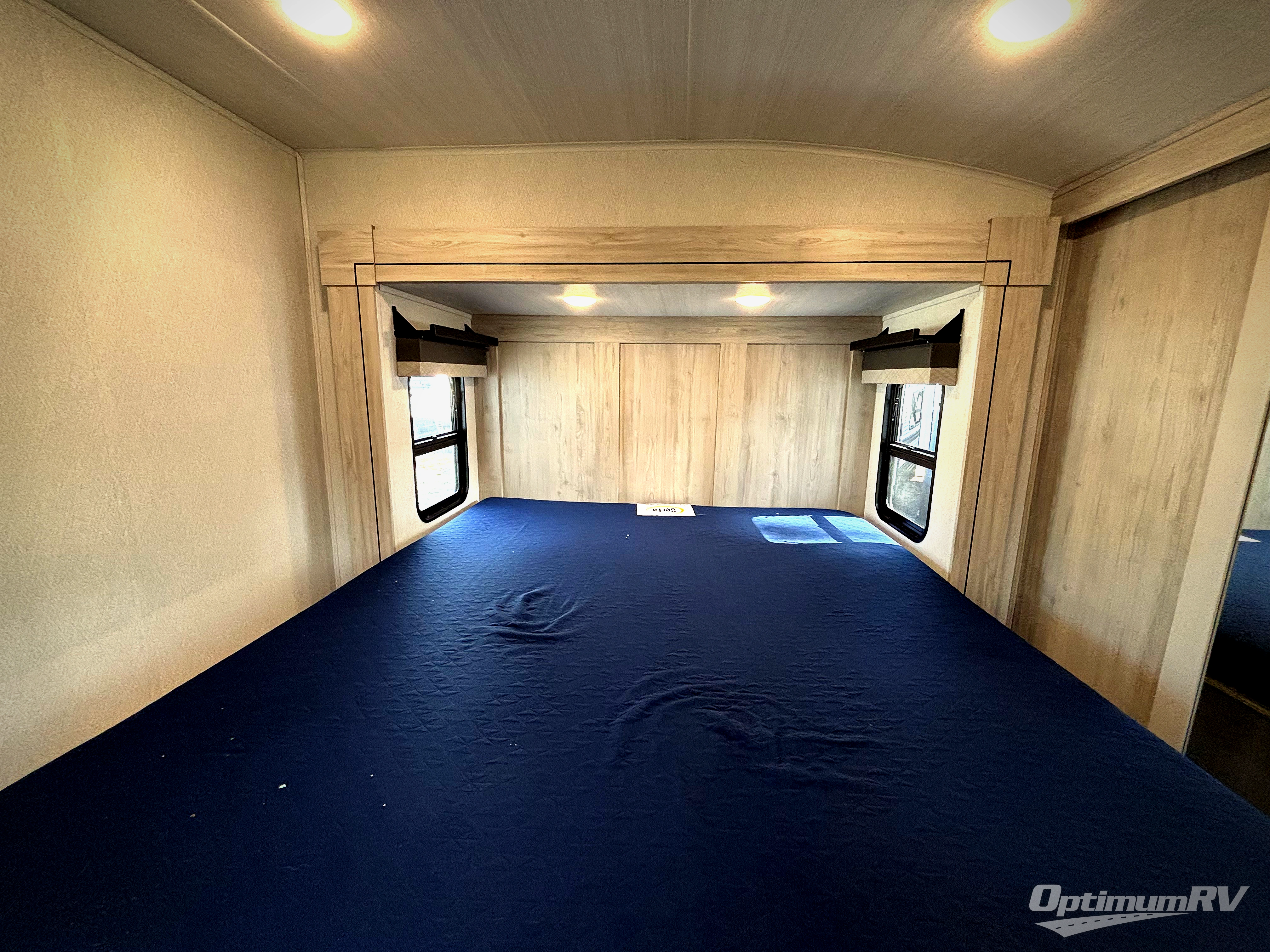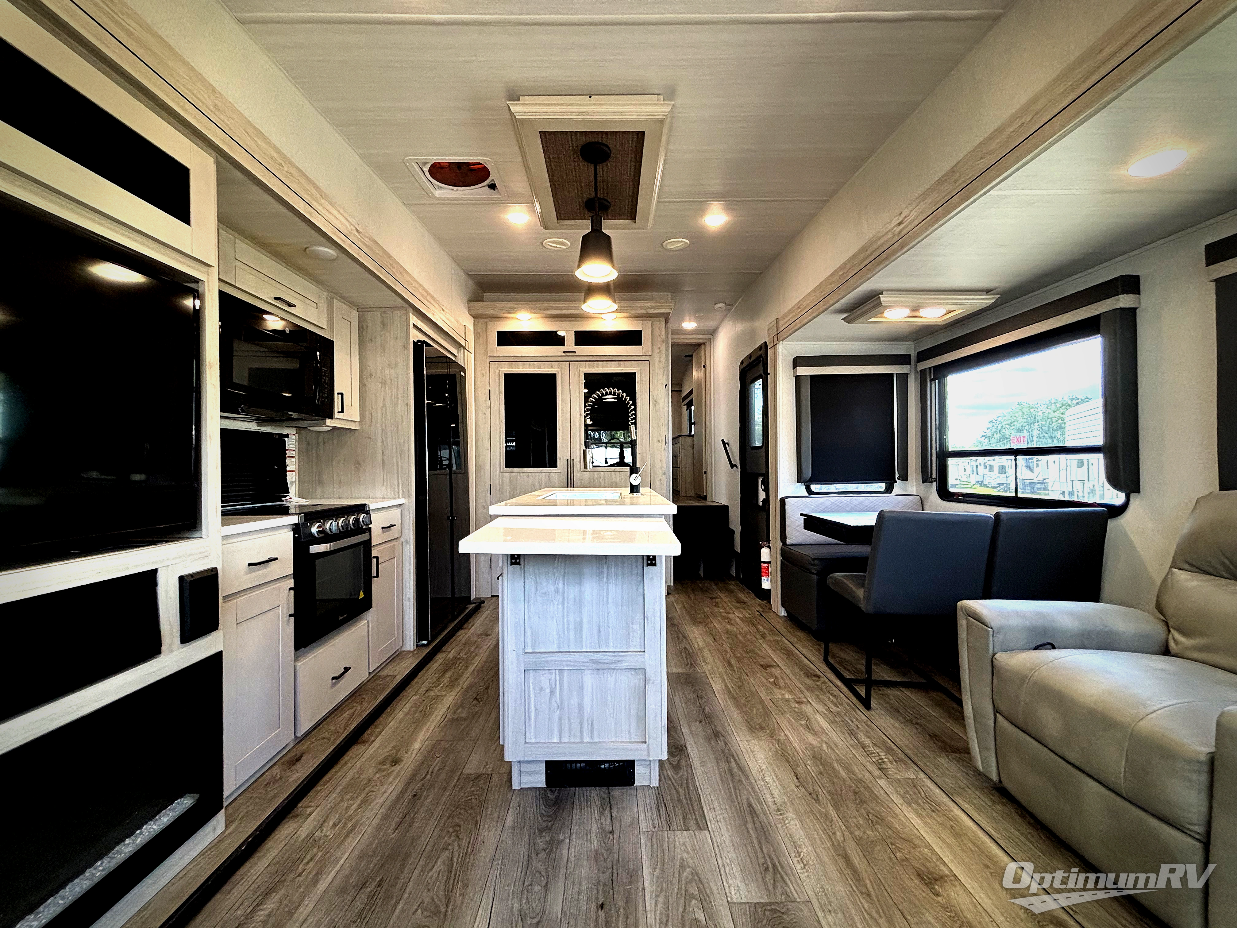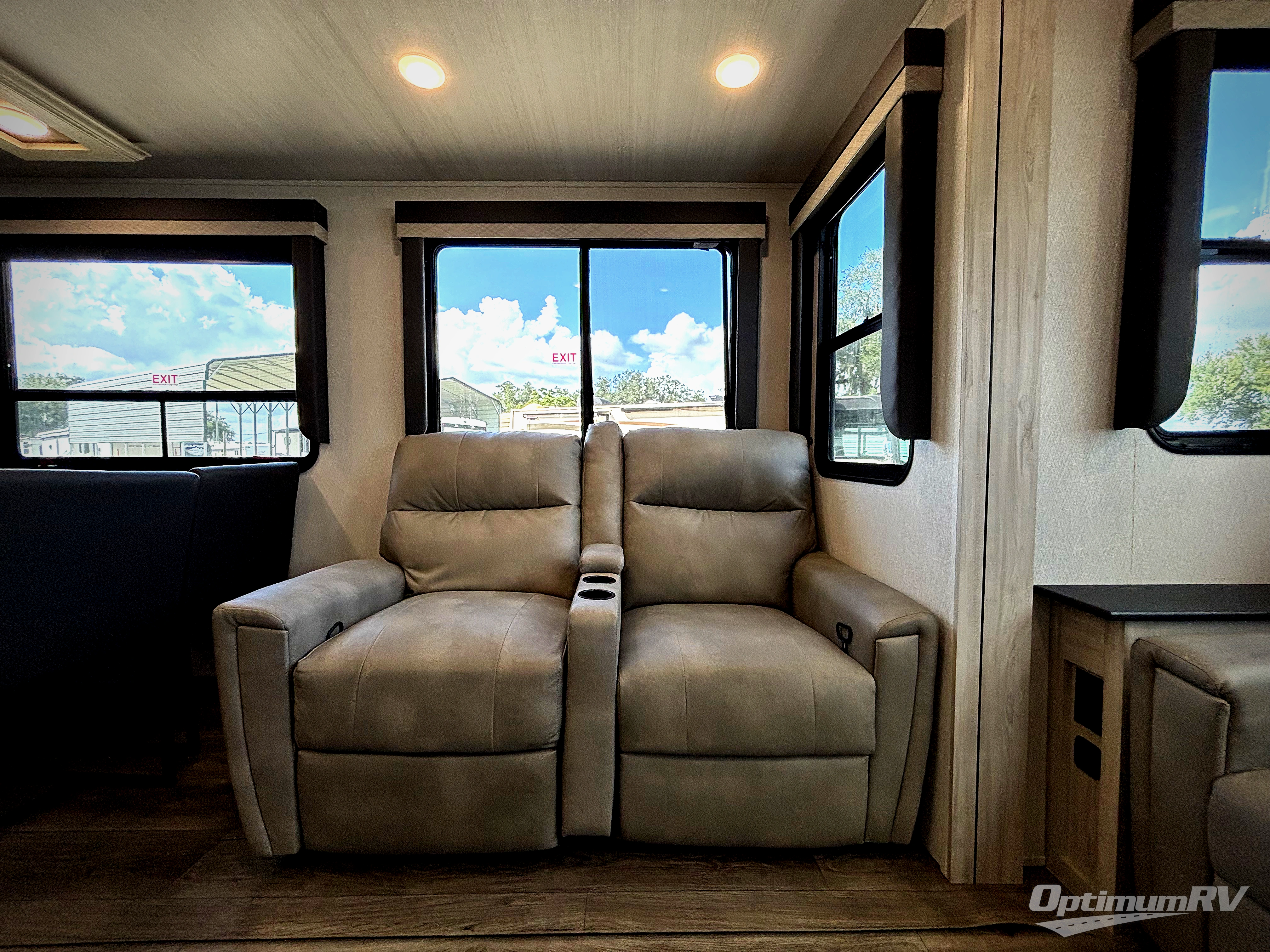 Take this Tandara fifth wheel out to the campsite and experience luxury while you camp! You will have a front private bedroom that is quite impressive with its full-width wardrobe, king bed slide with bedside shelves, under-bed storage, and a dresser with a TV prep area. The kitchen island is easy to gather around while you're cooking dinner or enjoying a late-night snack, and the hide-a-bed sofa will be comfortable for lounging or sleeping. As you spend time outside under the two electric awnings, you can grab some extra charcoal or camping chairs from the oversized pass-through storage.