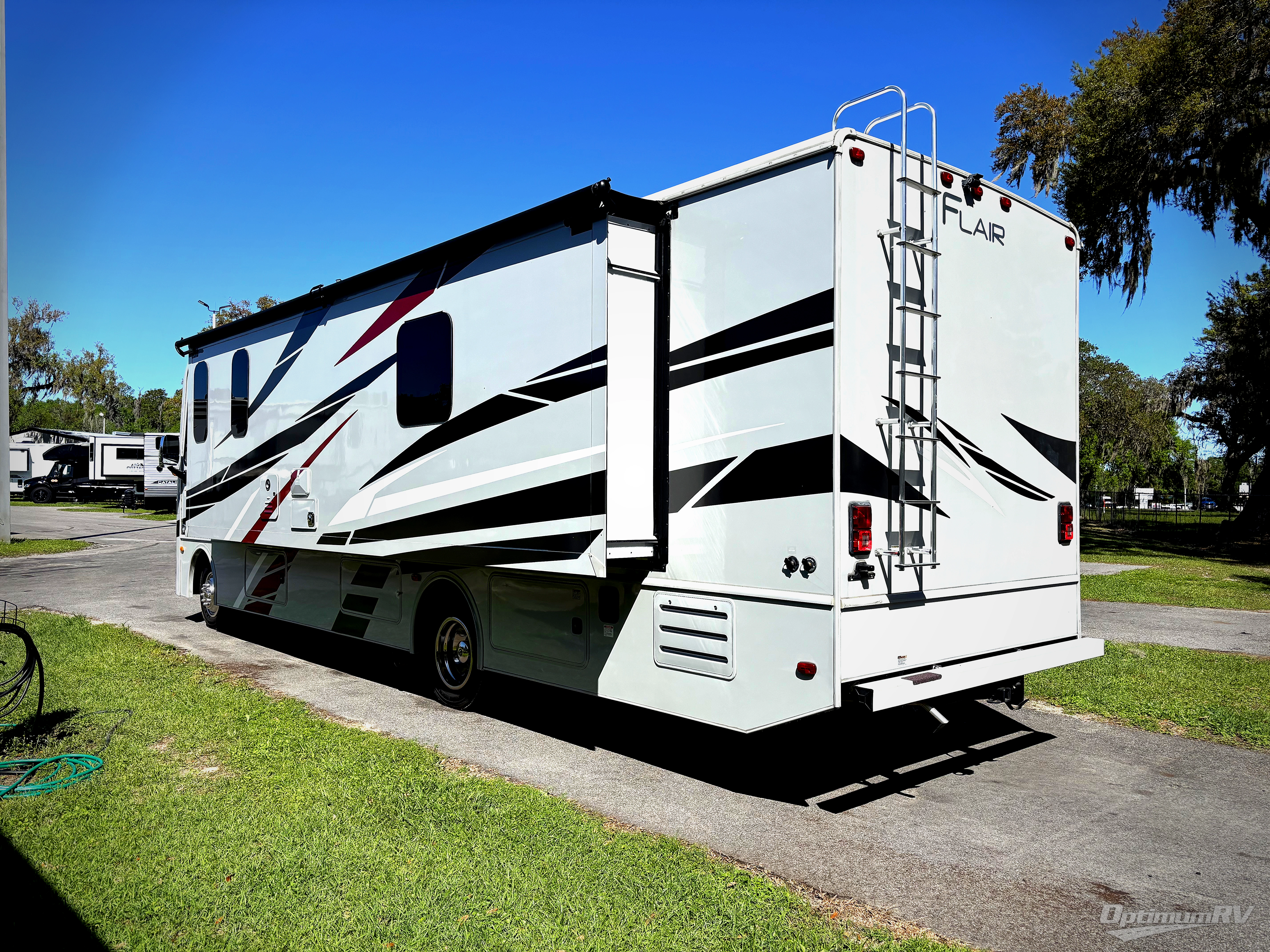 Step up your camping game by adding the Fleetwood Flair Class A gas motorhome to the line-up! The 7.3L 350HP engine with 468 LB/FT of torque forms the base, and the 8,000-LB towing capacity gives you the chance to bring a car with your coach. On the exterior you'll find an automotive, bonded one-piece windshield, exterior-mounted sideview cameras, and an exterior LED TV. The interior is decked out with a Sony dash radio, an all-new electronic instrument panel, a digital dash, and reclining/swivel cab chairs. There is also a workstation at the automotive-style dash, and the Bluetooth coach system in the bedroom has exterior speakers for fun party nights.