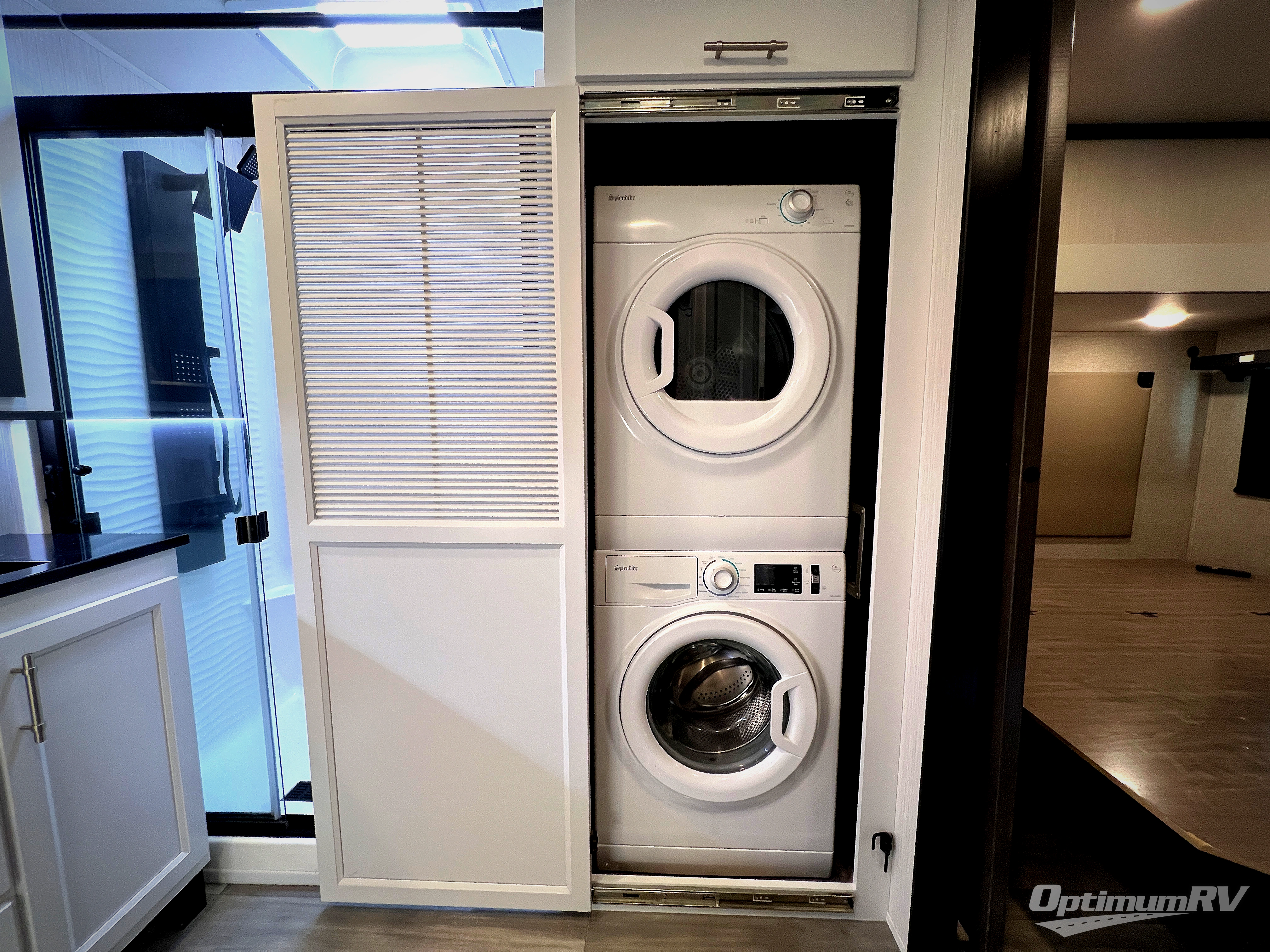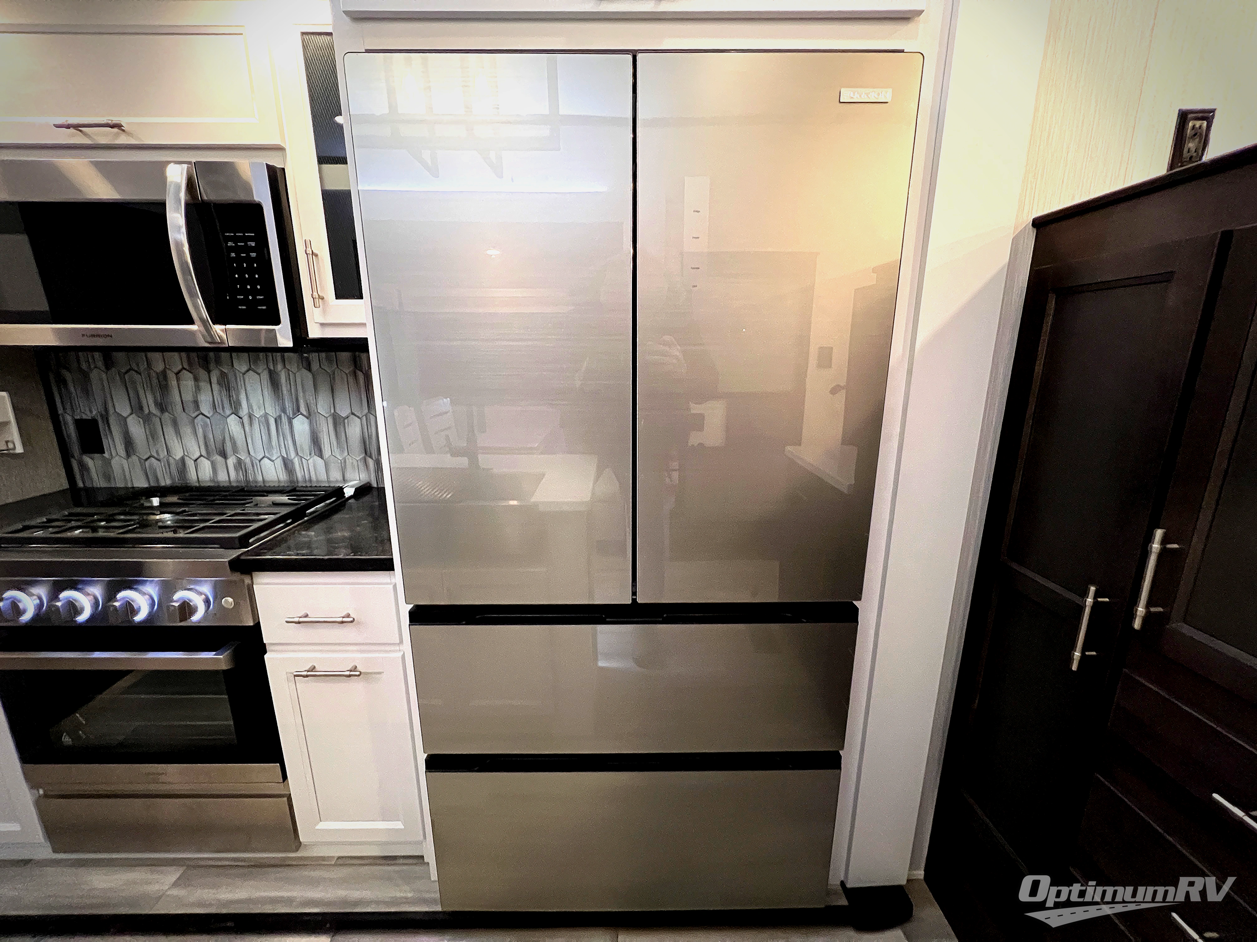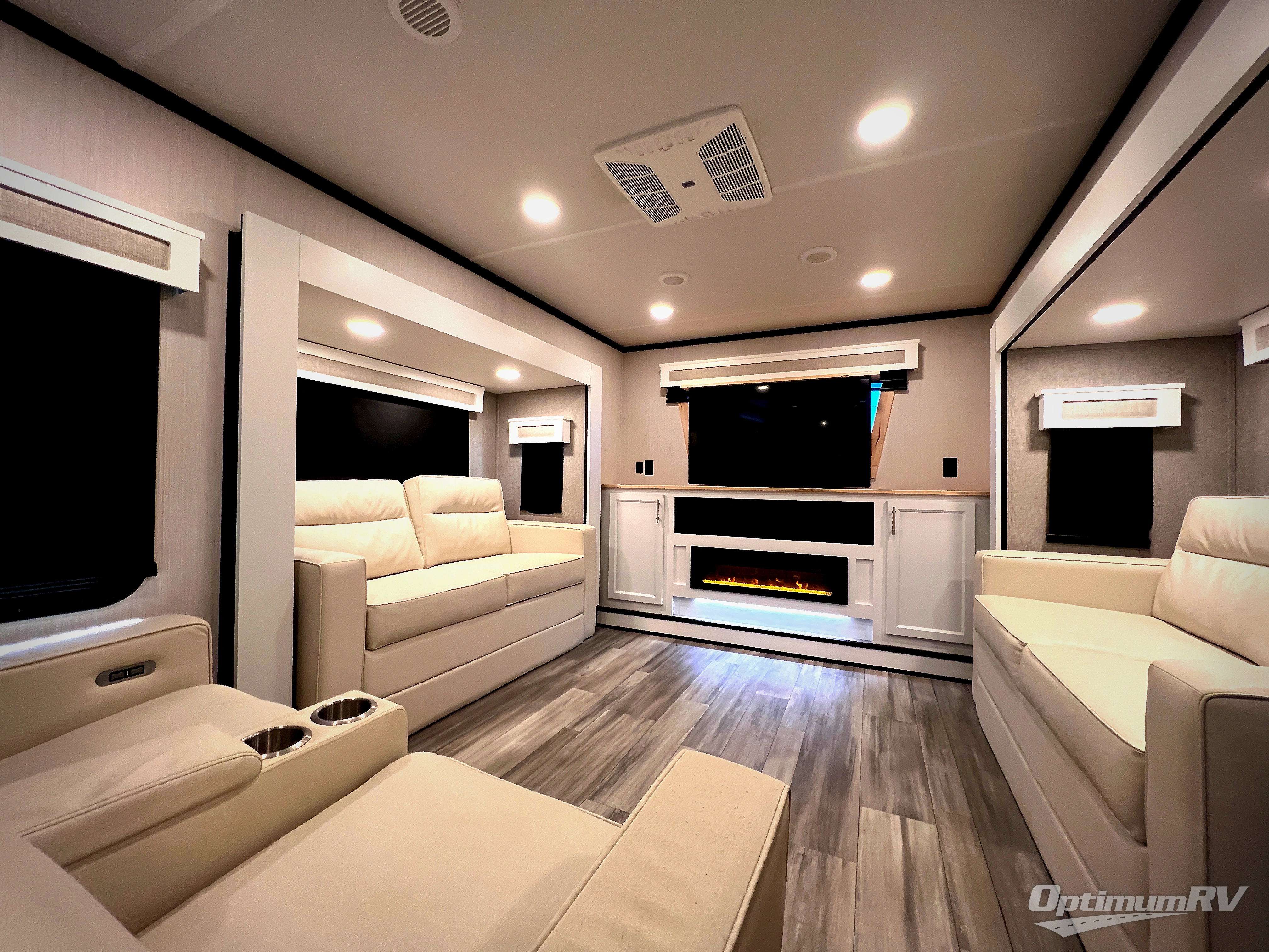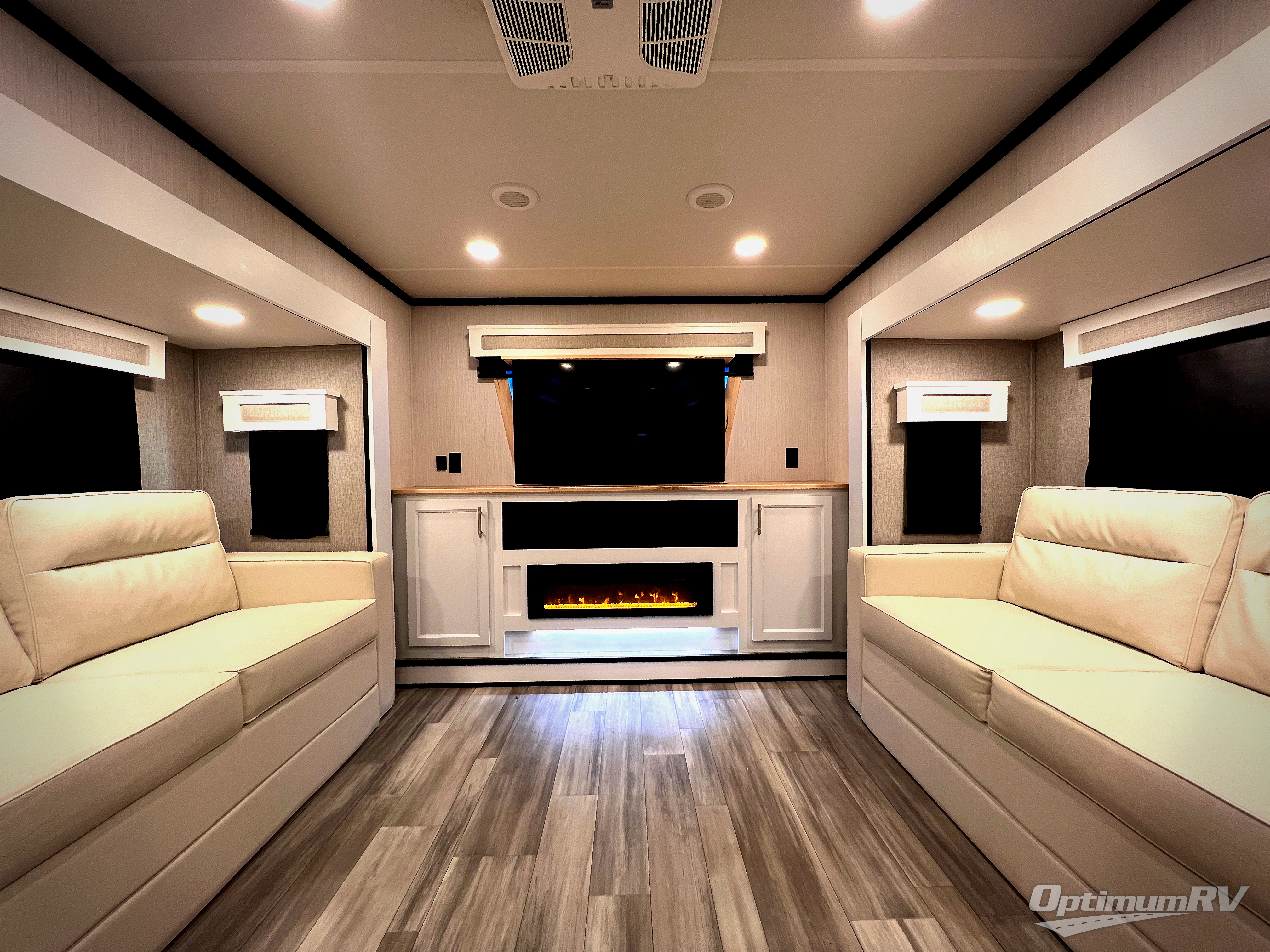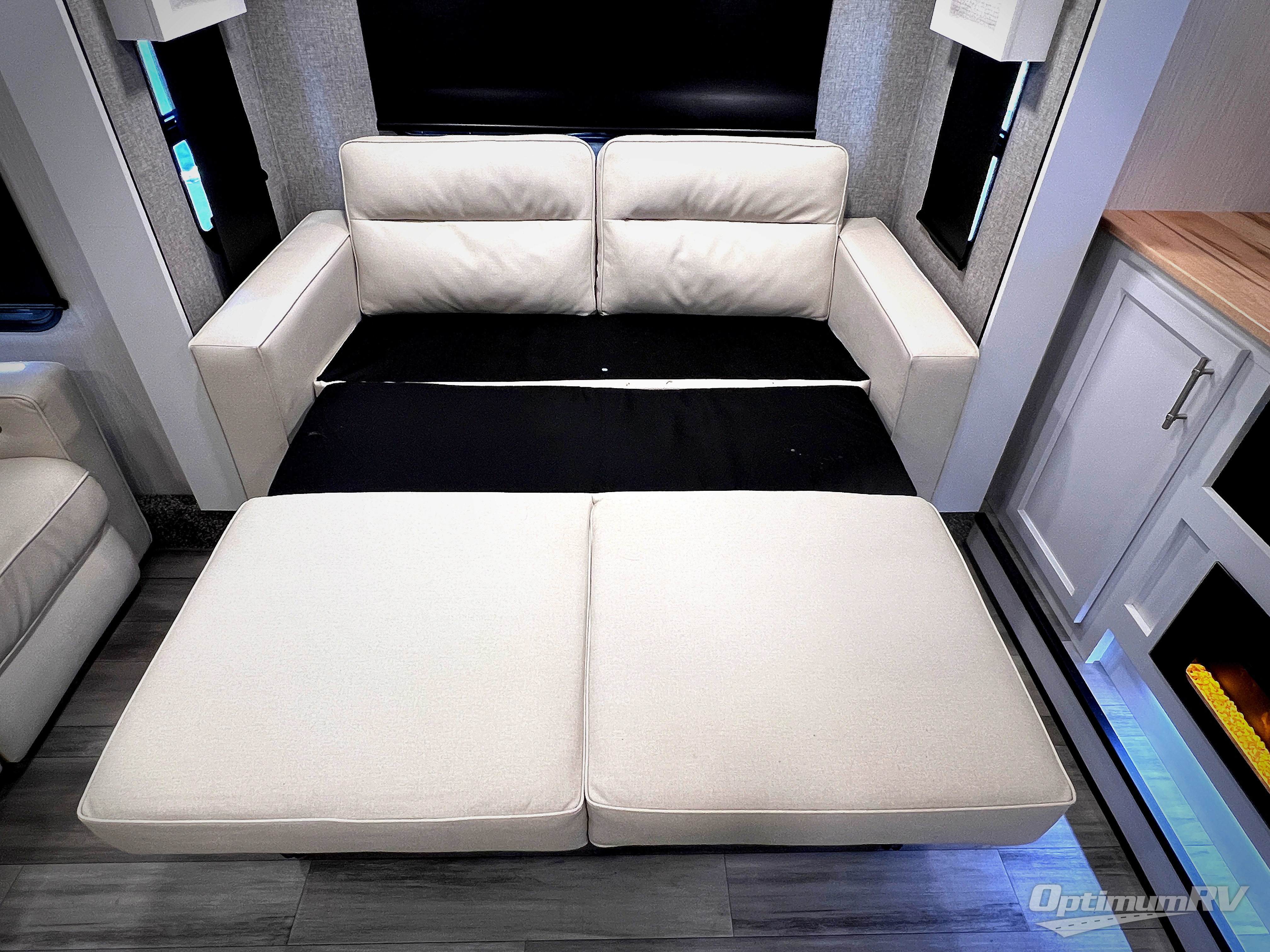 This fifth wheel has everything and then some! The front living area has opposing tri-fold sofas and power theater seating across from the front entertainment center with a fireplace and hidden telescoping TV. The chef can prepare their best meals with the kitchen island with a fold-down breakfast counter, and there is a 20 cu. ft. 12V refrigerator for food storage. Enjoy your meals and the extra space provided with the wall mounted dining table with an extension and an ottoman. The master suite has a king bed slide to lay your head at night and access to the full rear bathroom which has a shower with a seat, a linen closet, washer/dryer prep, and a dual sink vanity. You'll also find drop-down storage underneath the bath/bedroom so nothing gets left behind. And the convenient half bath can be traded out for an optional bonus pantry if you don't need the half bath!