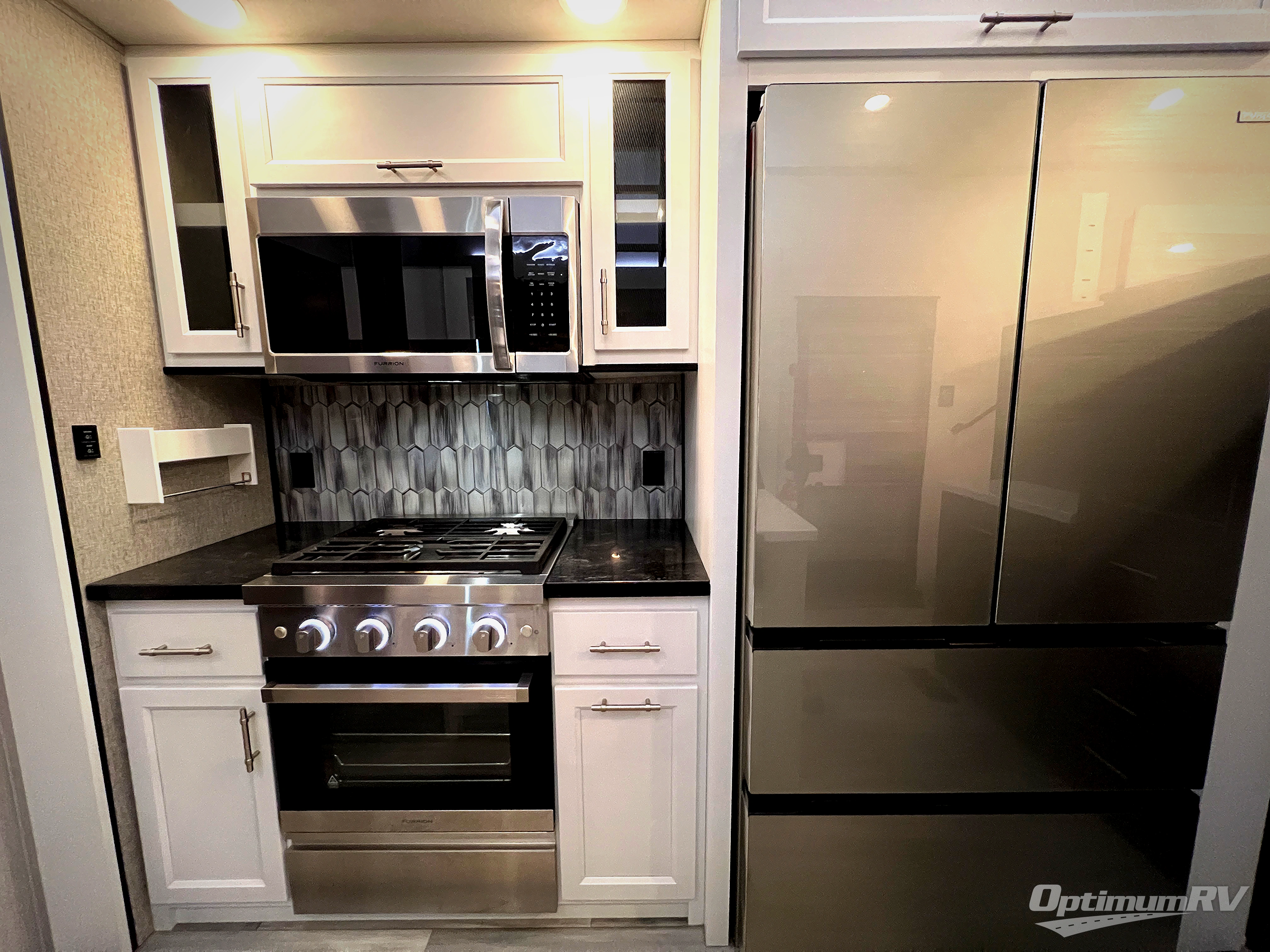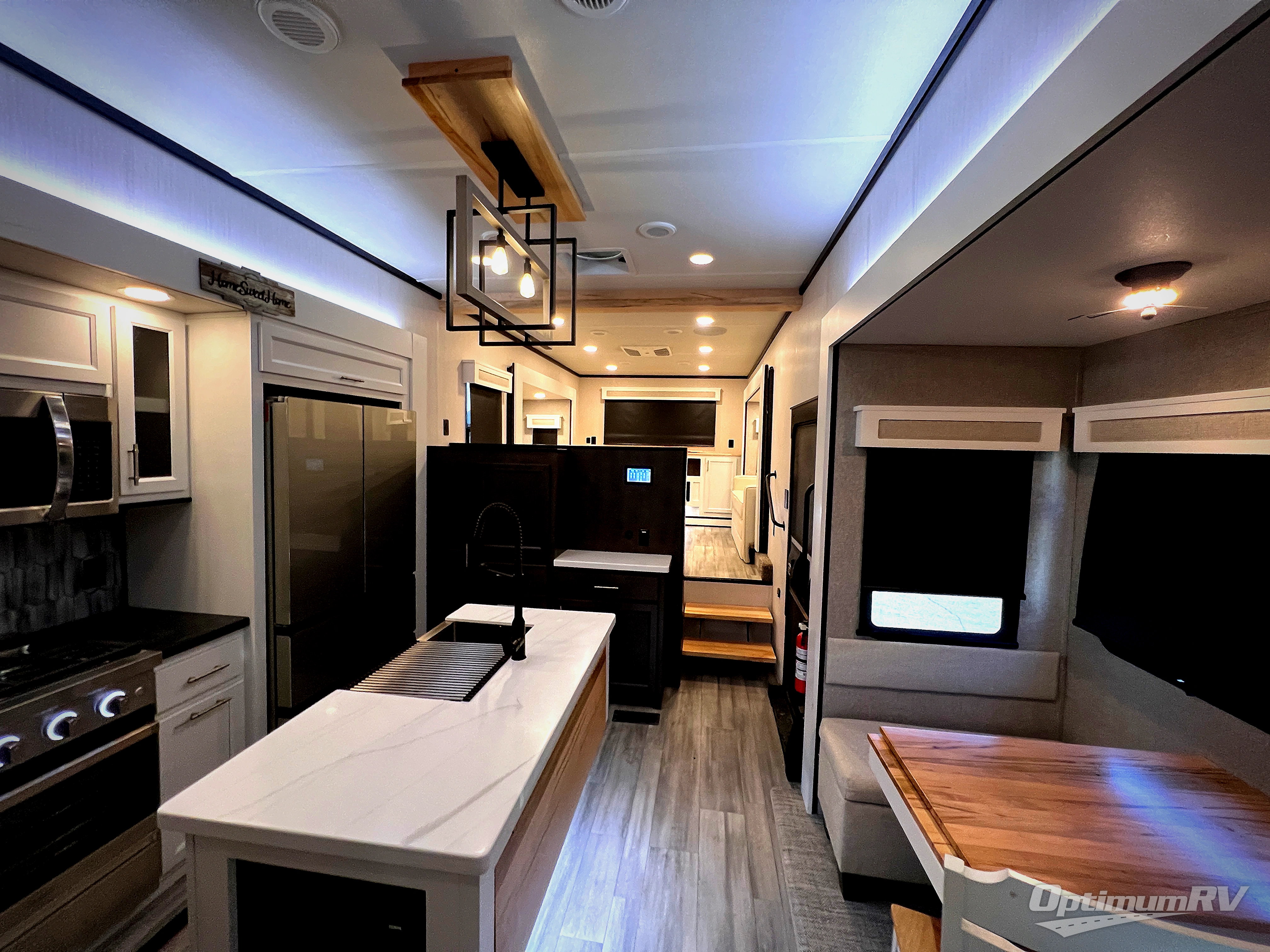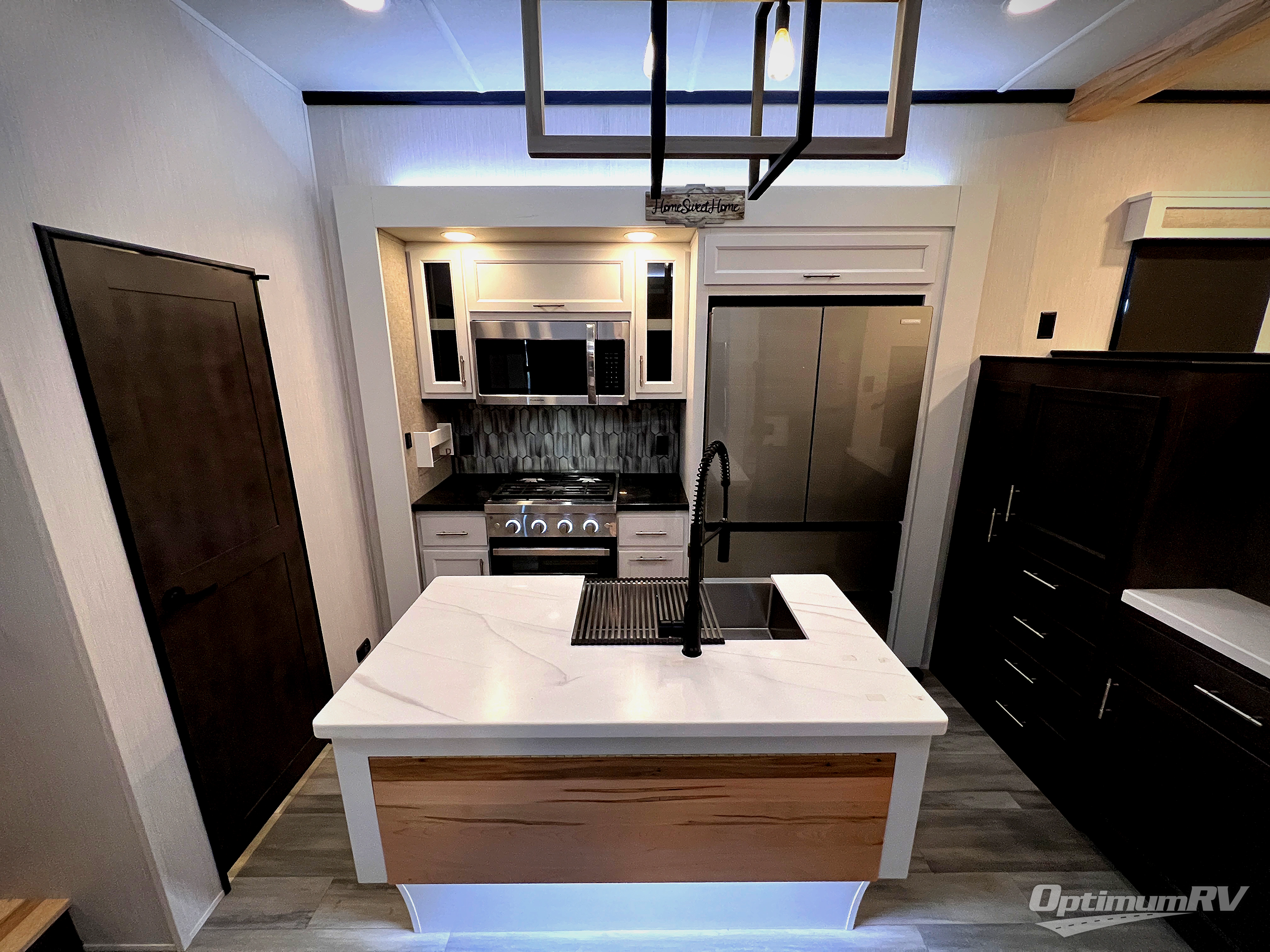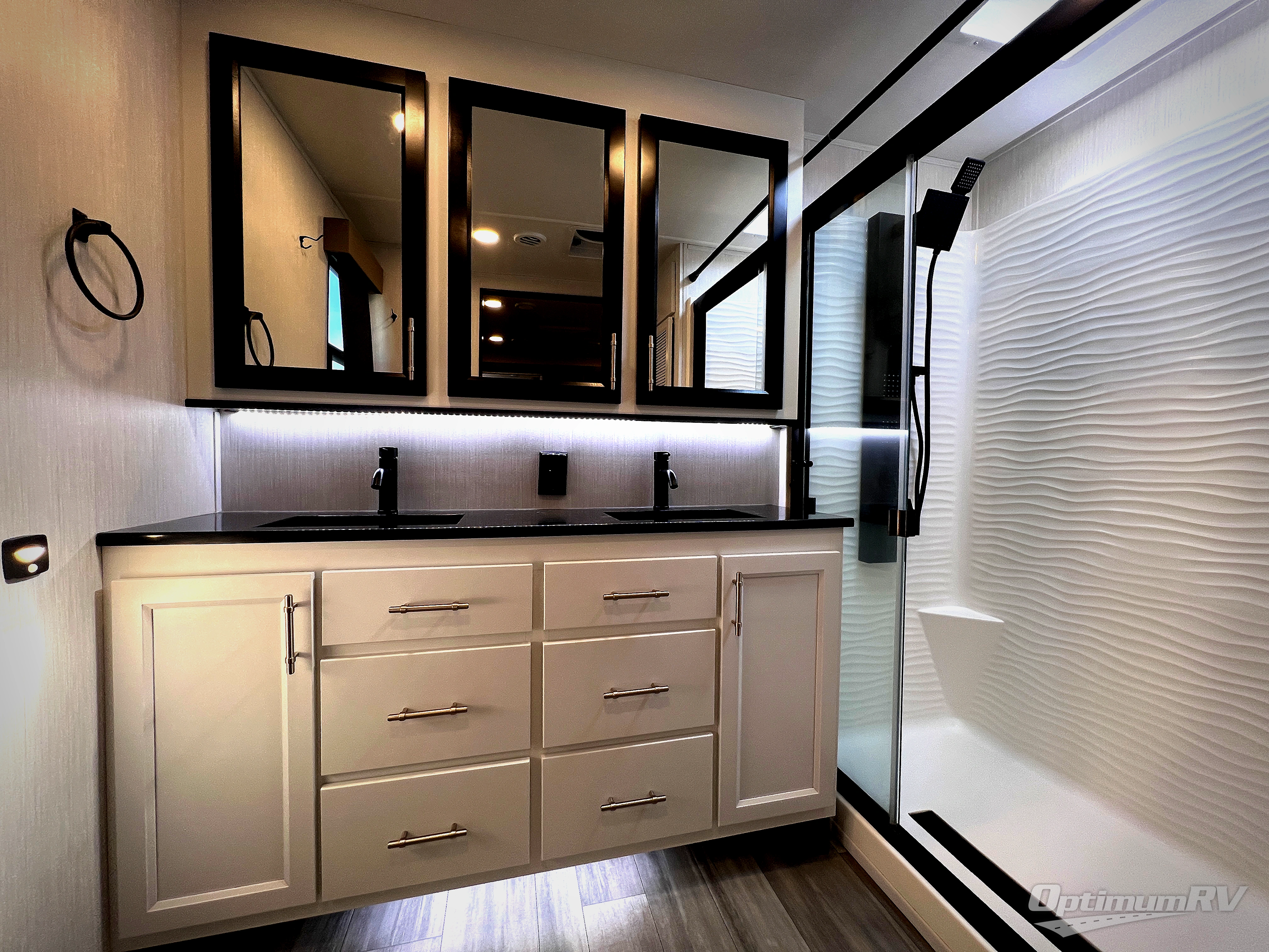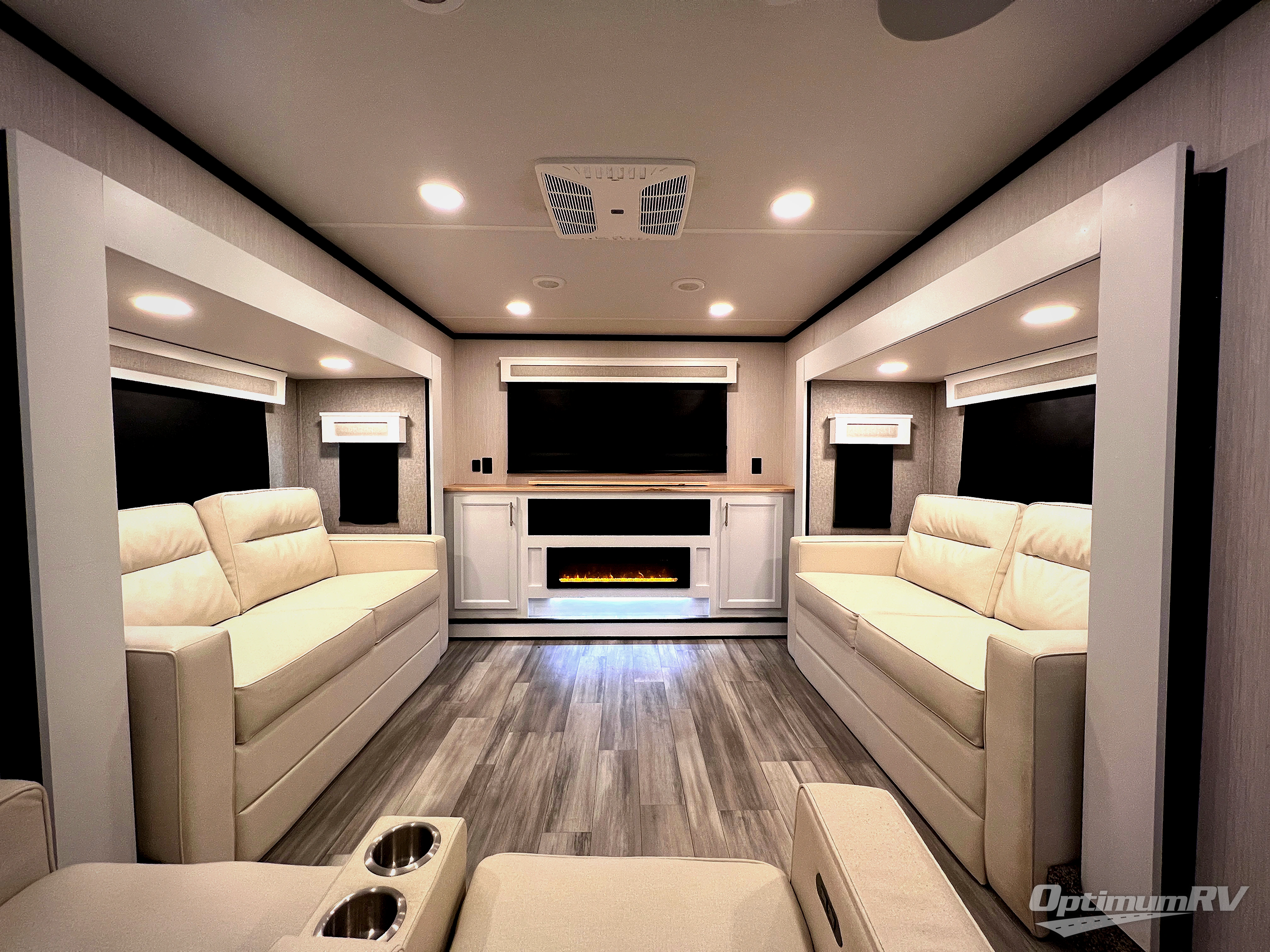This fifth wheel has everything and then some! The front living area has opposing tri-fold sofas and power theater seating across from the front entertainment center with a fireplace and hidden telescoping TV. The chef can prepare their best meals with the kitchen island with a fold-down breakfast counter, and there is a 20 cu. ft. 12V refrigerator for food storage. Enjoy your meals and the extra space provided with the wall mounted dining table with an extension and an ottoman. The master suite has a king bed slide to lay your head at night and access to the full rear bathroom which has a shower with a seat, a linen closet, washer/dryer prep, and a dual sink vanity. You'll also find drop-down storage underneath the bath/bedroom so nothing gets left behind. And the convenient half bath can be traded out for an optional bonus pantry if you don't need the half bath!