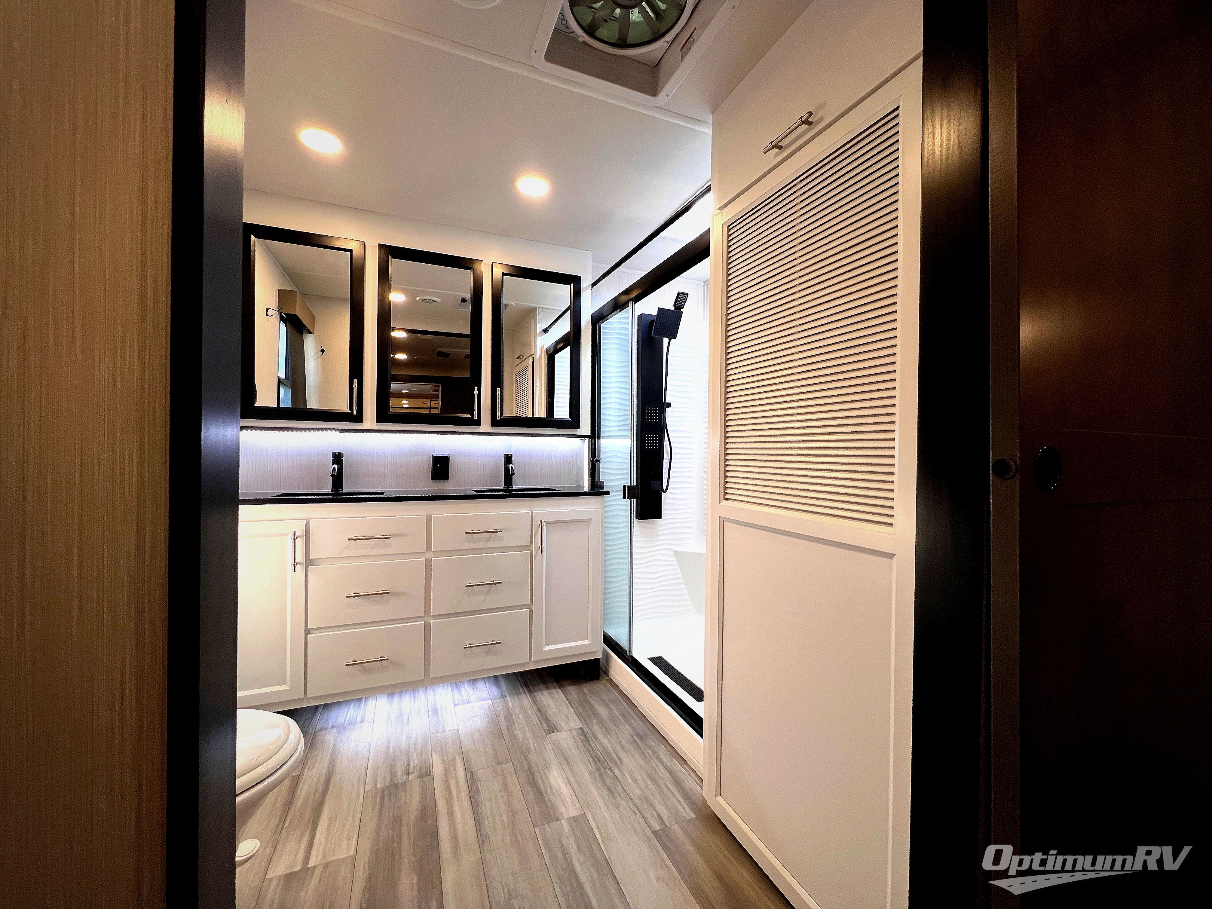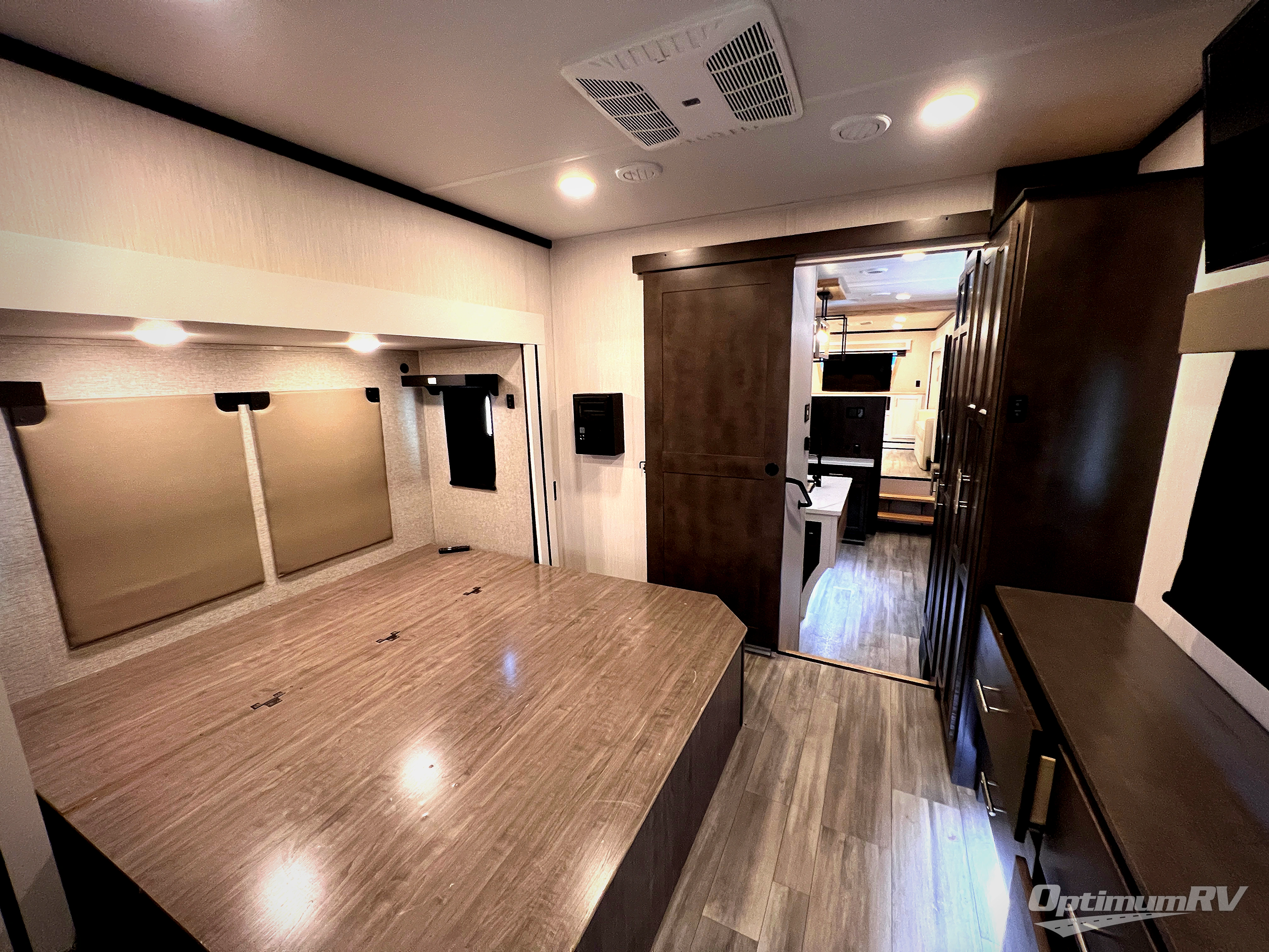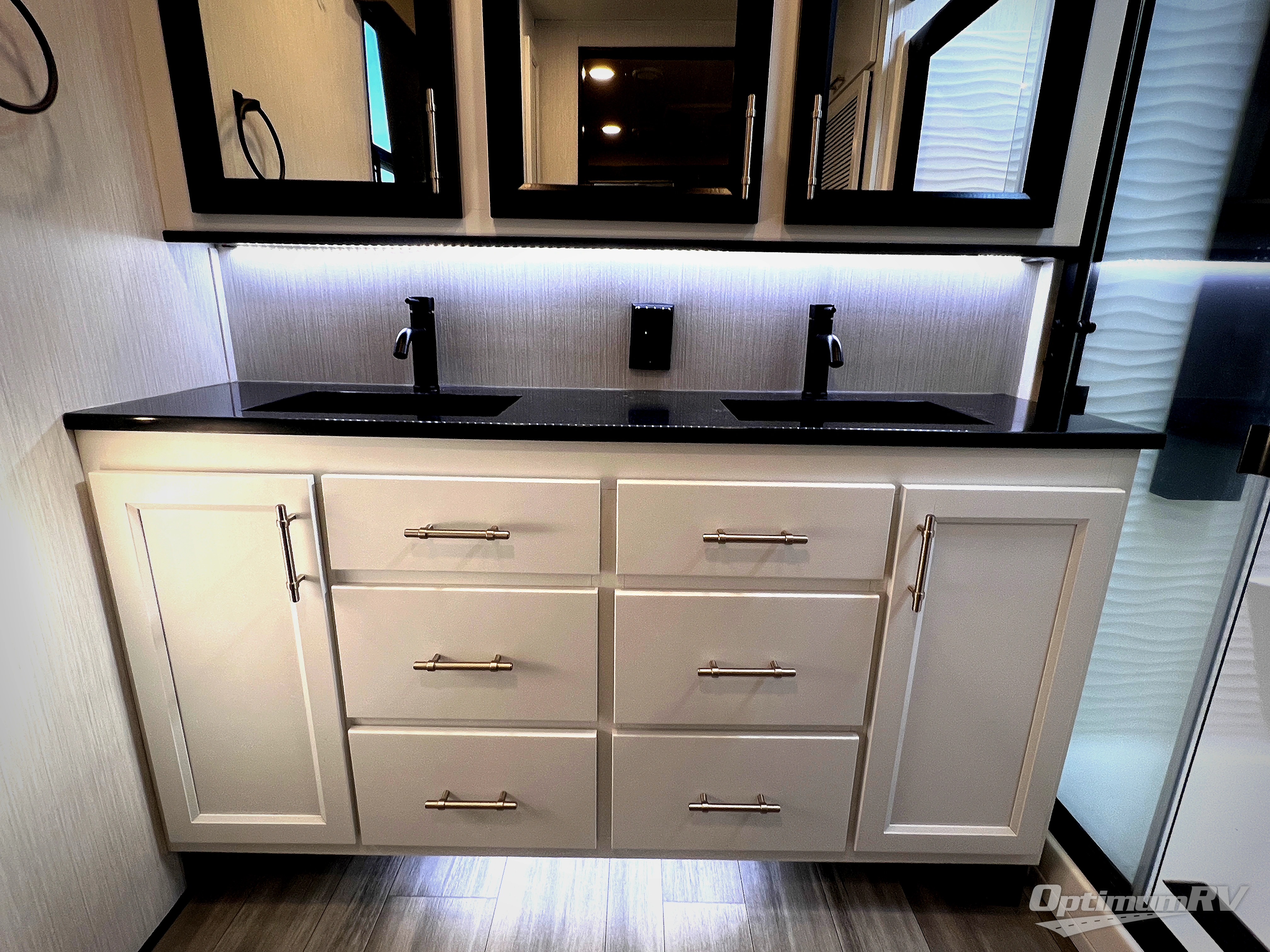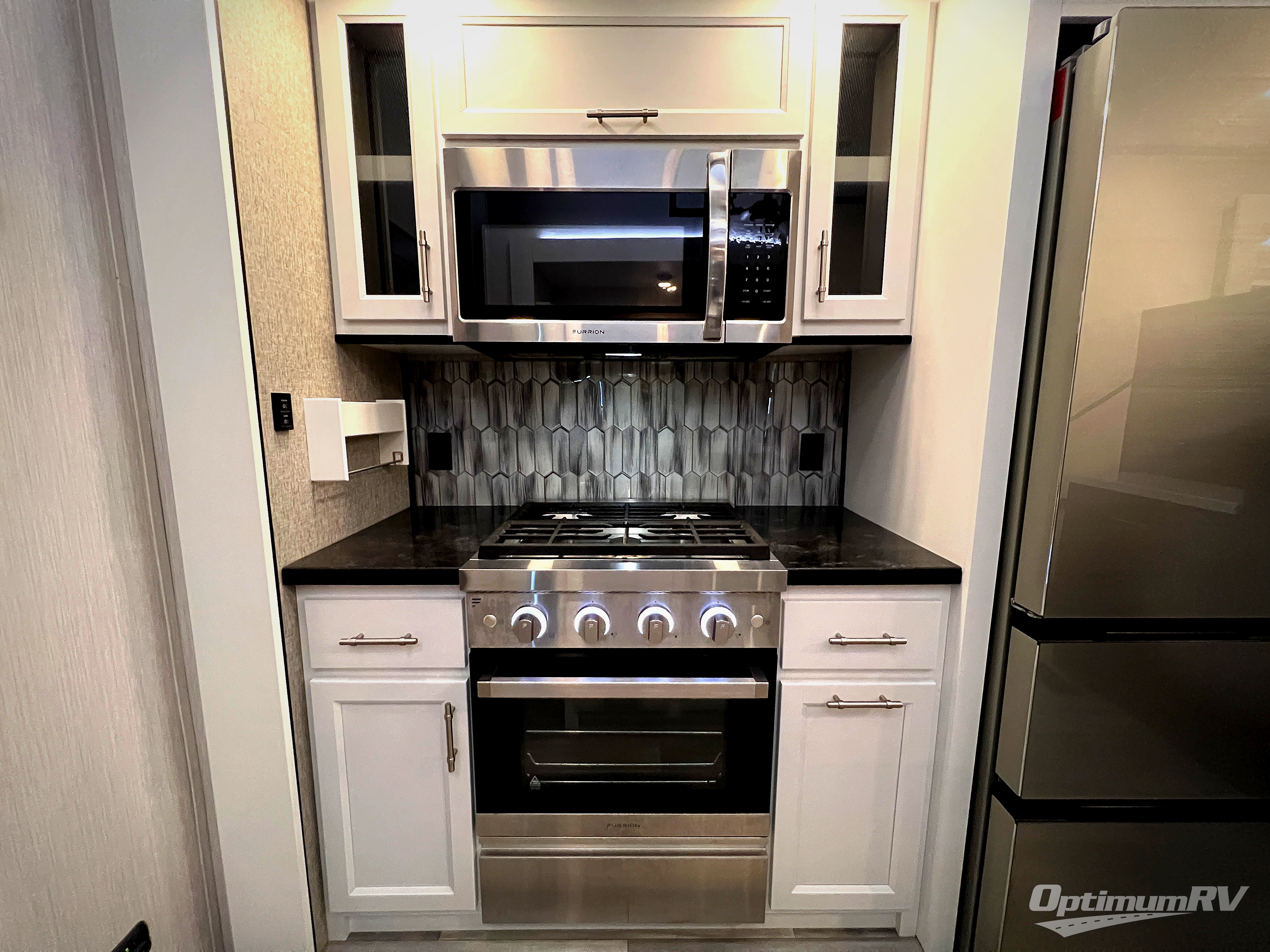 This fifth wheel has everything and then some! The front living area has opposing tri-fold sofas and power theater seating across from the front entertainment center with a fireplace and hidden telescoping TV. The chef can prepare their best meals with the kitchen island with a fold-down breakfast counter, and there is a 20 cu. ft. 12V refrigerator for food storage. Enjoy your meals and the extra space provided with the wall mounted dining table with an extension and an ottoman. The master suite has a king bed slide to lay your head at night and access to the full rear bathroom which has a shower with a seat, a linen closet, washer/dryer prep, and a dual sink vanity. You'll also find drop-down storage underneath the bath/bedroom so nothing gets left behind. And the convenient half bath can be traded out for an optional bonus pantry if you don't need the half bath!