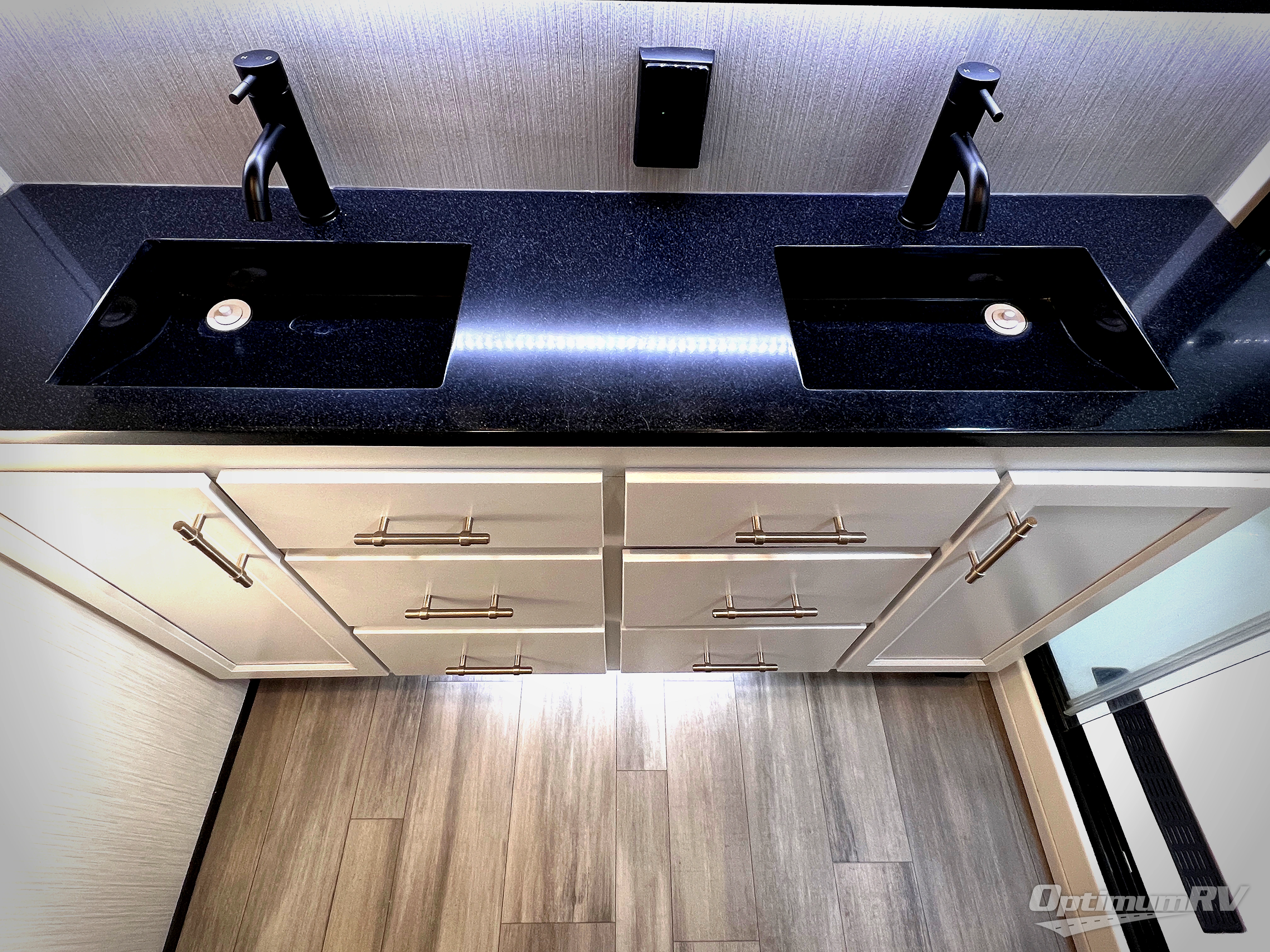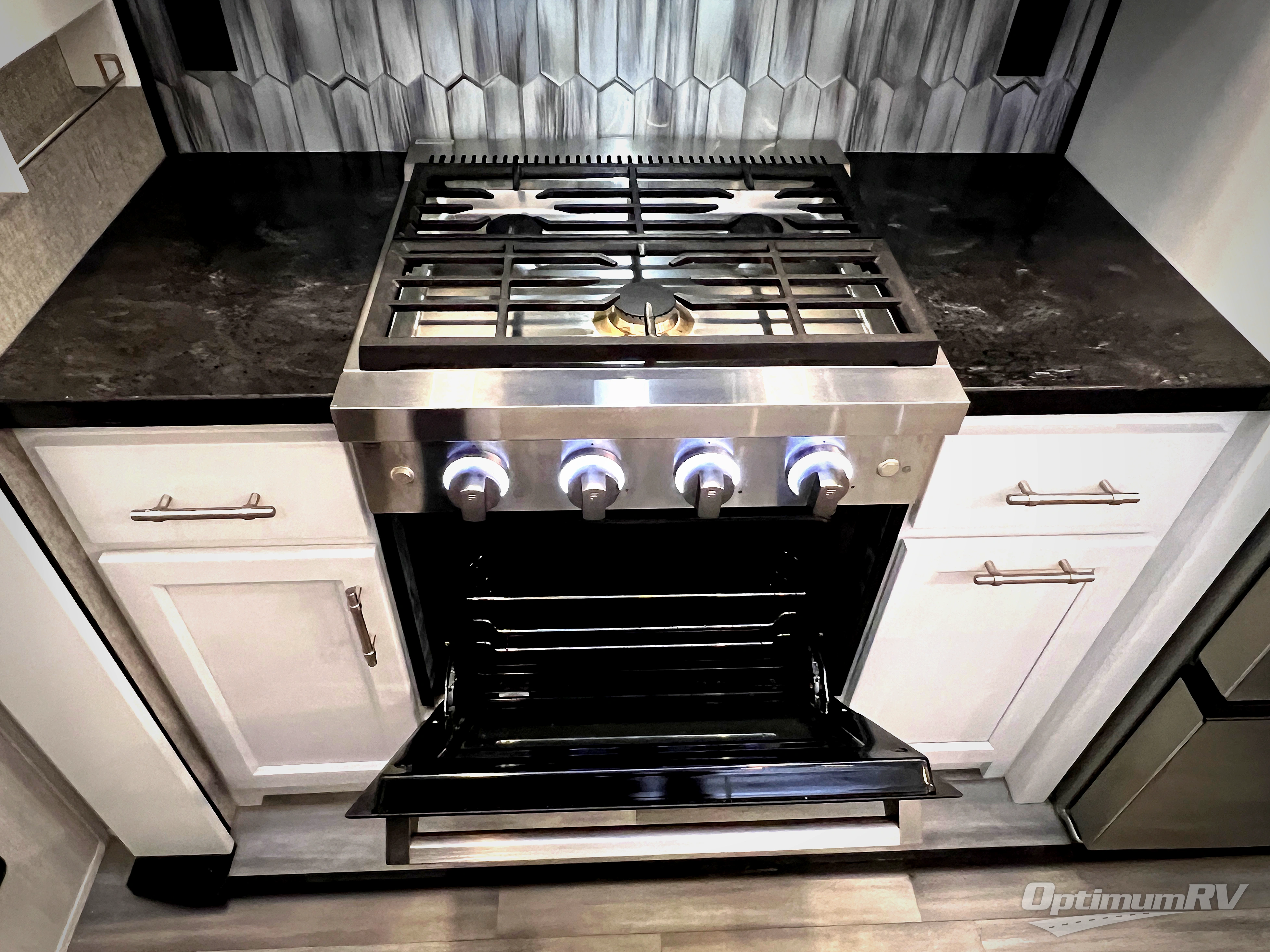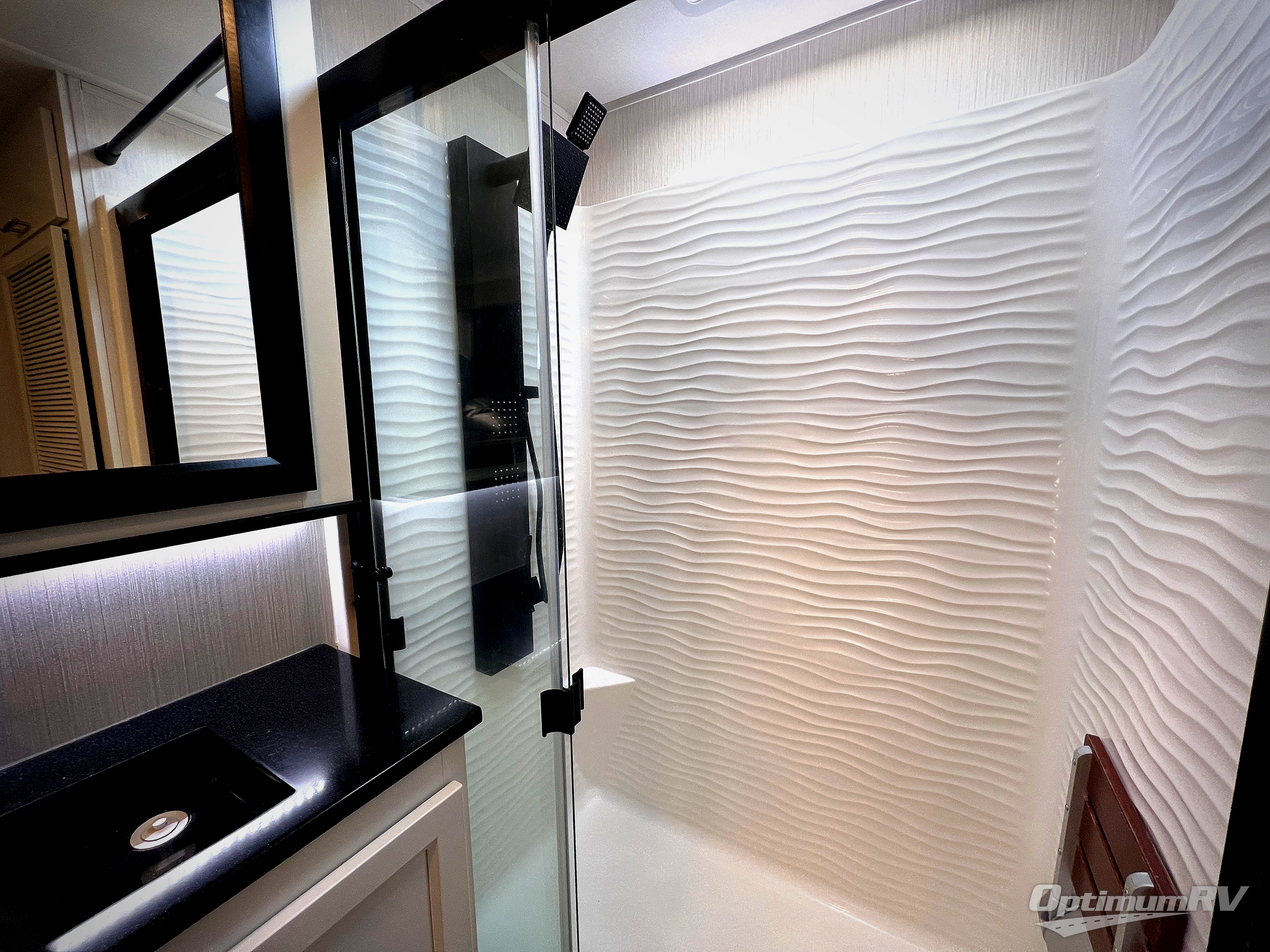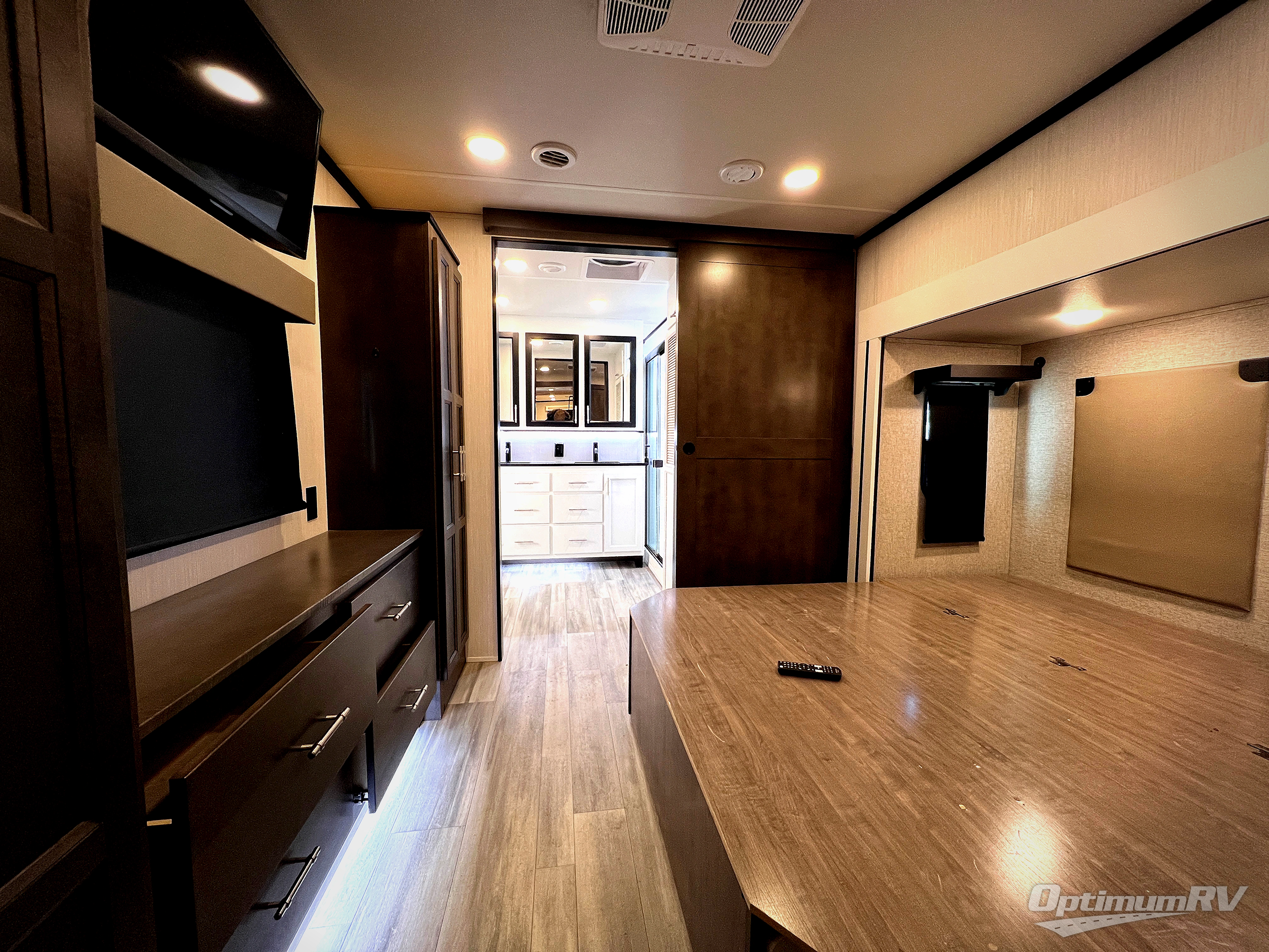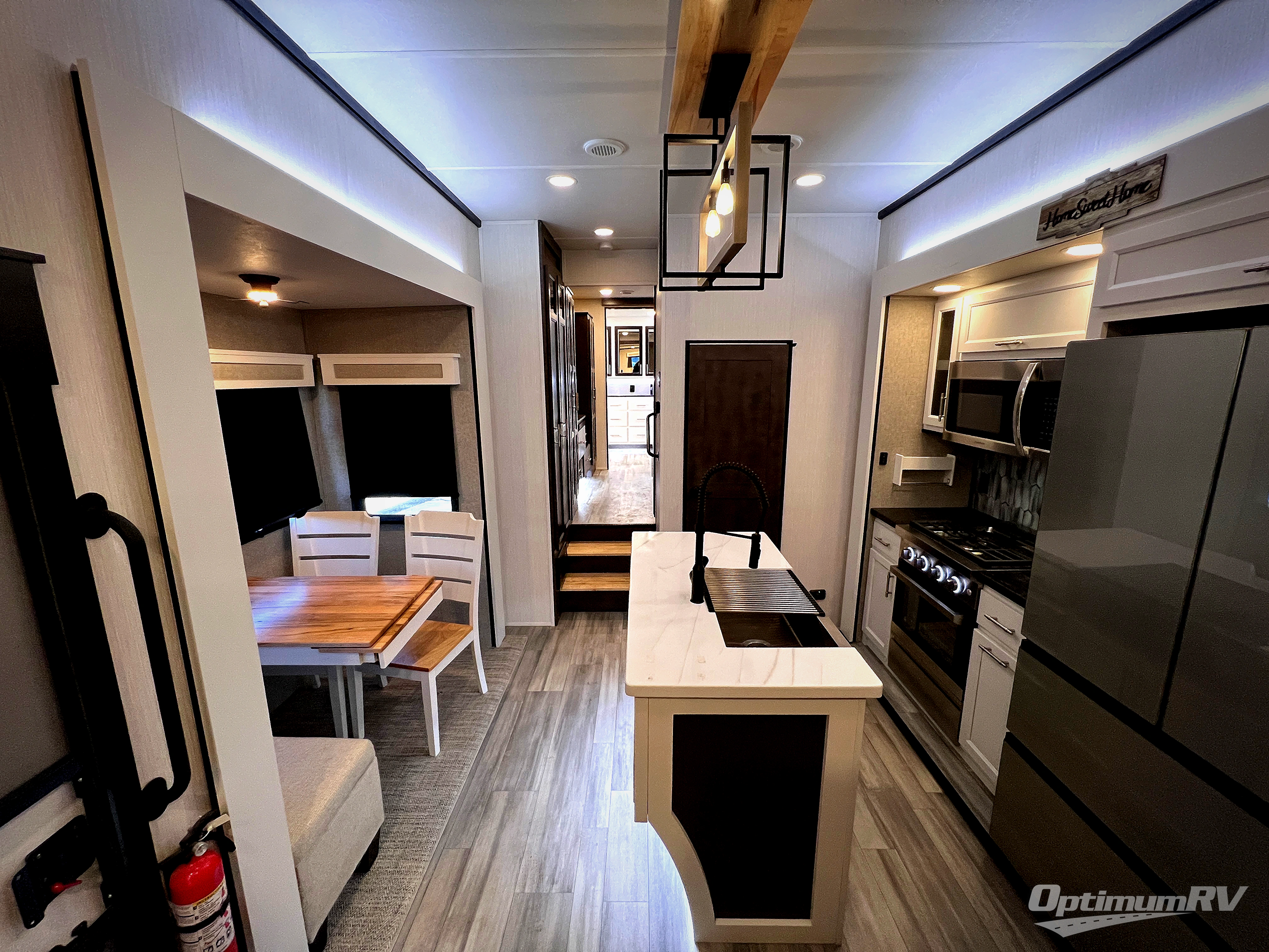 This fifth wheel has everything and then some! The front living area has opposing tri-fold sofas and power theater seating across from the front entertainment center with a fireplace and hidden telescoping TV. The chef can prepare their best meals with the kitchen island with a fold-down breakfast counter, and there is a 20 cu. ft. 12V refrigerator for food storage. Enjoy your meals and the extra space provided with the wall mounted dining table with an extension and an ottoman. The master suite has a king bed slide to lay your head at night and access to the full rear bathroom which has a shower with a seat, a linen closet, washer/dryer prep, and a dual sink vanity. You'll also find drop-down storage underneath the bath/bedroom so nothing gets left behind. And the convenient half bath can be traded out for an optional bonus pantry if you don't need the half bath!