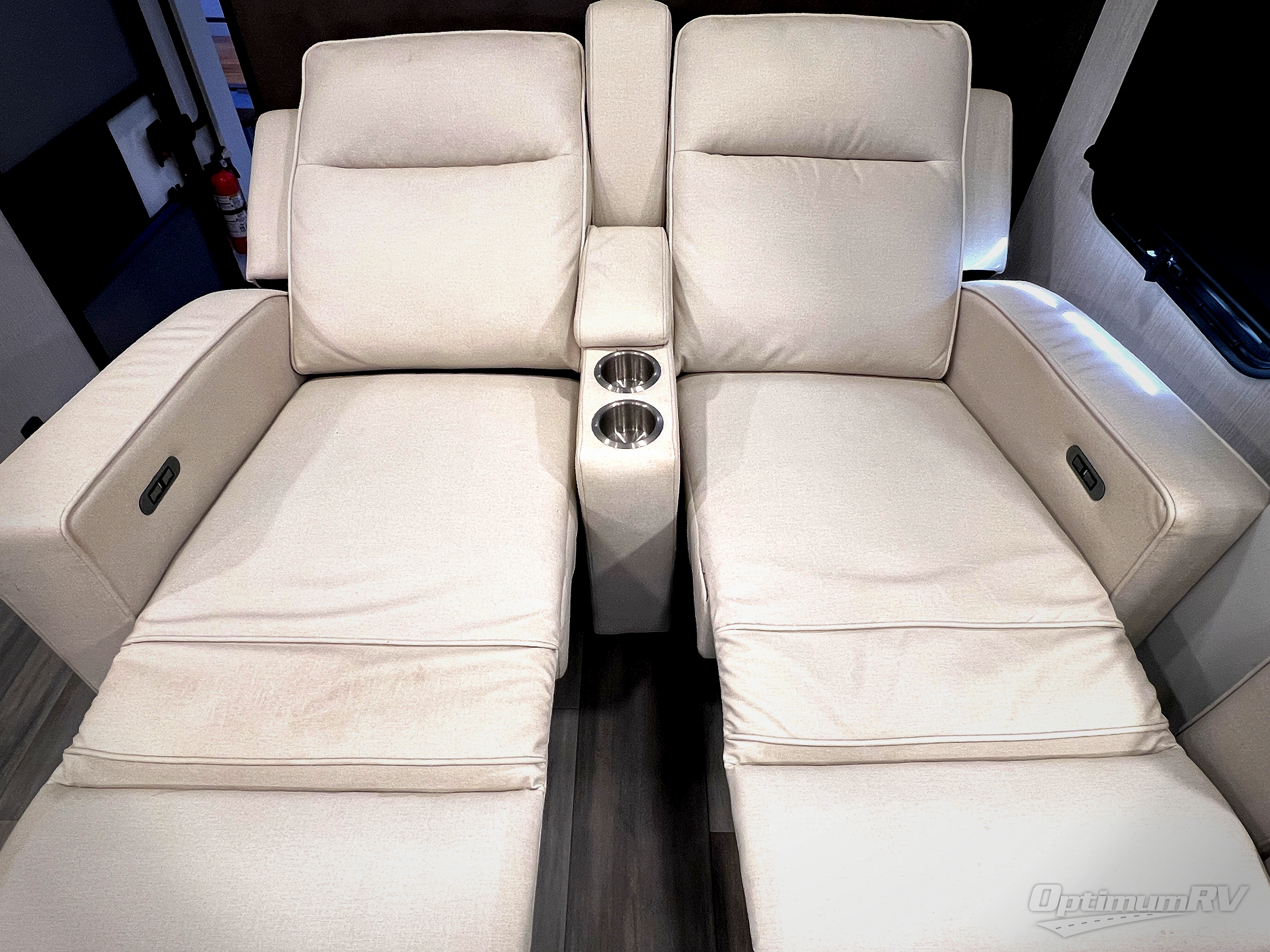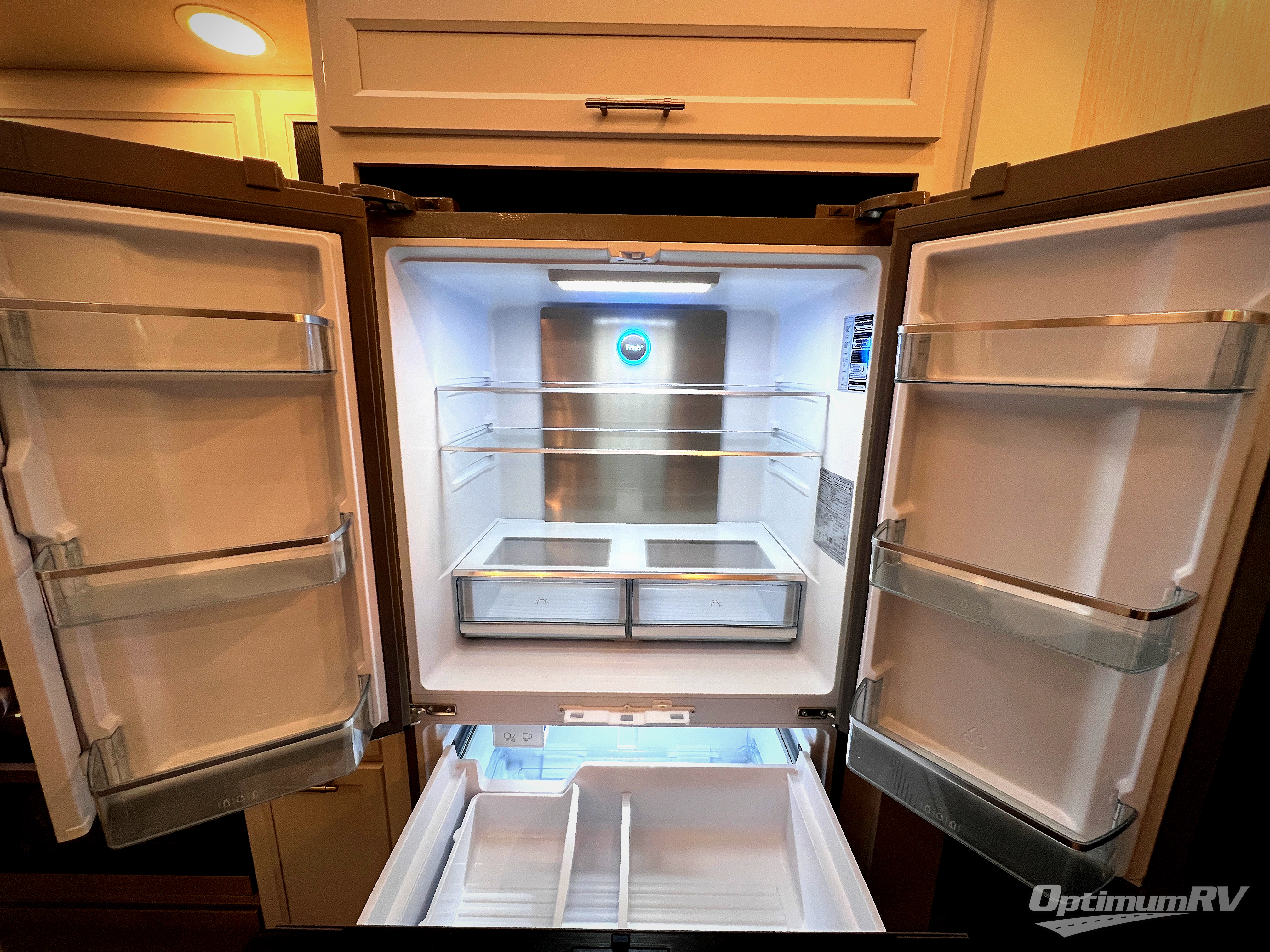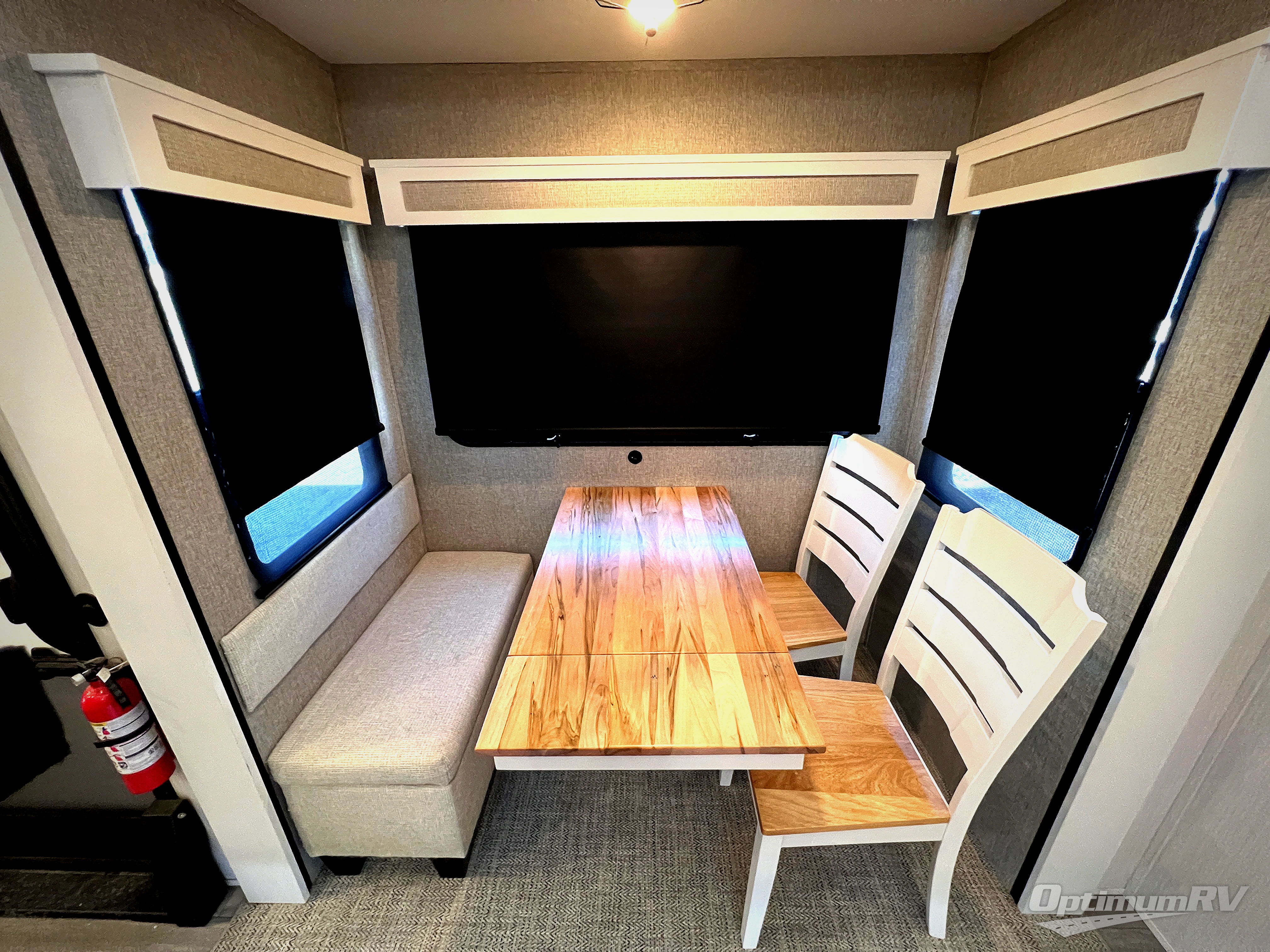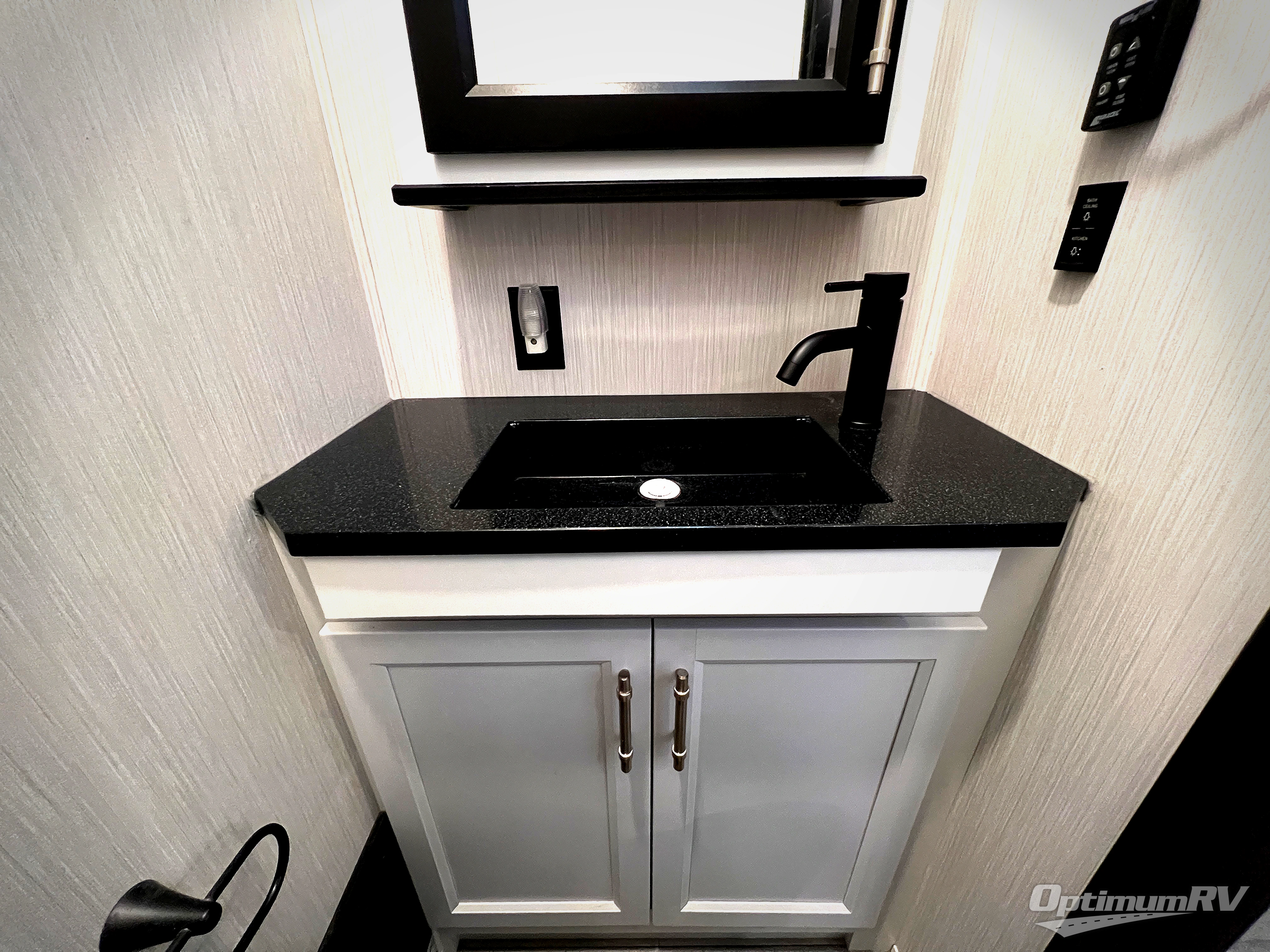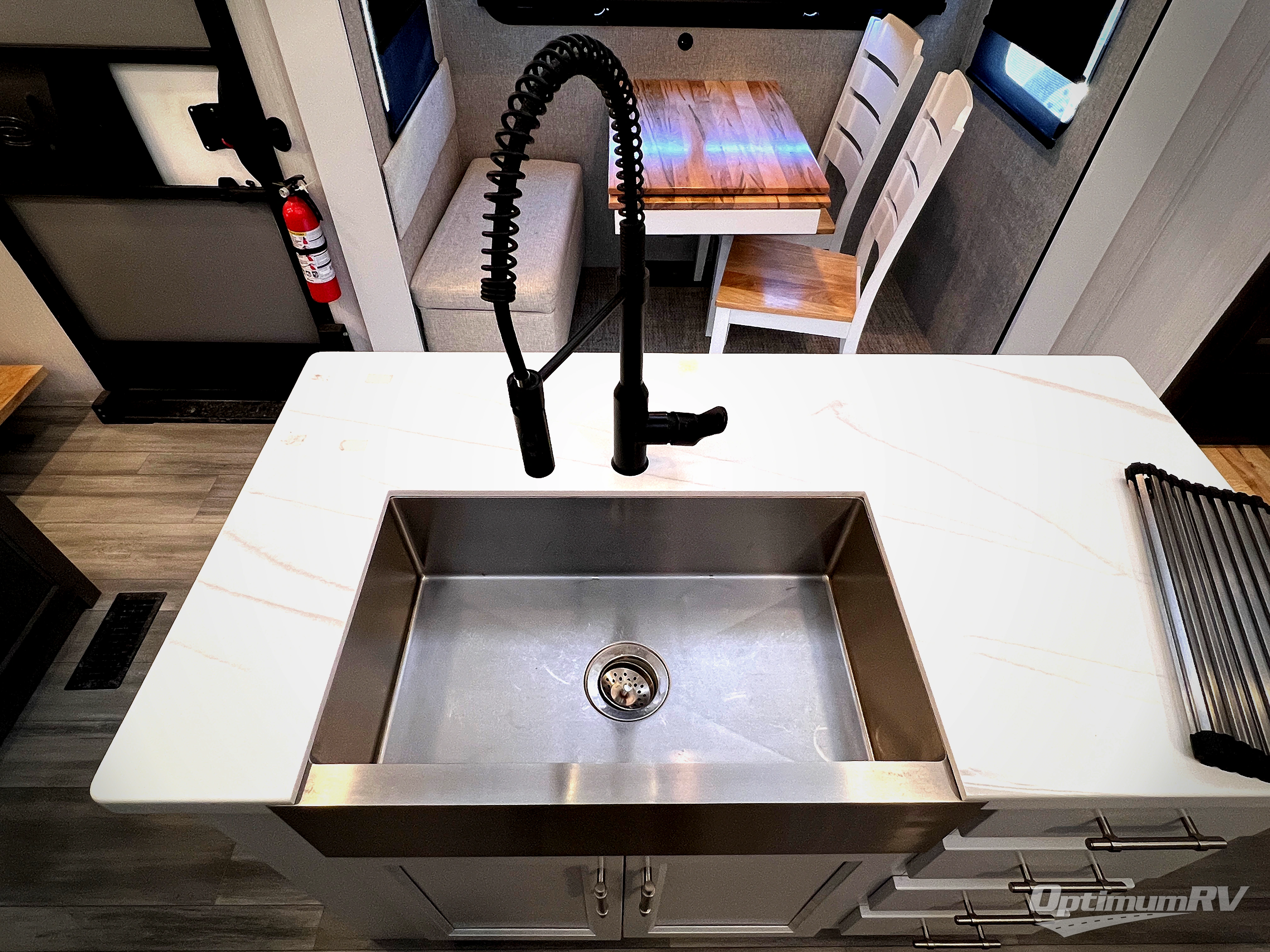 This fifth wheel has everything and then some! The front living area has opposing tri-fold sofas and power theater seating across from the front entertainment center with a fireplace and hidden telescoping TV. The chef can prepare their best meals with the kitchen island with a fold-down breakfast counter, and there is a 20 cu. ft. 12V refrigerator for food storage. Enjoy your meals and the extra space provided with the wall mounted dining table with an extension and an ottoman. The master suite has a king bed slide to lay your head at night and access to the full rear bathroom which has a shower with a seat, a linen closet, washer/dryer prep, and a dual sink vanity. You'll also find drop-down storage underneath the bath/bedroom so nothing gets left behind. And the convenient half bath can be traded out for an optional bonus pantry if you don't need the half bath!