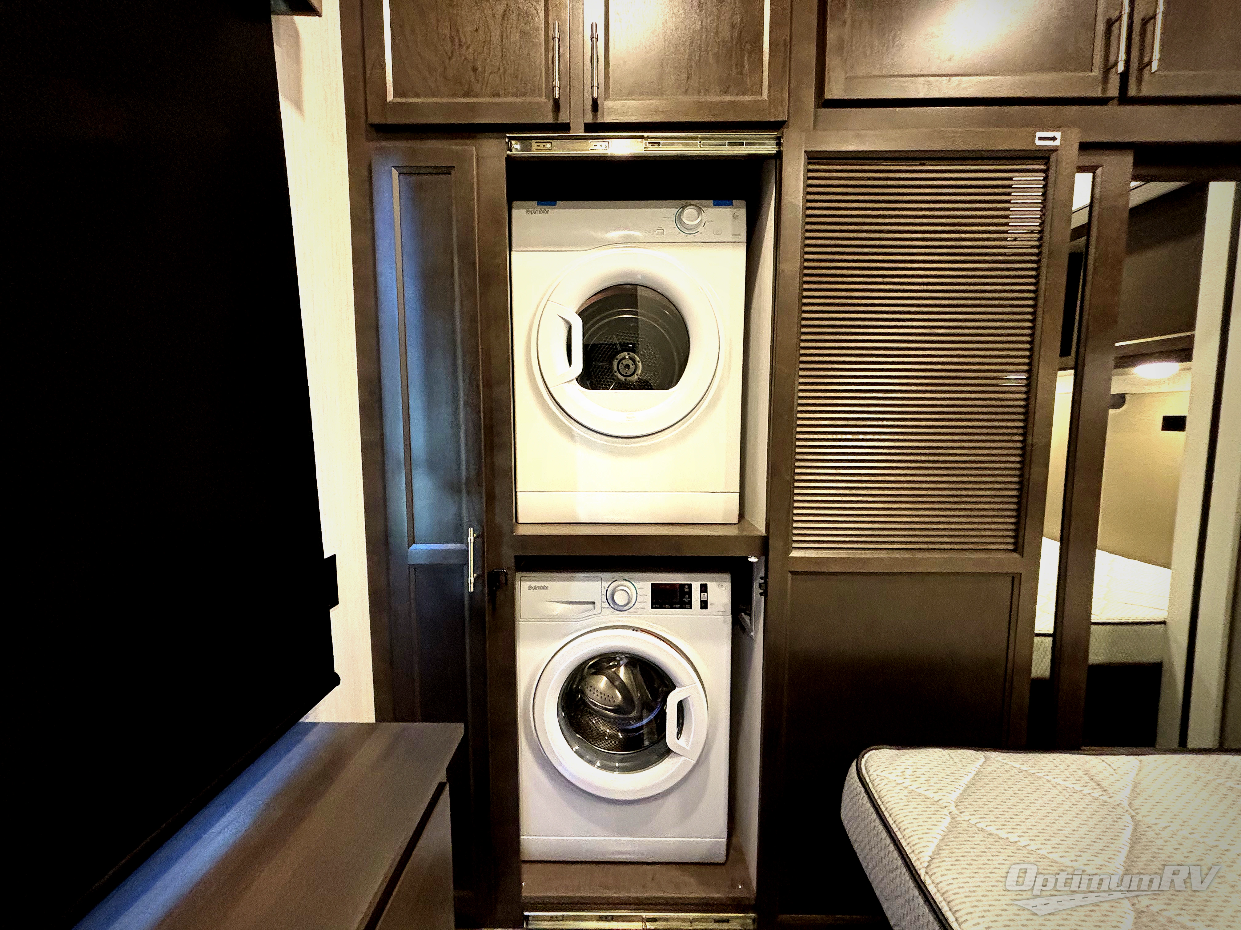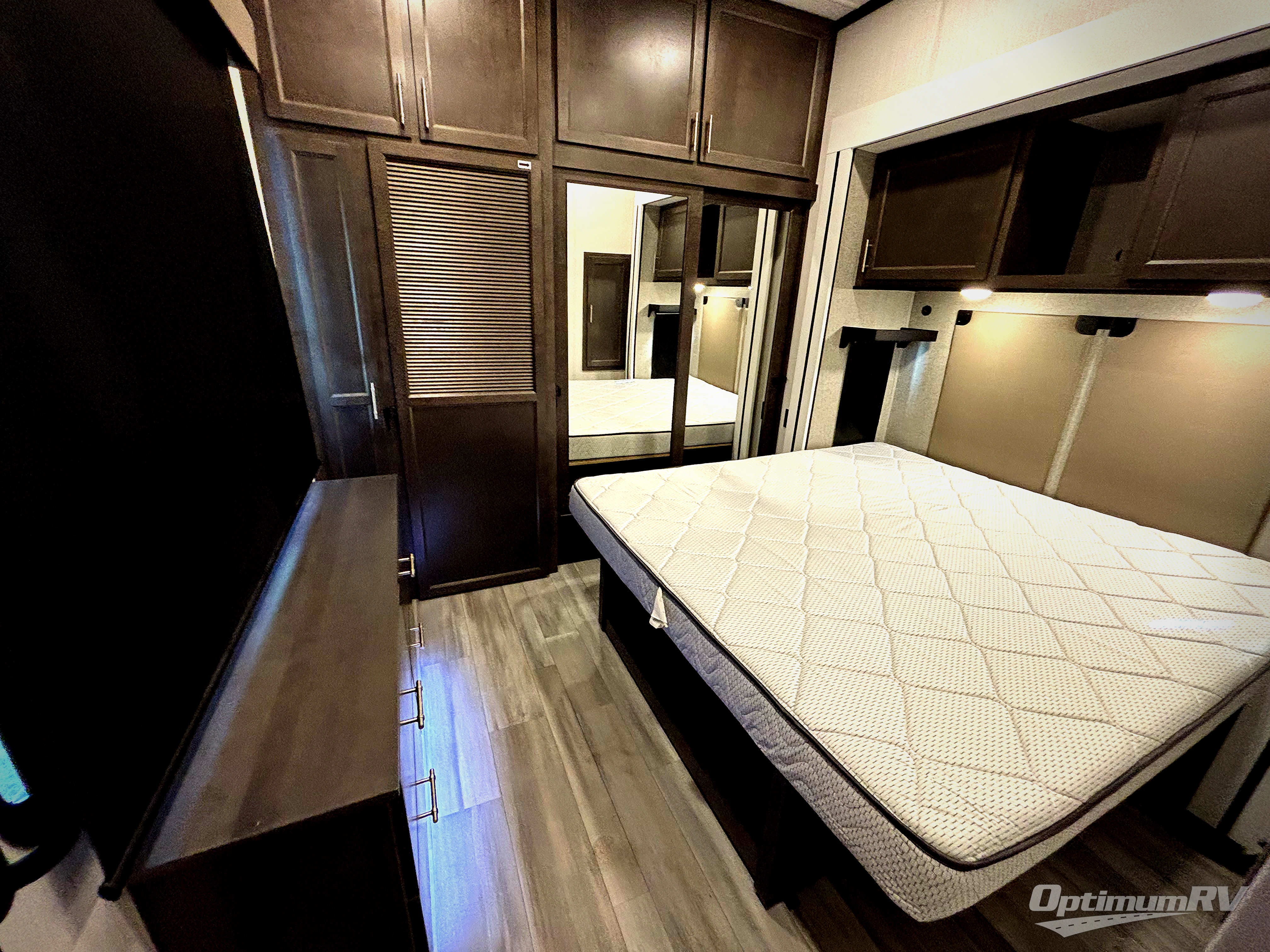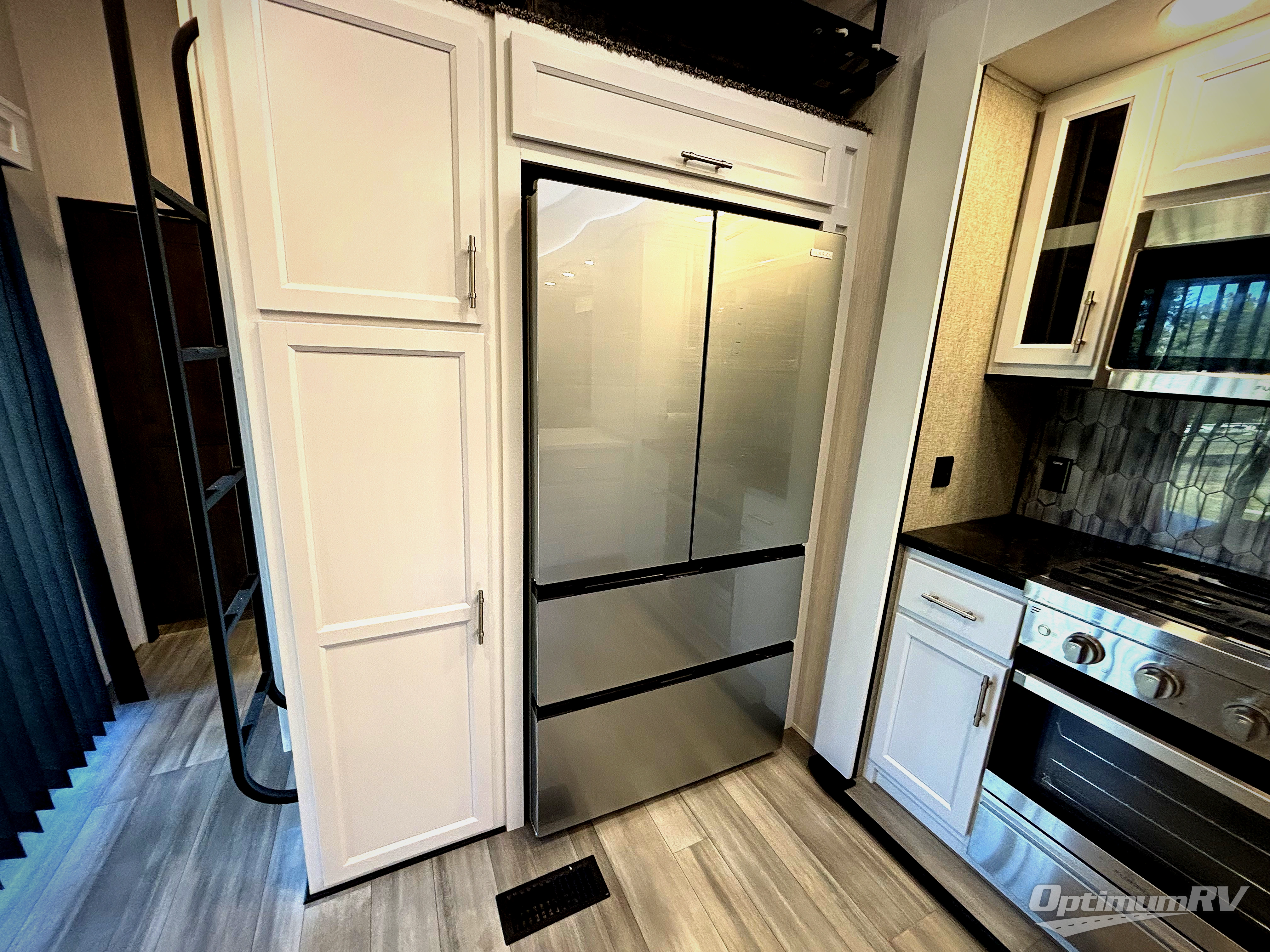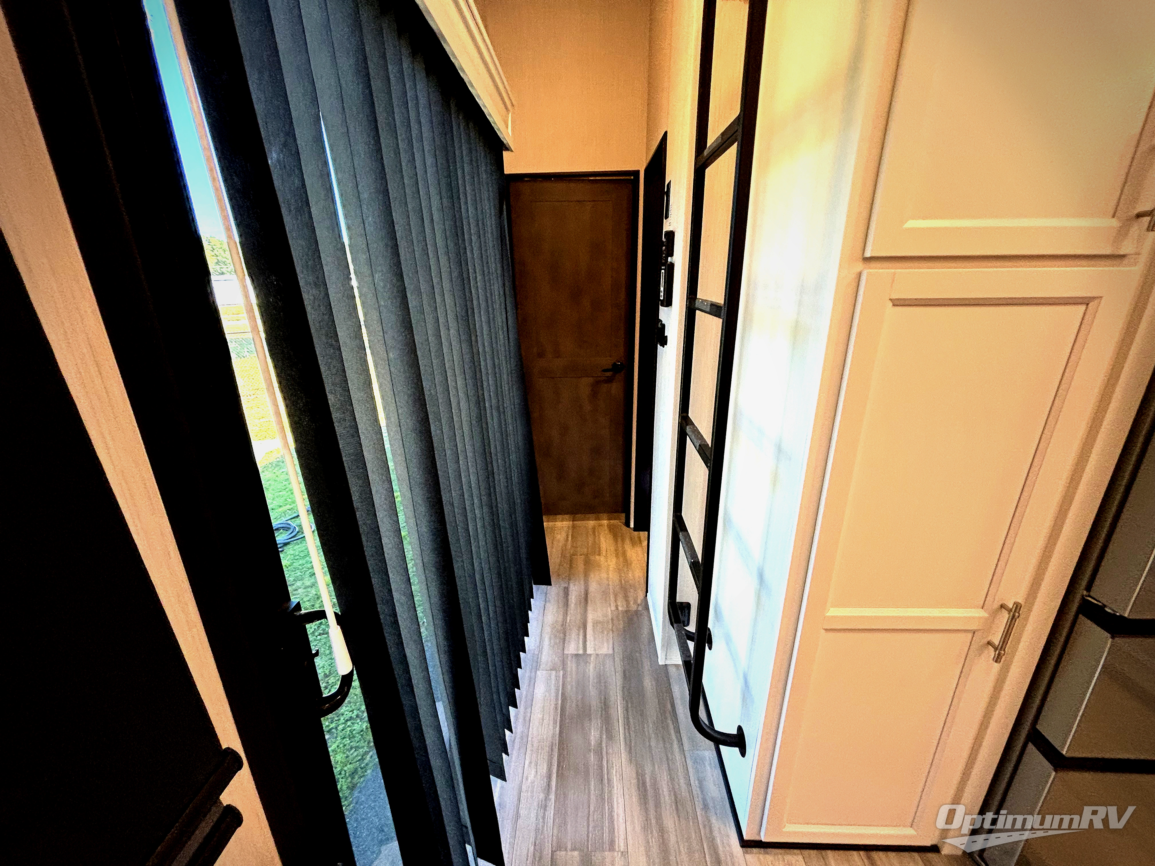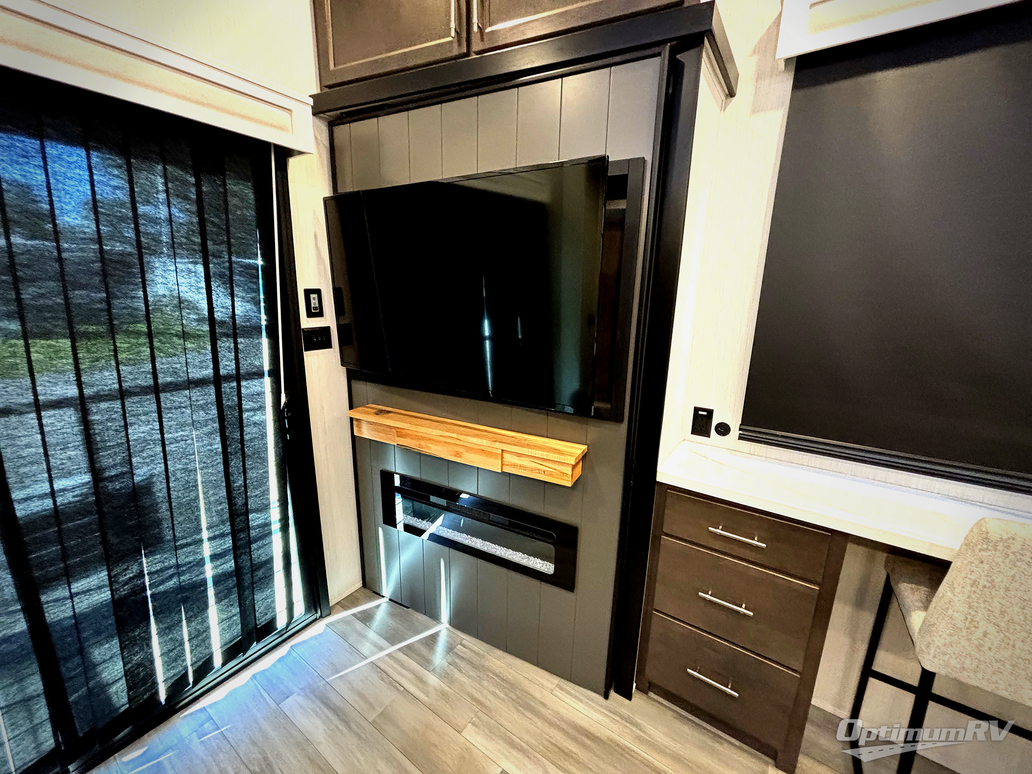 If you need more sleeping or storage space, this destination trailer is the one for you! There is a front covered porch with sliding glass doors that enters in to the front living area. Here, you'll enjoy relaxing on the sectional hide-a-bed sofa across from the entertainment center and fireplace. The spacious bar top with two seats will provide a place to dine, and the middle kitchen is any chef's dream with its two pantries, spacious 20 cu. ft. 12V refrigerator, and plenty of counter space! When you're ready for your own space, you can retreat to the rear bedroom where you'll find a king bed slide out, a wardrobe, a dresser, drawers, and even washer and dryer prep. The comfort doesn't stop there! There is also a loft above the full bath that includes a ladder and a mattress, so you can use this space for more sleeping or storage space!