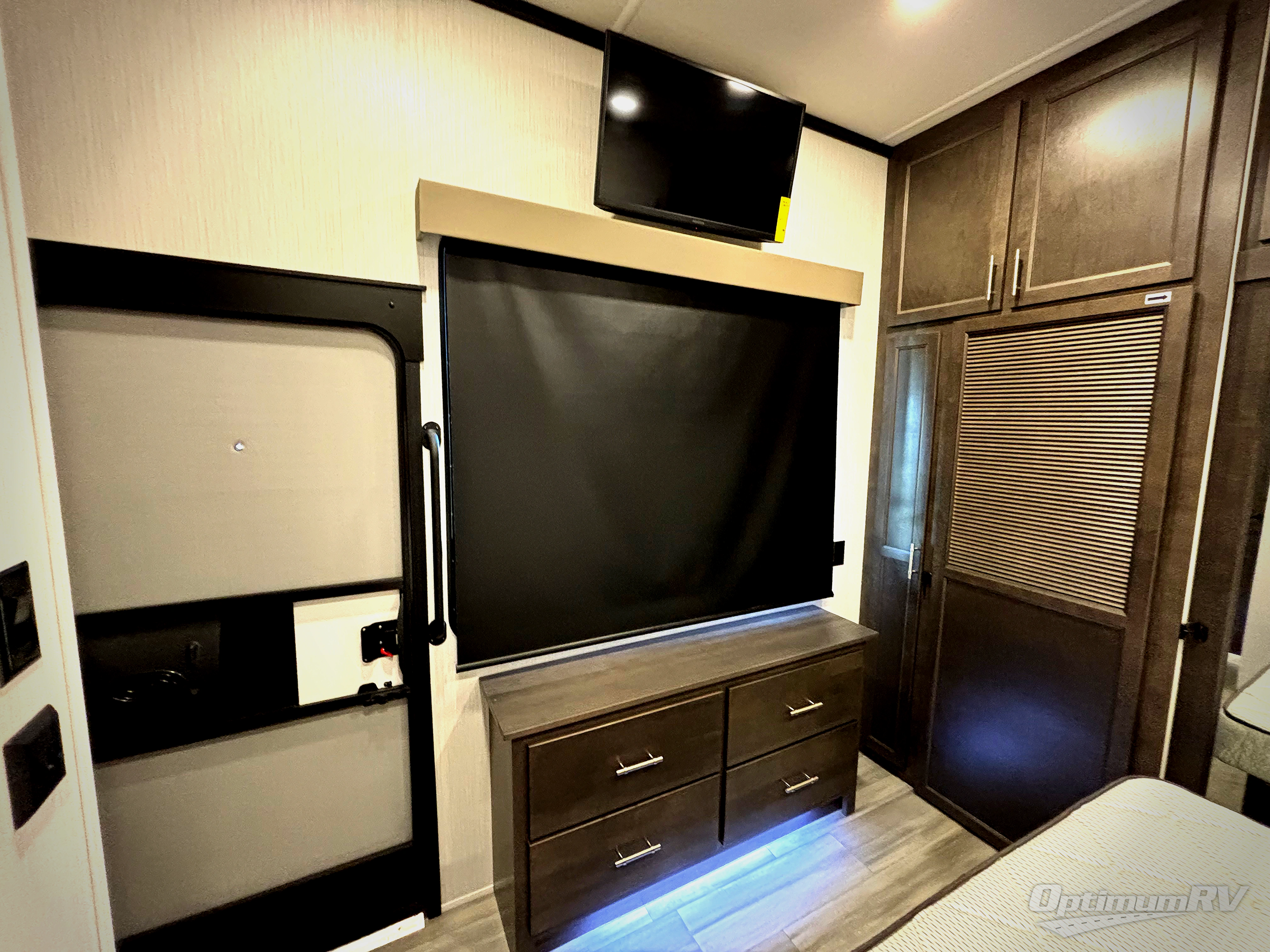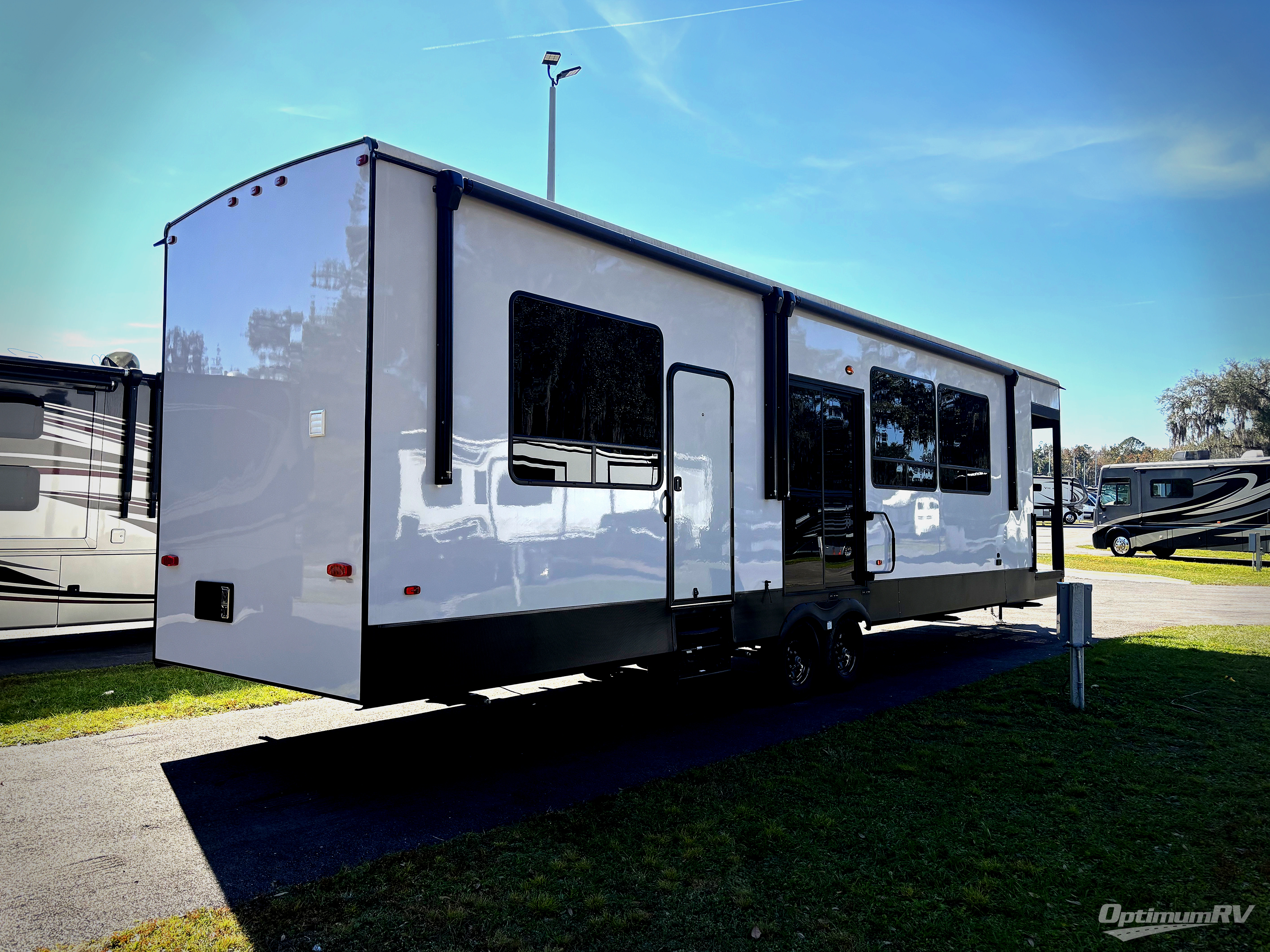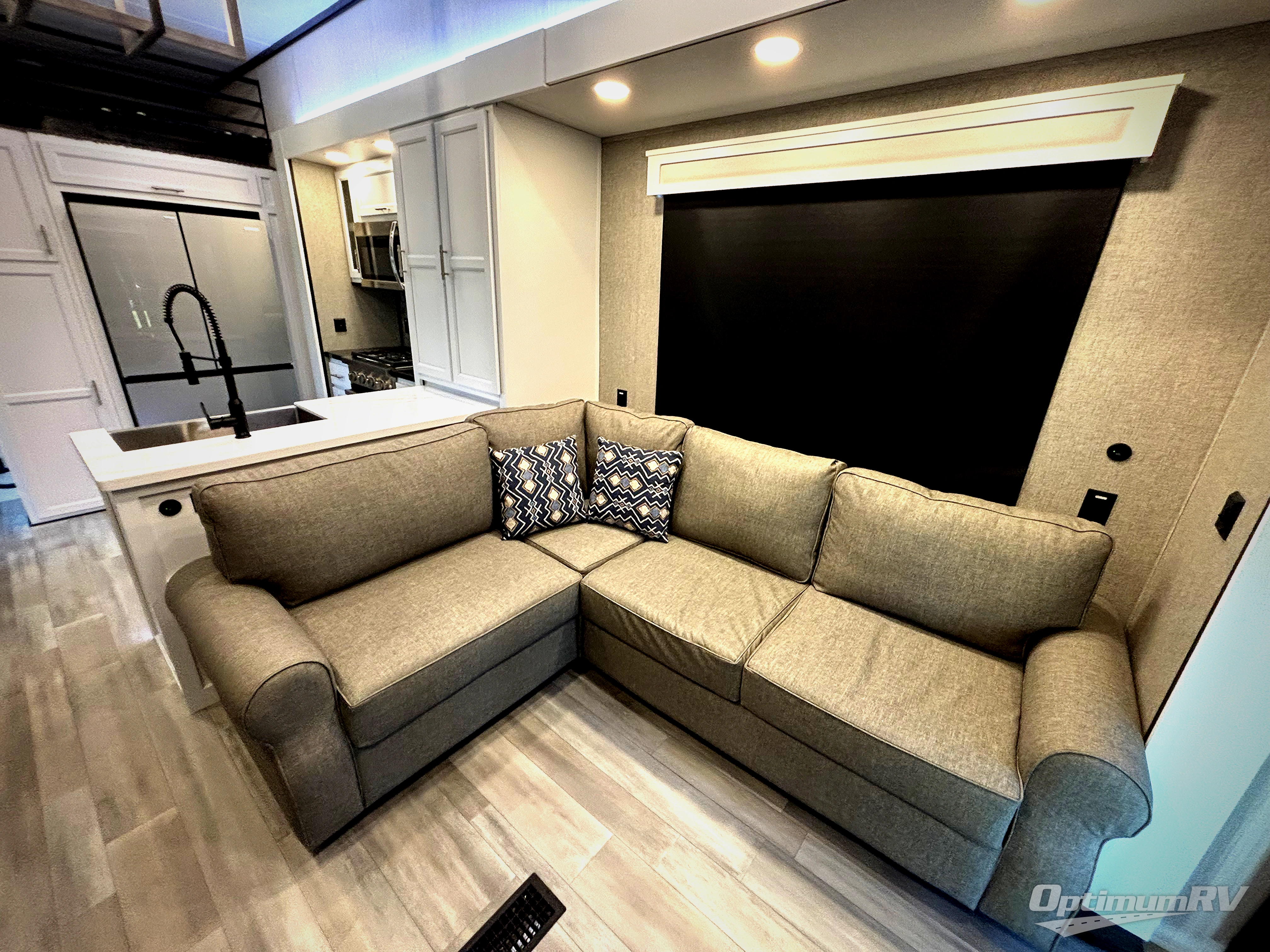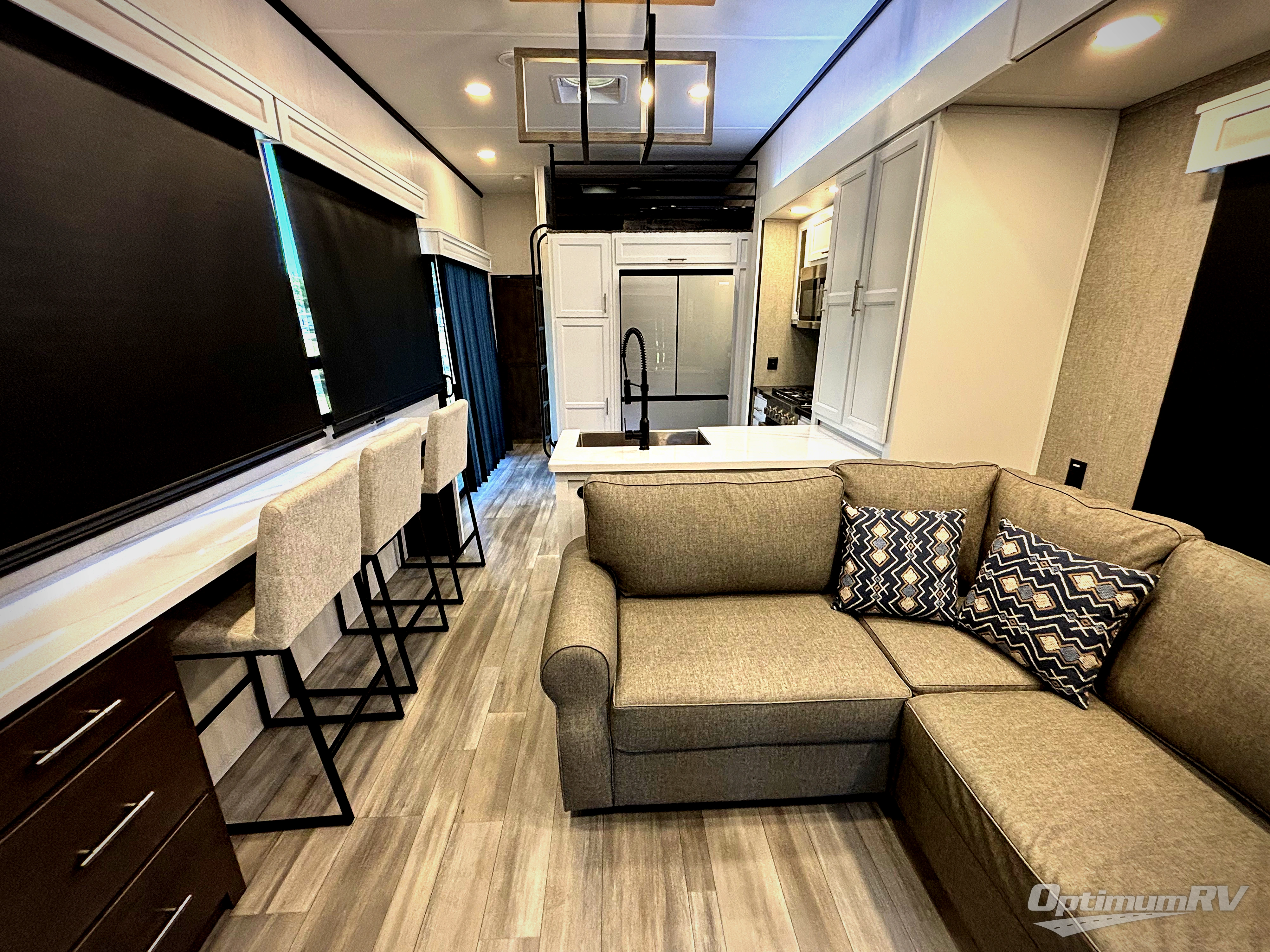 If you need more sleeping or storage space, this destination trailer is the one for you! There is a front covered porch with sliding glass doors that enters in to the front living area. Here, you'll enjoy relaxing on the sectional hide-a-bed sofa across from the entertainment center and fireplace. The spacious bar top with two seats will provide a place to dine, and the middle kitchen is any chef's dream with its two pantries, spacious 20 cu. ft. 12V refrigerator, and plenty of counter space! When you're ready for your own space, you can retreat to the rear bedroom where you'll find a king bed slide out, a wardrobe, a dresser, drawers, and even washer and dryer prep. The comfort doesn't stop there! There is also a loft above the full bath that includes a ladder and a mattress, so you can use this space for more sleeping or storage space!