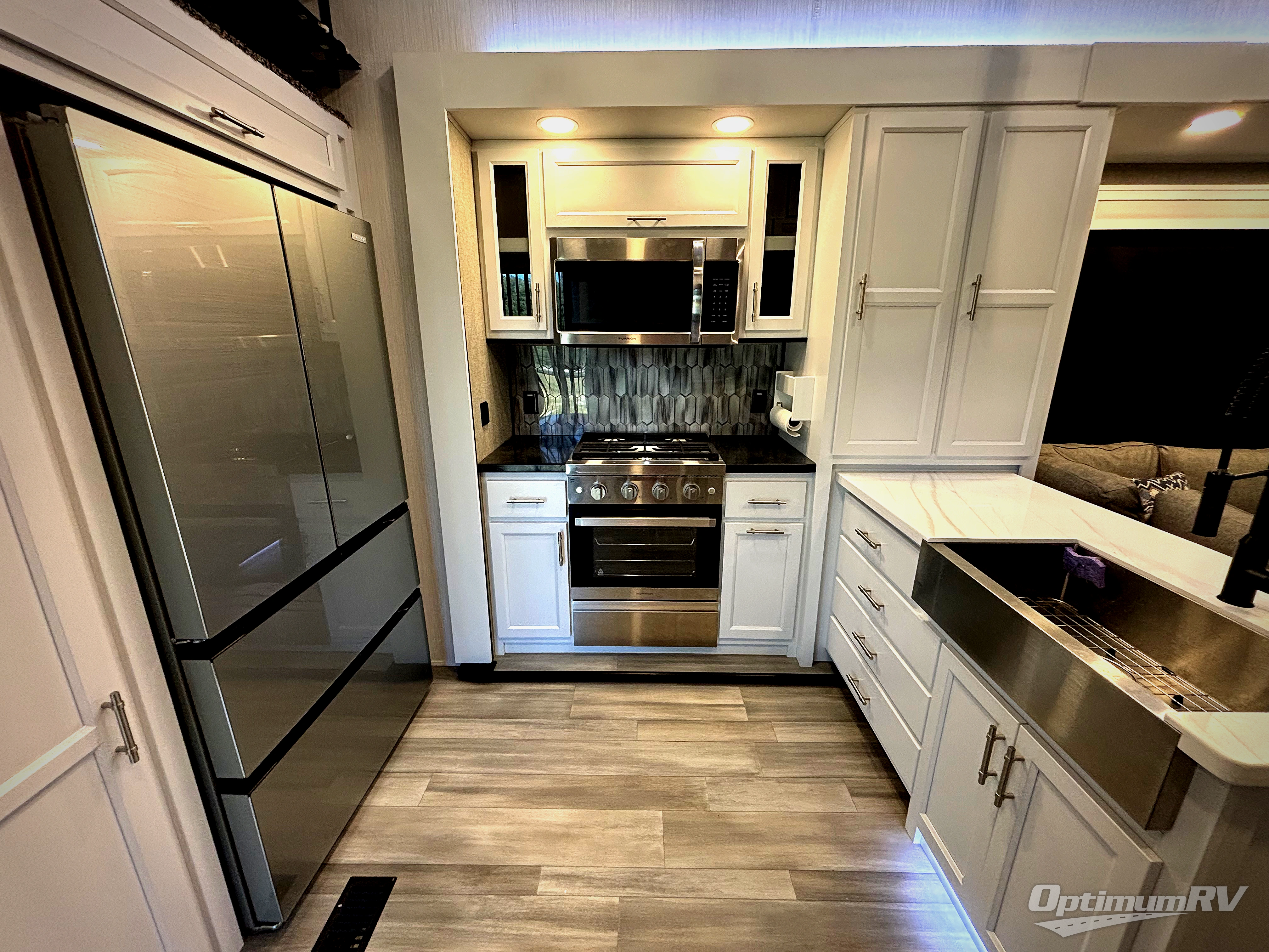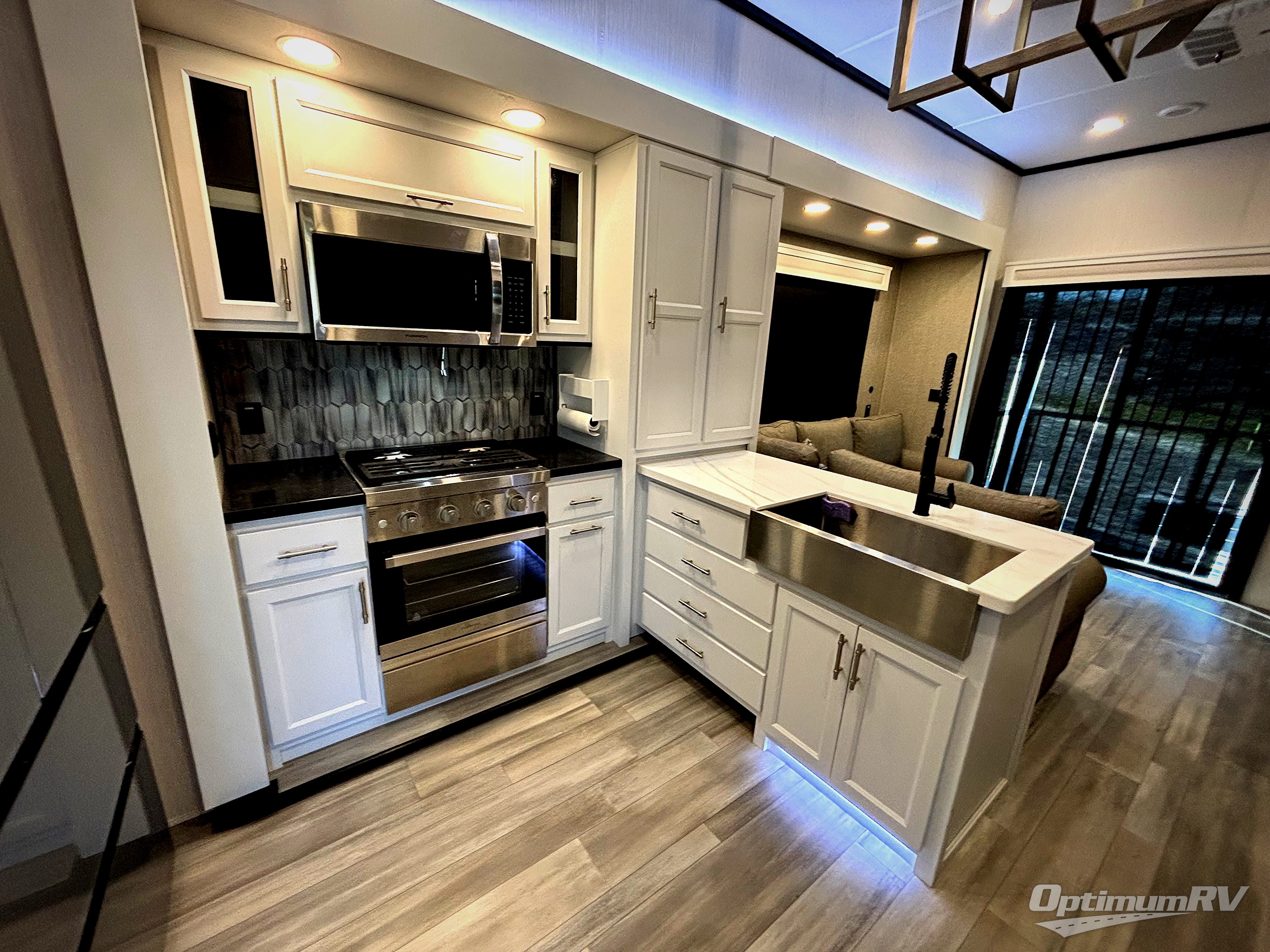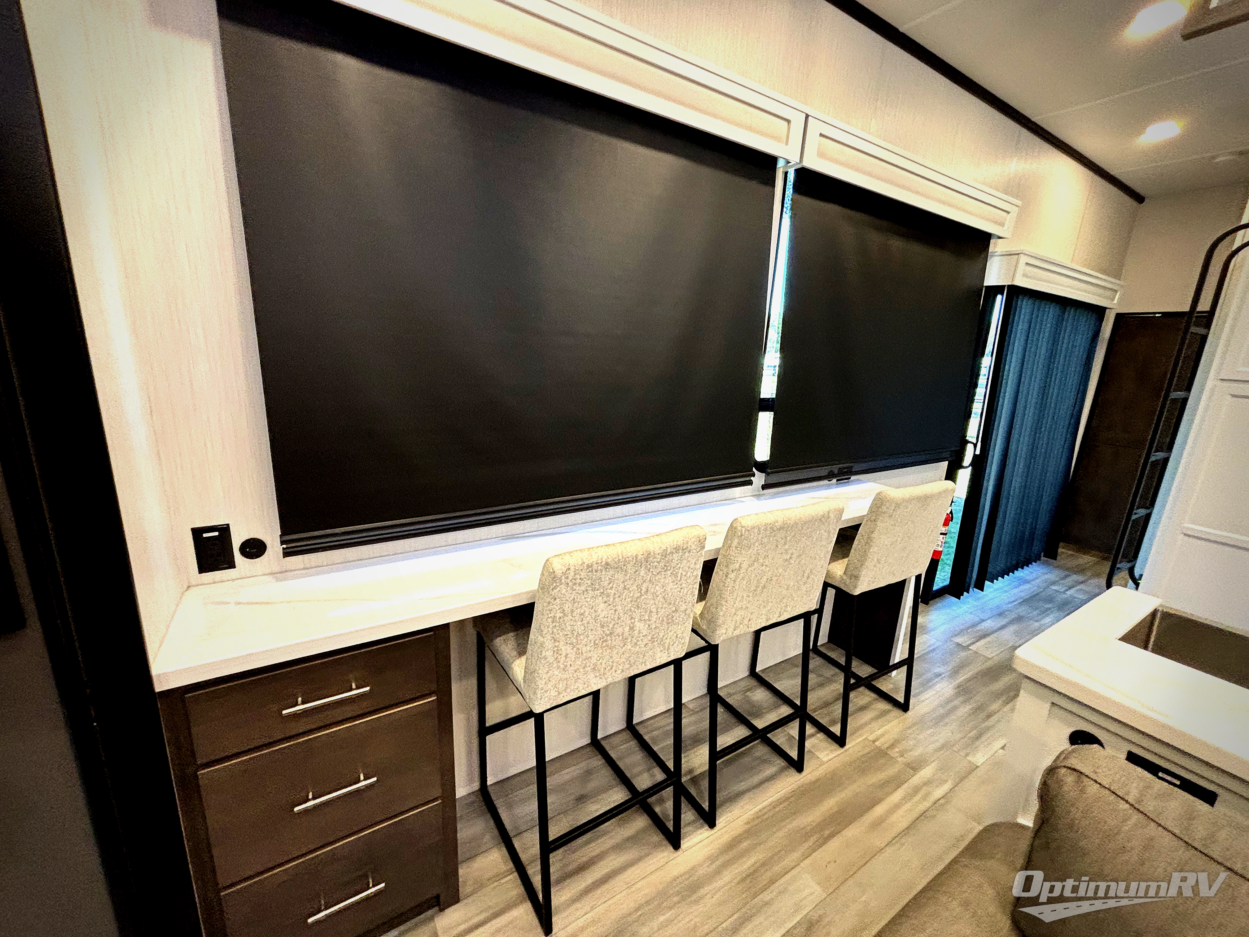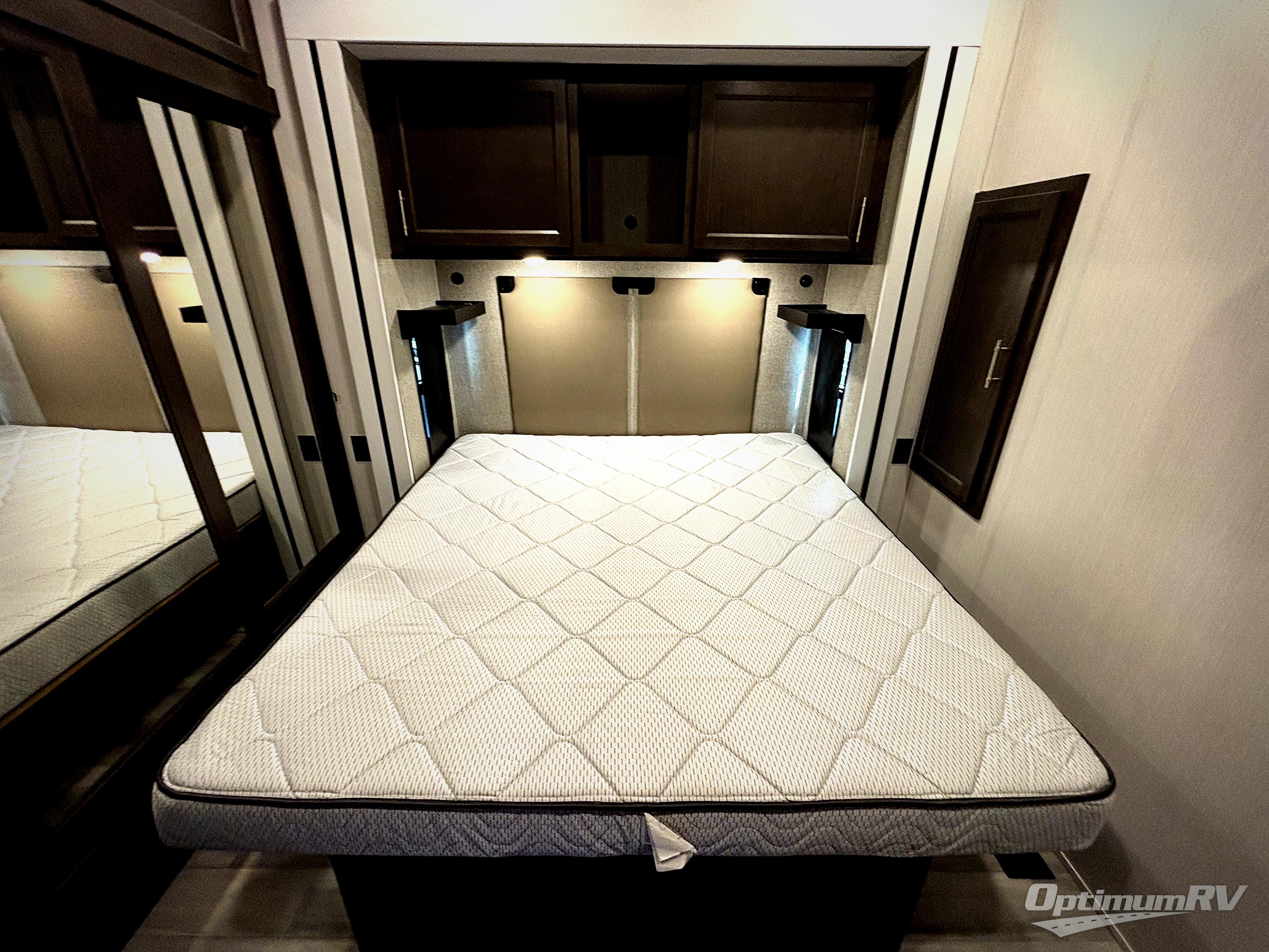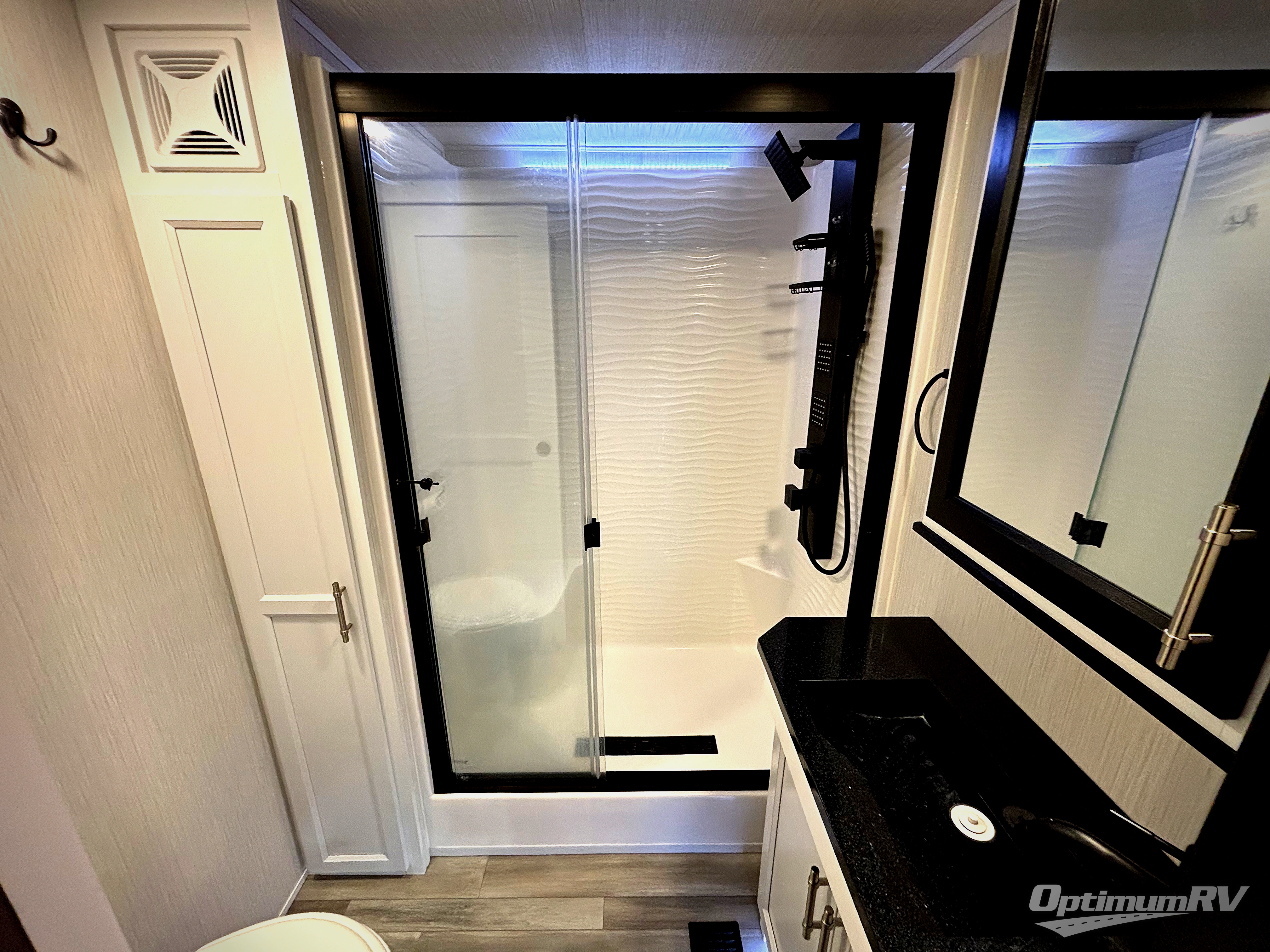 If you need more sleeping or storage space, this destination trailer is the one for you! There is a front covered porch with sliding glass doors that enters in to the front living area. Here, you'll enjoy relaxing on the sectional hide-a-bed sofa across from the entertainment center and fireplace. The spacious bar top with two seats will provide a place to dine, and the middle kitchen is any chef's dream with its two pantries, spacious 20 cu. ft. 12V refrigerator, and plenty of counter space! When you're ready for your own space, you can retreat to the rear bedroom where you'll find a king bed slide out, a wardrobe, a dresser, drawers, and even washer and dryer prep. The comfort doesn't stop there! There is also a loft above the full bath that includes a ladder and a mattress, so you can use this space for more sleeping or storage space!