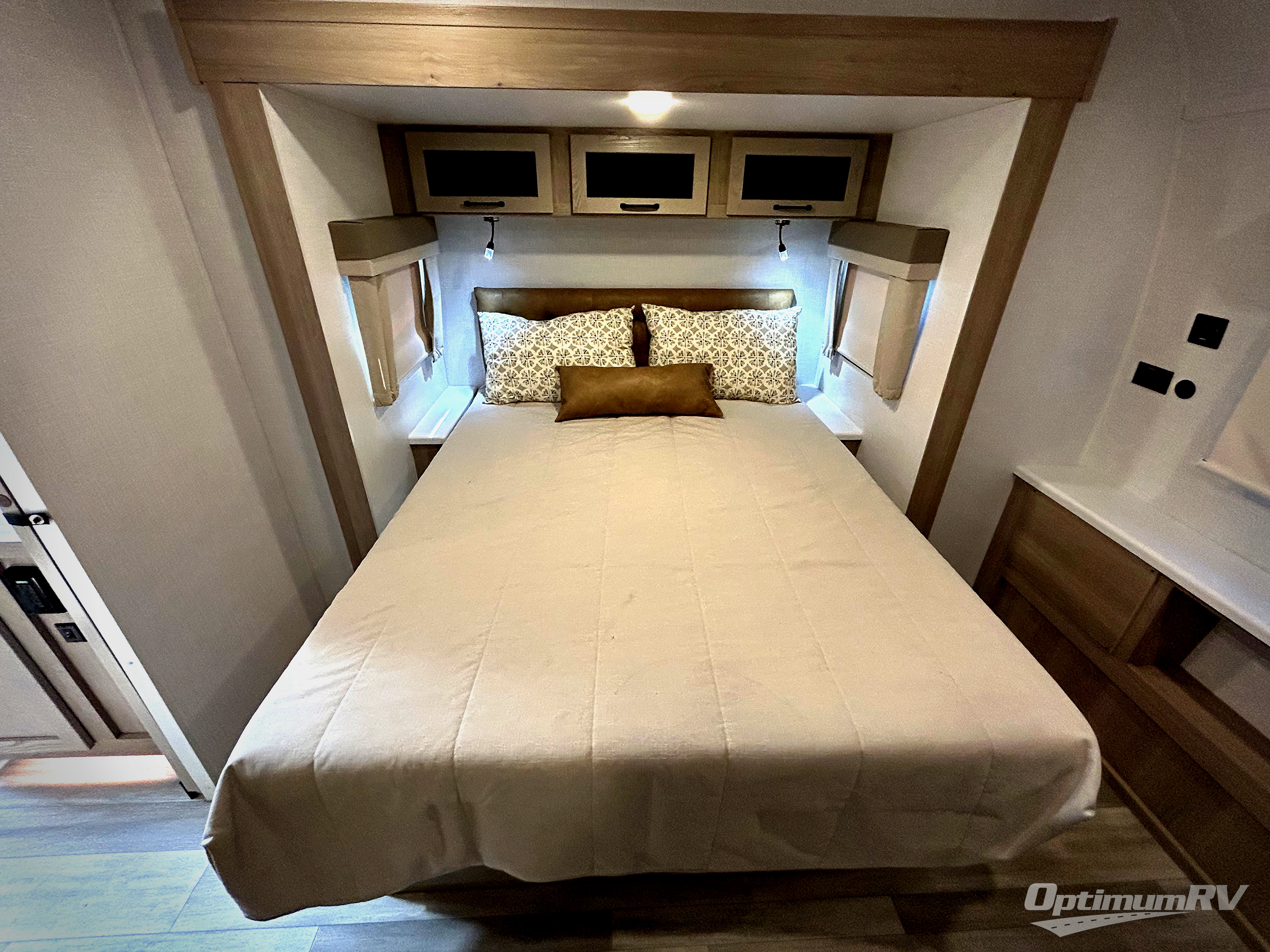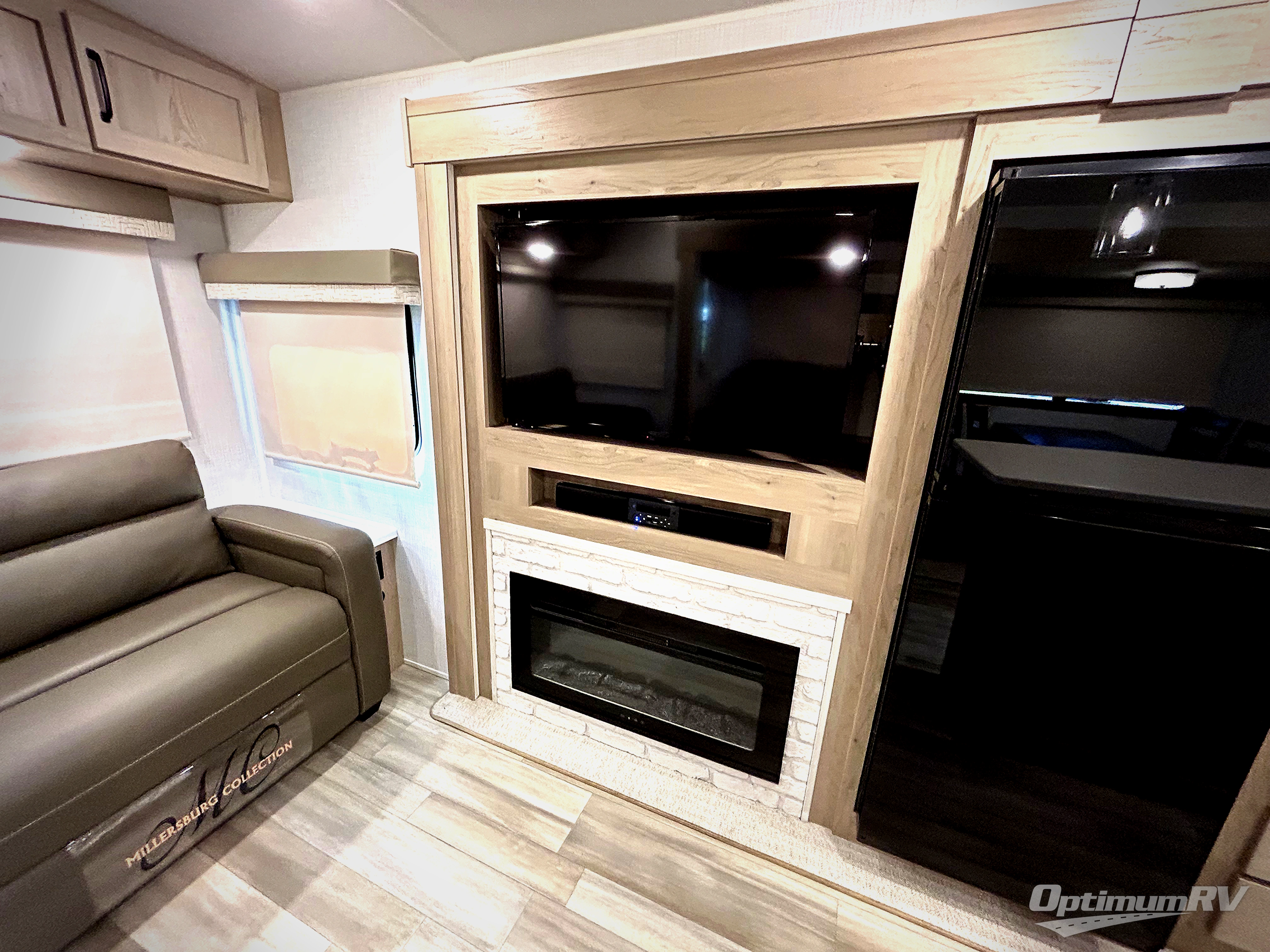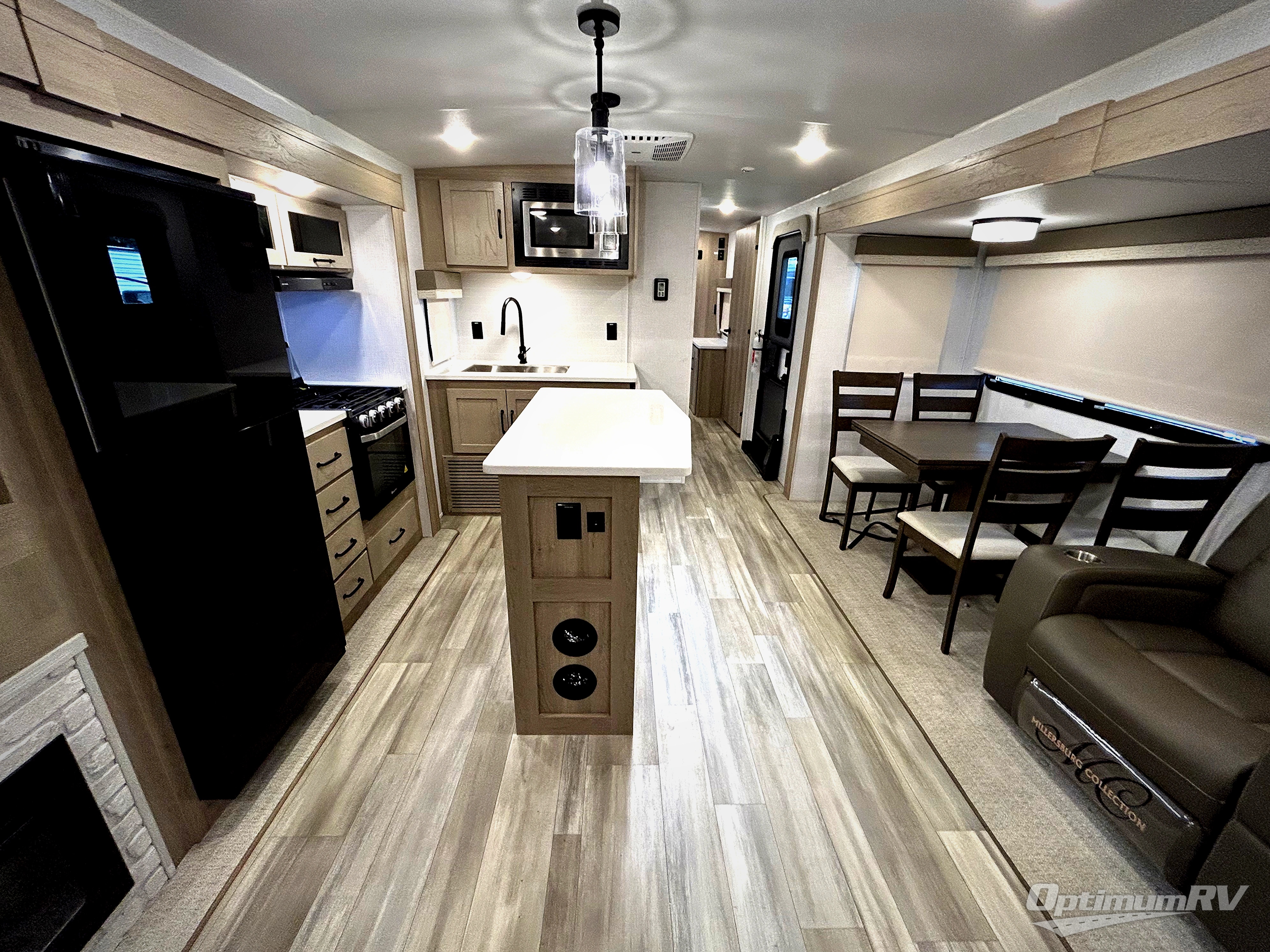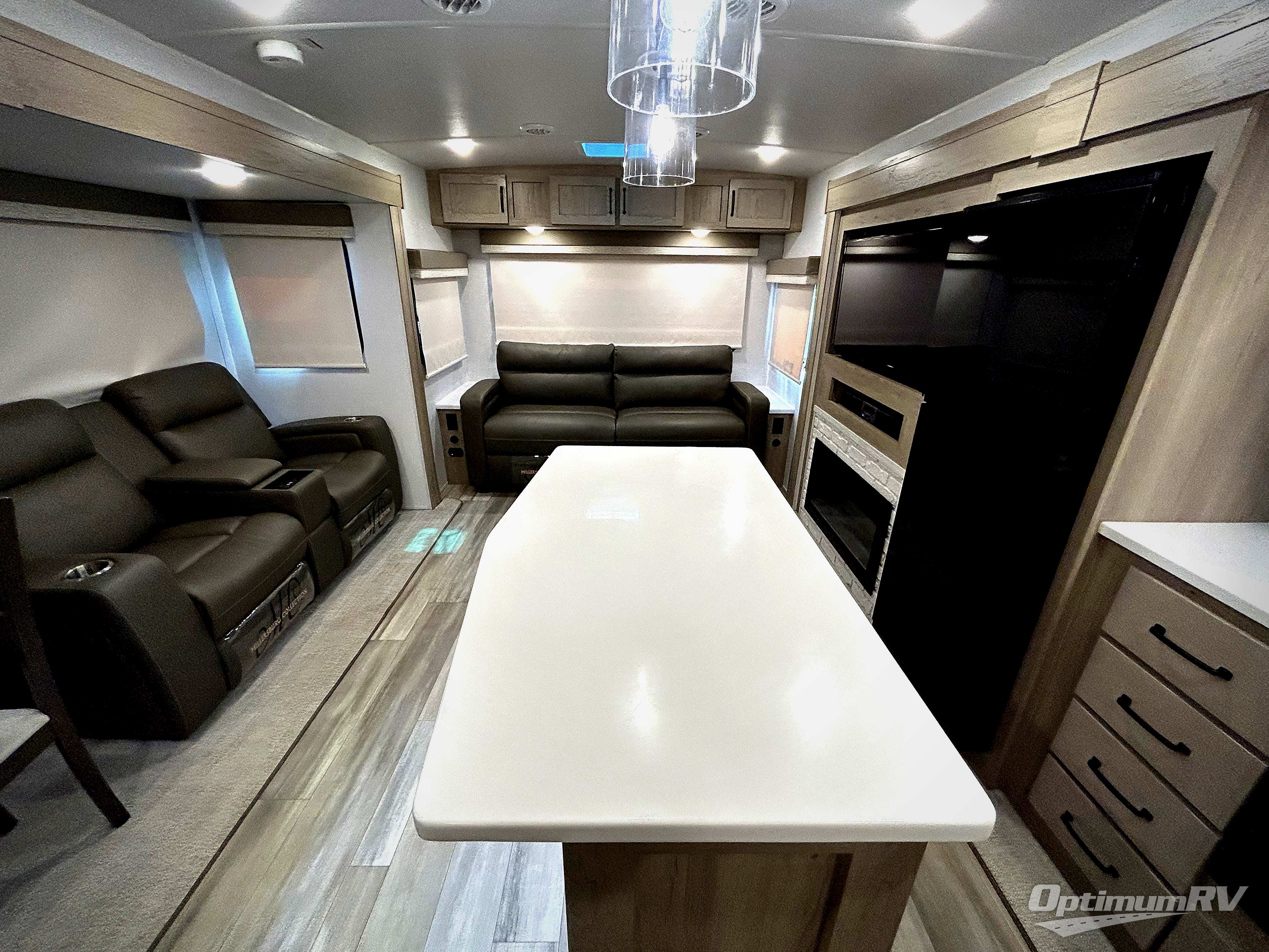If you enjoy entertaining friends while camping, this trailer offers seating for nine in the combined living and kitchen area on the hide-a-bed sofa, the theater seats and the booth dinette. Everyone can visit, watch the Smart TV and enjoy the fireplace all while the cook is preparing snacks in the kitchen with full amenities. The full bathroom has two entries for convenience, and the front bedroom offers a queen bed slide for more floor space or choose a king option, plus plenty of storage. And the two 11' awnings offer an outdoor living area after you add your camping chairs.