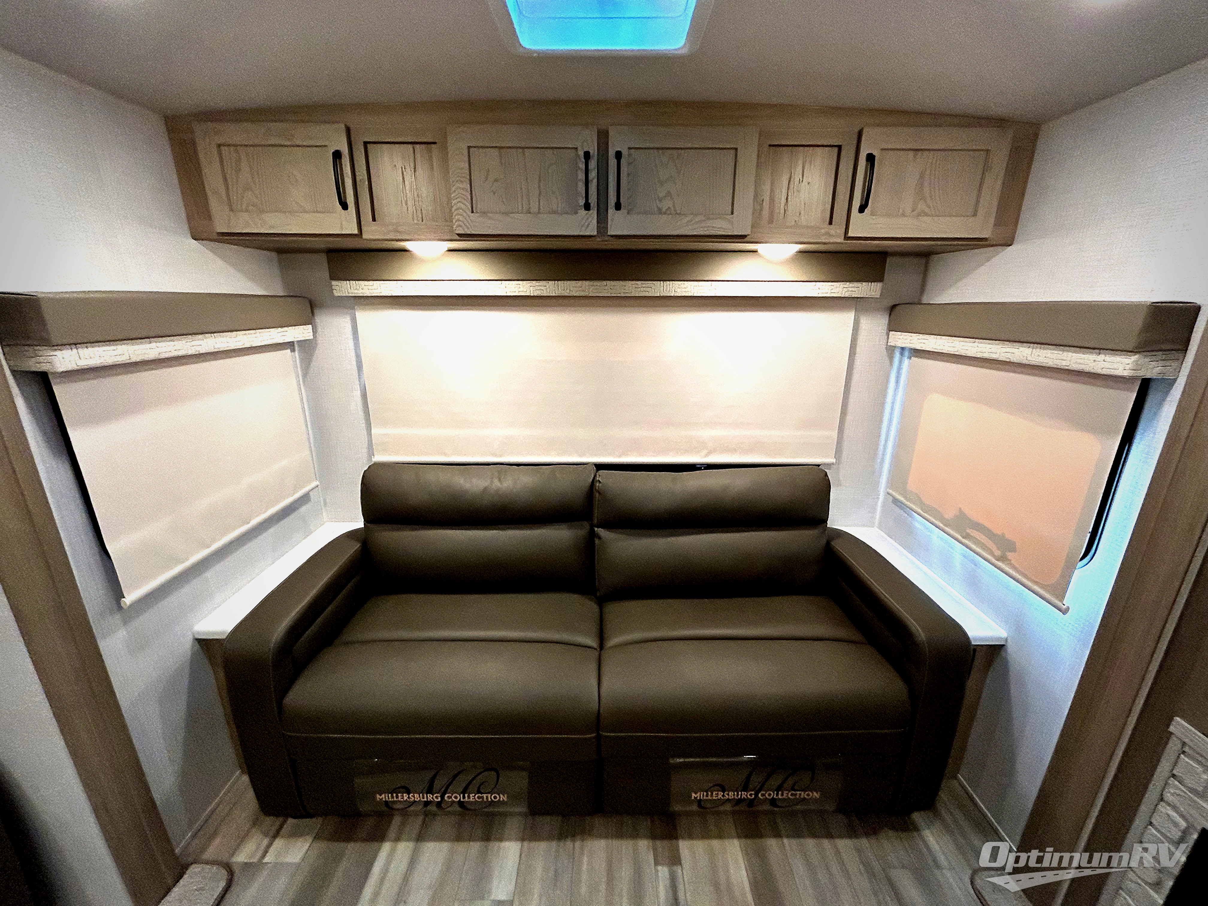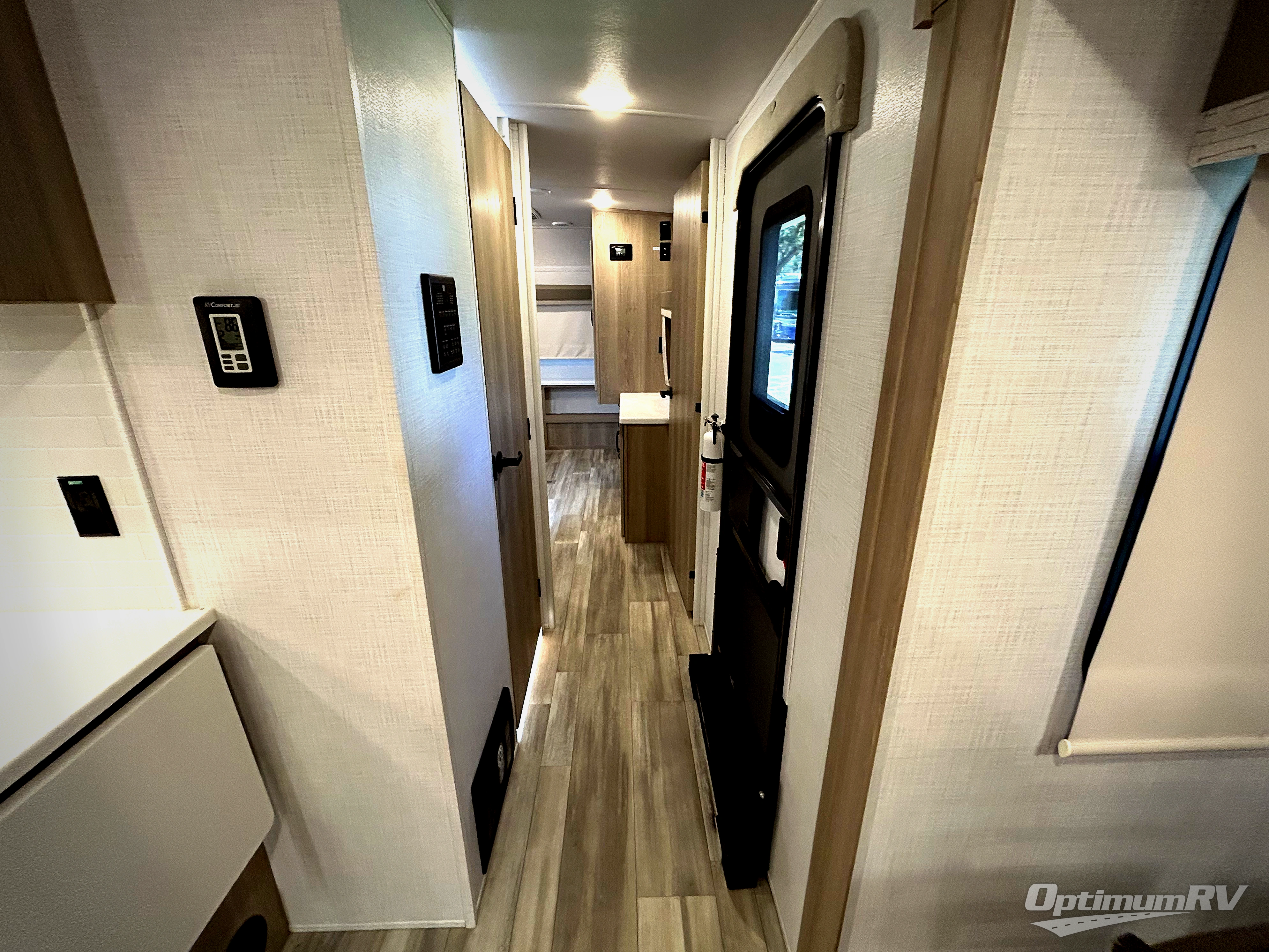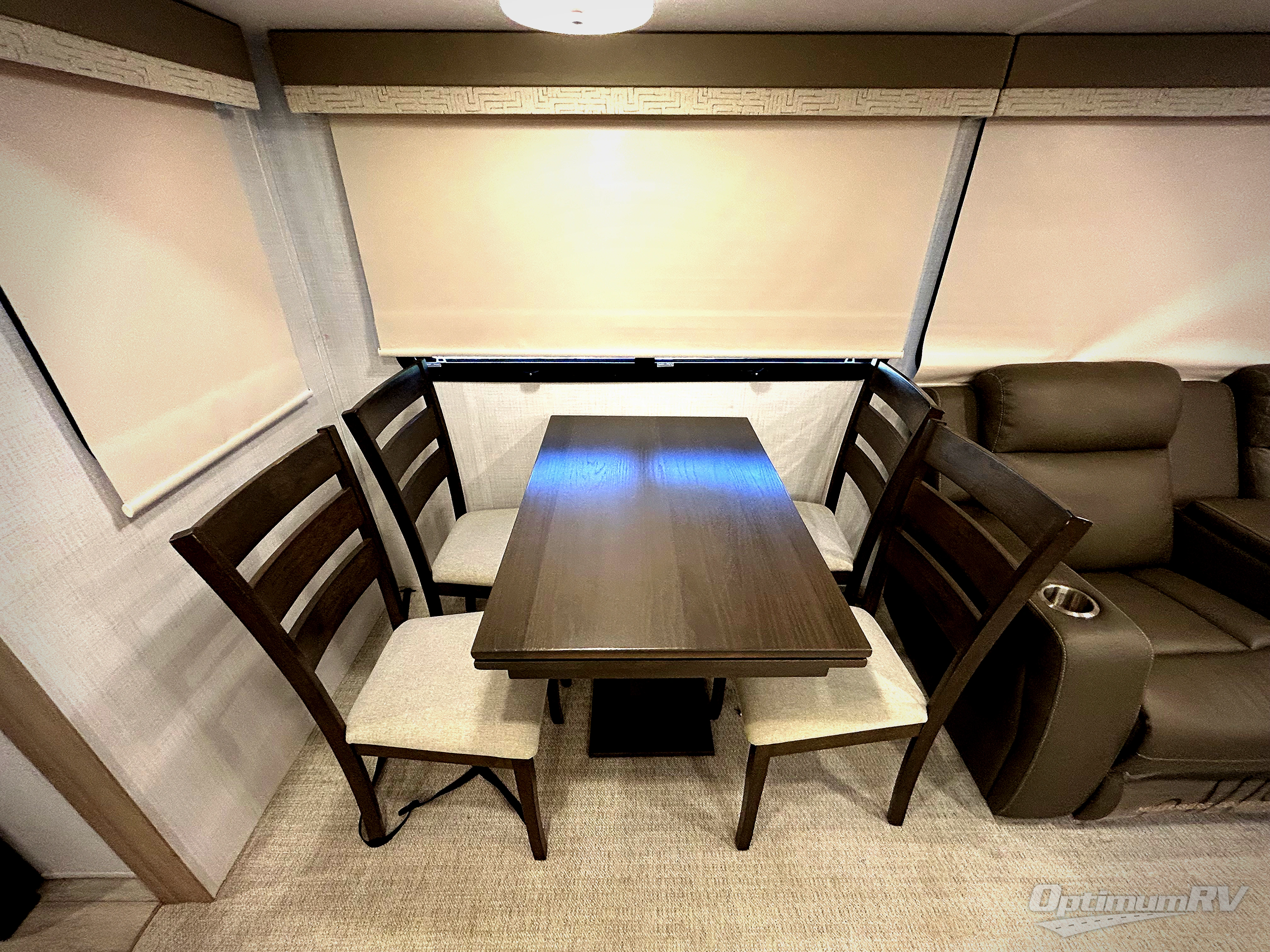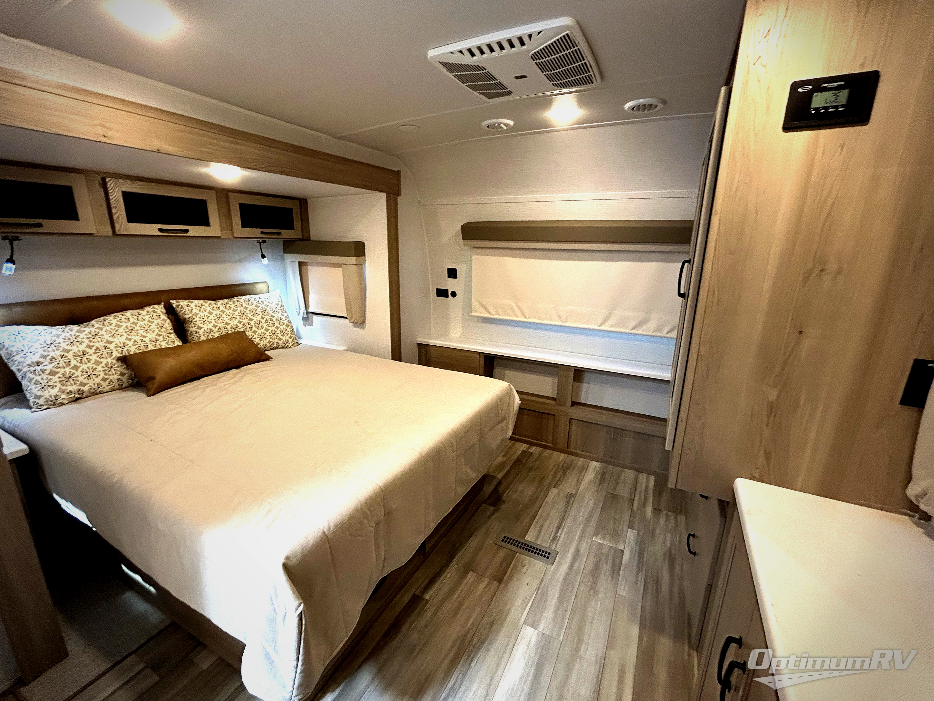 If you enjoy entertaining friends while camping, this trailer offers seating for nine in the combined living and kitchen area on the hide-a-bed sofa, the theater seats and the booth dinette. Everyone can visit, watch the Smart TV and enjoy the fireplace all while the cook is preparing snacks in the kitchen with full amenities. The full bathroom has two entries for convenience, and the front bedroom offers a queen bed slide for more floor space or choose a king option, plus plenty of storage. And the two 11' awnings offer an outdoor living area after you add your camping chairs.