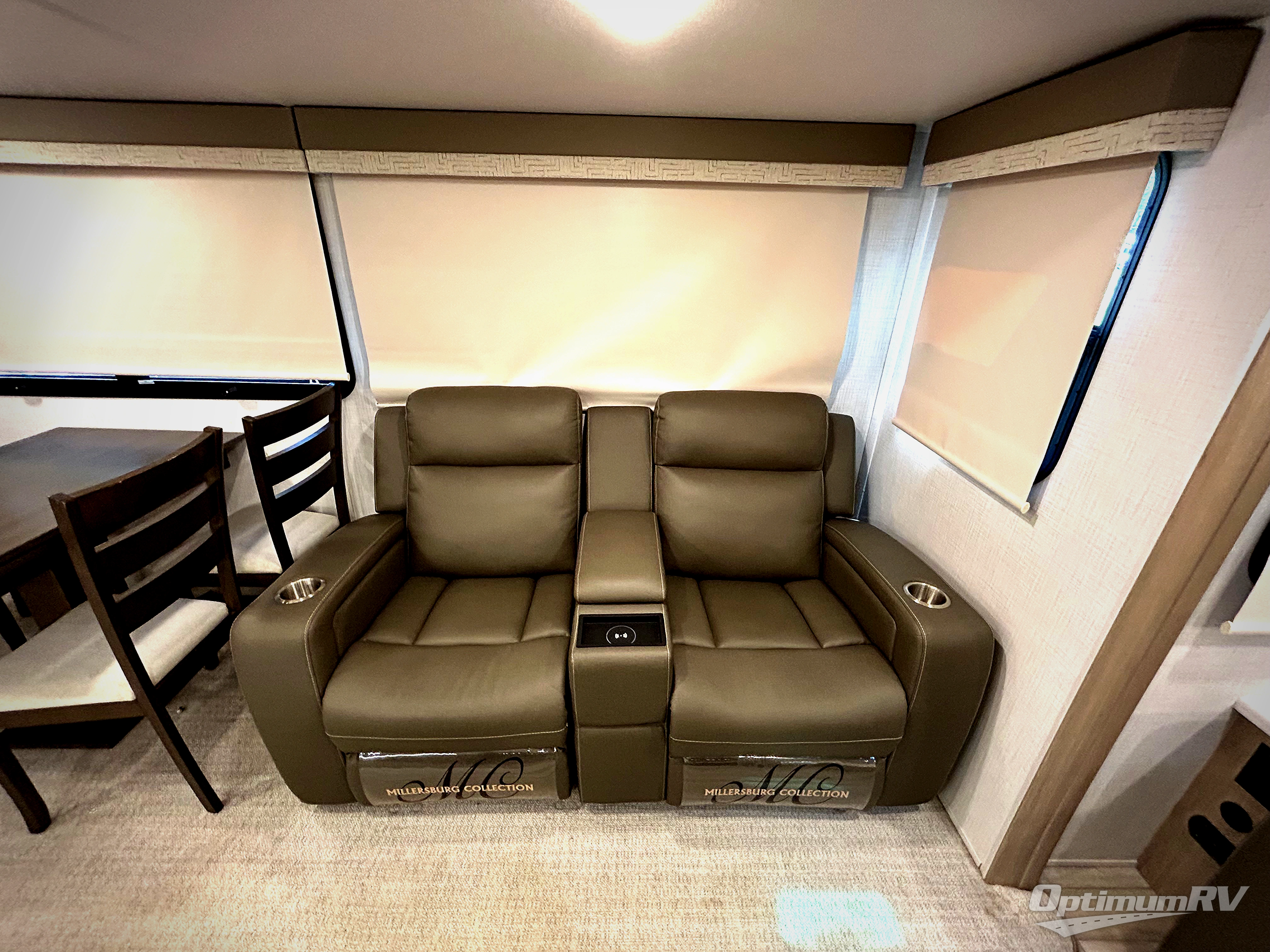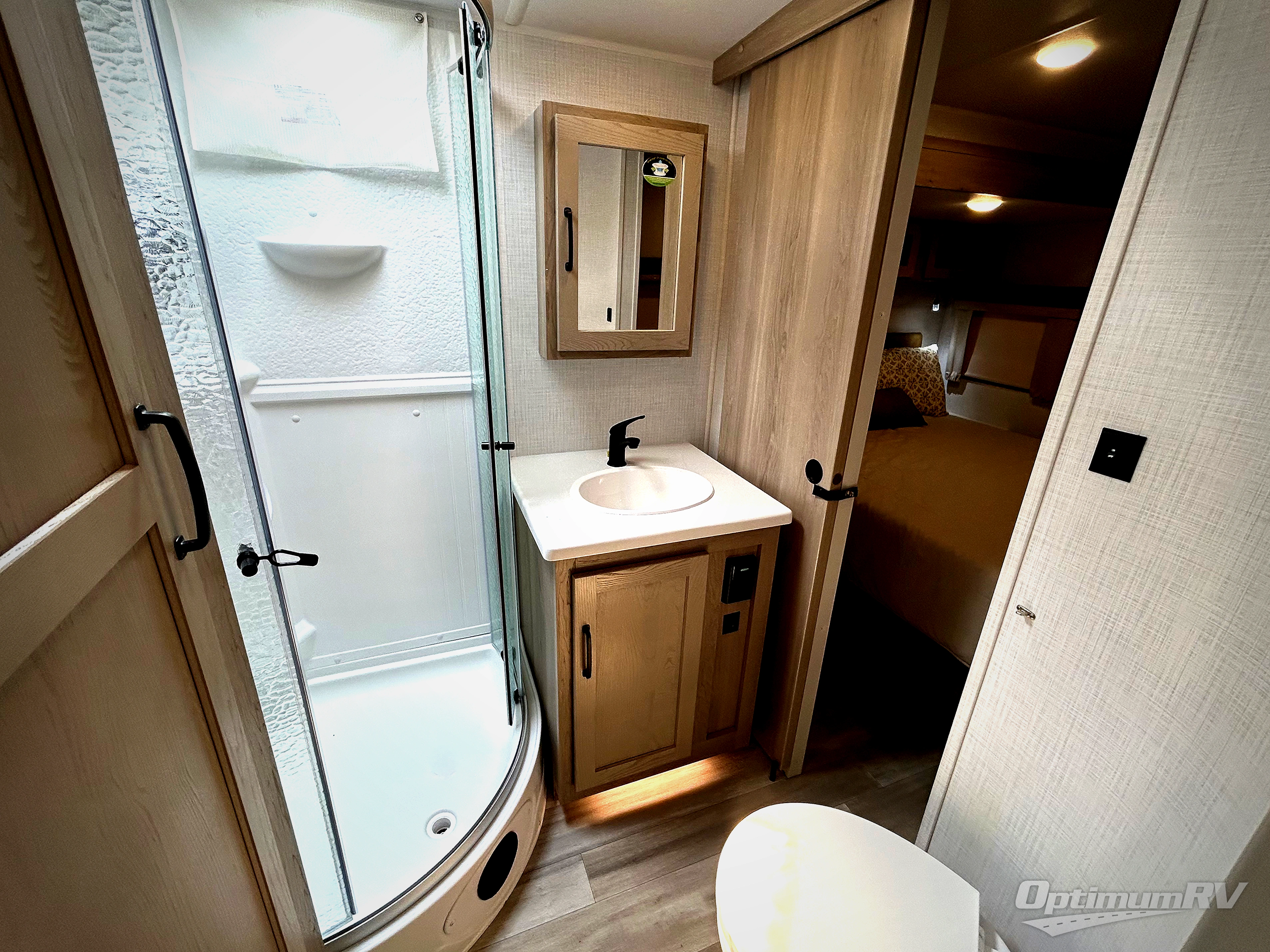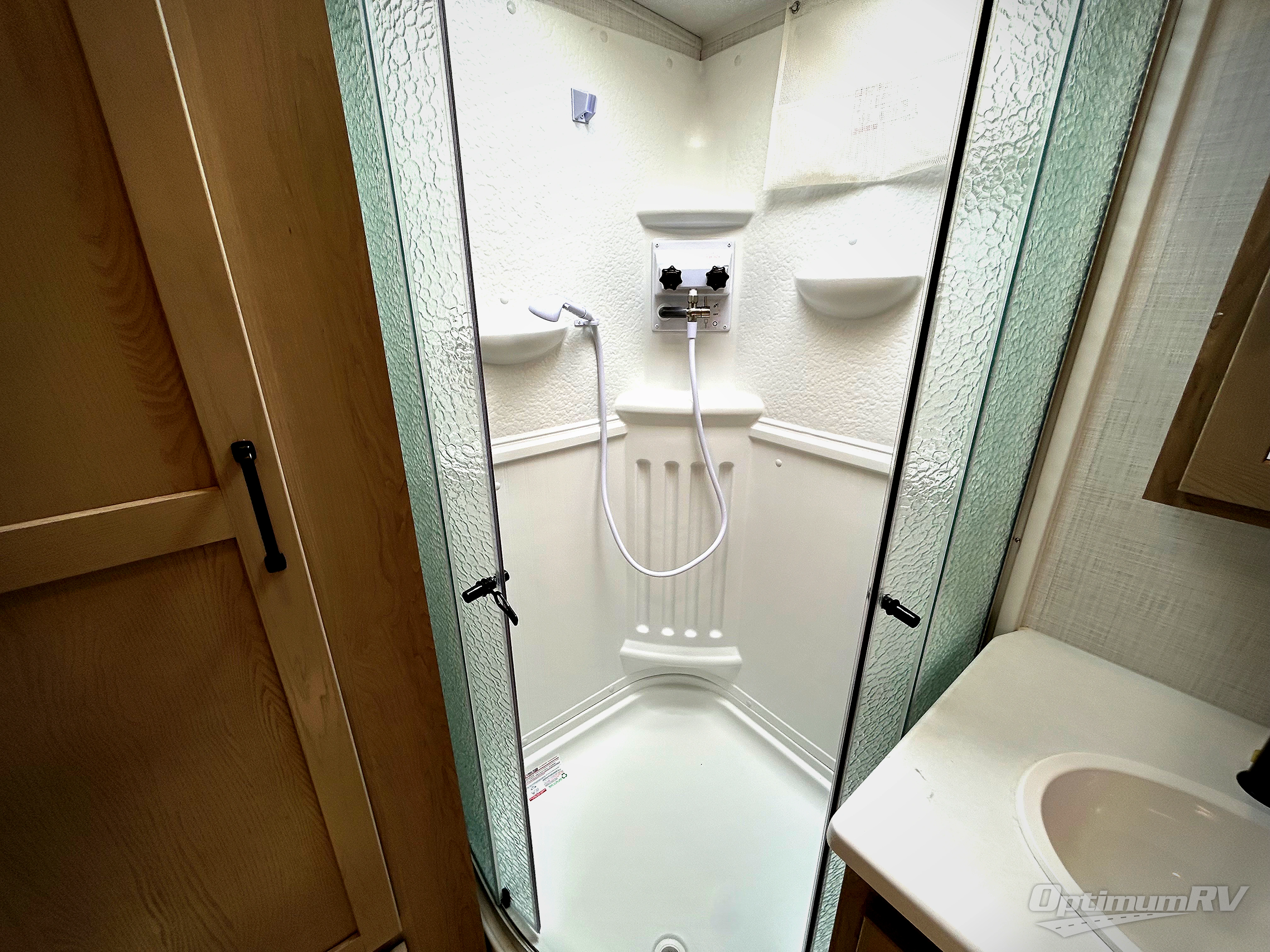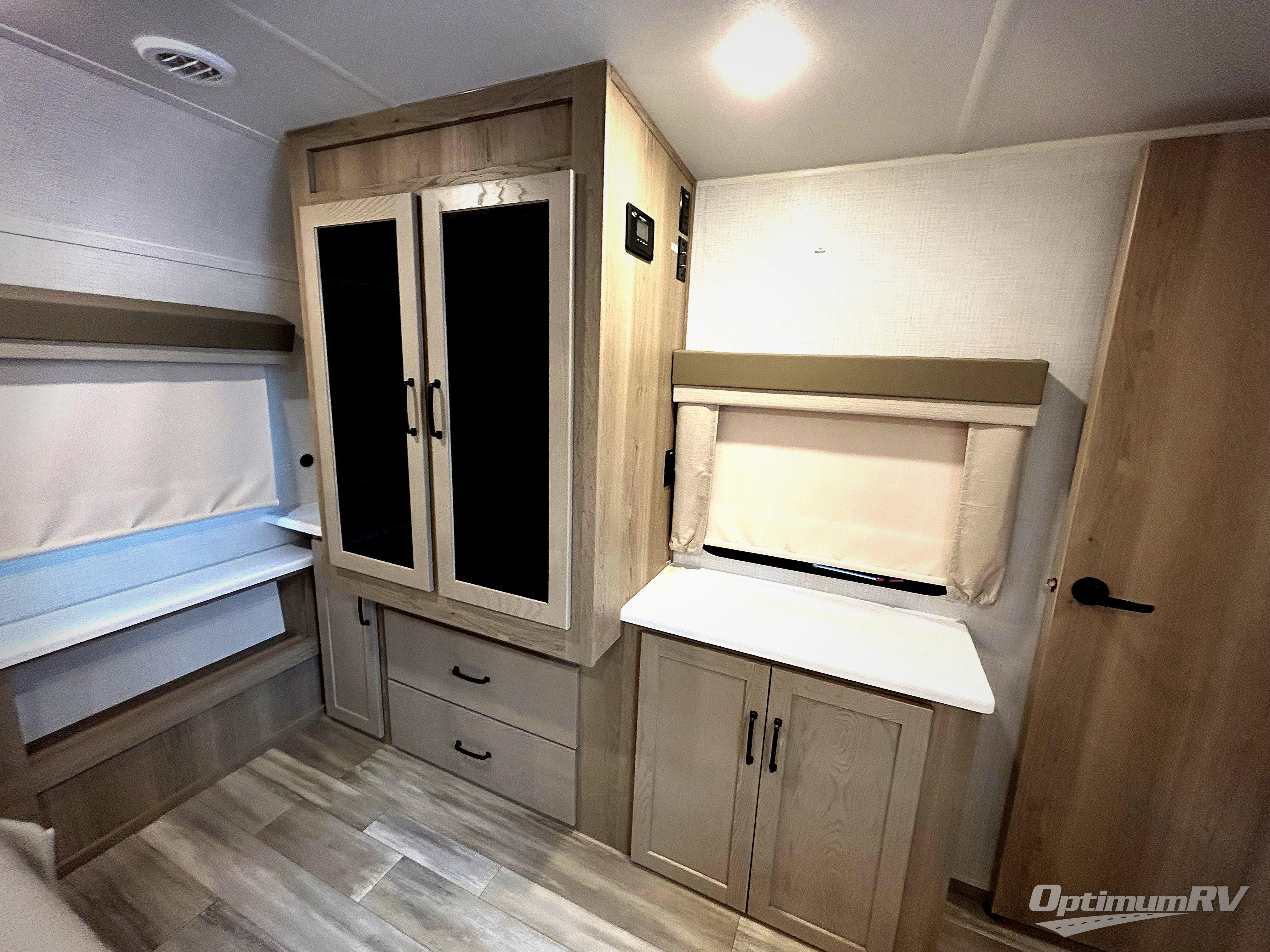 If you enjoy entertaining friends while camping, this trailer offers seating for nine in the combined living and kitchen area on the hide-a-bed sofa, the theater seats and the booth dinette. Everyone can visit, watch the Smart TV and enjoy the fireplace all while the cook is preparing snacks in the kitchen with full amenities. The full bathroom has two entries for convenience, and the front bedroom offers a queen bed slide for more floor space or choose a king option, plus plenty of storage. And the two 11' awnings offer an outdoor living area after you add your camping chairs.