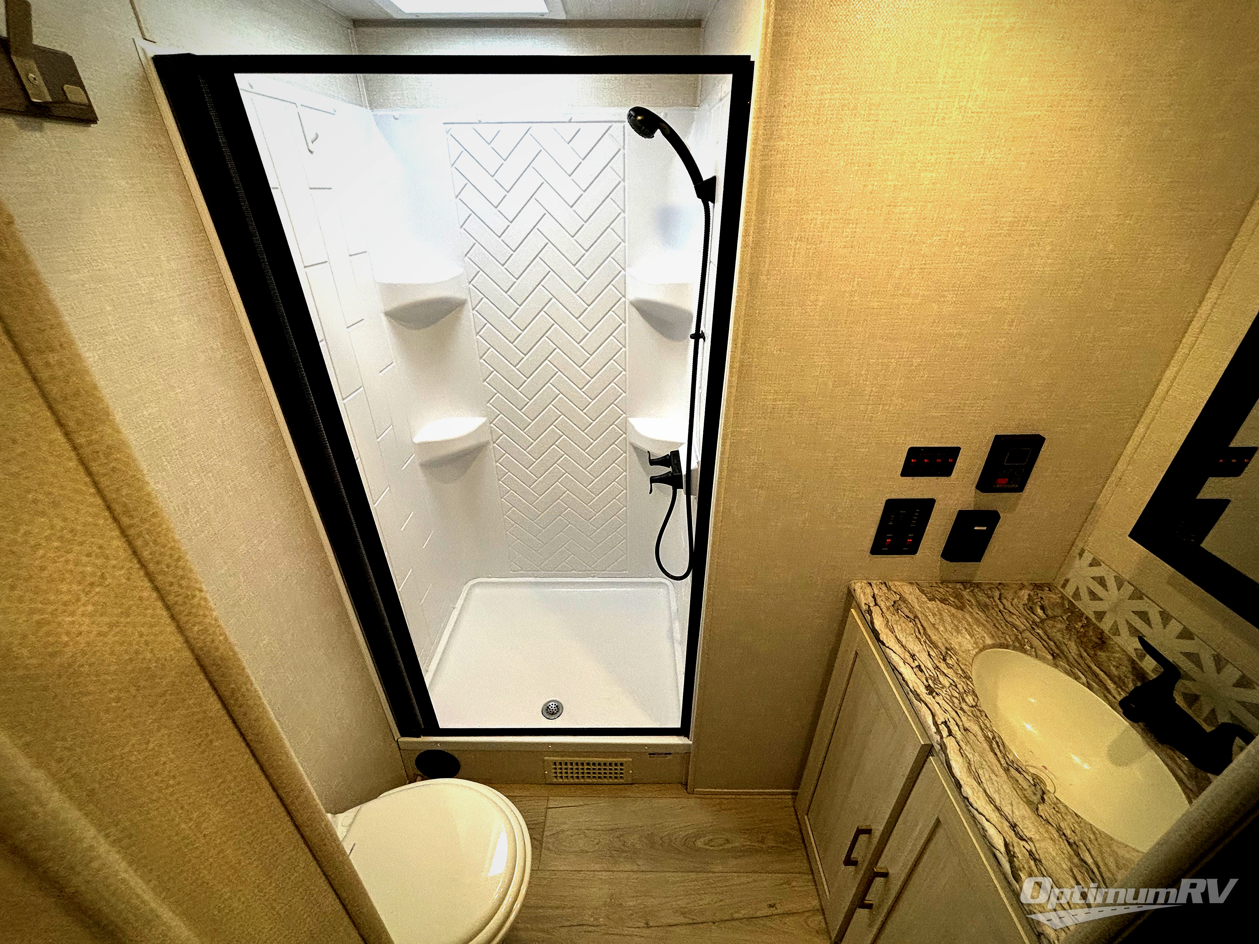 With any Grand Surveyor travel trailer by Forest River you will enjoy turn-key ready-to-go features and quality construction! Each model includes Azdel composite walls and a gel coated fiberglass front cap with an automotive style tinted windshield for a sleek look. There are friction hinge black glass entry door(s), an adjustable platform step with a night light, plus Goodyear tires and a power tongue jack for easy towing. The interior will have you feeling right at home with roller shades, residential faucets, sinks, and bathroom vanity, plus Surf(x) seamless countertops throughout. You can also plan for adventure with a 2" rear accessory and exterior spray port, and there are slam latch baggage doors throughout to keep all your gear secure. Other stand-out features include a central vacuum system, a 200 watt solar panel with a 30 amp controller, a tankless water heater, carpet-free interiors, and the list goes on!