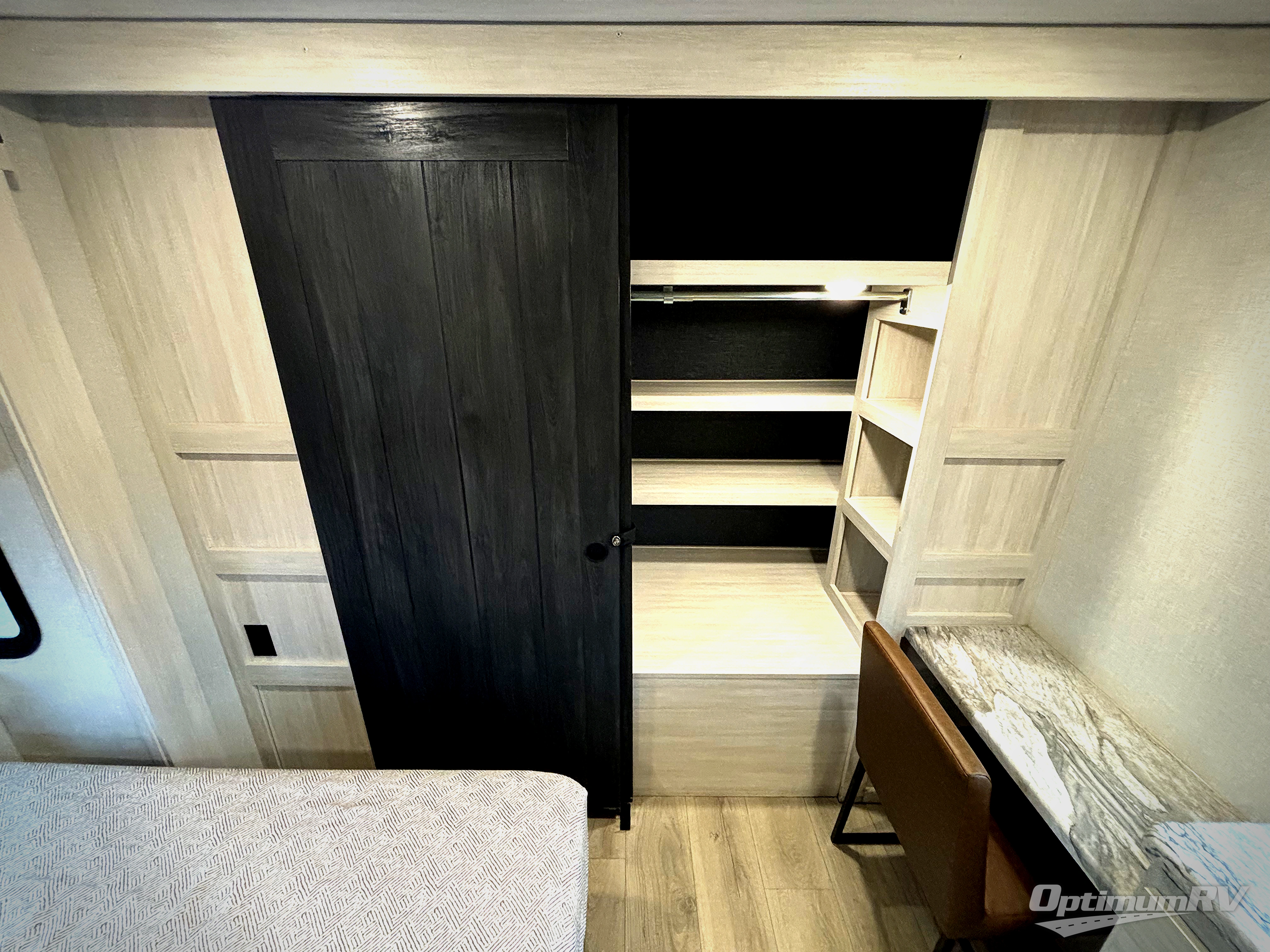 The perfect couples coach that is cozy and also features room for guests! As you enter you will notice the bar top with two chairs facing the rear of the unit where you can easily view the TV and fireplace in the living area while you enjoy your morning coffee. The combined kitchen and living area features two slides with the larger slide along the roadside featuring the kitchen appliances and a 56" tri-fold sofa which would be great for overnight family and friends. There is also a 56" theater seat facing the TV and fireplace, and a slide out free standing table with two chairs on one side and a multi-purpose ottoman than can be used where you need it anytime. Central vac will allow you to clean up easily throughout the unit. You also can choose to cook inside or out thanks to the outside kitchen featured under the 20' awning. When it's time to call it a night, you can clean up in the spacious full bath, then head to the front master bedroom to retire. There is a custom king bed slide out here, along with a full-wall wardrobe in front, a dresser and desk, a closet with washer and dryer prep, plus a second fireplace!