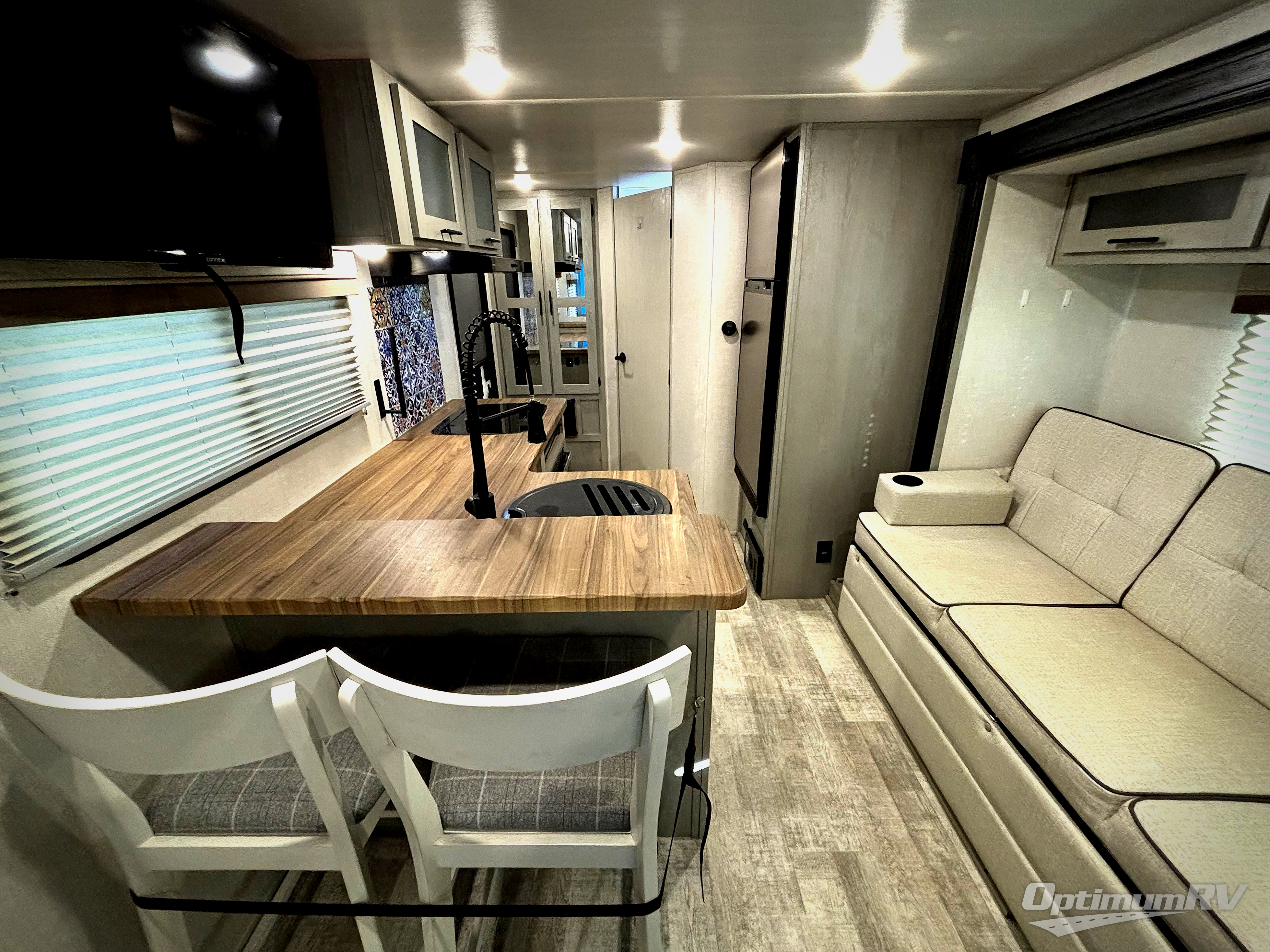 This Ibex travel trailer is incredibly versatile! With two sofas, there's plenty of room to relax inside, or set up outdoors under the 16' awning. There's a 60" x 80" Murphy bed where you'll be able to sleep comfortably. Dine in style at the L-shaped countertop with bar stool seats and chat with the cook in the kitchen. Stainless steel appliances finish the look. At the rear you'll find a full bath with a radius shower. And you might like to add the optional Unplugged Package that comes with premium lithium-ion batteries, an easy view control panel, a high efficiency A/C, and more!