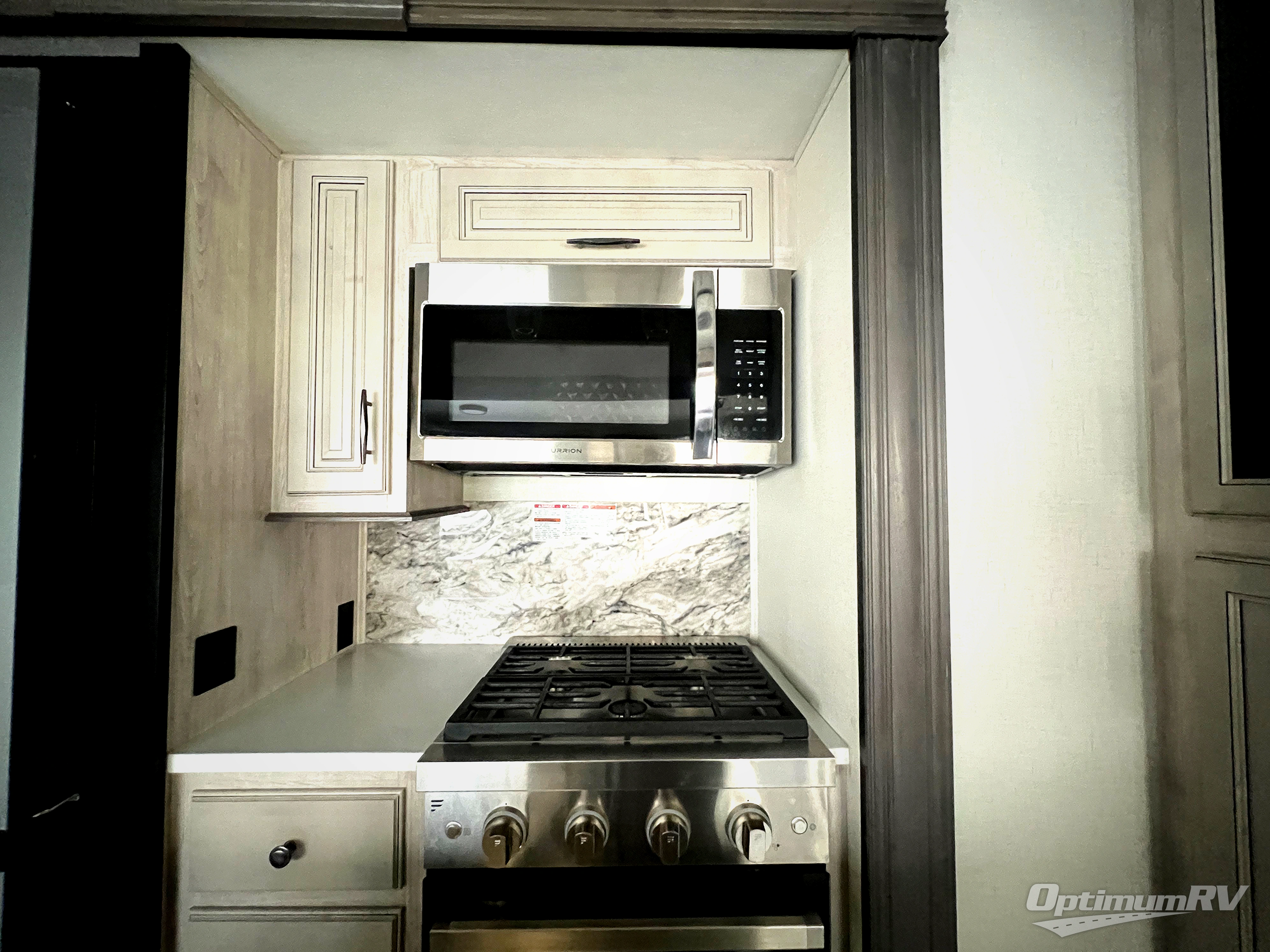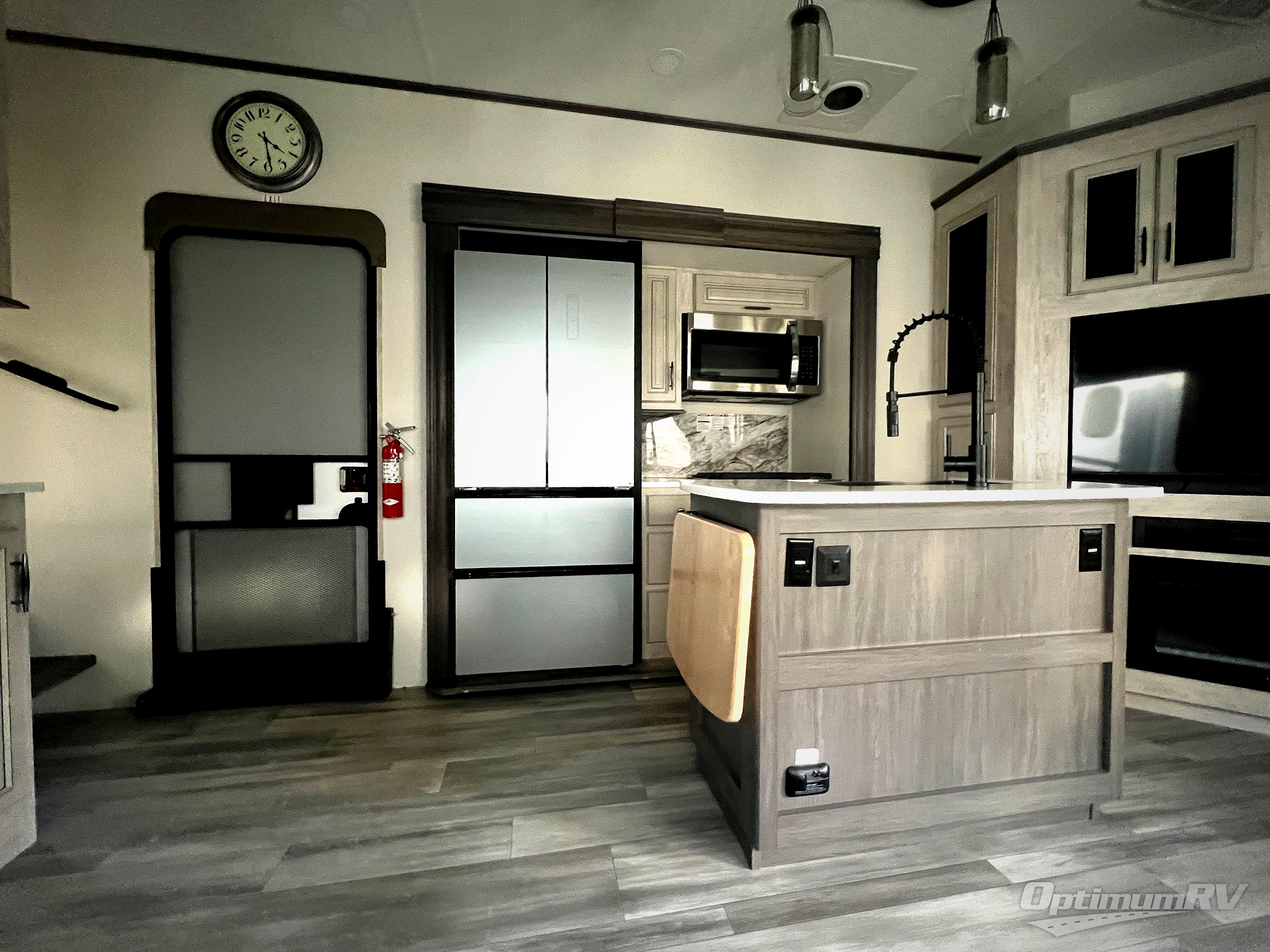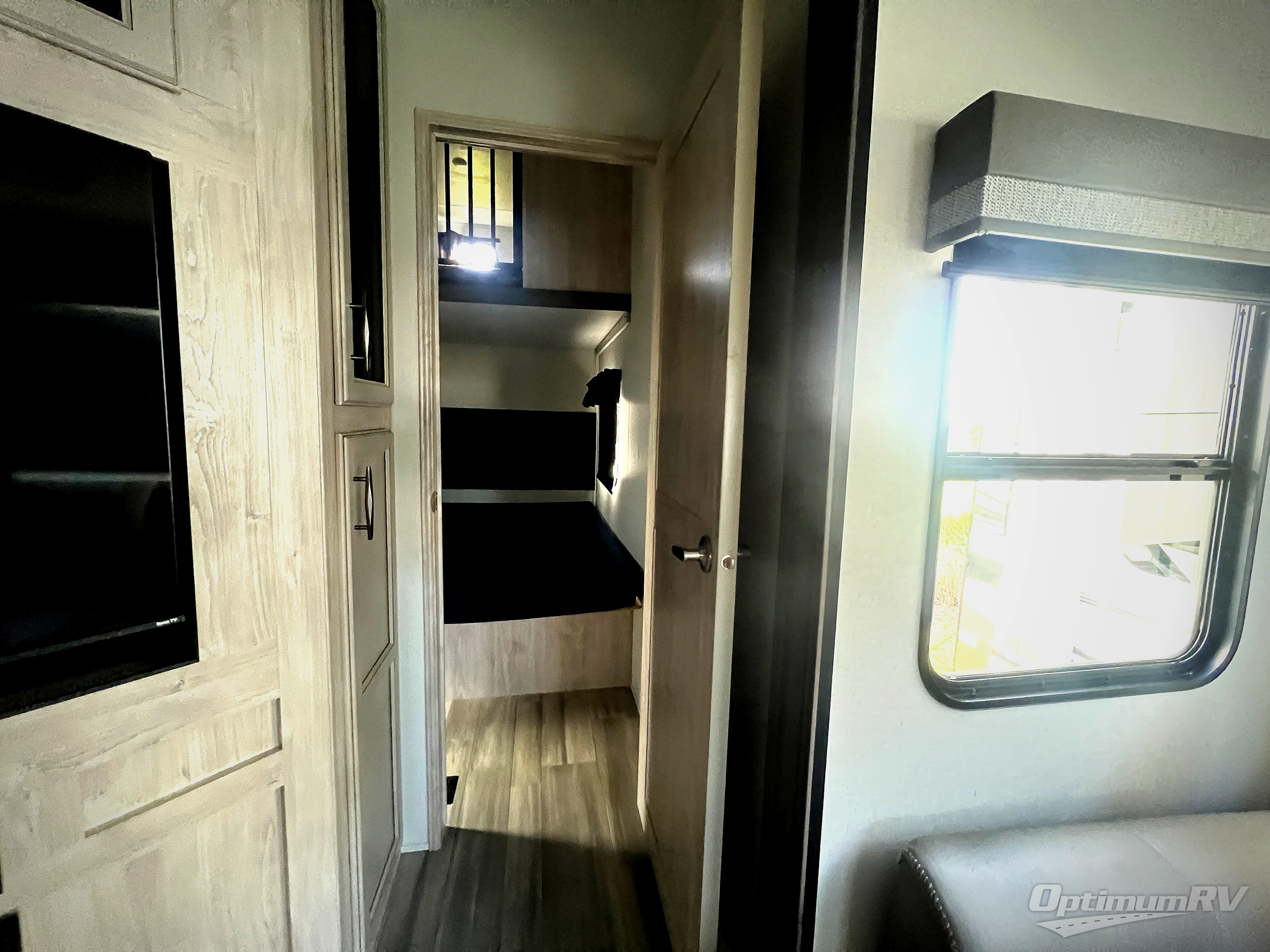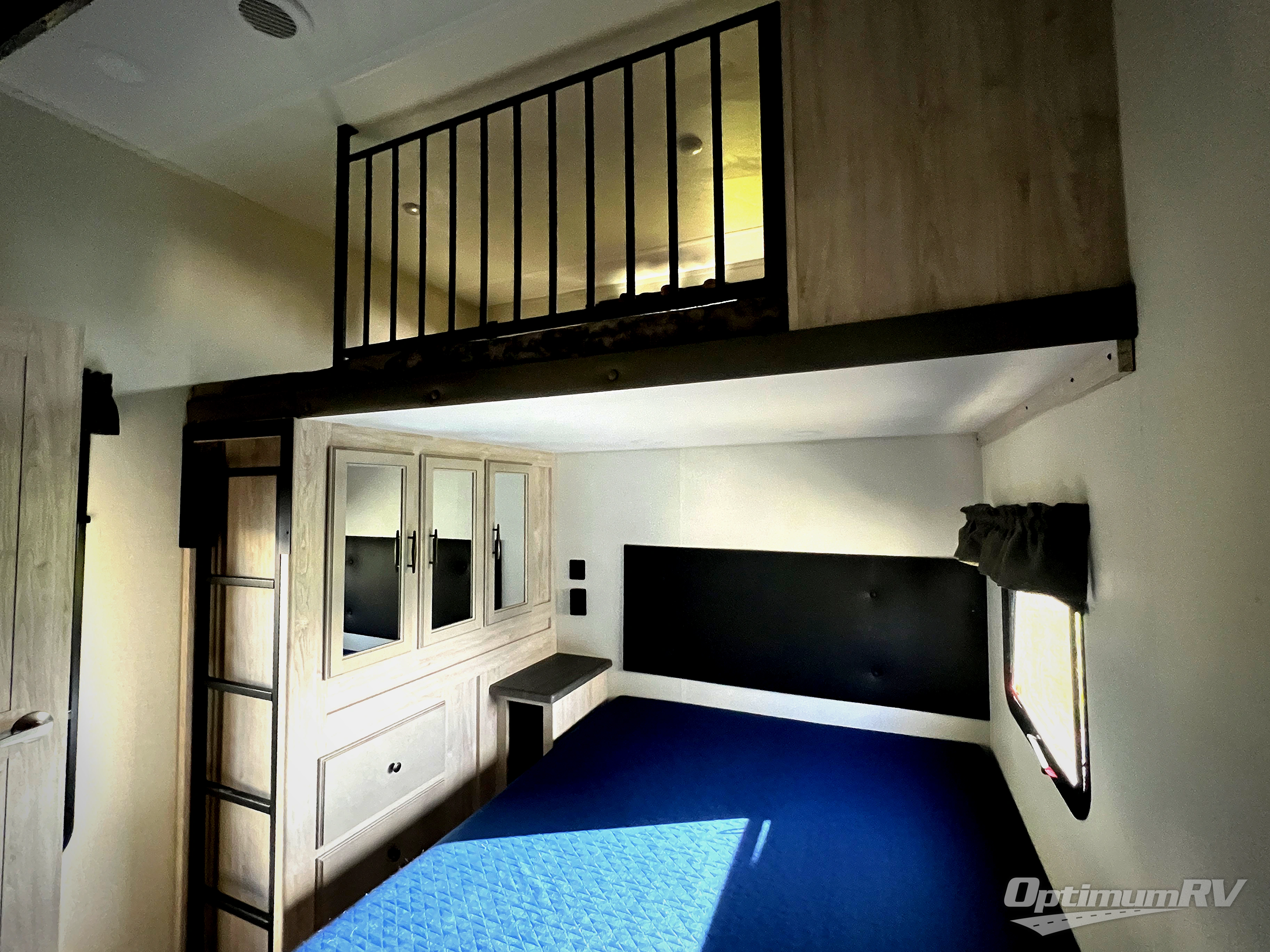 This fifth wheel is perfect for those whole like to camp with a whole group, whether it be with family or friends! There is a rear private suite with a lower RV queen bed and loft bed, a half bath, and your own private entrance. The front private bedroom includes a king bed slide out with a large front wardrobe, a dresser, and washer/dryer prep. And the spacious full bath is close by for easy nighttime use. Everyone can meet in the main living area that includes dual opposing slides, a tri-fold sofa and a booth dinette, plus a 50" TV for movie night. There is also a coffee bar here where you can set up your Keurig machine, a pantry for snacks, and a ceiling fan to keep the air moving. You will also love the exterior cooktop for breakfast outdoors, and the two power awnings with LED lights will provide shade during the day and ambience at night!