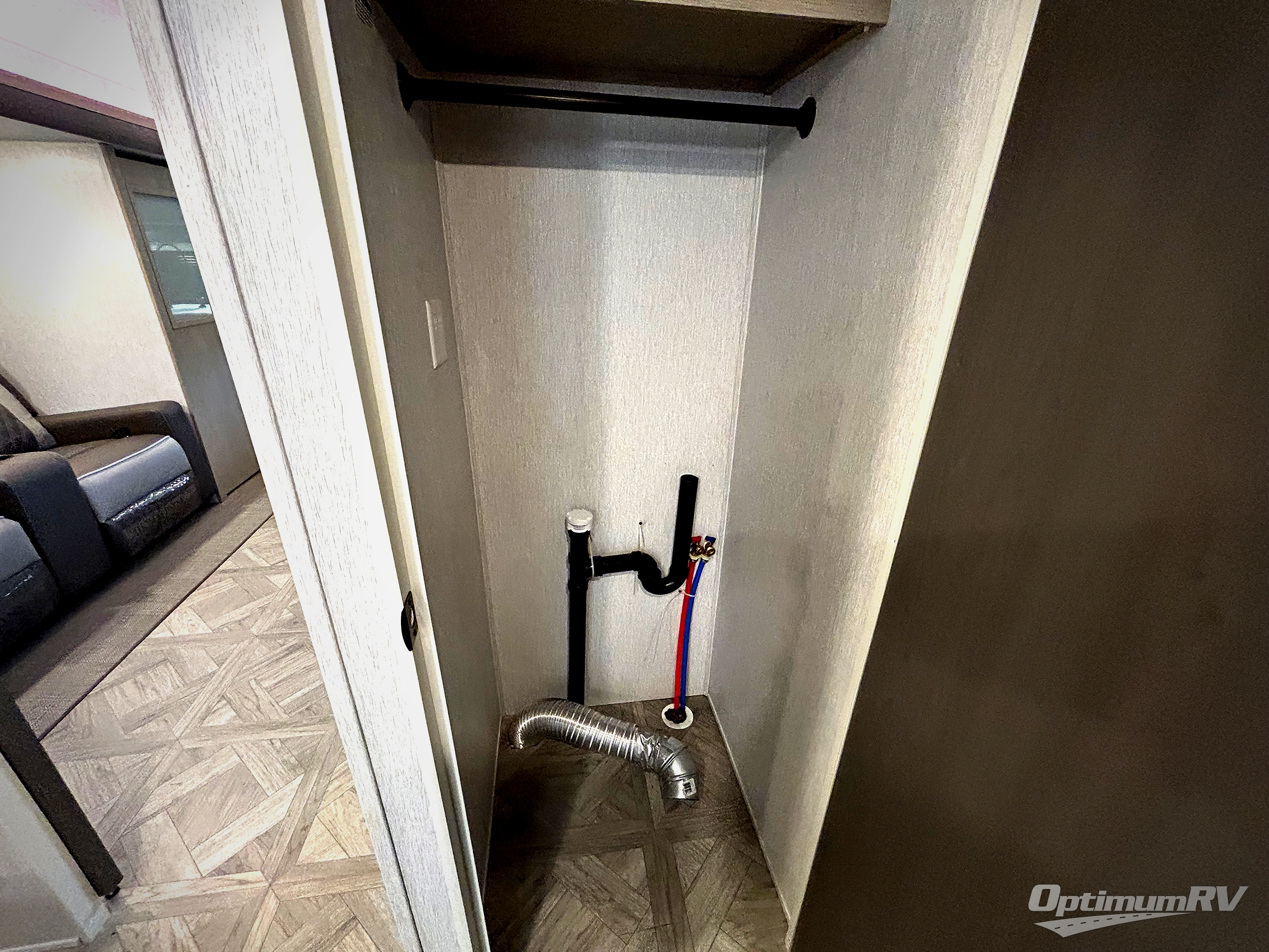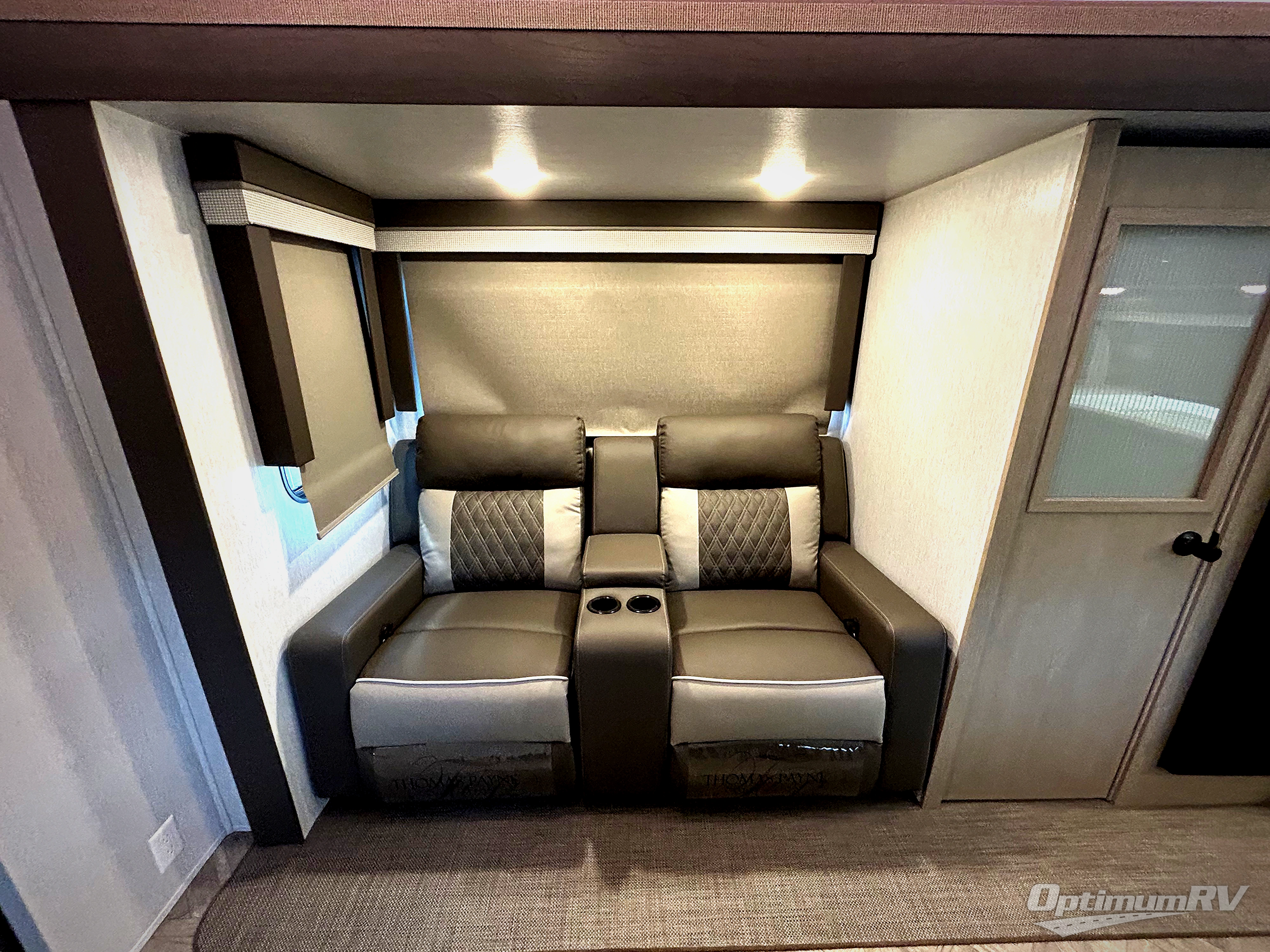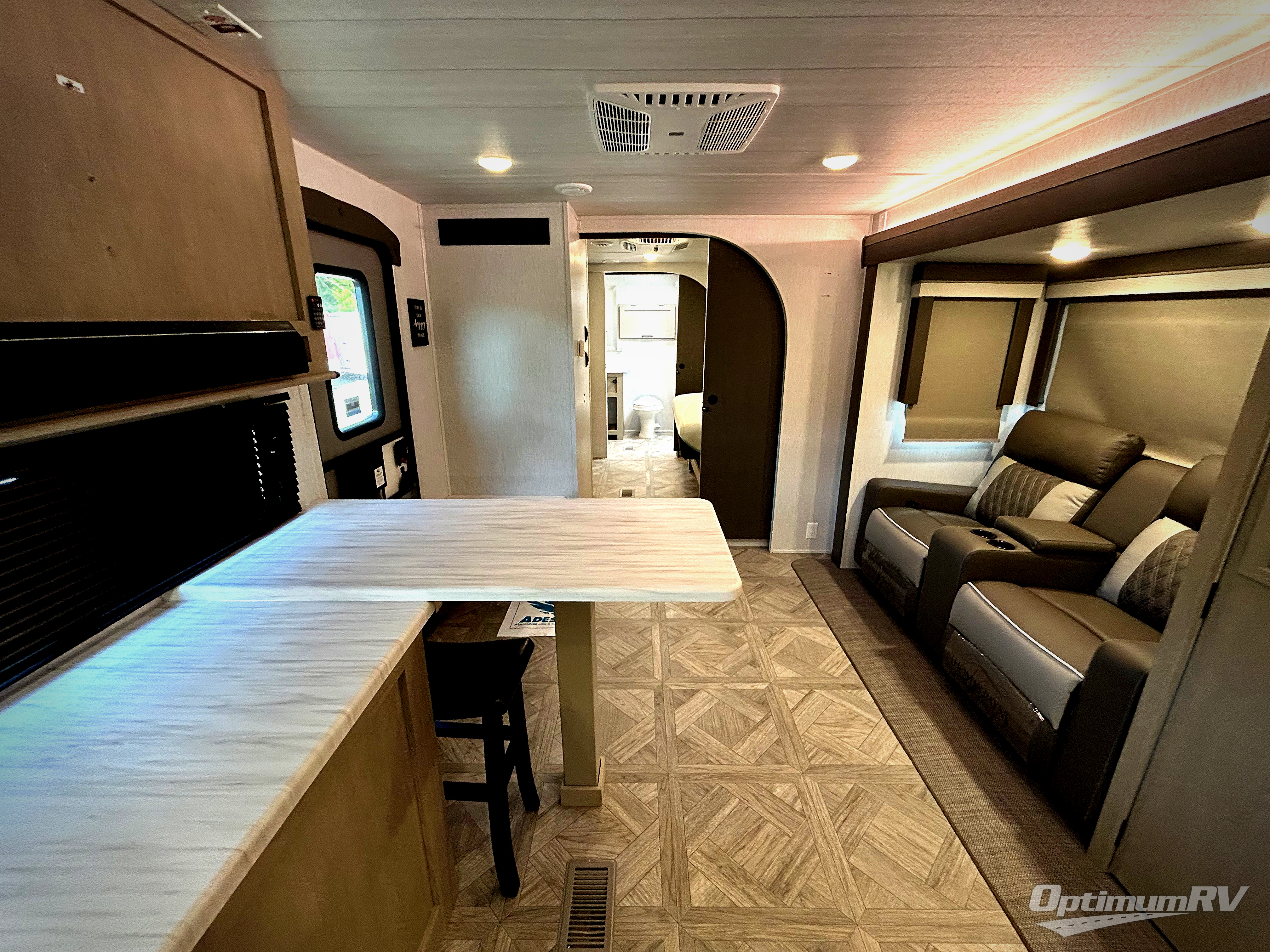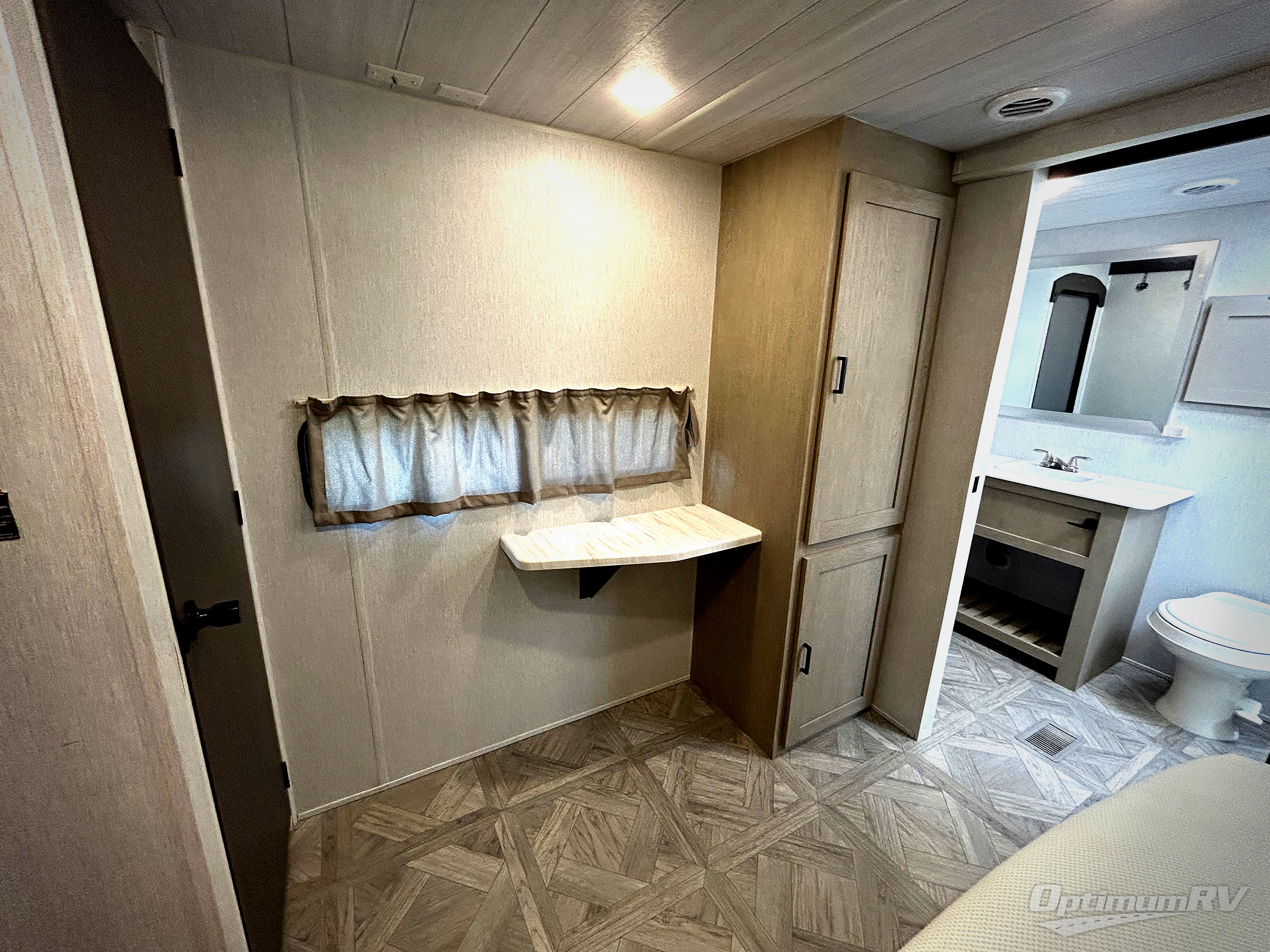 Grab your honey or your best camping friend for fun weekends in this travel trailer. There are two slide outs providing you with more space to relax, plus a front kitchen with ample counter space. The bar top with stools will provide a place to dine each morning, and the theater seat will be perfect for relaxing in the evenings. The middle master bedroom includes a king bed, a desk with TV prep above where you can work away from home if needed, and even a closet with washer and dryer prep if you plan to go RVing full-time! This model also includes a spacious full rear bath with its own exterior entry door, a walk-in shower, a linen closet for clean towels, and recessed storage for necessities. Don't overlook the exterior with its camp kitchen, 20' awning, and Versa garage for luggage, fishing poles, and more!
