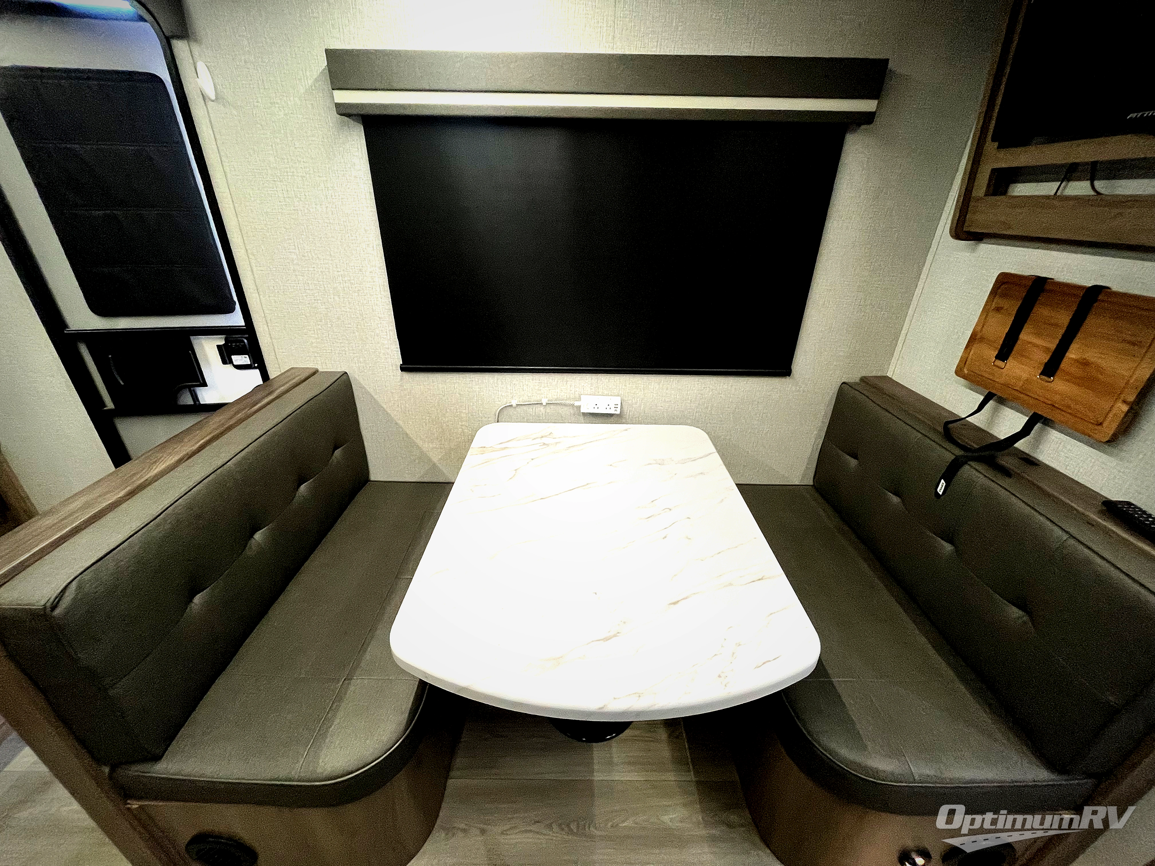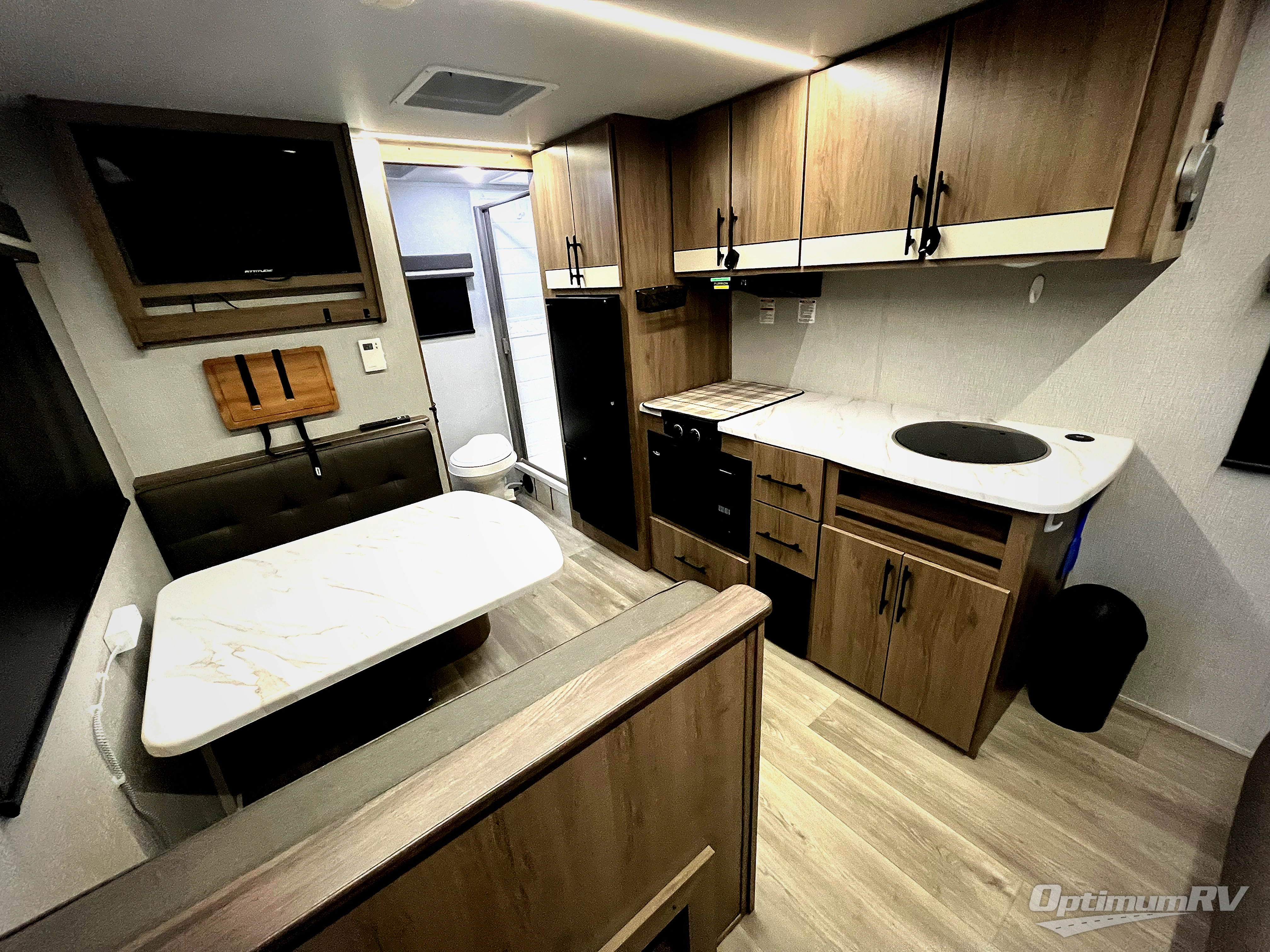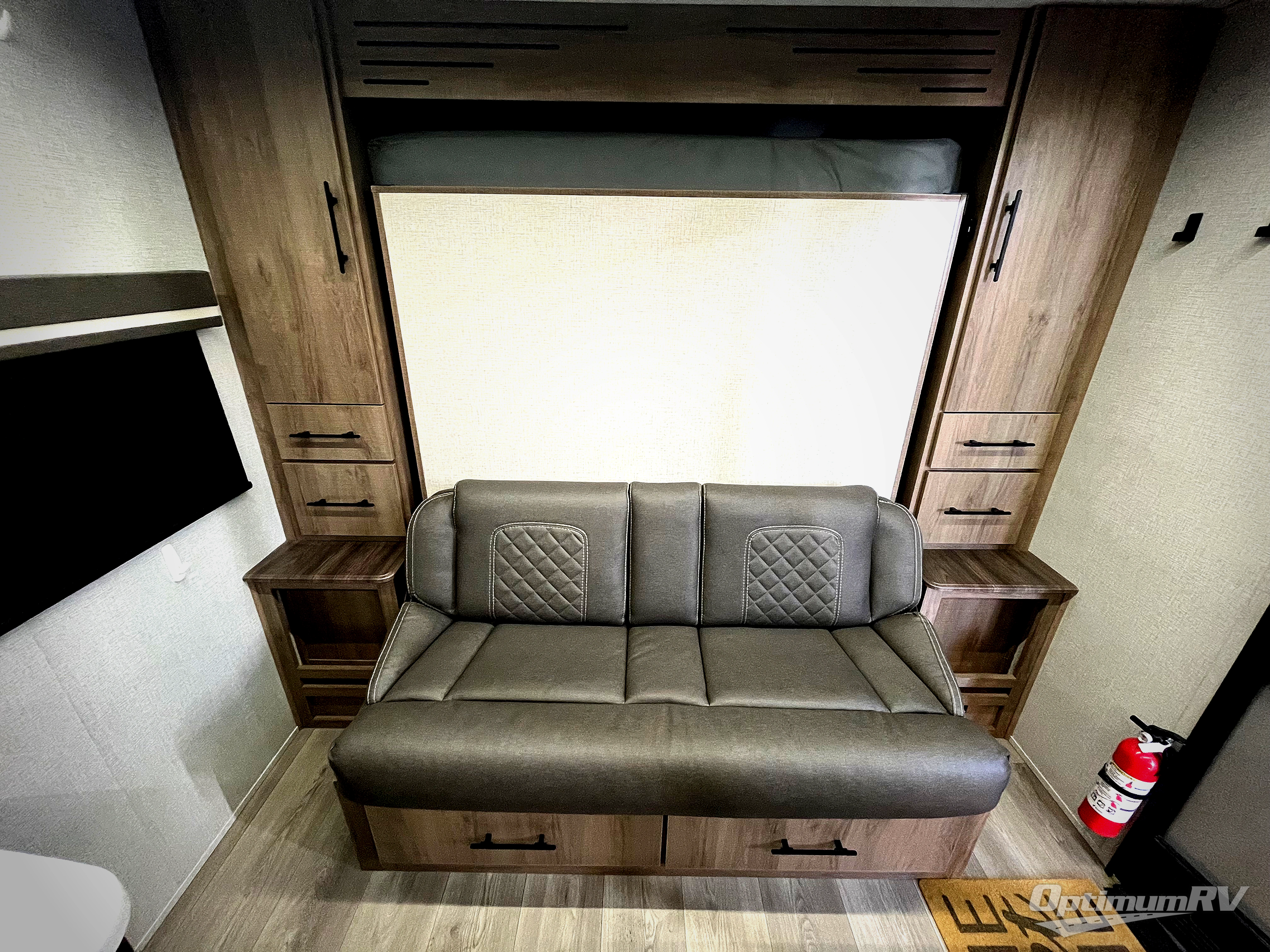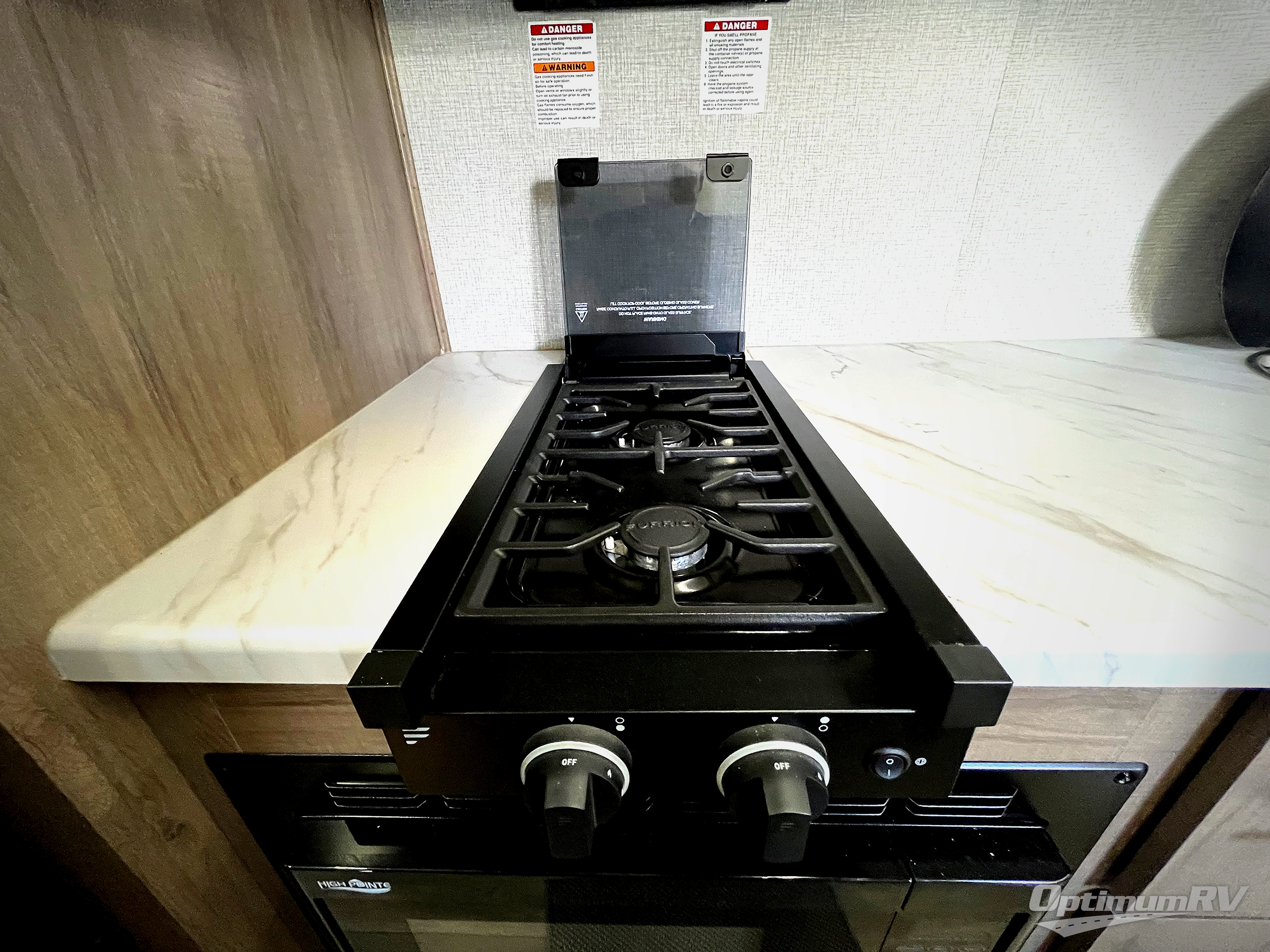 Start looking for your favorite campground to take this travel trailer to! After a fun day at the beach, you can rinse the sand out of your hair with the walk-in shower with a skylight in the full rear bathroom. Depending on what time you enter the unit will determine whether you see the Murphy bed or sofa with drawers underneath and wardrobes on either side of it. The booth dinette is not only great for enjoying meals prepared with the two burner cooktop or outside griddle, but also for transforming into an extra sleeping space!