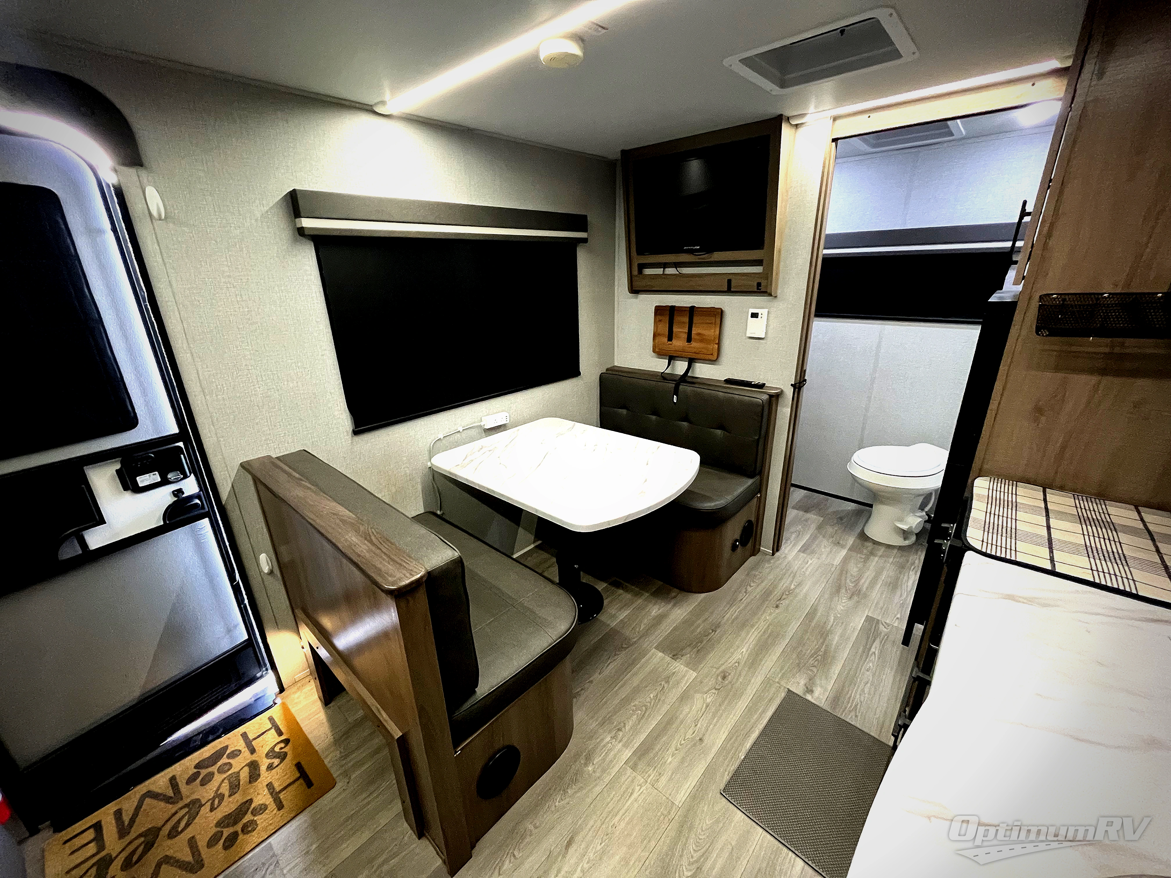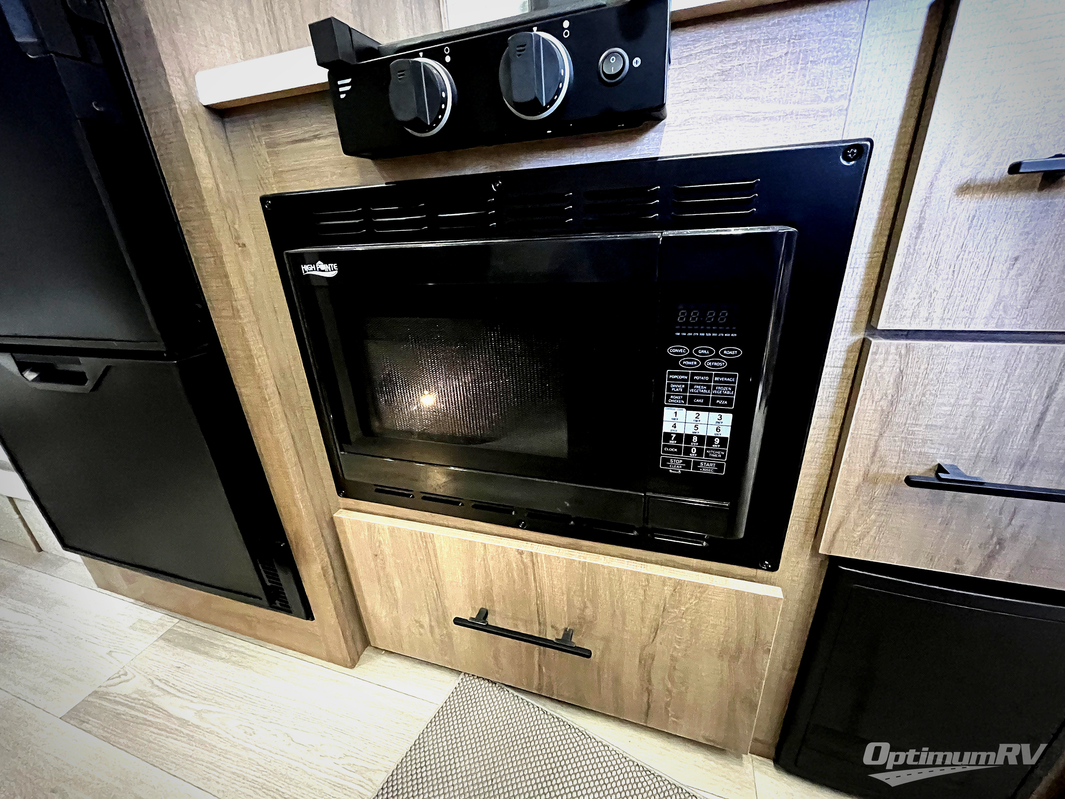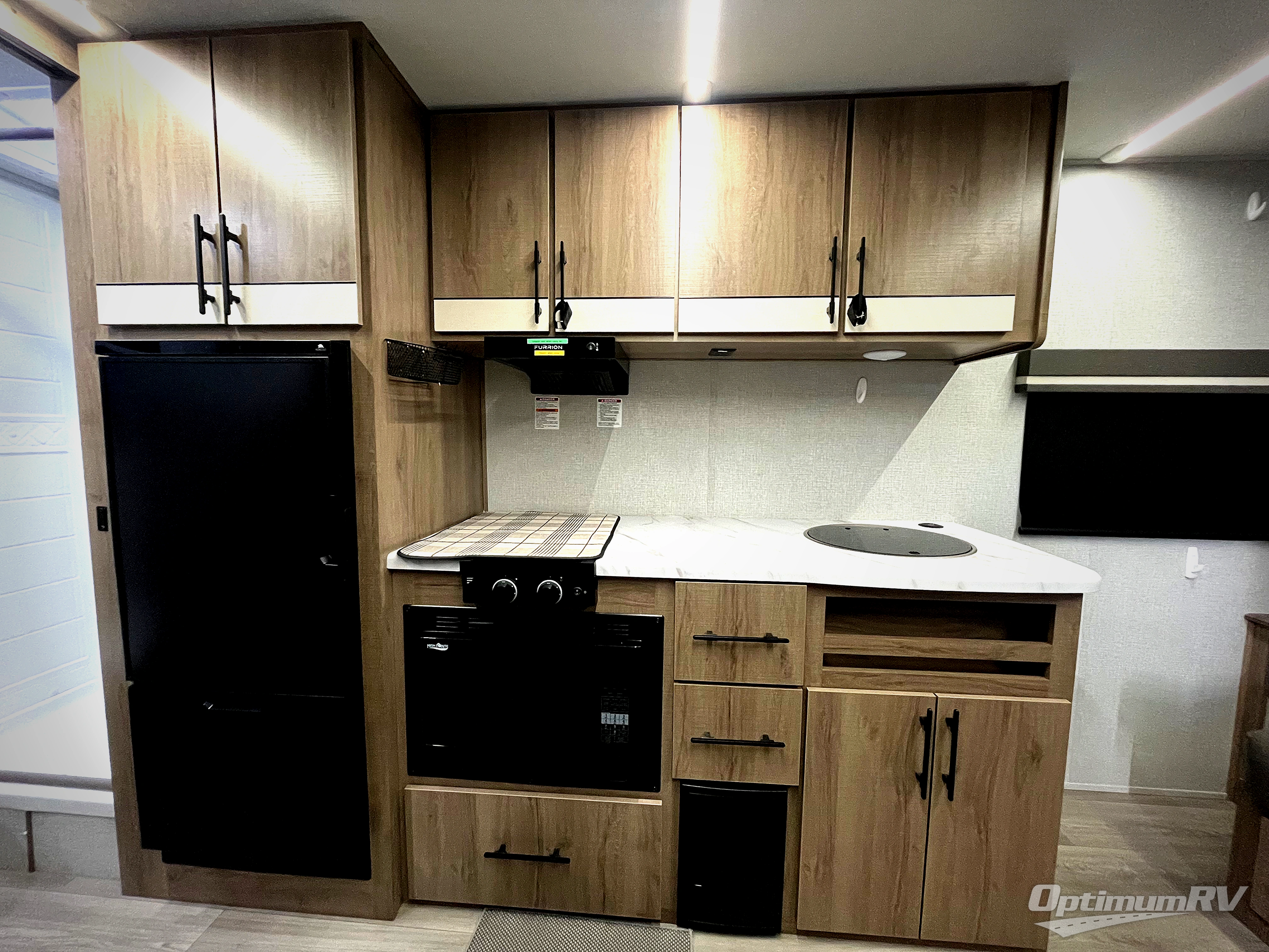 Start looking for your favorite campground to take this travel trailer to! After a fun day at the beach, you can rinse the sand out of your hair with the walk-in shower with a skylight in the full rear bathroom. Depending on what time you enter the unit will determine whether you see the Murphy bed or sofa with drawers underneath and wardrobes on either side of it. The booth dinette is not only great for enjoying meals prepared with the two burner cooktop or outside griddle, but also for transforming into an extra sleeping space!