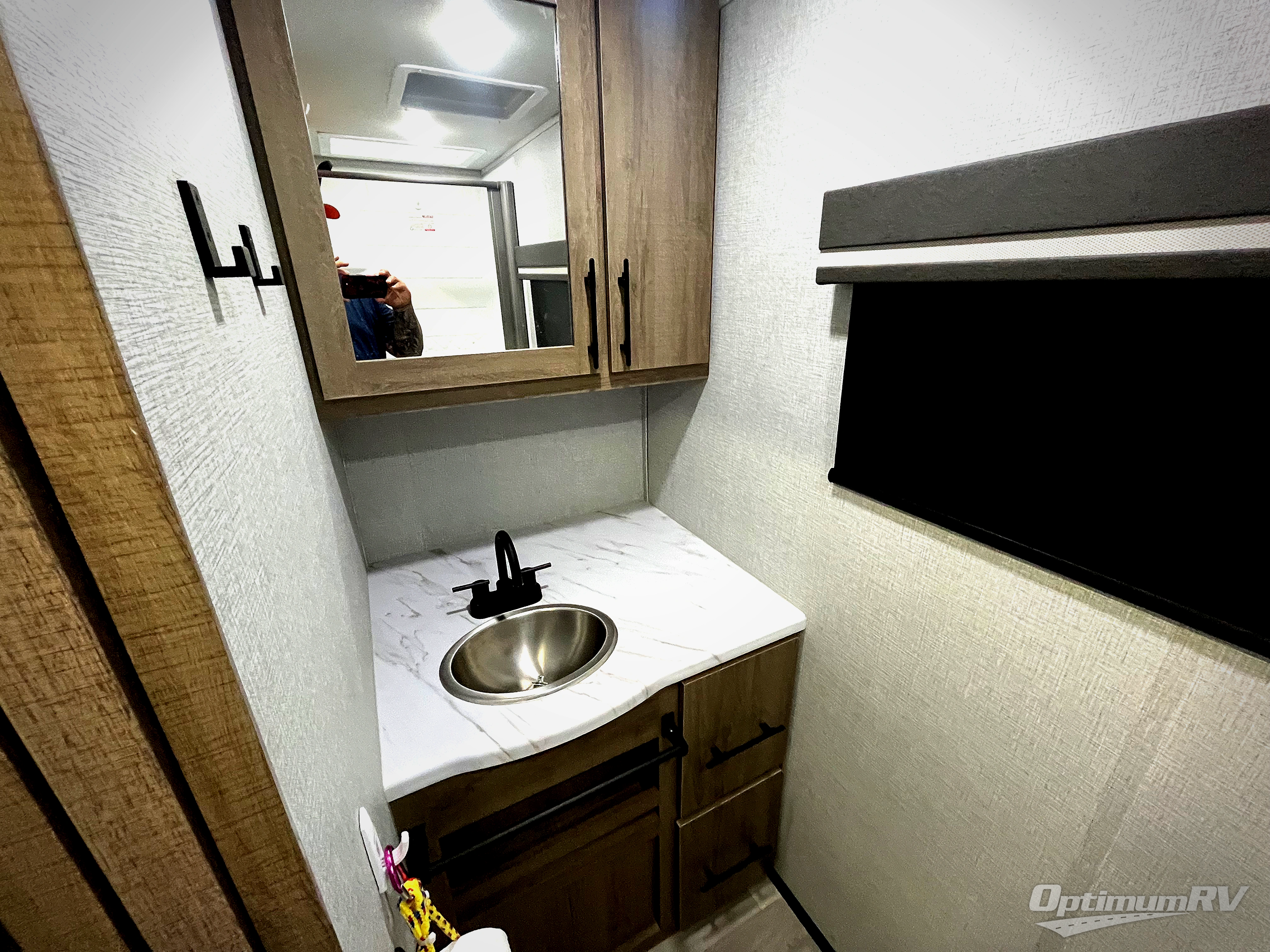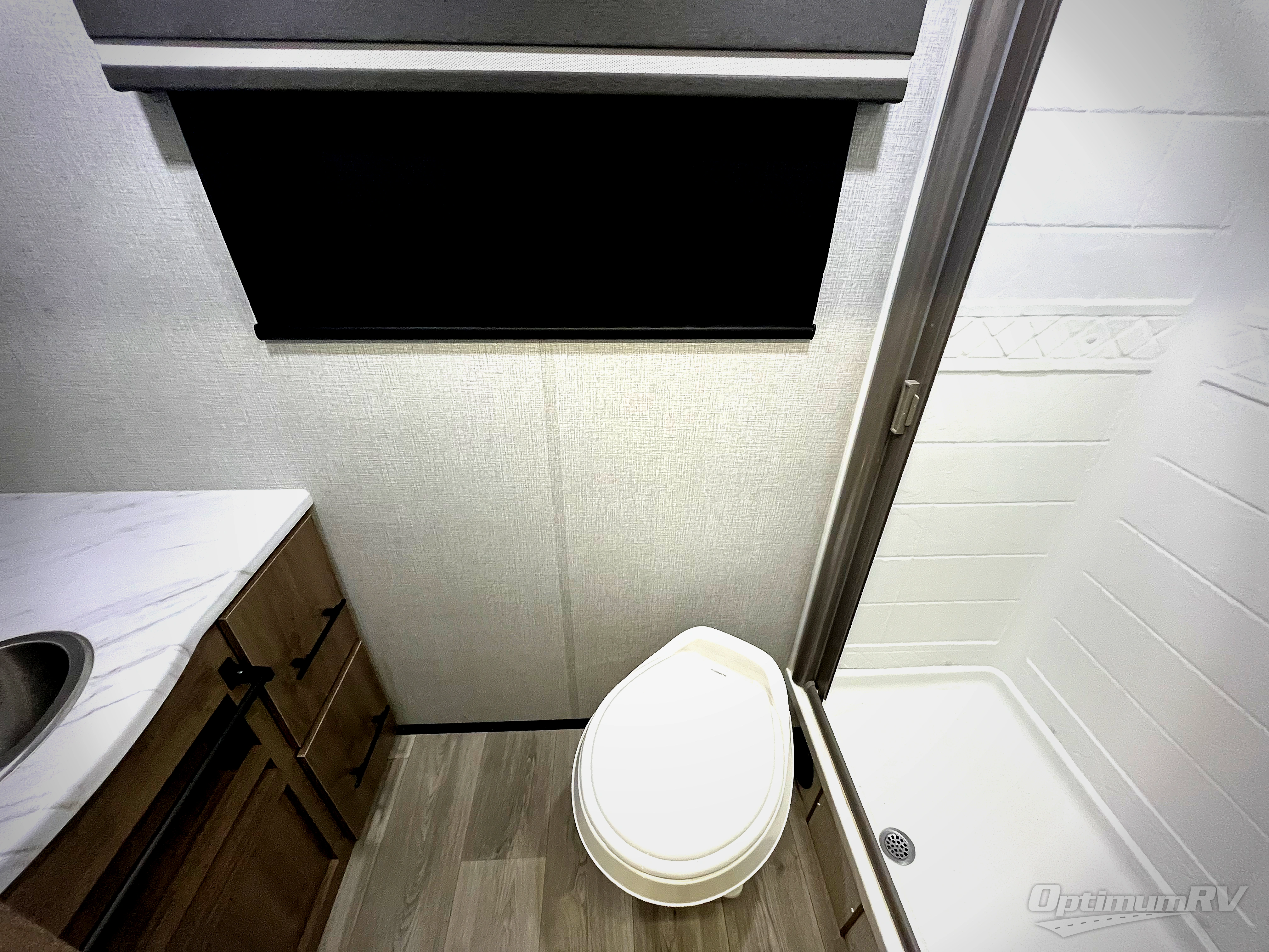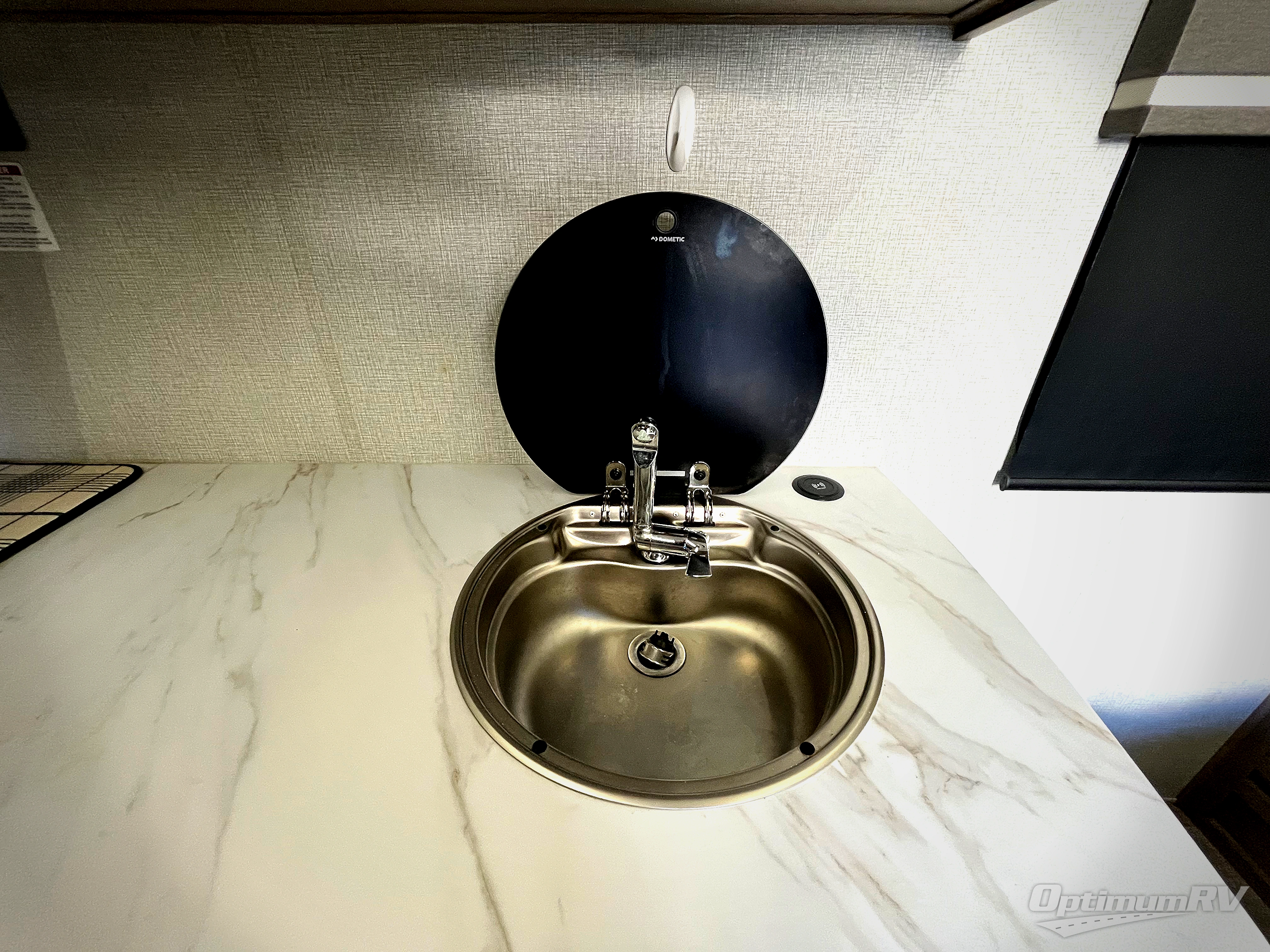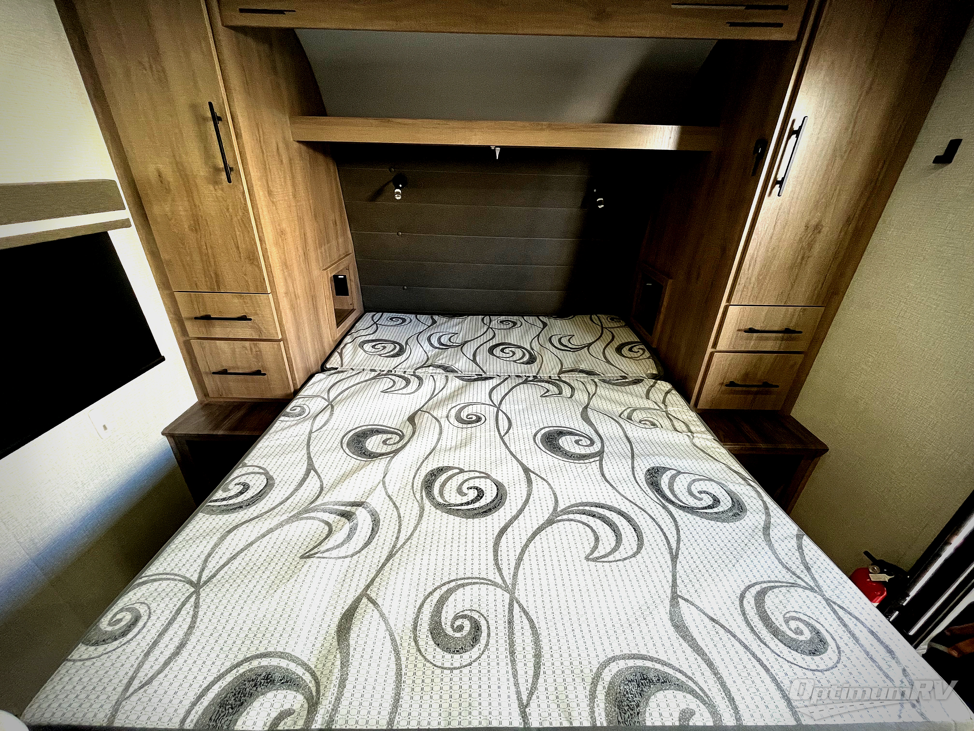 Start looking for your favorite campground to take this travel trailer to! After a fun day at the beach, you can rinse the sand out of your hair with the walk-in shower with a skylight in the full rear bathroom. Depending on what time you enter the unit will determine whether you see the Murphy bed or sofa with drawers underneath and wardrobes on either side of it. The booth dinette is not only great for enjoying meals prepared with the two burner cooktop or outside griddle, but also for transforming into an extra sleeping space!