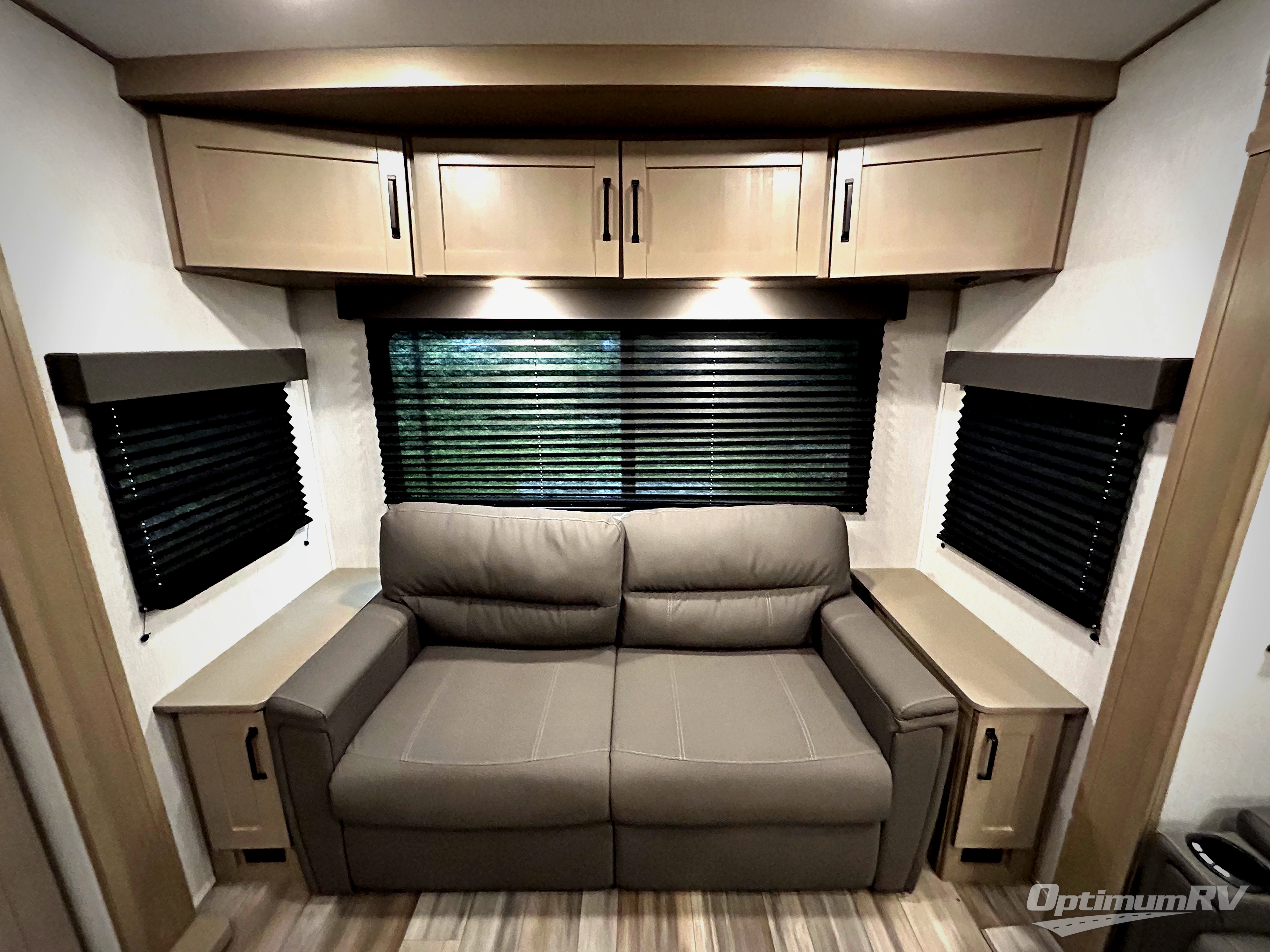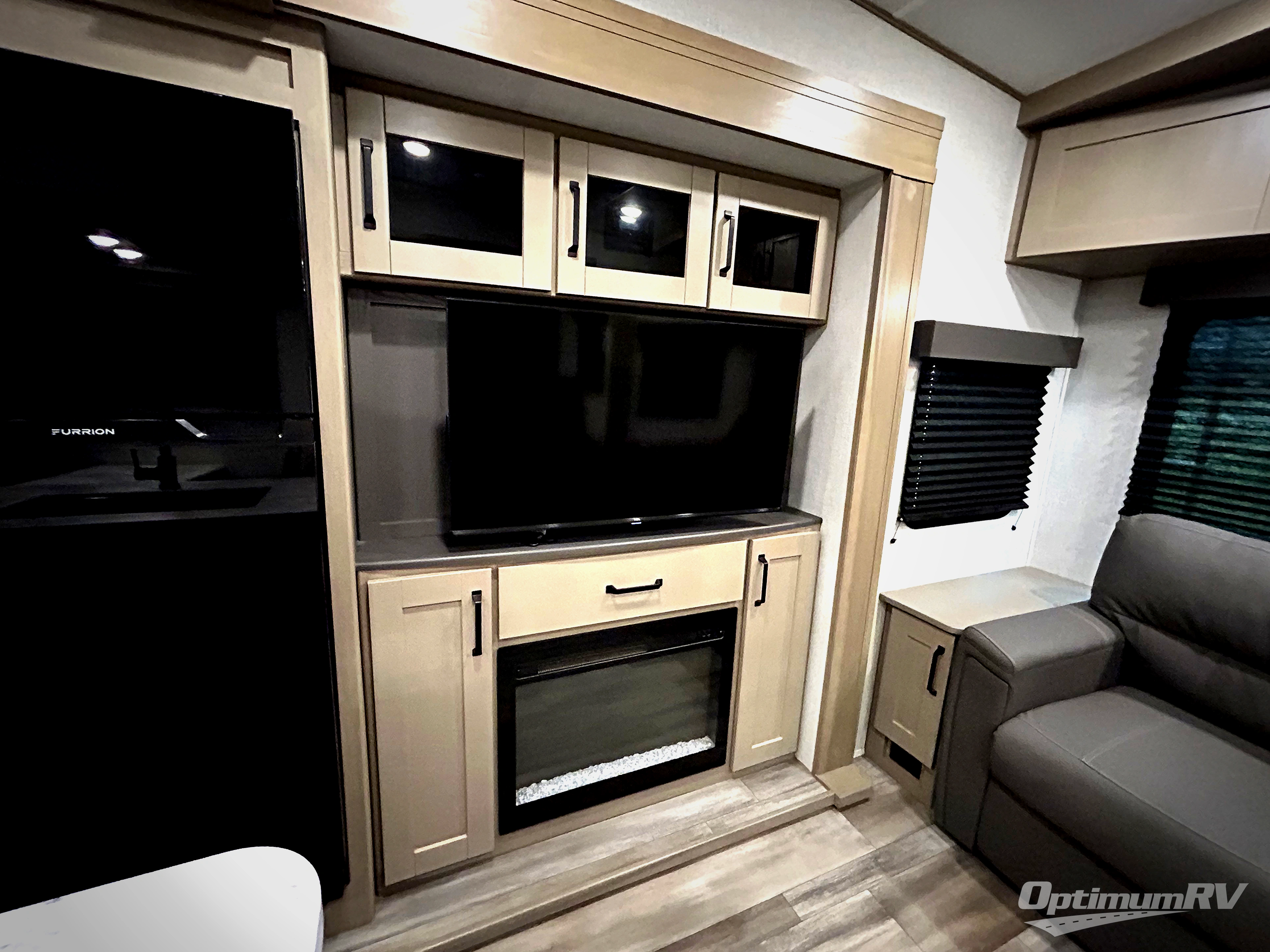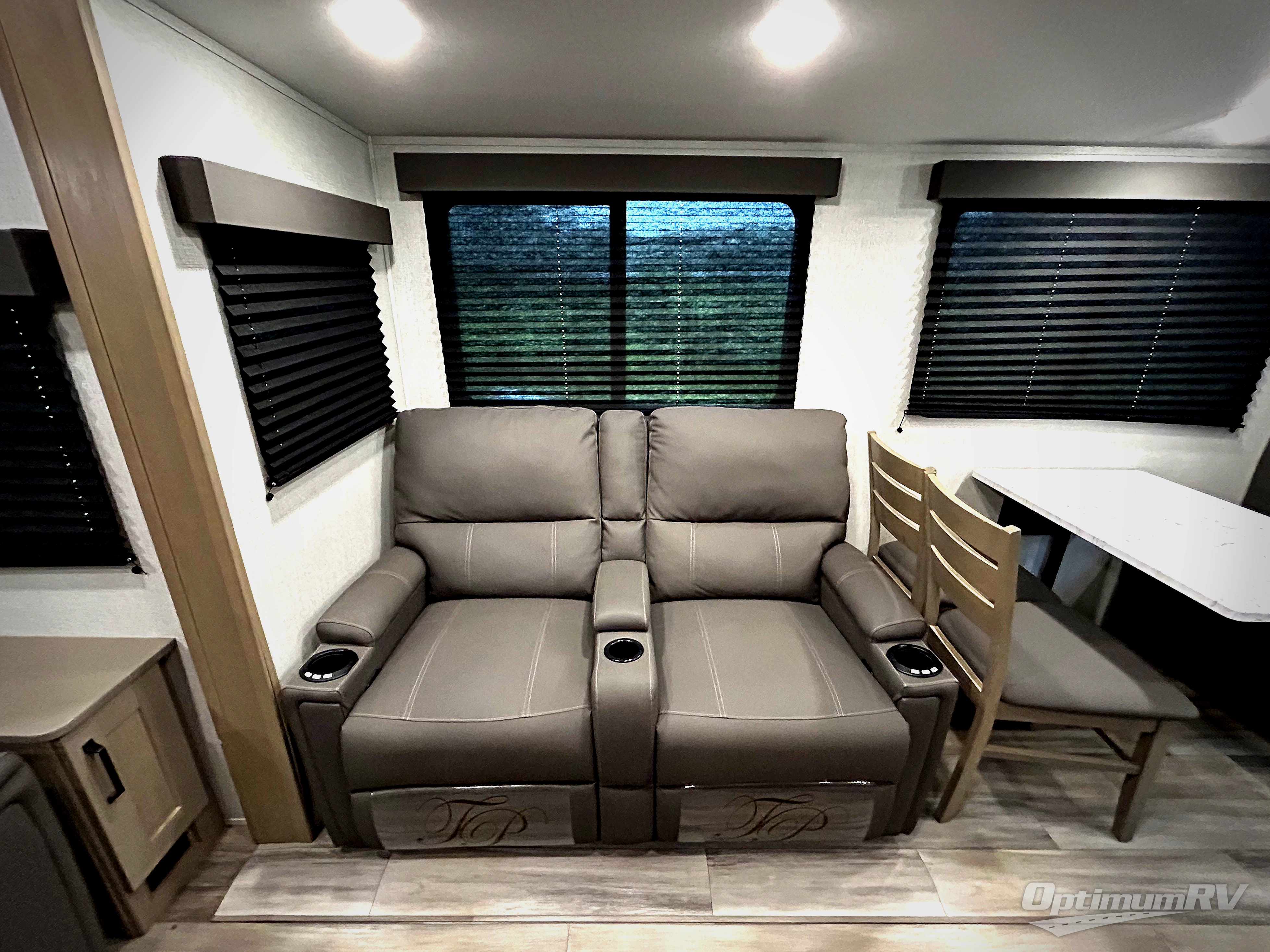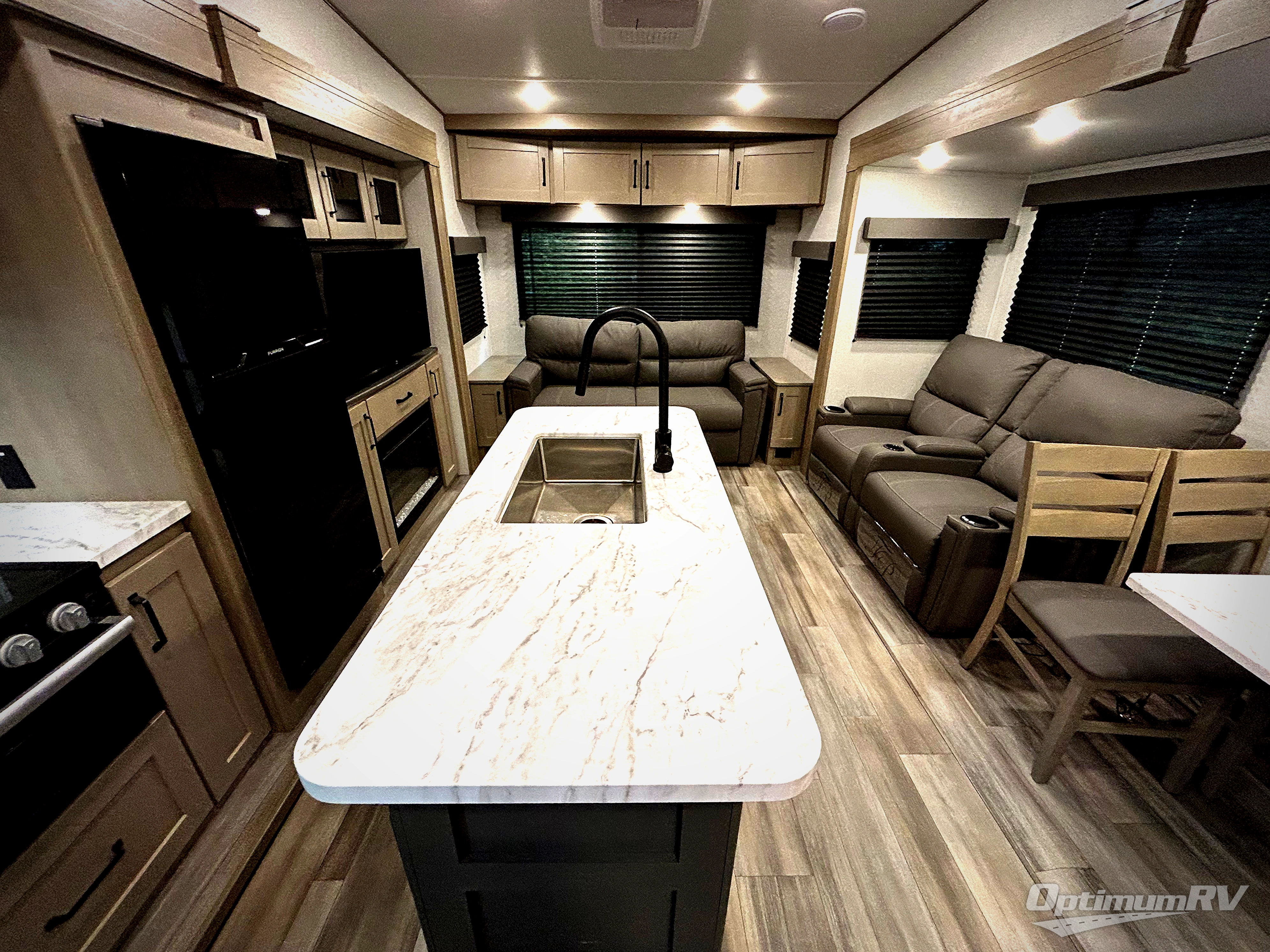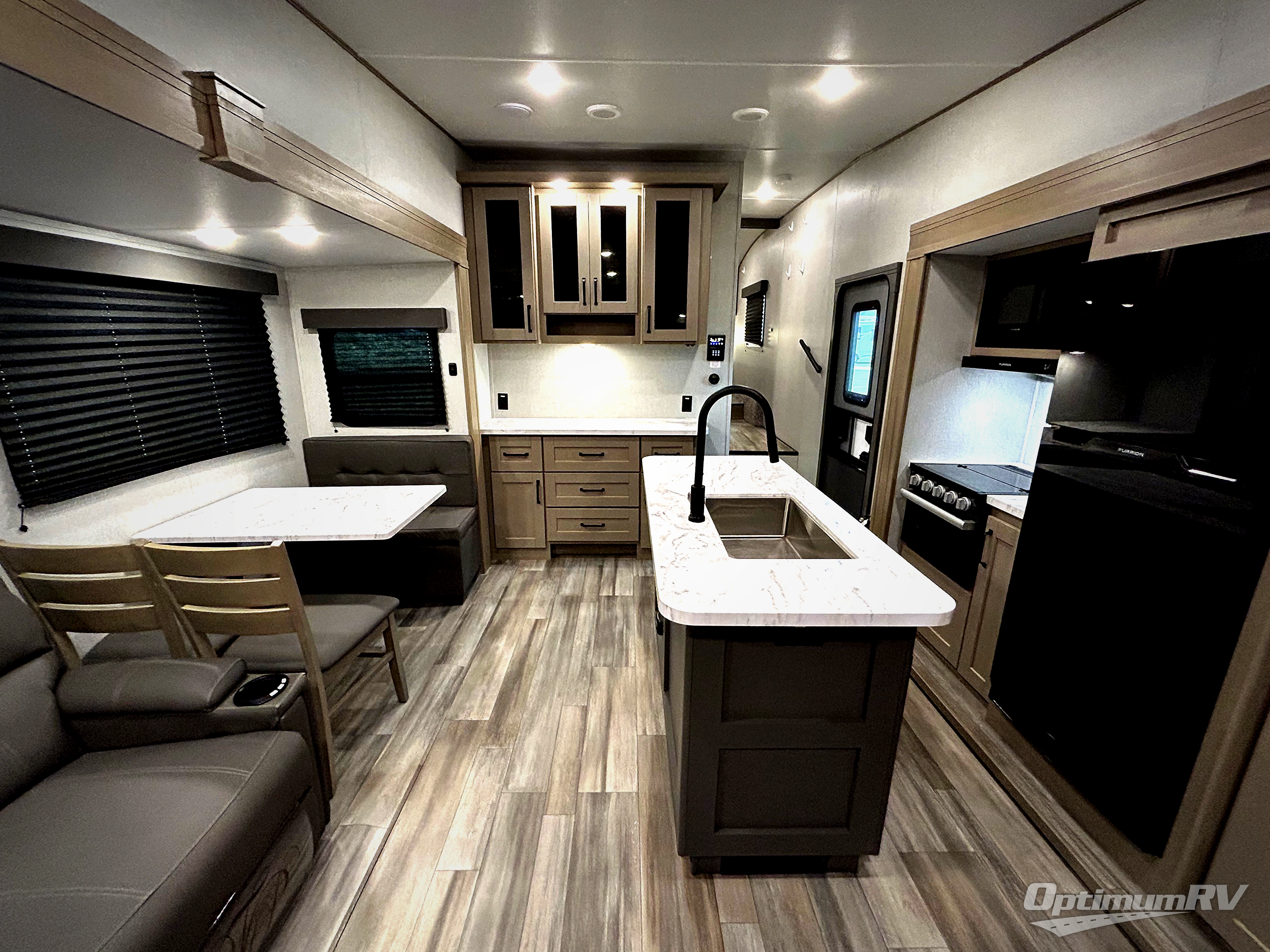 You'll love the amount of space you have in this fifth wheel thanks to the dual opposing slides in the rear living area/kitchen. Your friends and family can relax on the tri-fold sofa or theater seating across from the high-definition 40" LED TV. There is also a booth dinette or you can choose the optional swivel dinette if you prefer that seating. The chef of your group will appreciate having a kitchen island that will provide more counter space, plus there is a hutch with overhead cabinets for nice dishes. A full bath onboard lets you clean up each day and the front private bedroom includes a queen bed just like at home. You'll also love spending time outdoors under the electric awning, and there is an unobstructed pass-thru storage for fishing poles, hiking gear, and camp chairs!