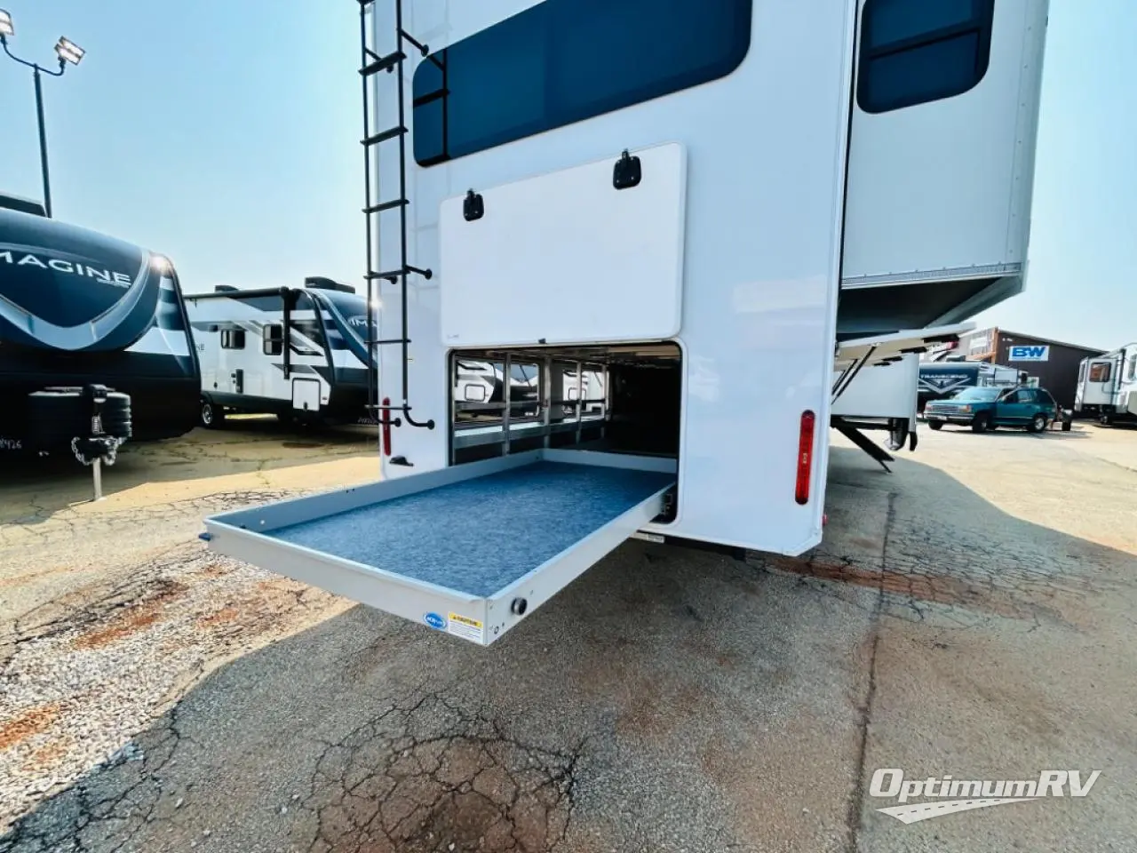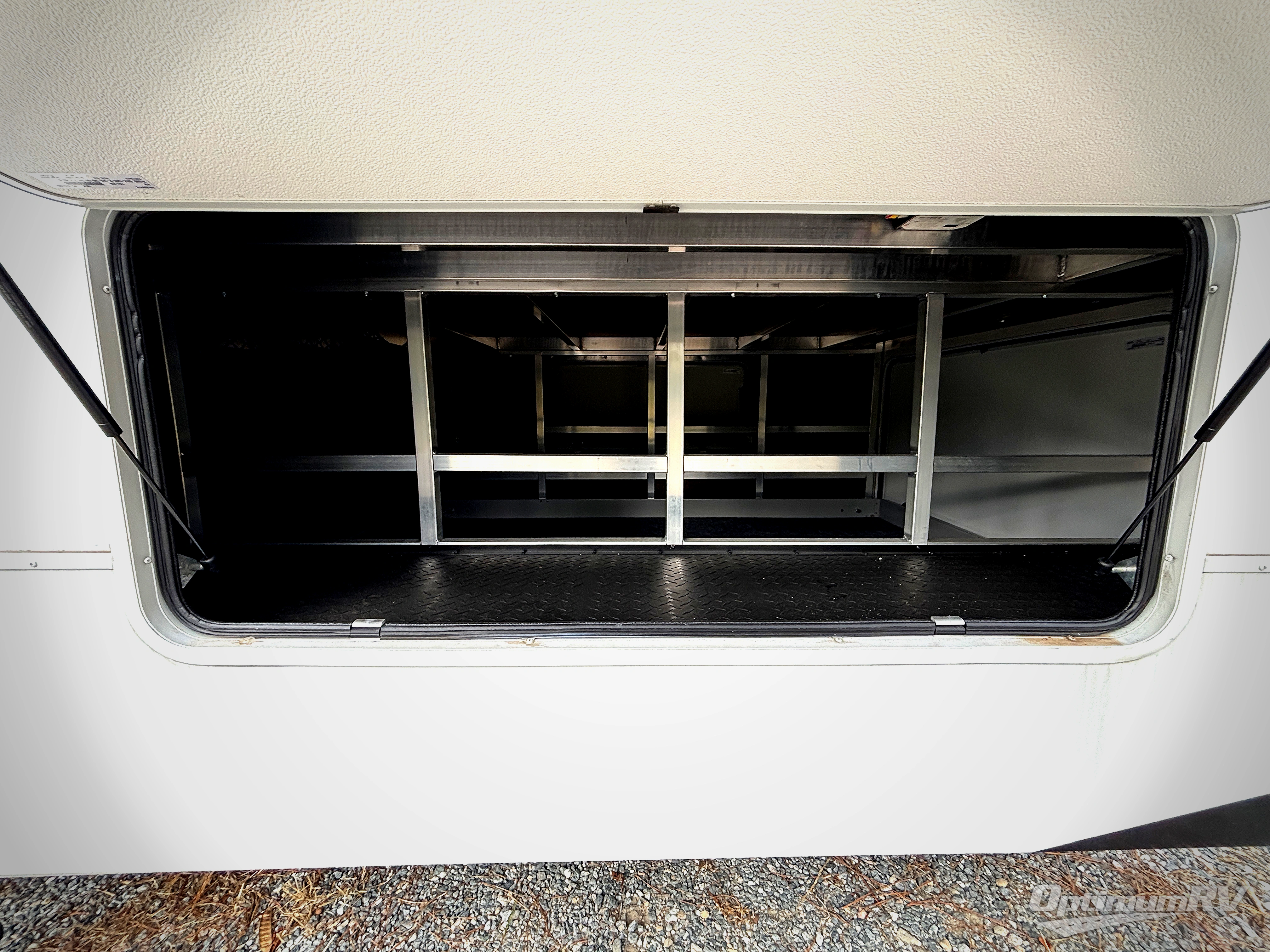 Each minute spent in this spacious fifth wheel will feel just like home! The rear living area includes a rear entertainment center with an LED Smart TV and a fireplace, overhead cabinets, theater seating, plus two tri-fold sofas for your guests to sleep on. You will have the front private bedroom all to yourselves with a queen bed slide out that can be switched out for an optional king bed, and the front closet provides all the space you need to store your belongings. This model includes a spacious full bath with a flip-up teak seat, a shower skylight, plus dual bath sinks for ultimate convenience. The chef of your group will love the middle kitchen with its convenient island including double sinks, a residential cooktop and 24" oven, 20 cu. ft. refrigerator, and free-standing dinette plus a hutch and buffet for storage. Head outdoors to find a 16' power awning with LED lights and middle pass through along with rear storage including a sliding tray, and you might want to add the optional pull-out kitchen.