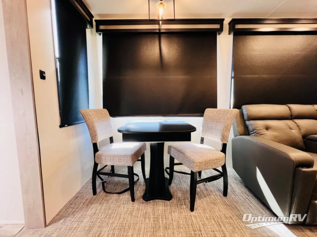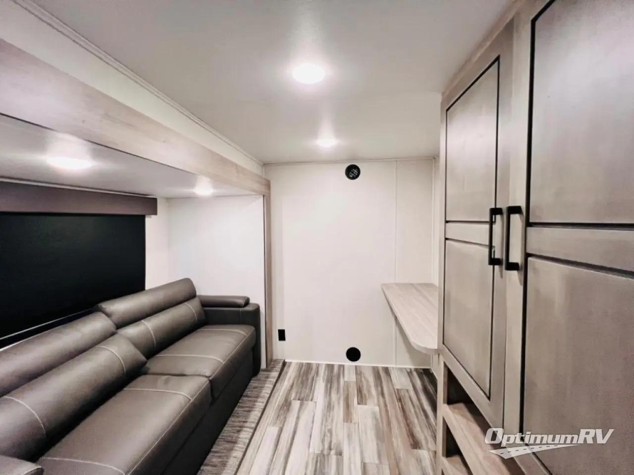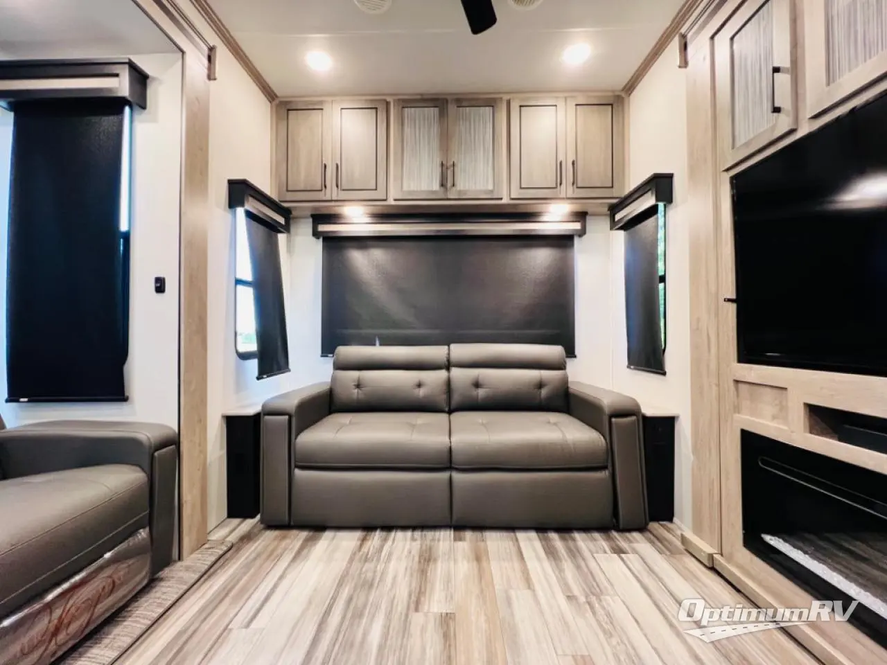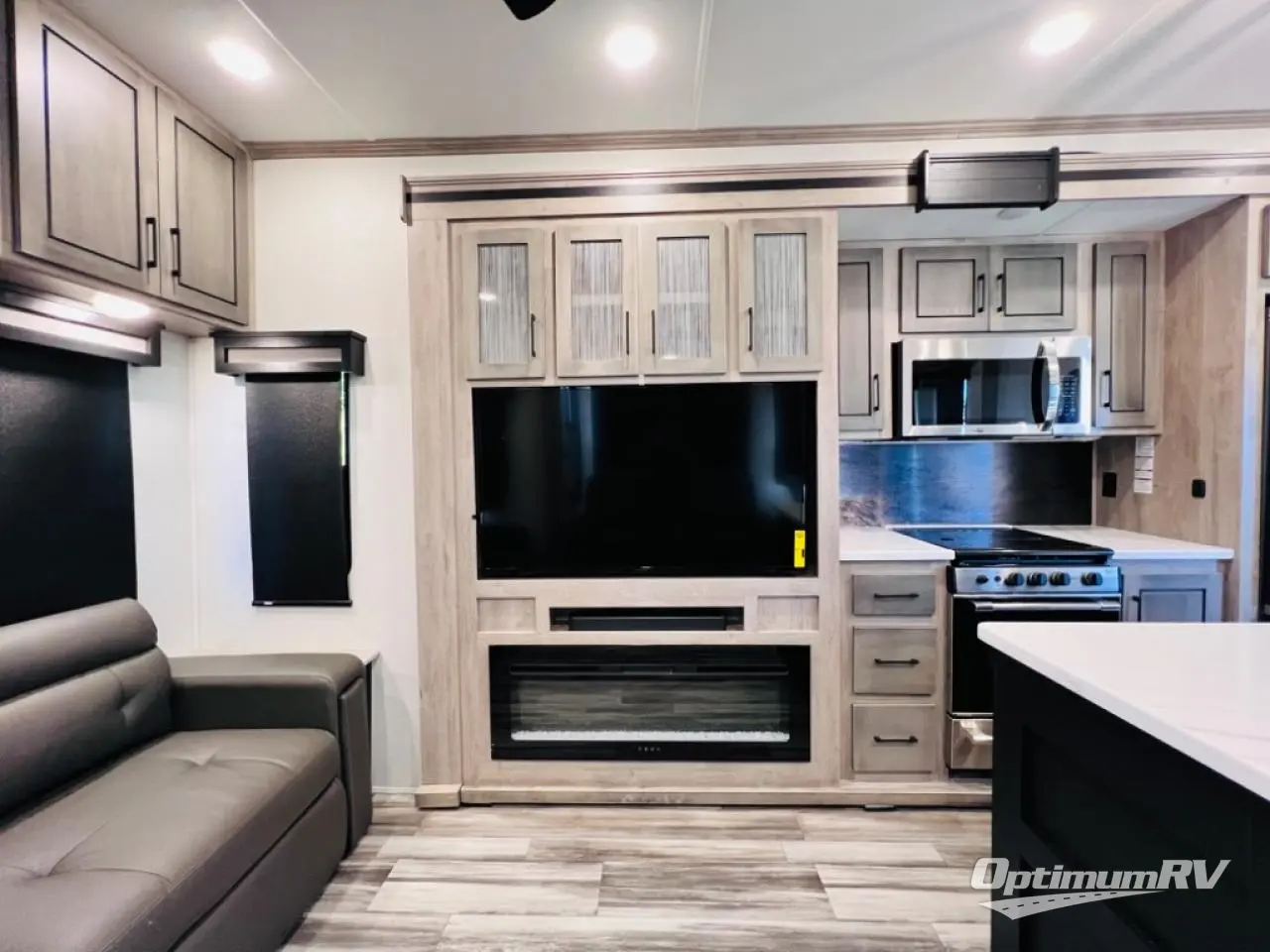 This fifth wheel is big enough for the whole family to join in on the fun at the campground! There is not only a front private bedroom with a king bed slide and a closet prepped to add an optional washer and dryer, but also a second bedroom with a loft above a sofa, a desk, and a wardrobe. Meal prepping is made easy with a kitchen island with dishwasher prep, and a four burner cooktop so you can cook more food at one time. There is a floating dinette table with four chairs to enjoy your meals at or play a game of cards, and the dual recliner love seat is directly across from the 55" smart TV and fireplace with hidden storage. And if you have any more guests sleep over, they can crash on the rear tri-fold sofa!
