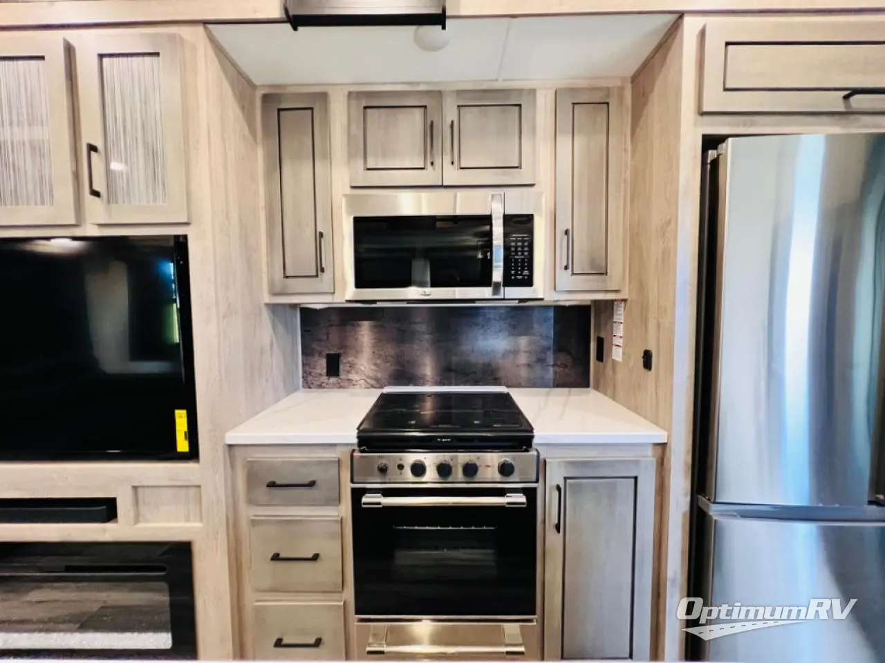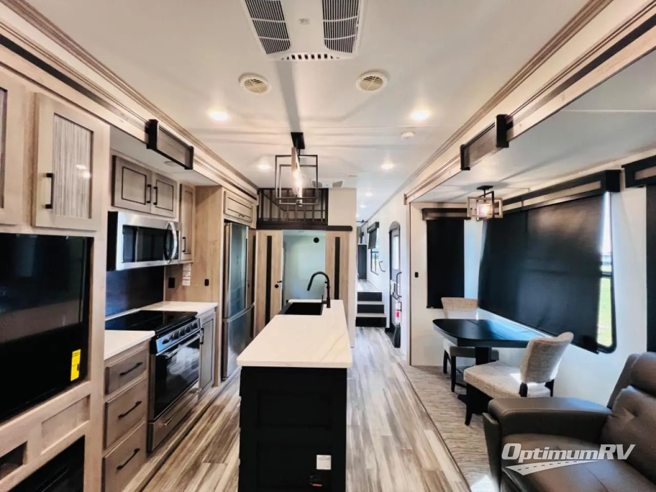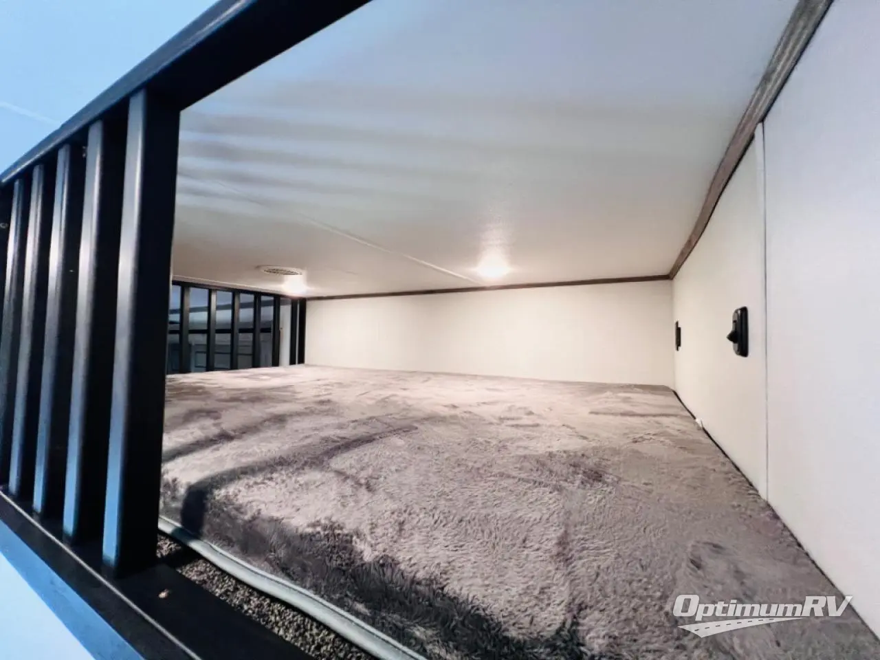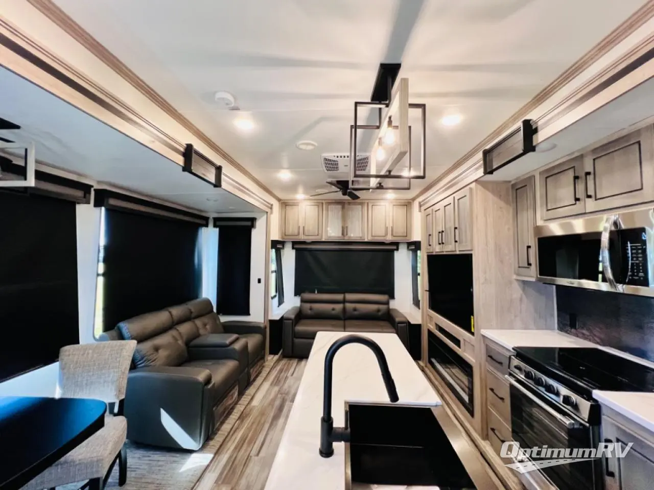 This fifth wheel is big enough for the whole family to join in on the fun at the campground! There is not only a front private bedroom with a king bed slide and a closet prepped to add an optional washer and dryer, but also a second bedroom with a loft above a sofa, a desk, and a wardrobe. Meal prepping is made easy with a kitchen island with dishwasher prep, and a four burner cooktop so you can cook more food at one time. There is a floating dinette table with four chairs to enjoy your meals at or play a game of cards, and the dual recliner love seat is directly across from the 55" smart TV and fireplace with hidden storage. And if you have any more guests sleep over, they can crash on the rear tri-fold sofa!