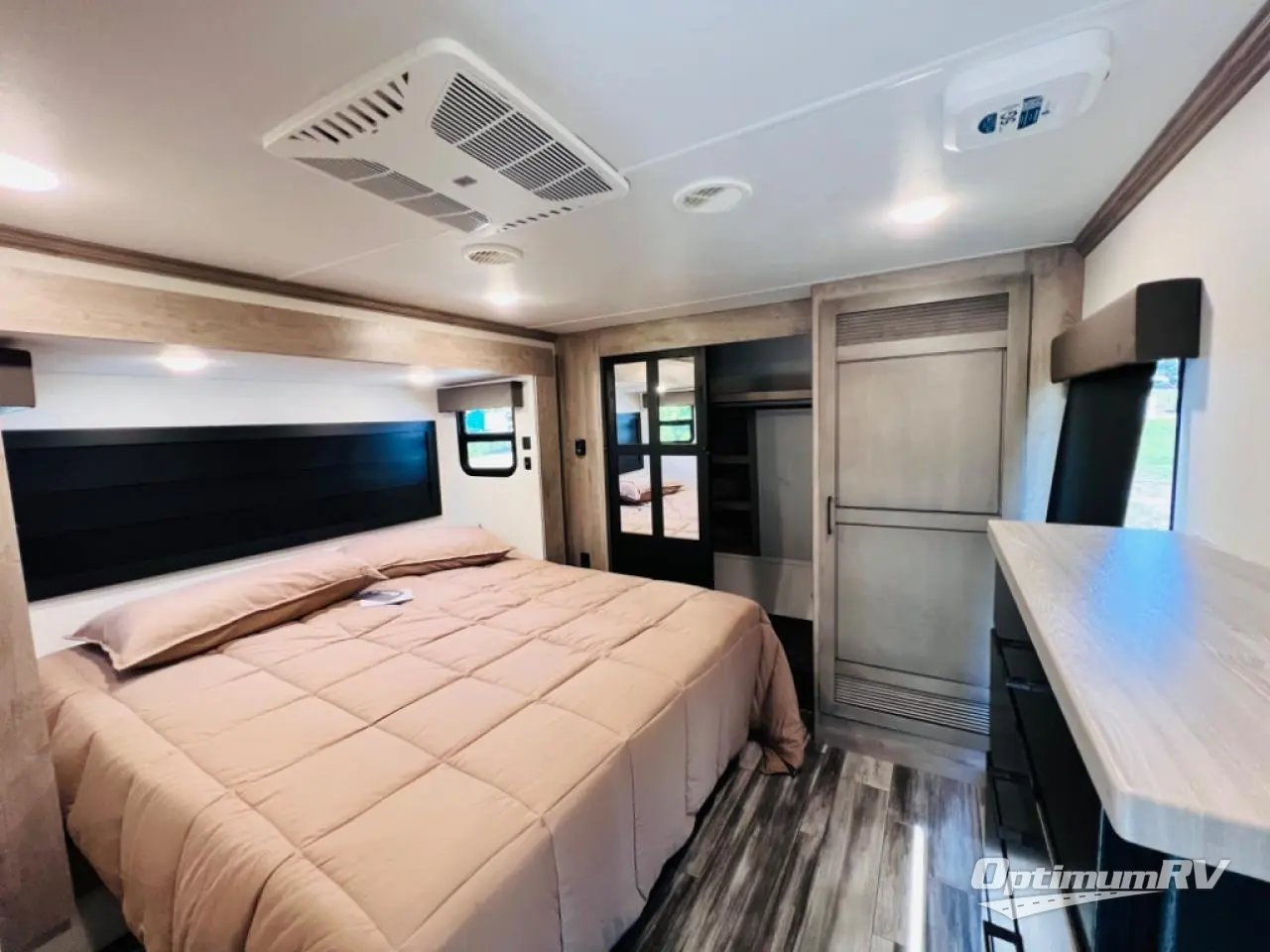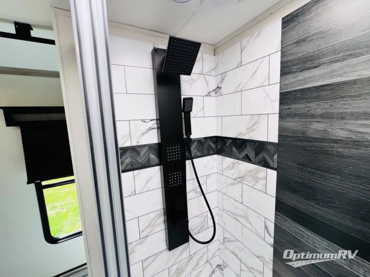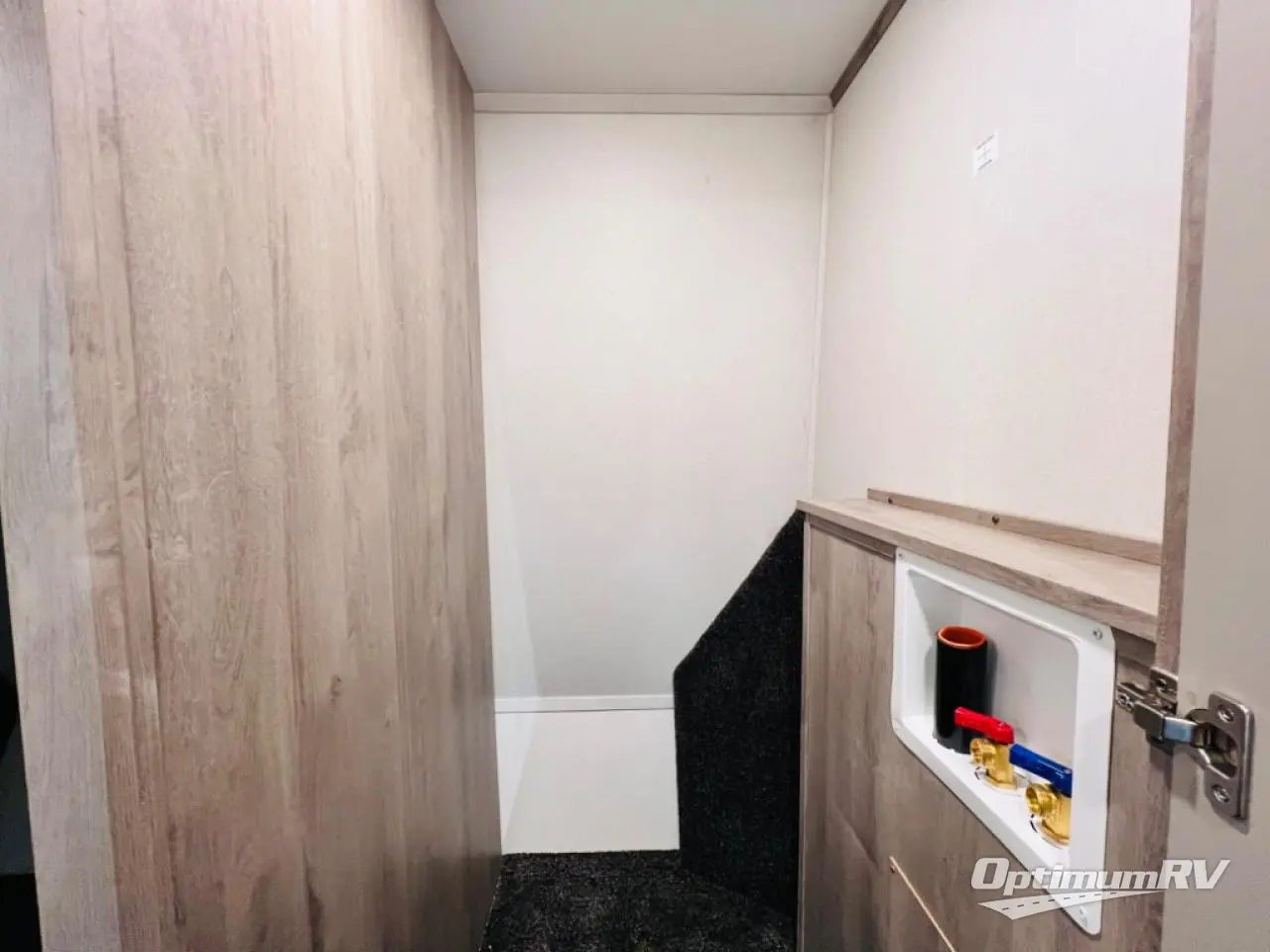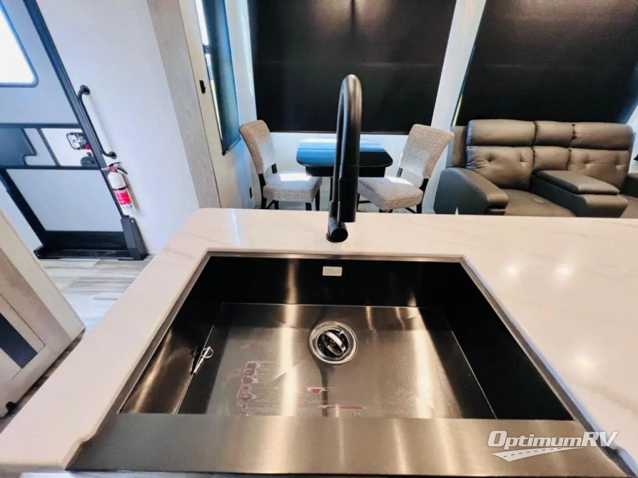 This fifth wheel is big enough for the whole family to join in on the fun at the campground! There is not only a front private bedroom with a king bed slide and a closet prepped to add an optional washer and dryer, but also a second bedroom with a loft above a sofa, a desk, and a wardrobe. Meal prepping is made easy with a kitchen island with dishwasher prep, and a four burner cooktop so you can cook more food at one time. There is a floating dinette table with four chairs to enjoy your meals at or play a game of cards, and the dual recliner love seat is directly across from the 55" smart TV and fireplace with hidden storage. And if you have any more guests sleep over, they can crash on the rear tri-fold sofa!