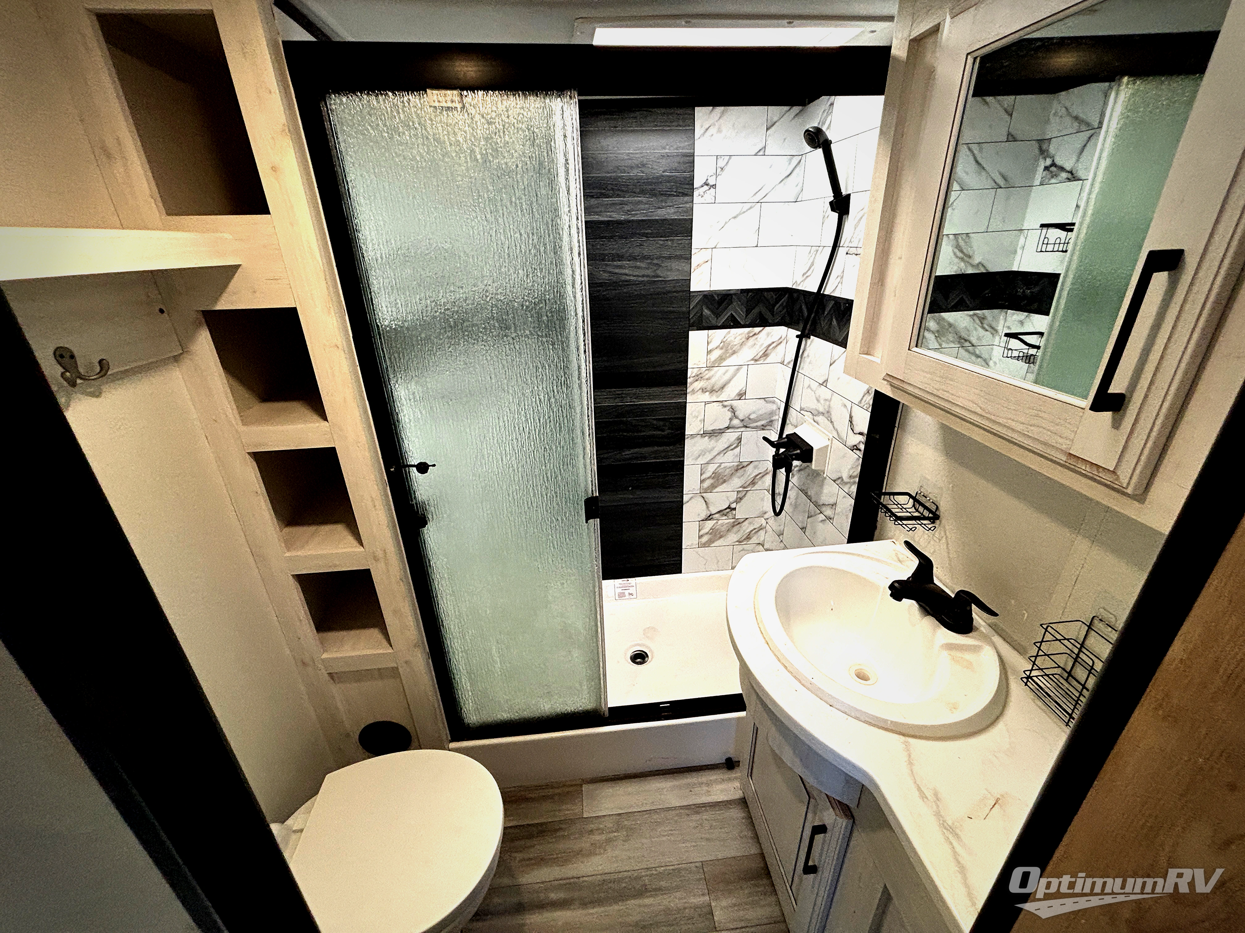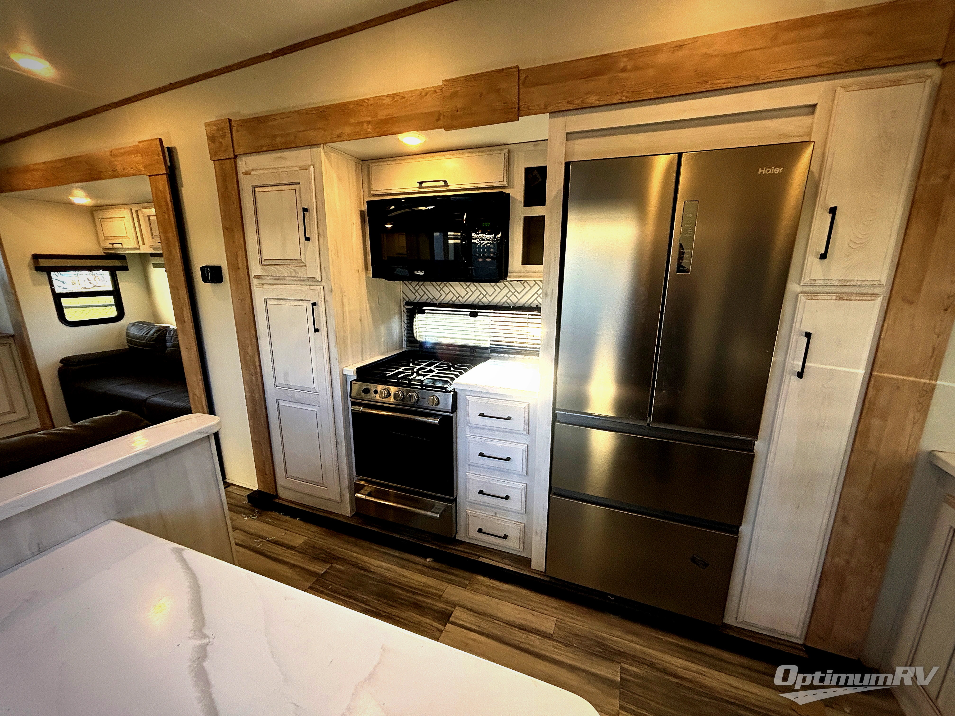 Each Bighorn Traveler fifth wheel by Heartland is constructed with lightweight Azdel laminated sidewalls, a walkable roof, and a heated and enclosed underbelly for an added layer of protection. The MORryde strut-assisted "Step Above" folding aluminum treat entry staircase will provide stability when entering your fifth wheel, and the MORryde CRE3000 rubber suspension will ensure smooth towing, especially on tougher terrain. Your electronics are welcome here with dual wireless charging ports and dual Bluetooth speaker ports in each model, and the "Barefoot Friendly" carpet-free flooring is both kid and pet-friendly. Some of the residential comforts you'll find in the Bighorn Traveler are the real wood drawer construction, the night roller shades, and the in-house milled and finished solid surface countertops throughout!