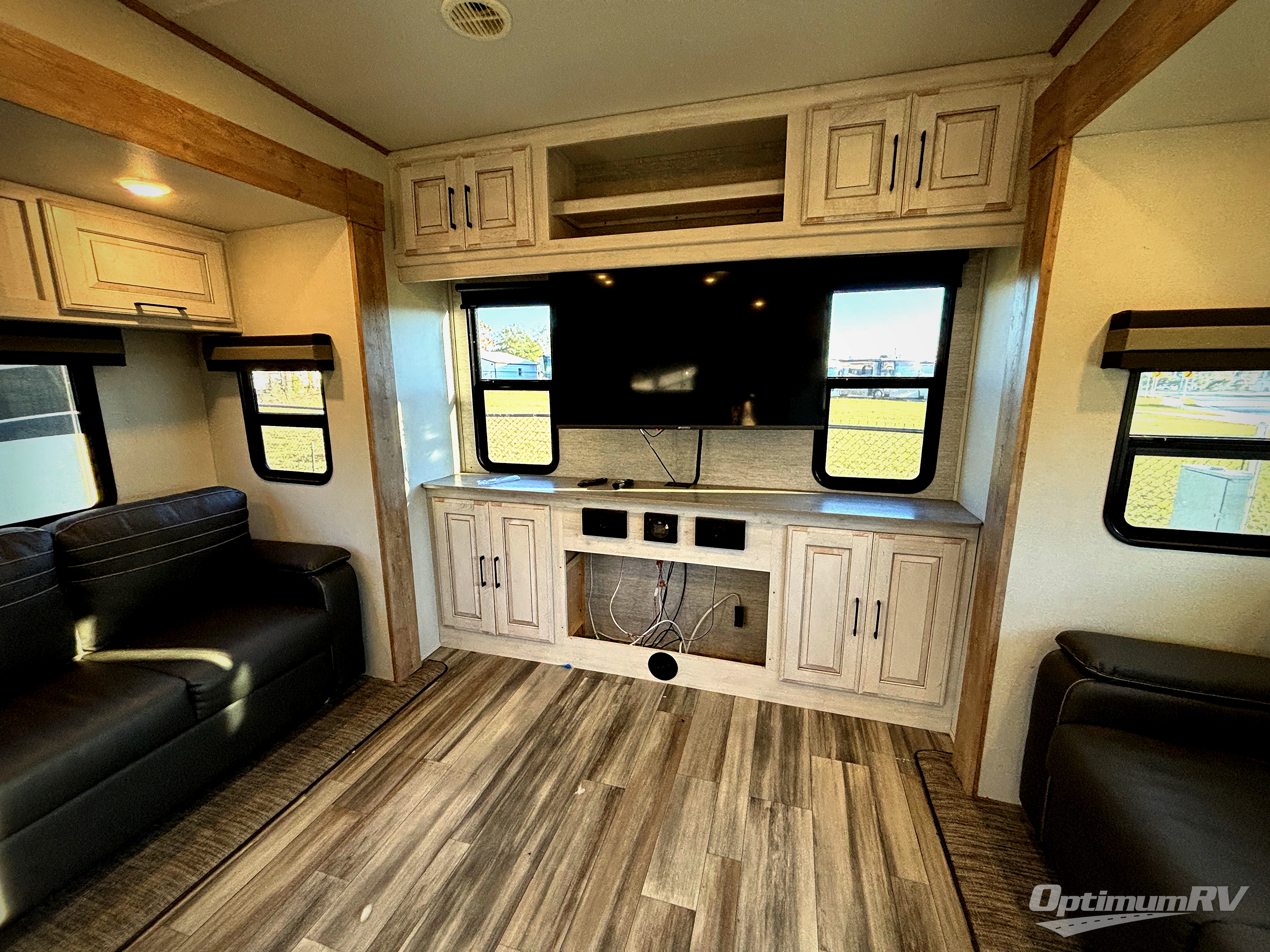Comfort and fun is found in this fifth wheel with four slides and sleeping space for six! Once you arrive at the campground, set up the 18' power awning, then make lunch on the two burner cooktop. Head inside to find a dinette with bench seating on one side and chairs on the other, plus a 16.2 cu. ft. 12V refrigerator for tons of food storage space. Your crew can visit in the rear living area in front of the entertainment center with a fireplace, plus there are two sofas and theater seats. The full bath includes a spacious shower, a 6' 4" bath ceiling height, plus a domed shower skylight for more standing space. And don't overlook the front private bedroom with a king bed slide out, a large front closet, plus washer and dryer prep, allowing you to go full-time if you choose!