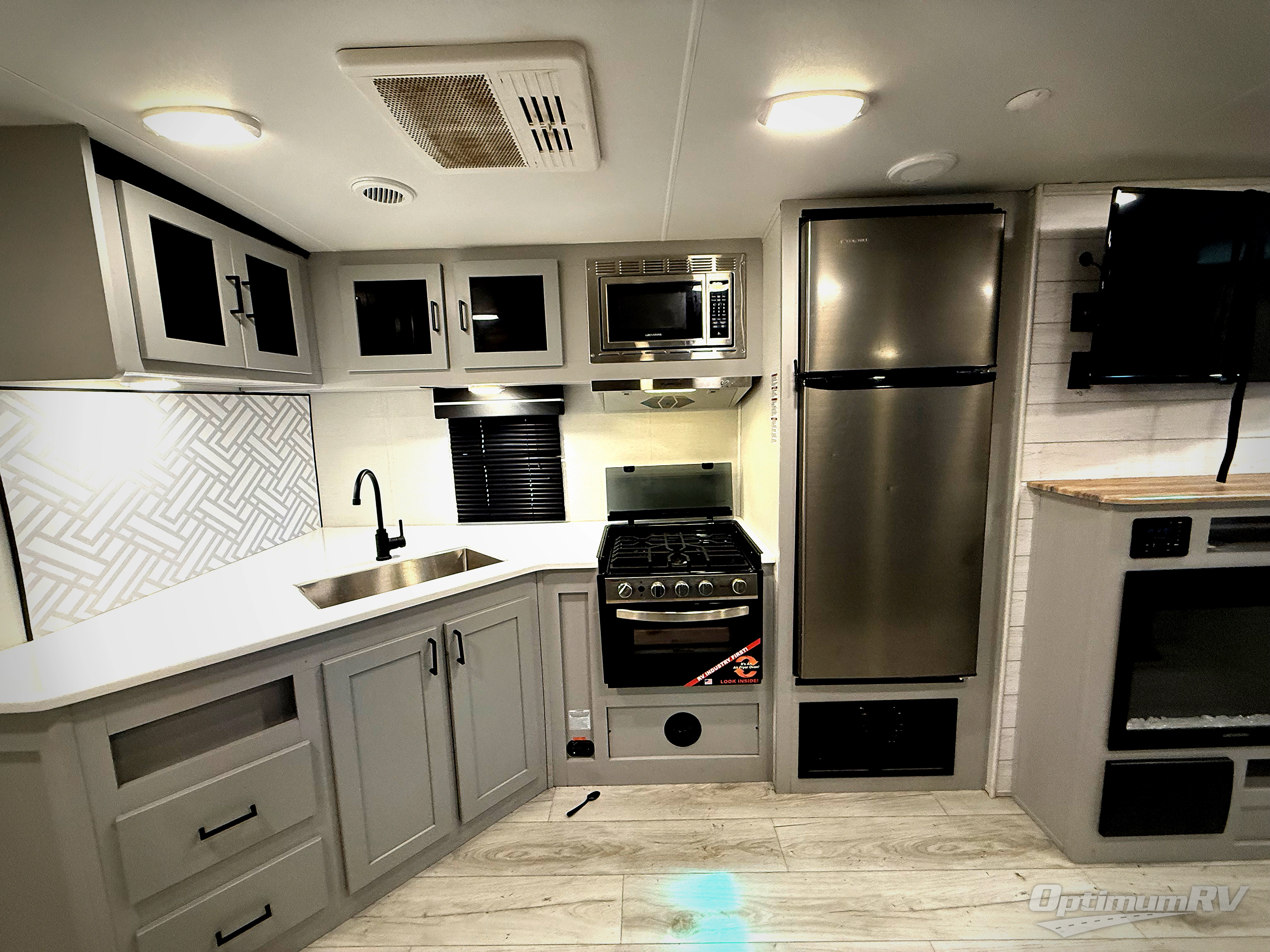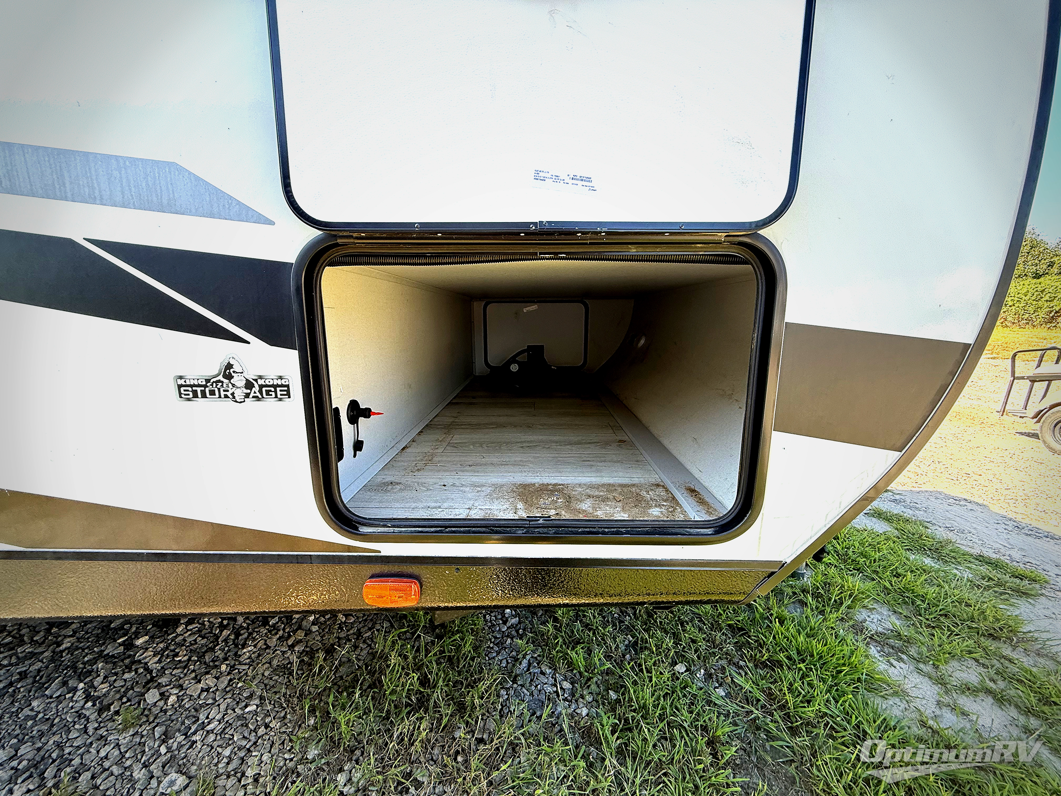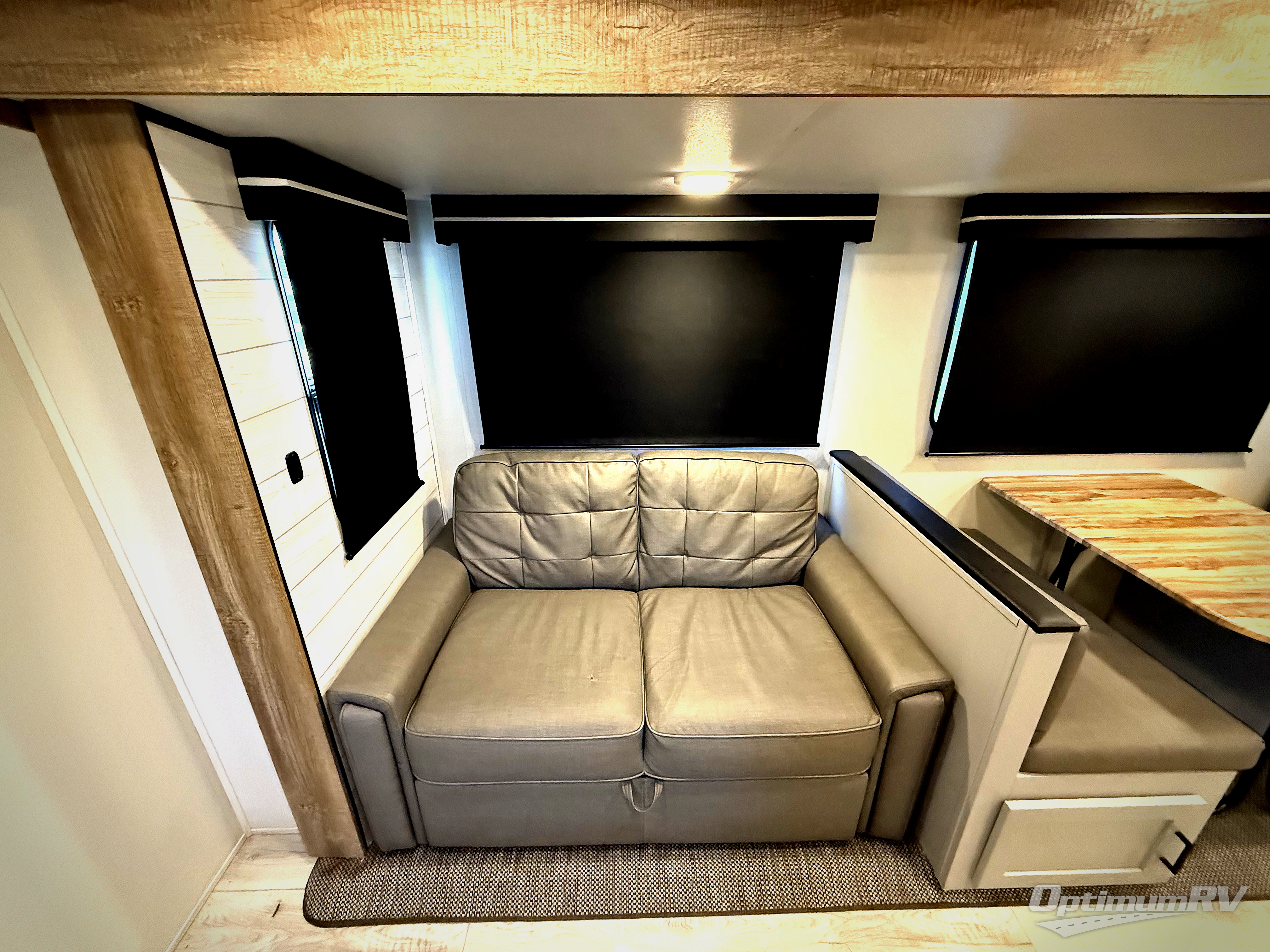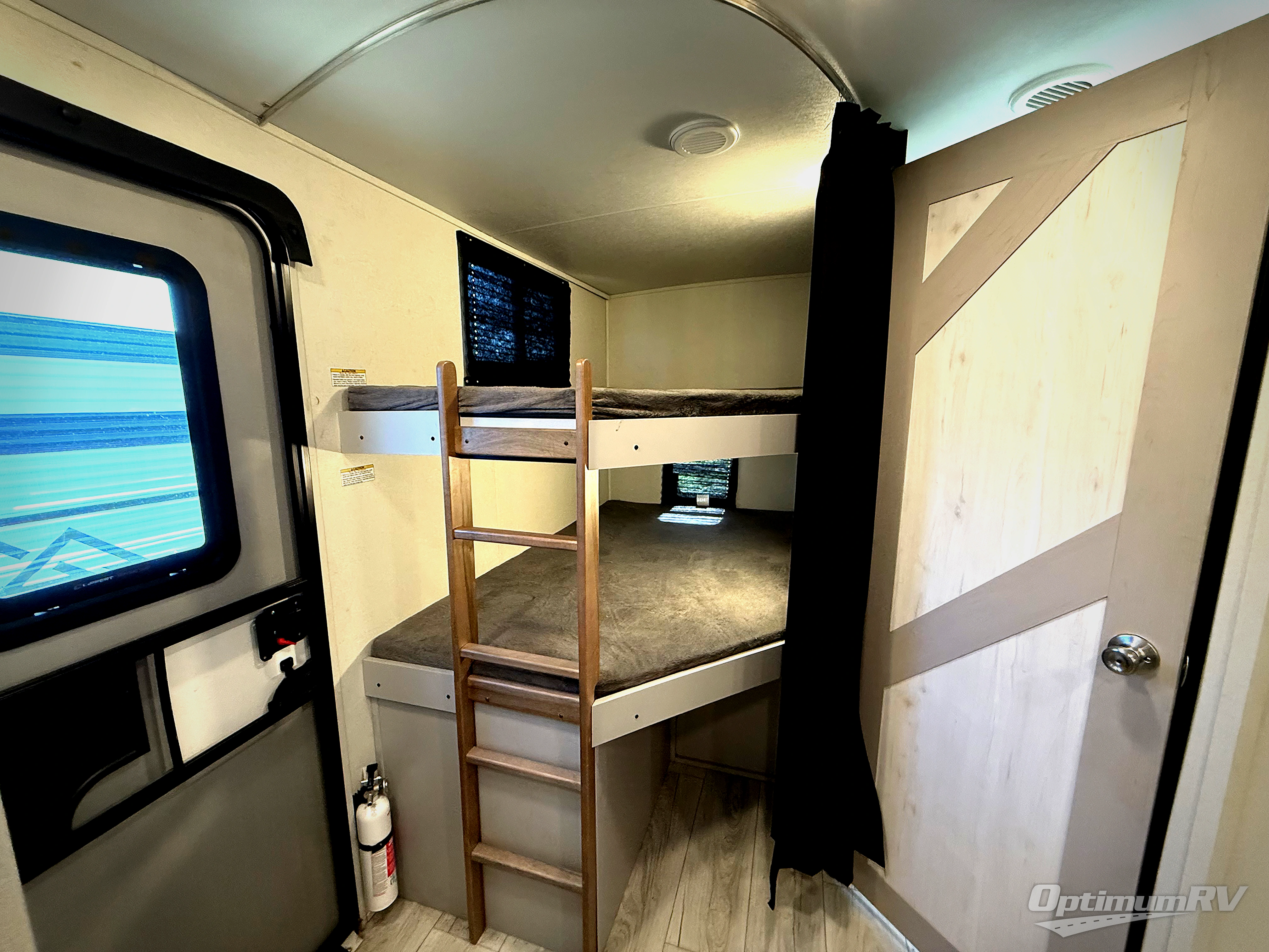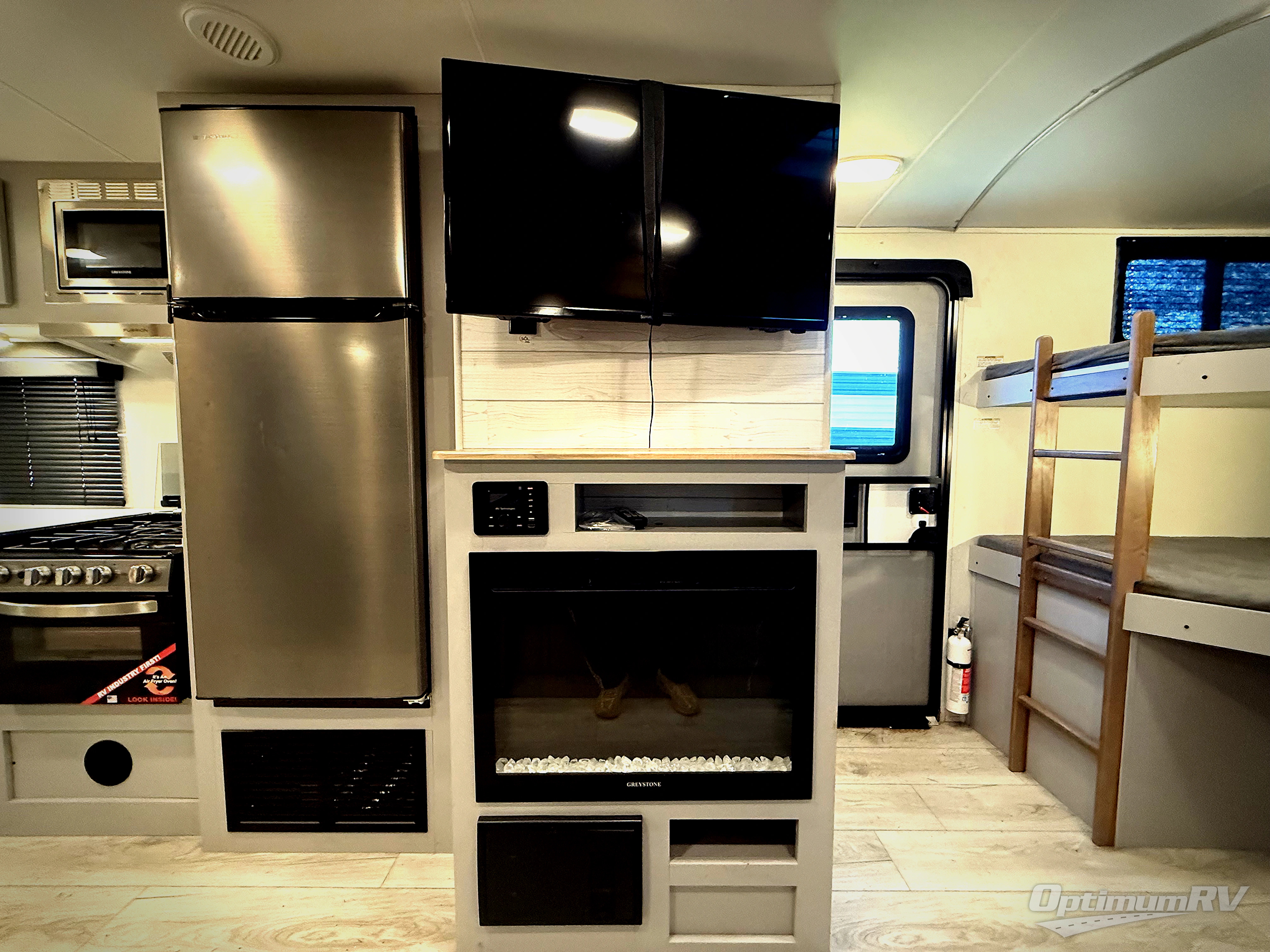 If you've been searching for a family-friendly travel trailer, your search is over with this model that can sleep eight to nine people each night. The double-size bunks are right beside the full bath for convenience, and the convertible sleeper sofa with a stowaway table are within the slide out, which will provide more floor space. Store your paper goods and snacks in the hidden pantry behind the entertainment center, and your valuables can go in the overhead compartments. This model features an exterior kitchen and a 19' power awning with LED lights for tons of outdoor fun!