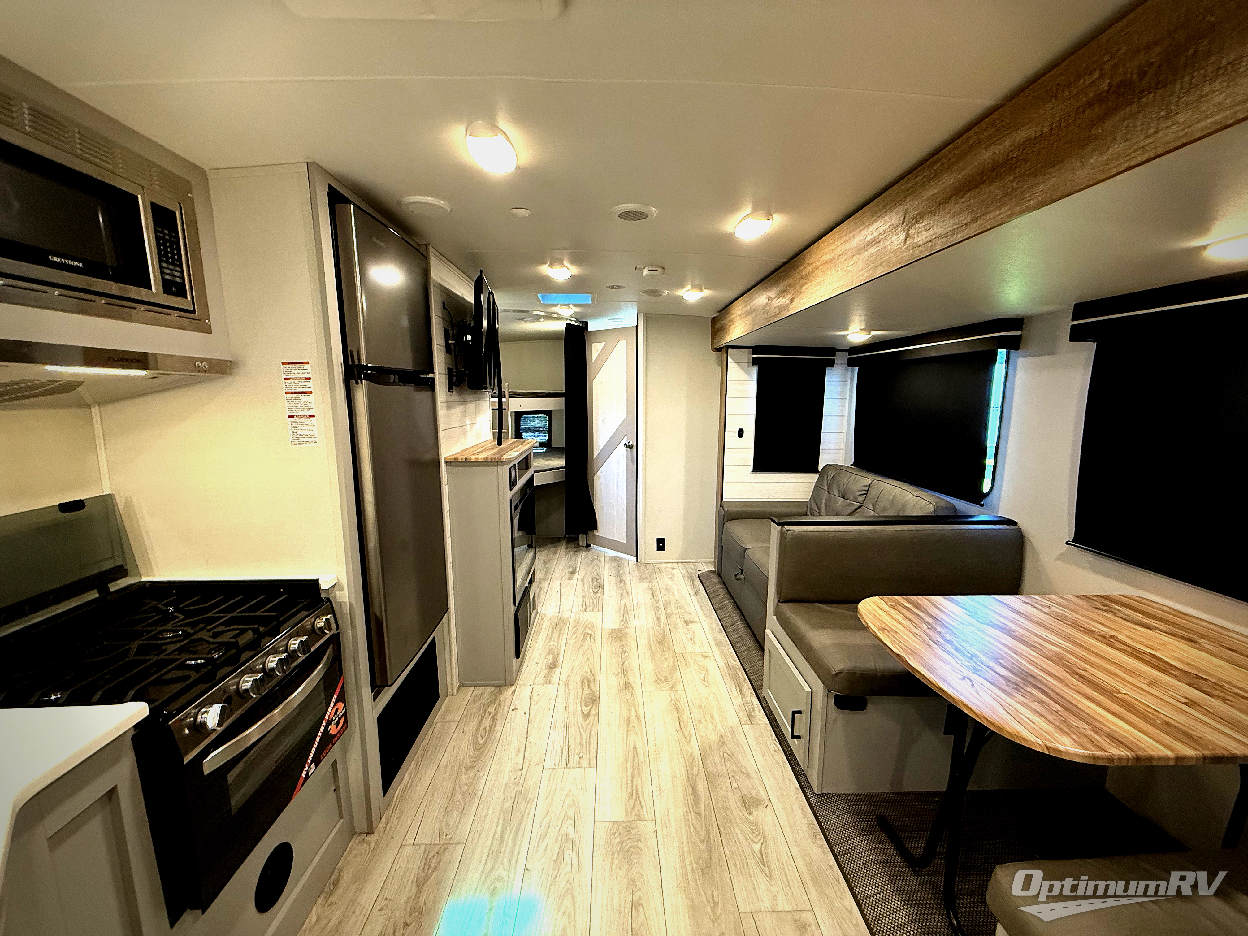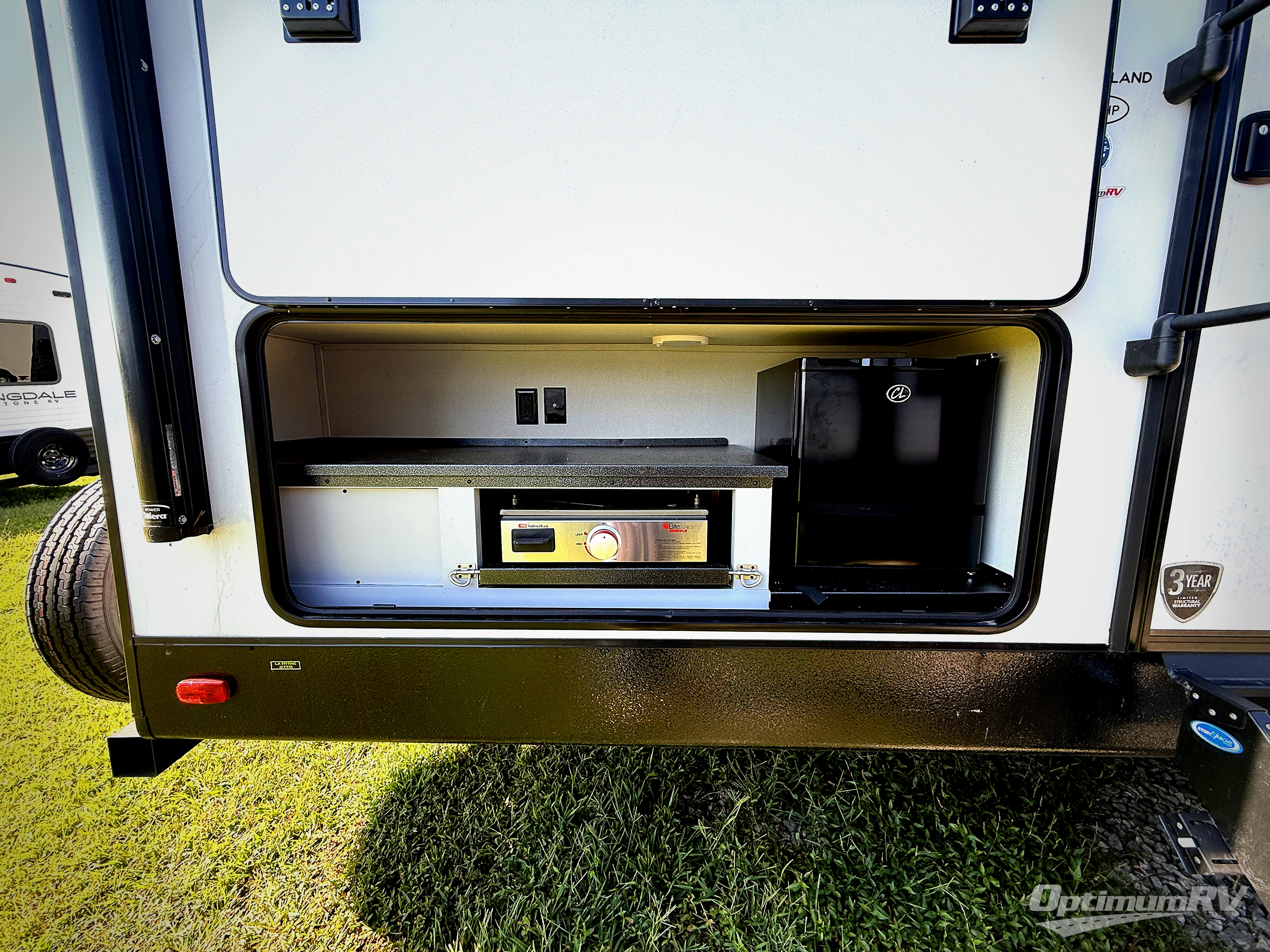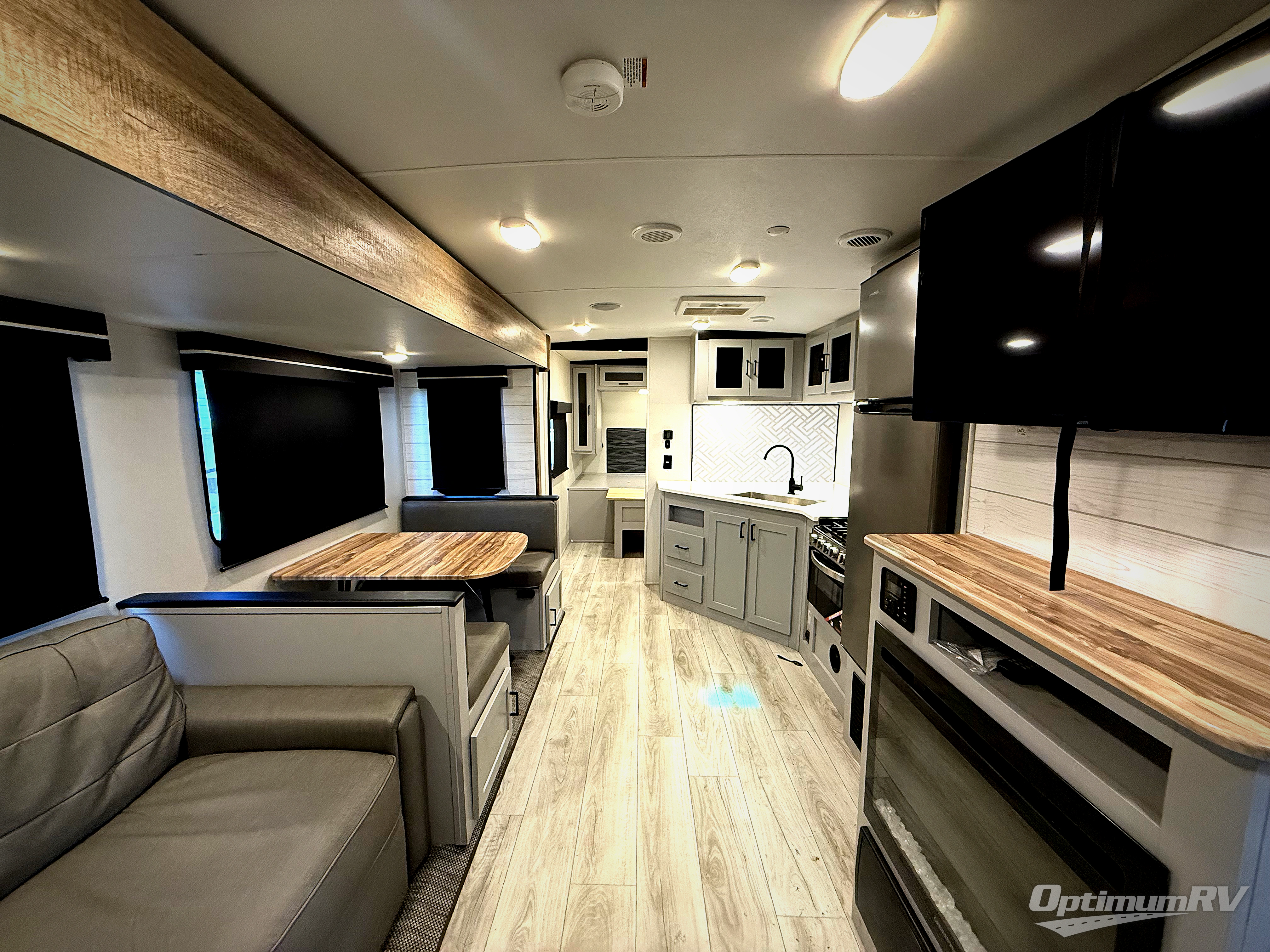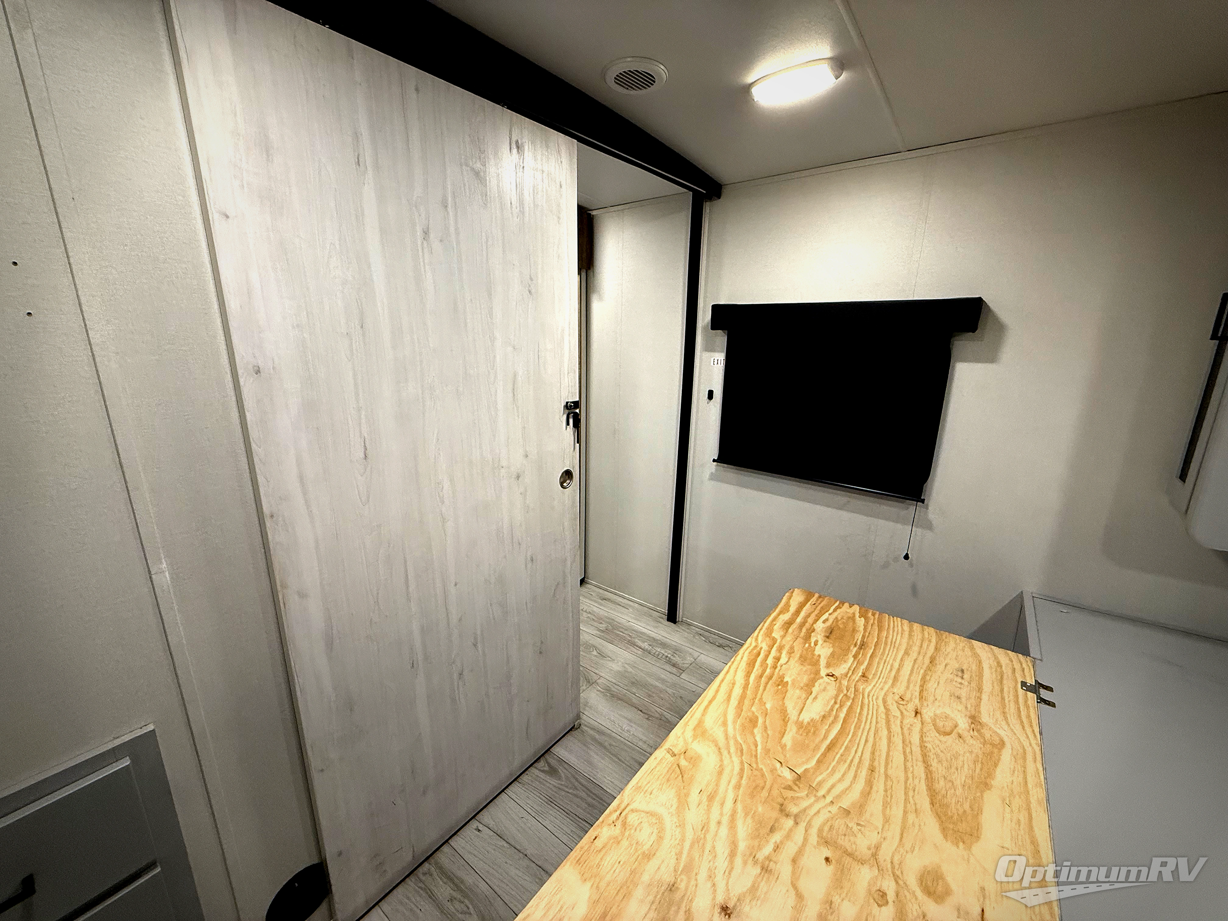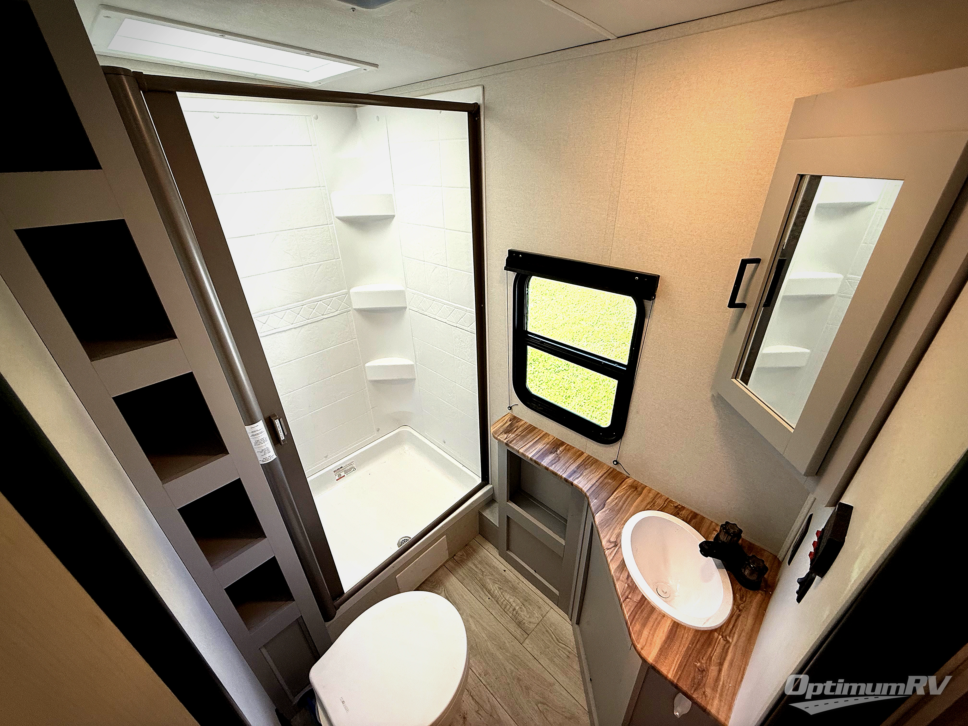 If you've been searching for a family-friendly travel trailer, your search is over with this model that can sleep eight to nine people each night. The double-size bunks are right beside the full bath for convenience, and the convertible sleeper sofa with a stowaway table are within the slide out, which will provide more floor space. Store your paper goods and snacks in the hidden pantry behind the entertainment center, and your valuables can go in the overhead compartments. This model features an exterior kitchen and a 19' power awning with LED lights for tons of outdoor fun!