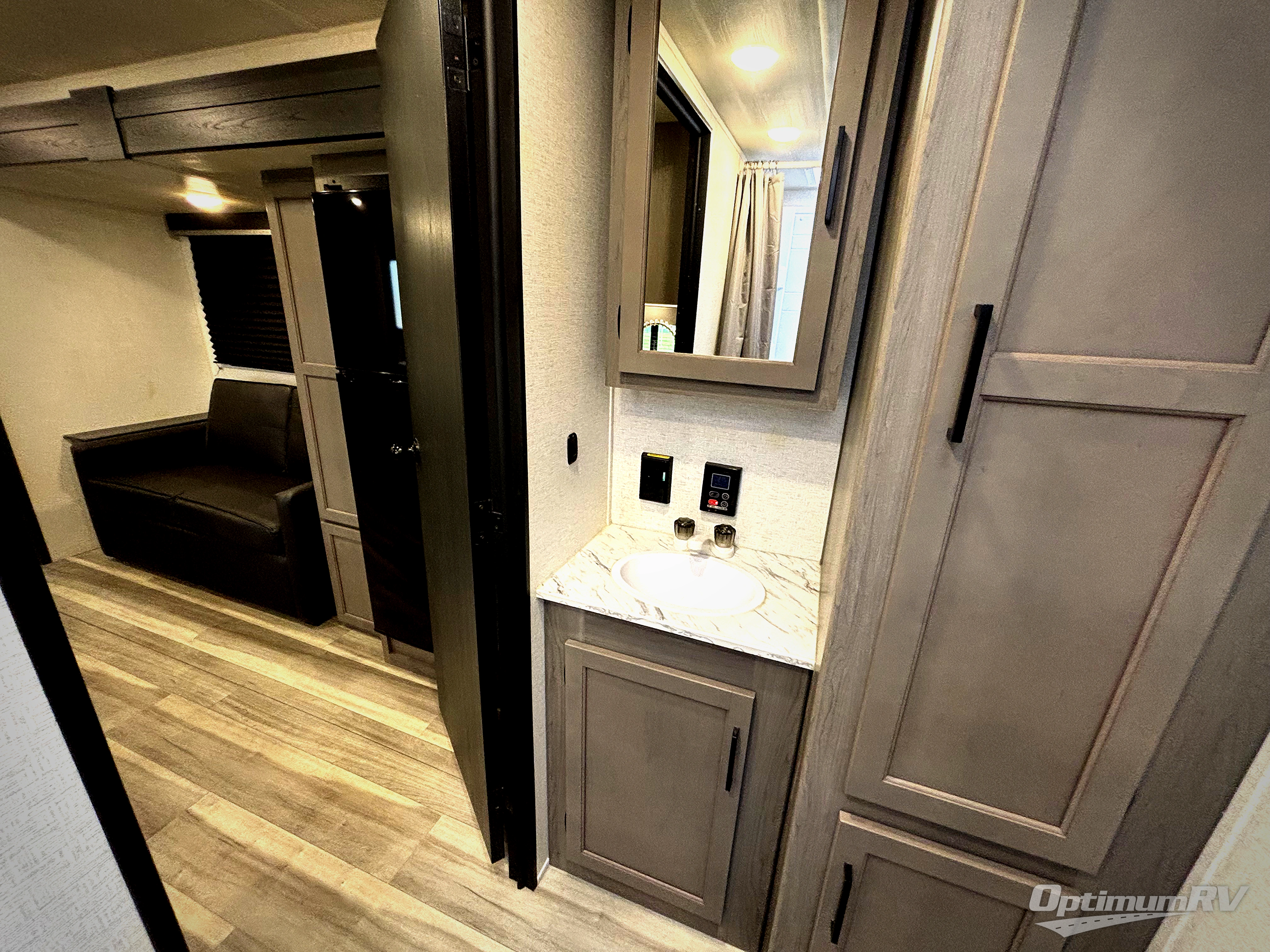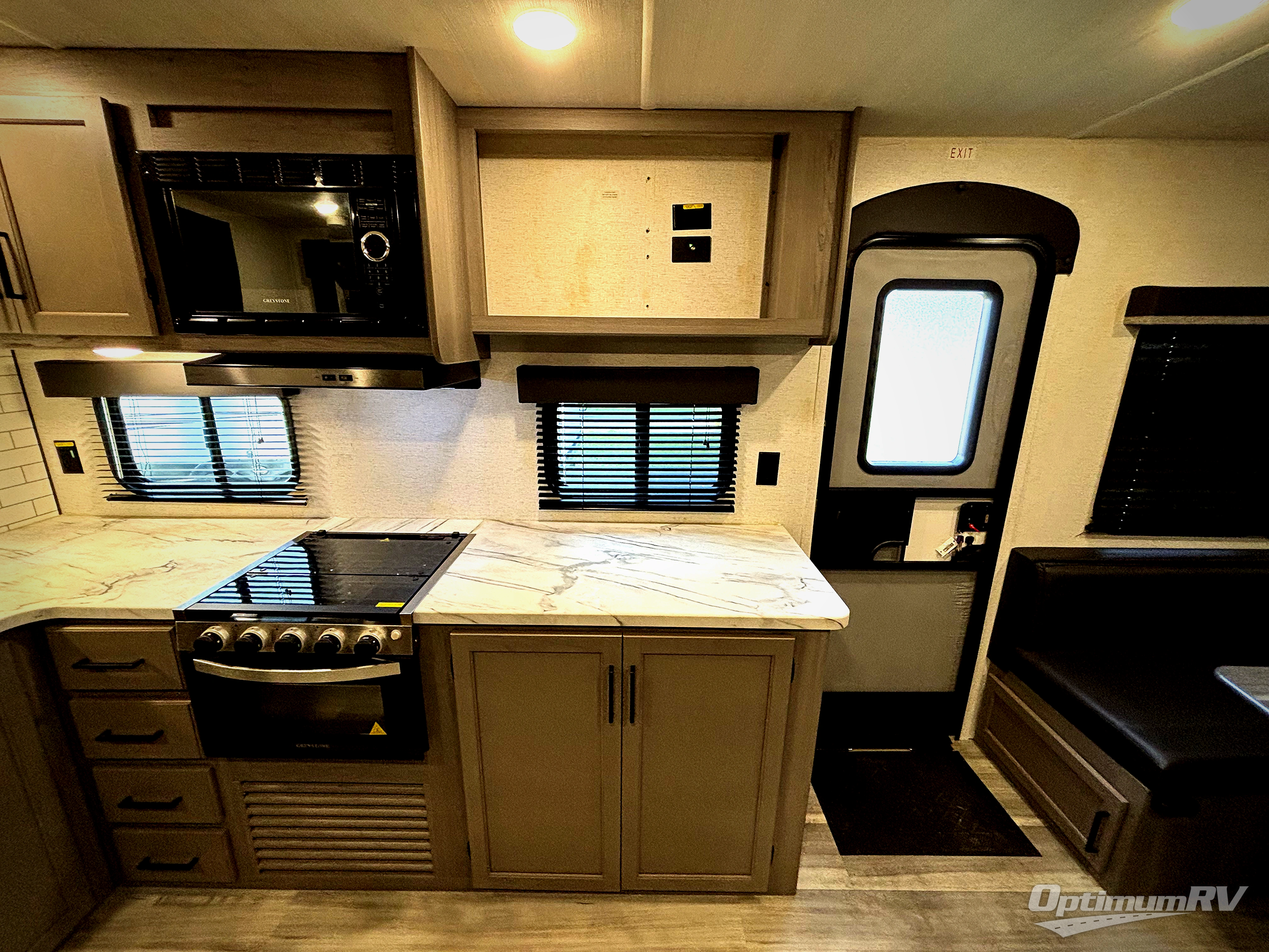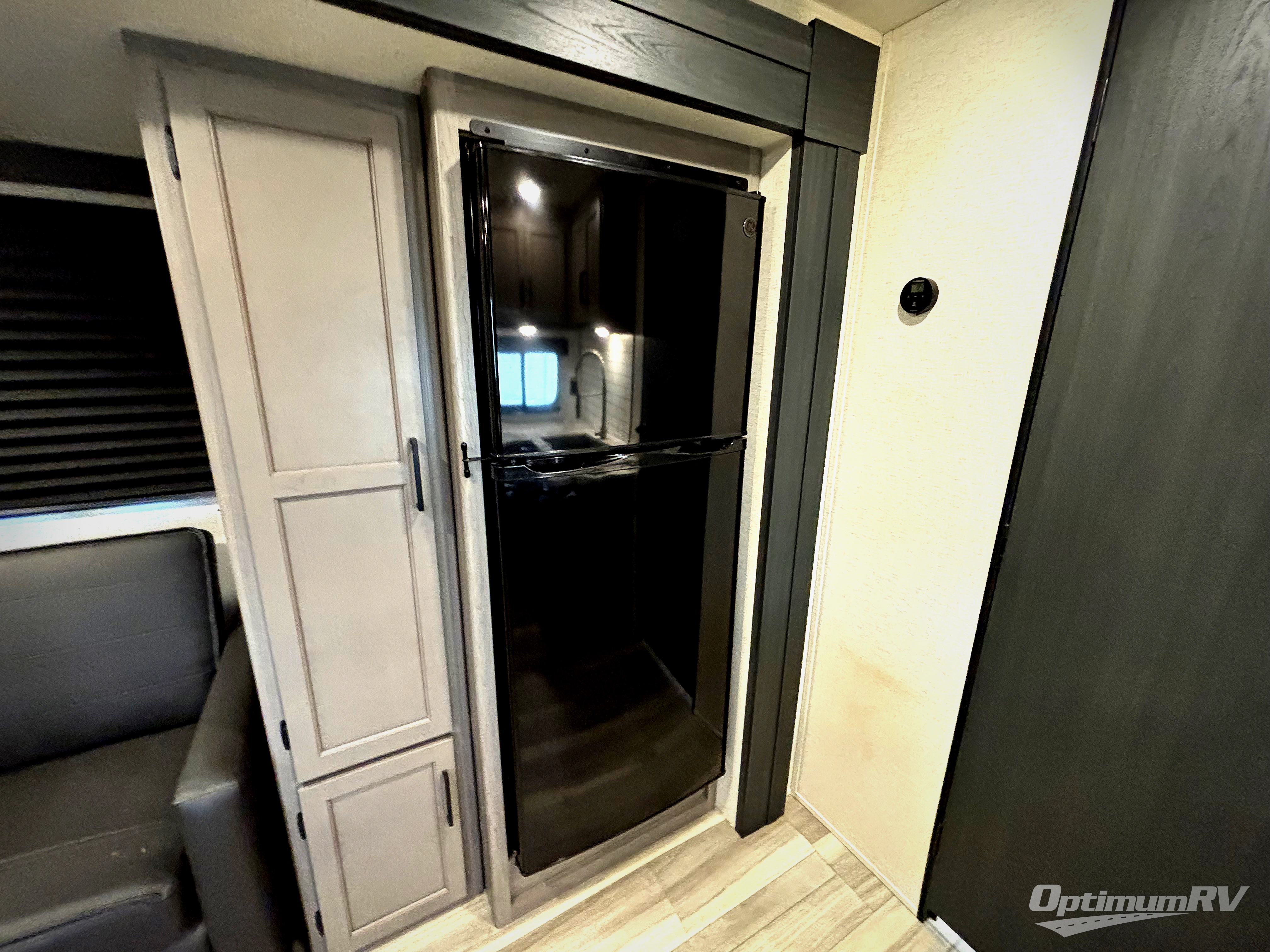 Enjoy every camping trip in this spacious dual entry travel trailer for six. You will love the rear U-dinette and the standard sofa within the large slide out, and there is TV prep in the living area if you plan to bring along your television. You could also choose the optional tri-fold sofa or optional theater seating if you need more seating or sleeping space. Home cooked meals can be whipped up in a hurry on the three burner range, and there is plenty of counter space to cut up fresh veggies. The walk-through bath is convenient for everyone to access, and here you'll find a spacious shower and a linen closet for clean towels. Head to the master bedroom where you'll be met with a queen bed, dual nightstands and closets, a laundry chute, plus your own exterior entry door; how convenient. The exterior even has an outdoor refrigerator for cold drinks under the awning!