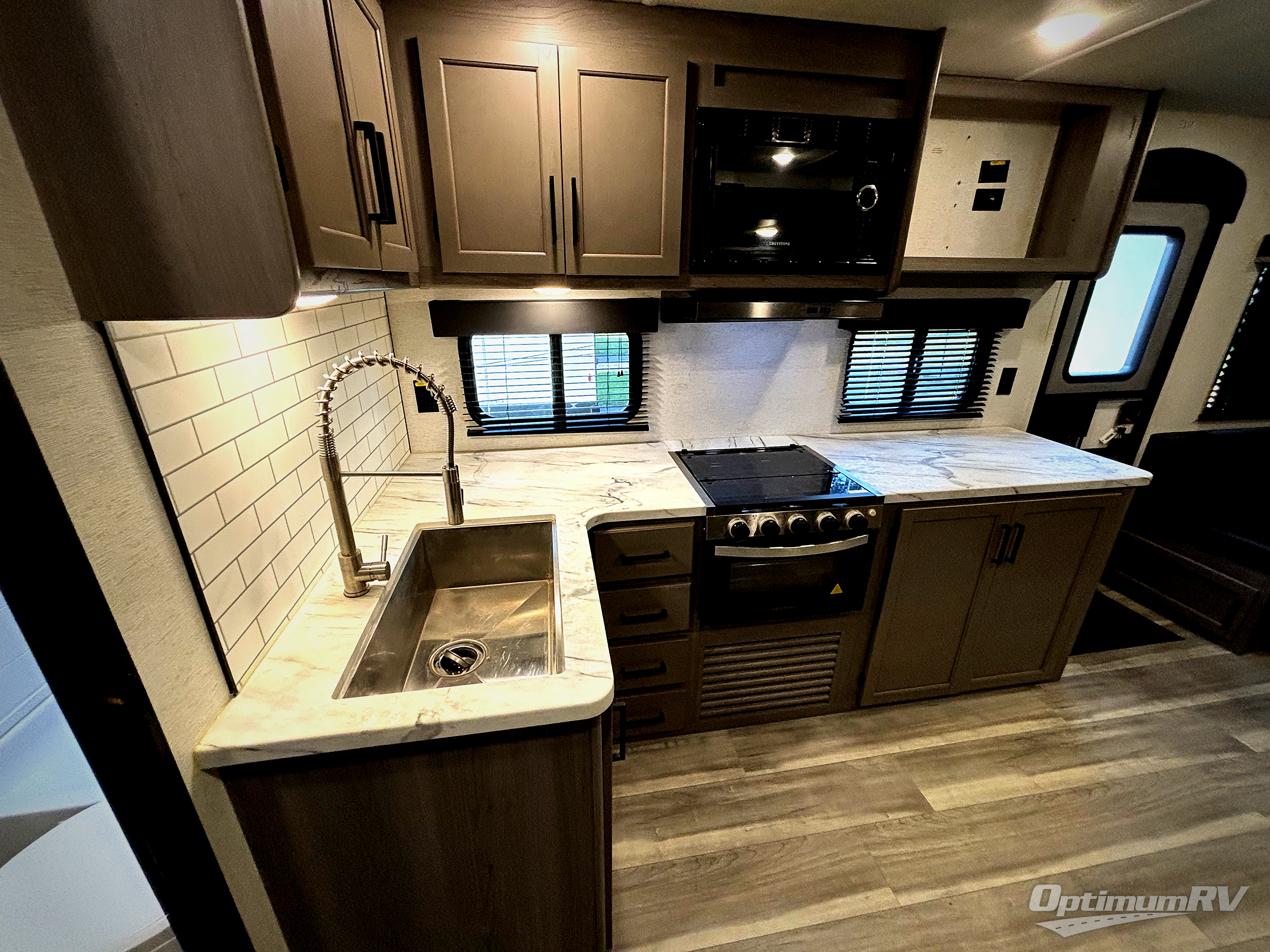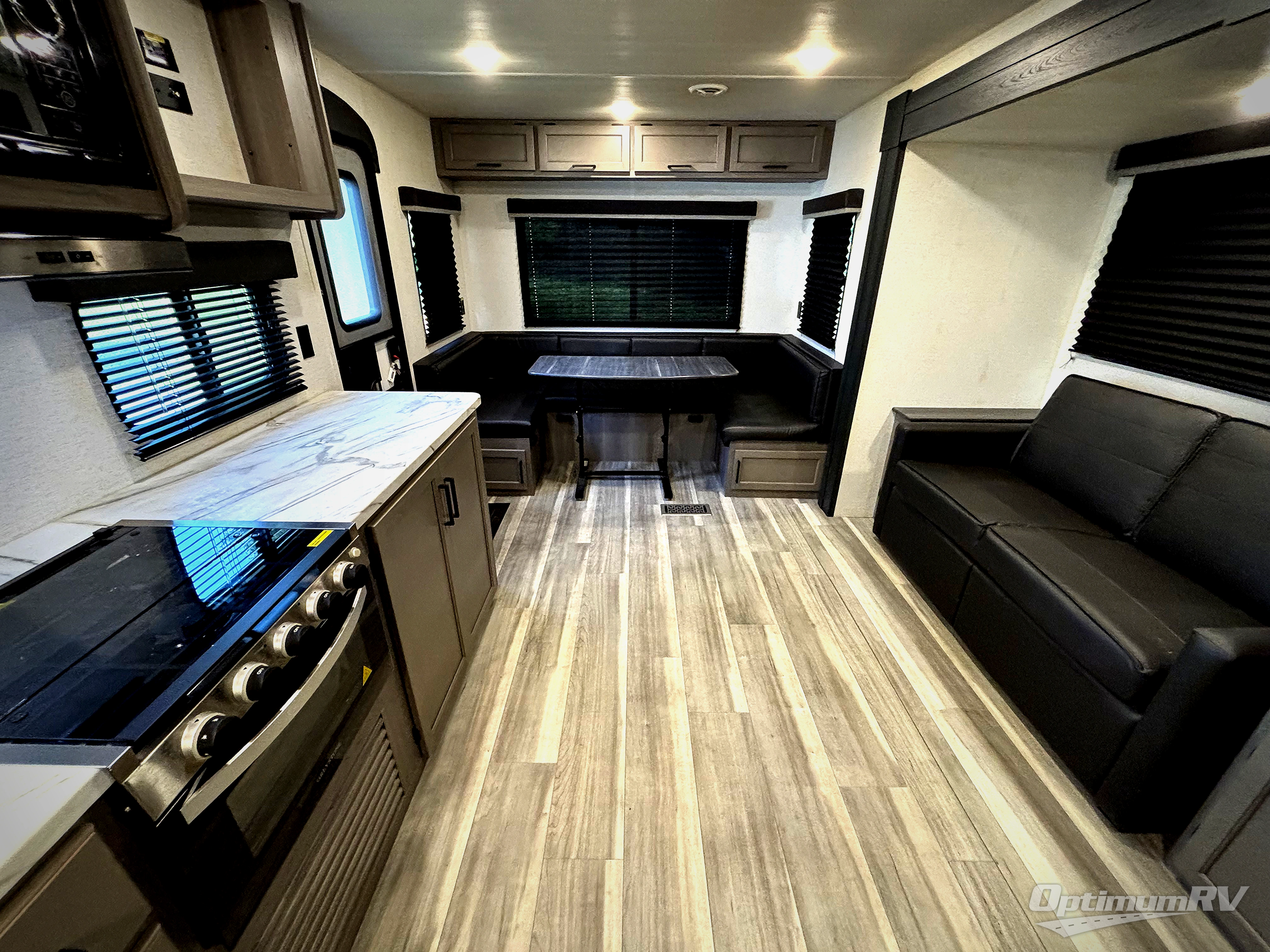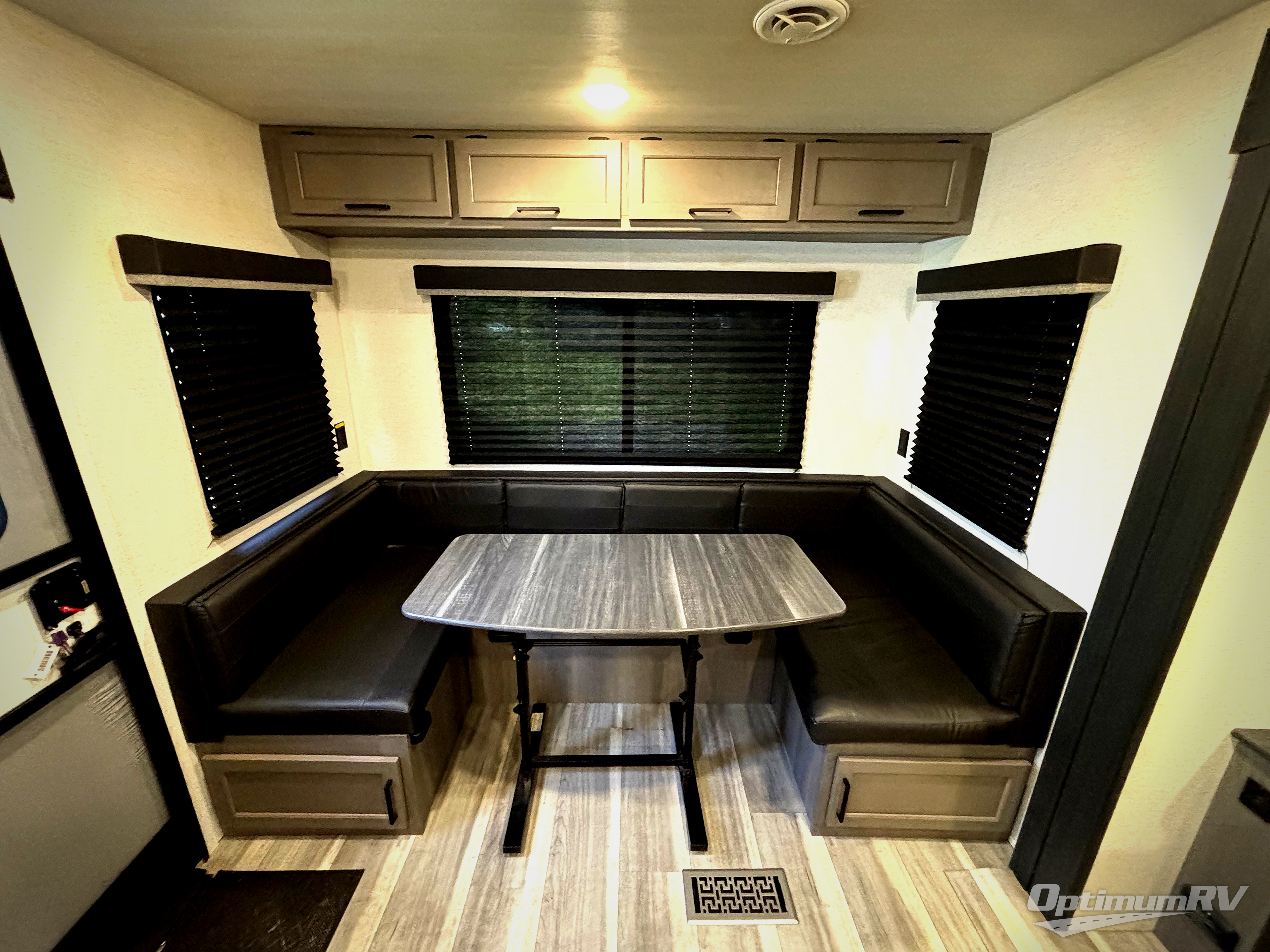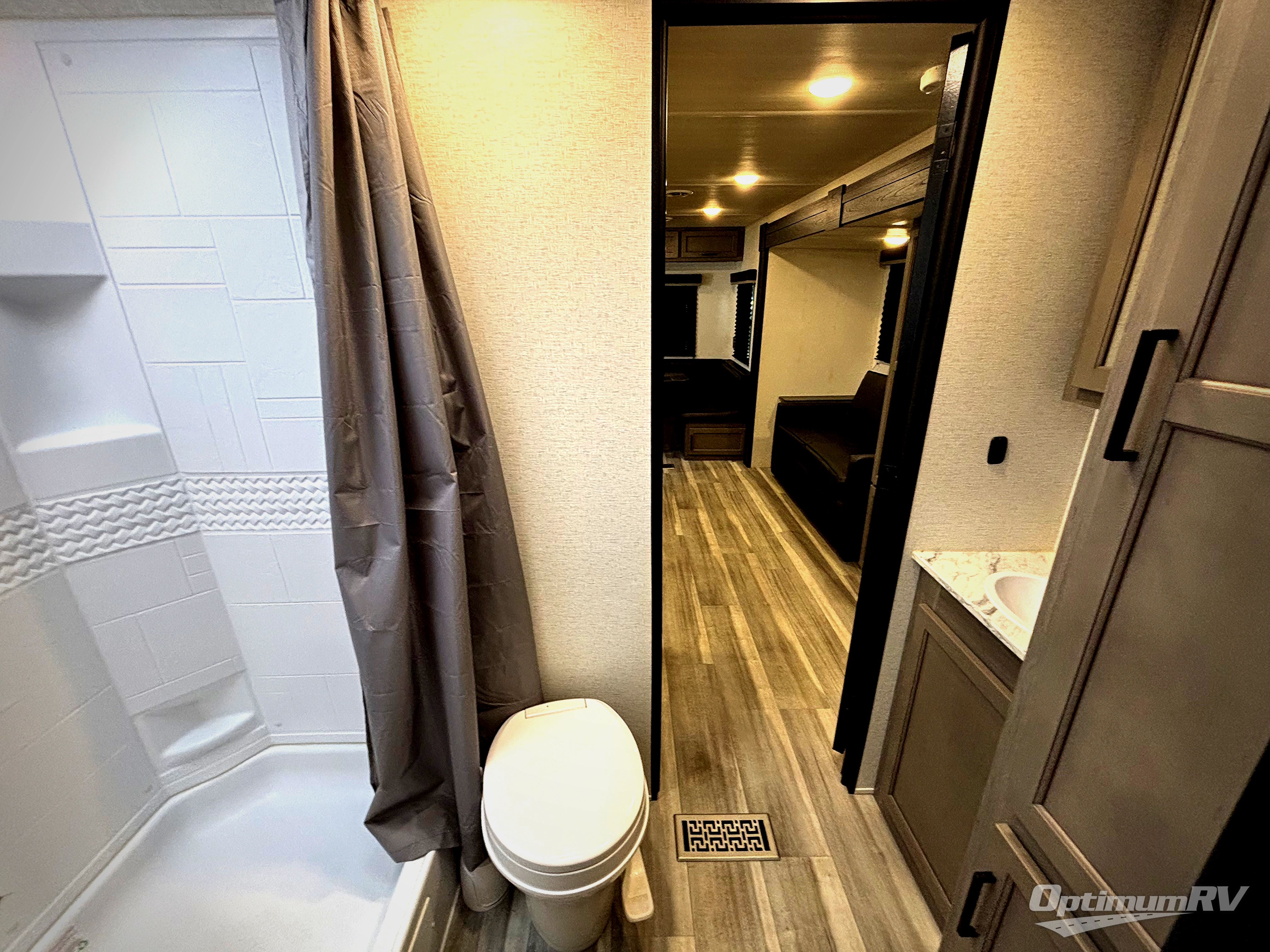 Enjoy every camping trip in this spacious dual entry travel trailer for six. You will love the rear U-dinette and the standard sofa within the large slide out, and there is TV prep in the living area if you plan to bring along your television. You could also choose the optional tri-fold sofa or optional theater seating if you need more seating or sleeping space. Home cooked meals can be whipped up in a hurry on the three burner range, and there is plenty of counter space to cut up fresh veggies. The walk-through bath is convenient for everyone to access, and here you'll find a spacious shower and a linen closet for clean towels. Head to the master bedroom where you'll be met with a queen bed, dual nightstands and closets, a laundry chute, plus your own exterior entry door; how convenient. The exterior even has an outdoor refrigerator for cold drinks under the awning!