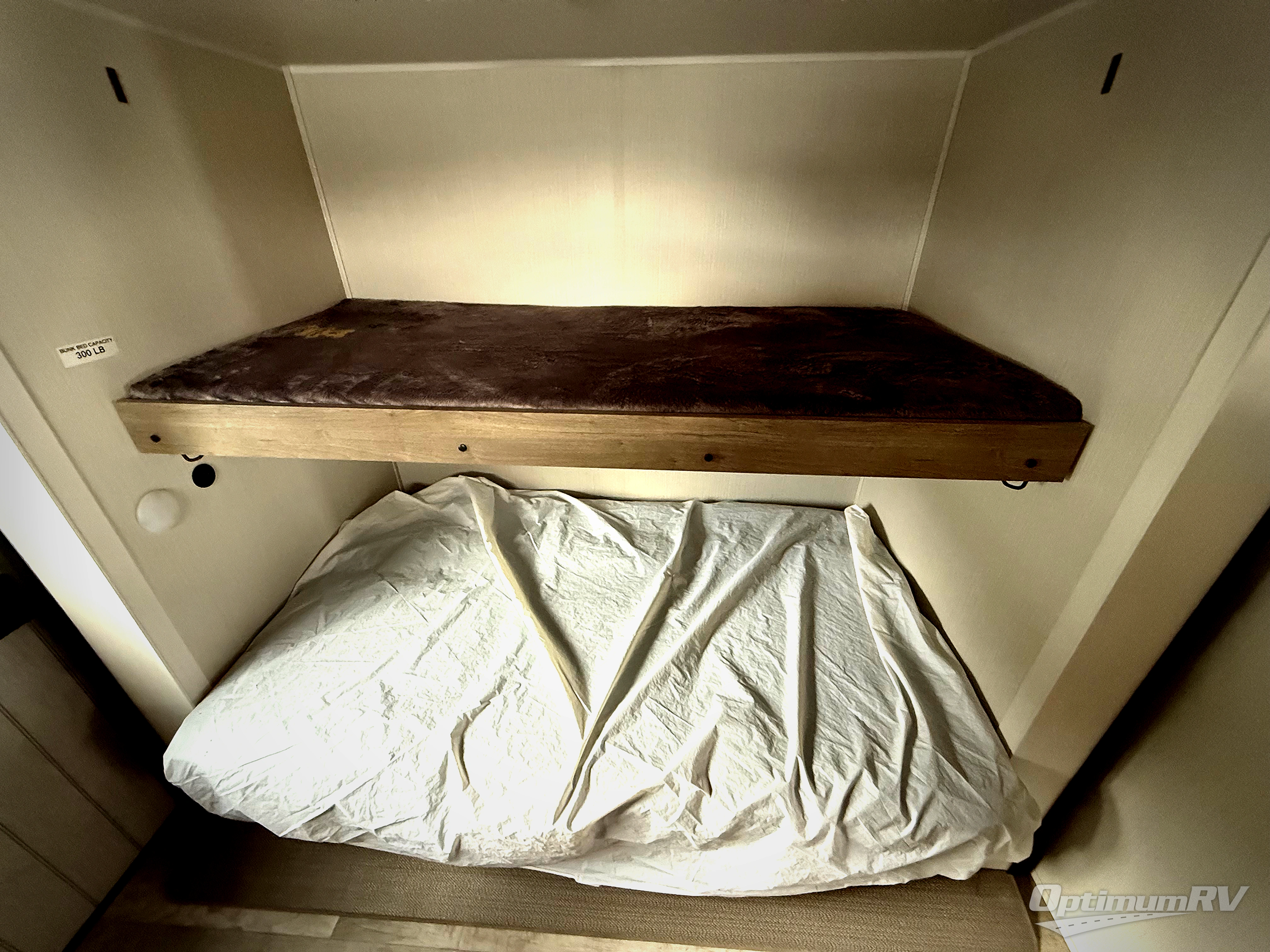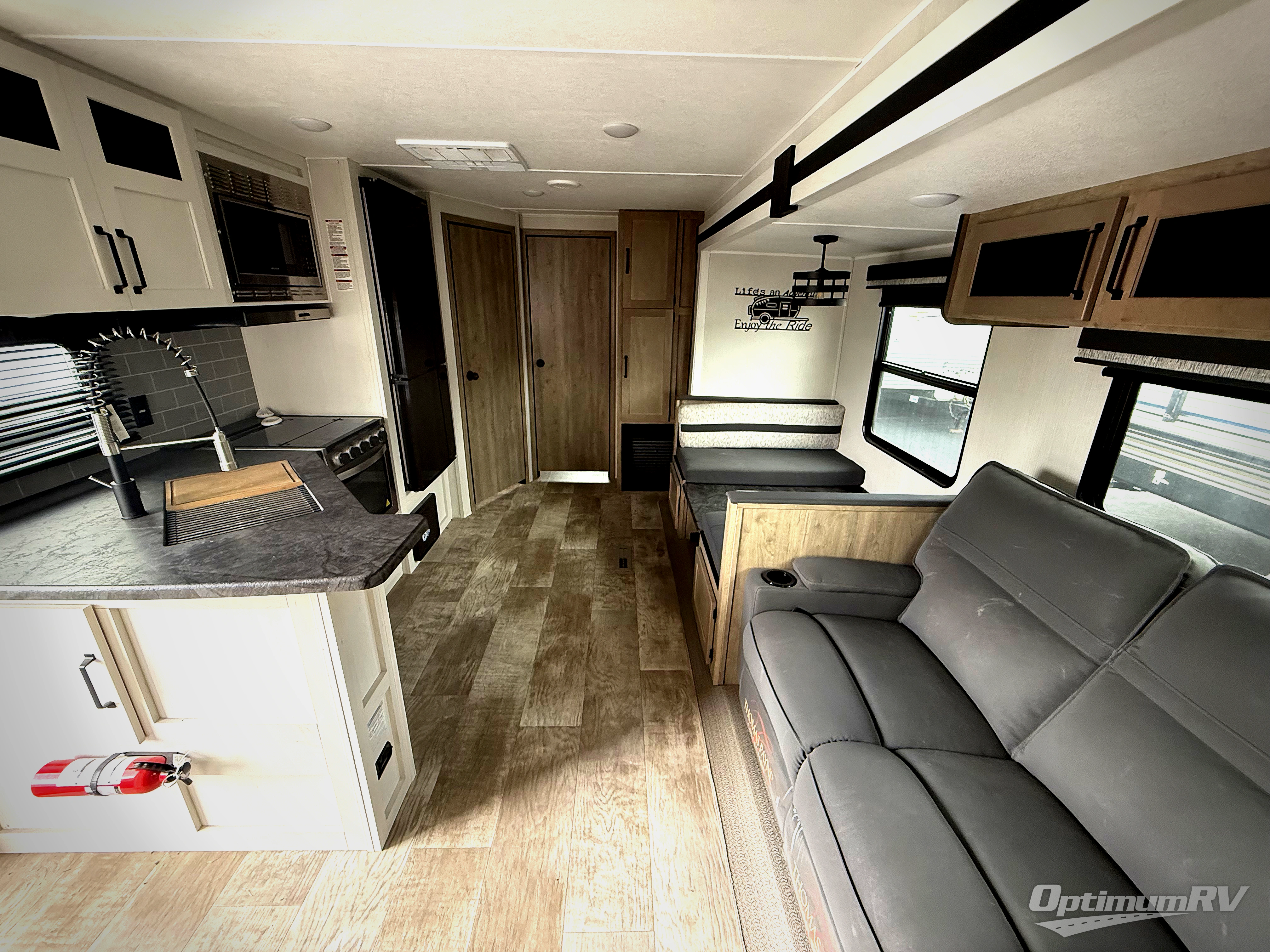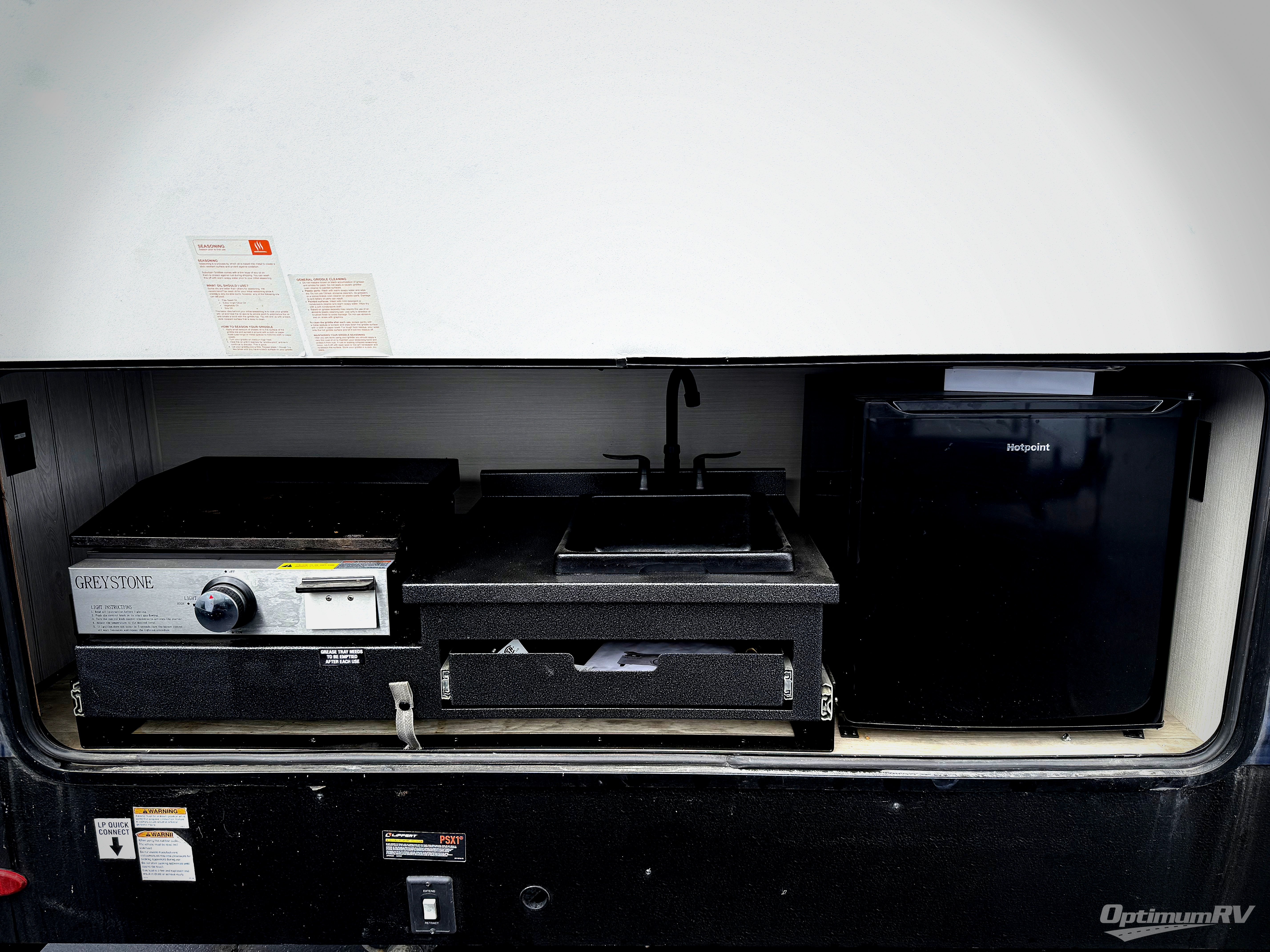 With dual entry doors and a bath and a half, you will have the ultimate in convenience with this travel trailer! The bedroom also has a front closet to keep your clothes looking their best and a queen bed slide for you to sleep your best. Everyone can freshen up in the full bathroom with the 34" x 34" radius shower and fill their bellies with scrambled eggs cooked on the three burner cooktop. Enjoy your meals, play games, and even sleep at the booth dinette or relax on the sofa while watching a movie with the entertainment center and fireplace. And your guests will love the rear private bunkhouse with three bunks, a jiffy sofa, and a slide out for more space! This model also includes an optional outside mini kitchen with a griddle!