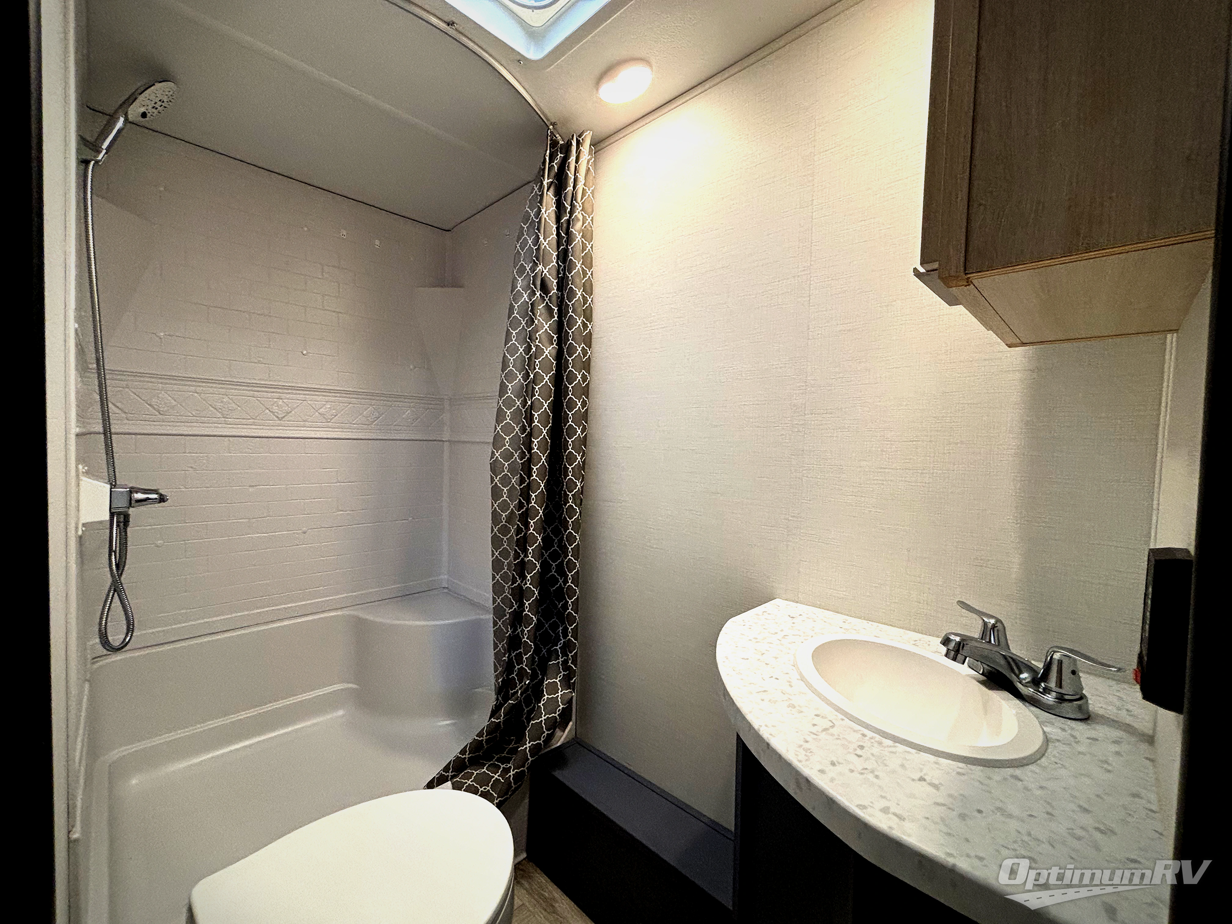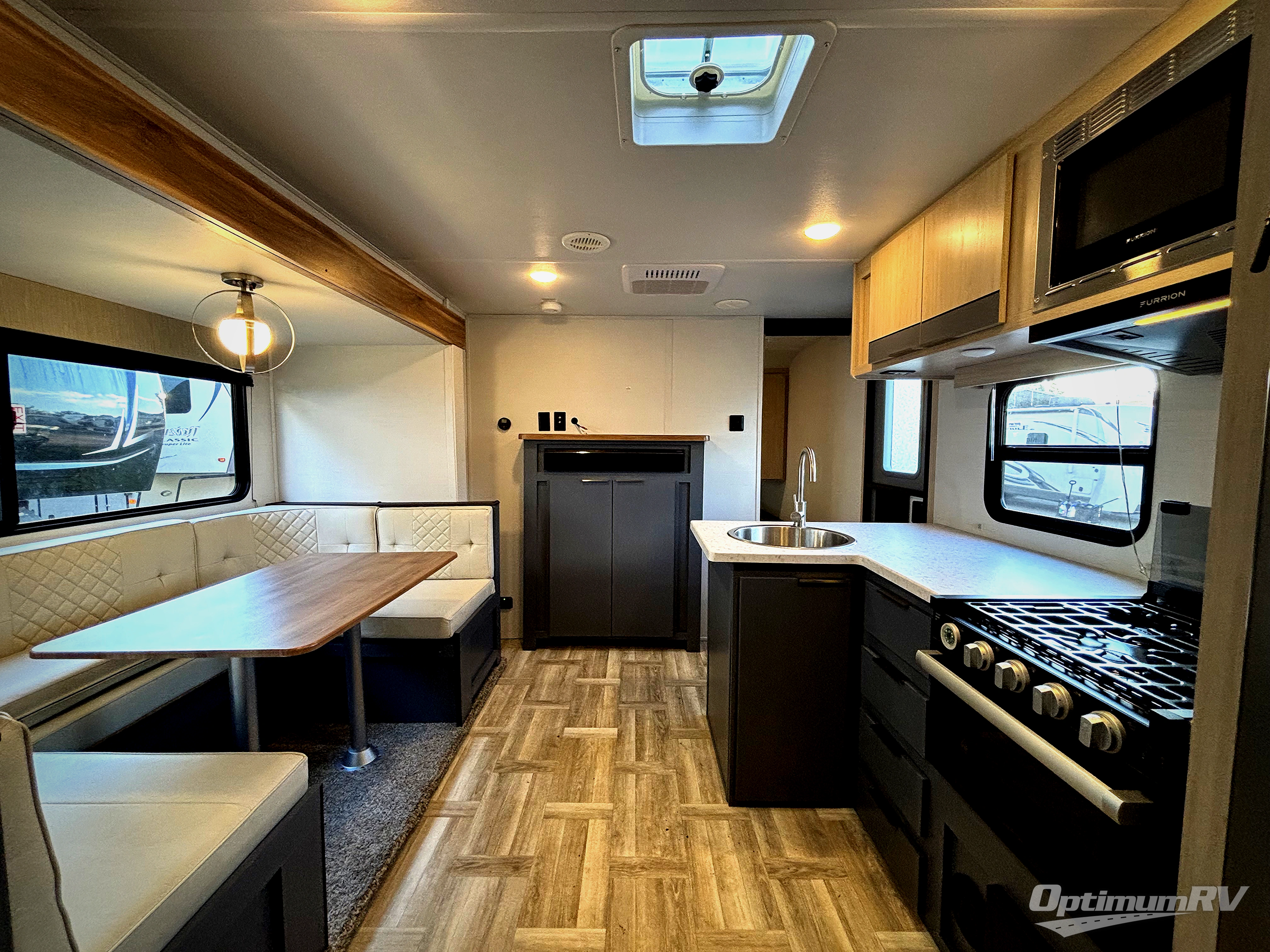 If you are looking for a trailer with double-size bunks and a private bedroom, you have found it! The queen bed and two wardrobes are behind a partial wall for added privacy. The double-size bunks are in the rear corner next to the full bathroom for convenience for the kids or your guests. And the L-shaped counter with a kitchen sink and full amenities sets up the cook nicely to be able to make meals for everyone. And you will love the extra floor space created by the booth dinette and sofa slide out.