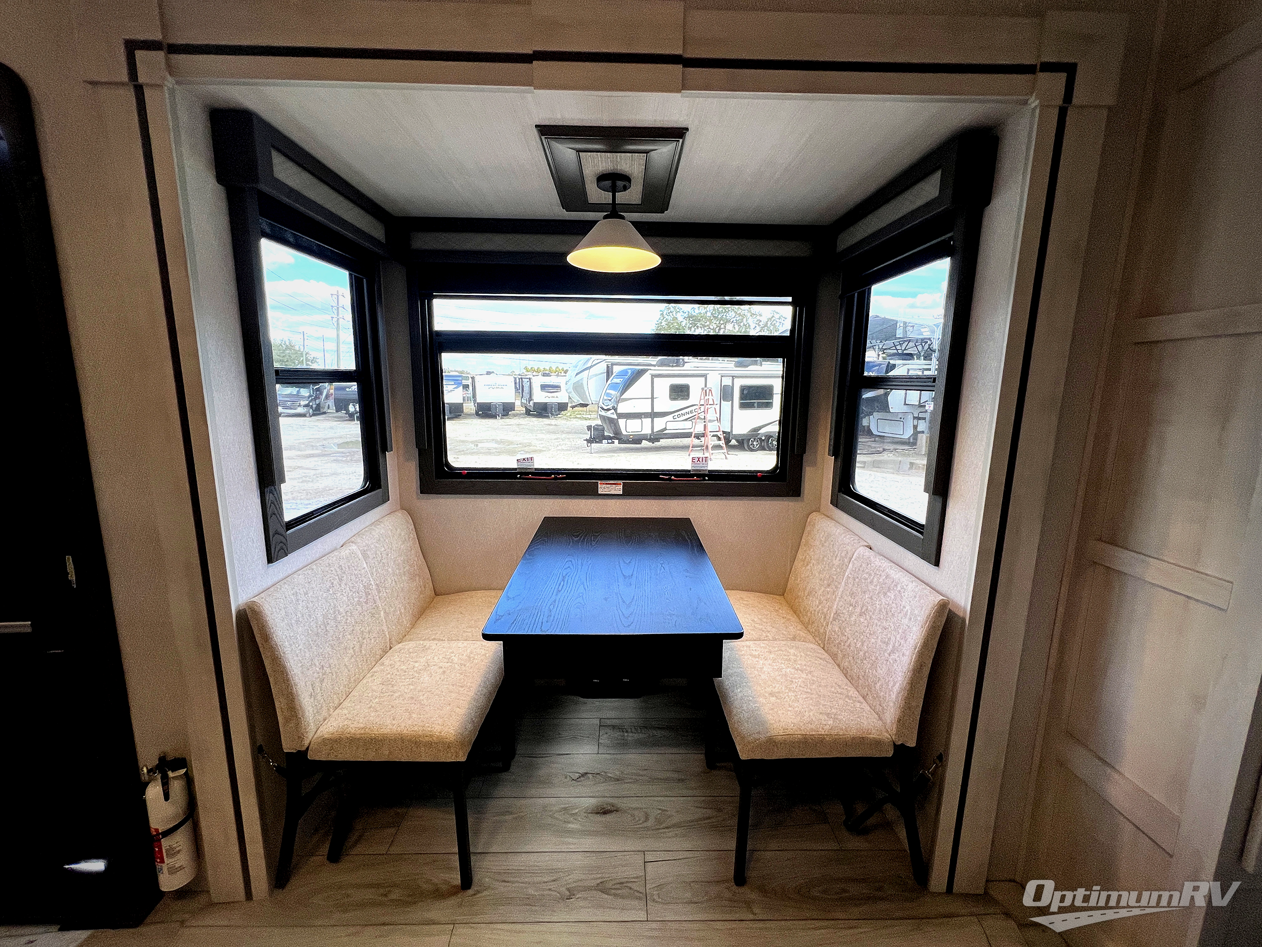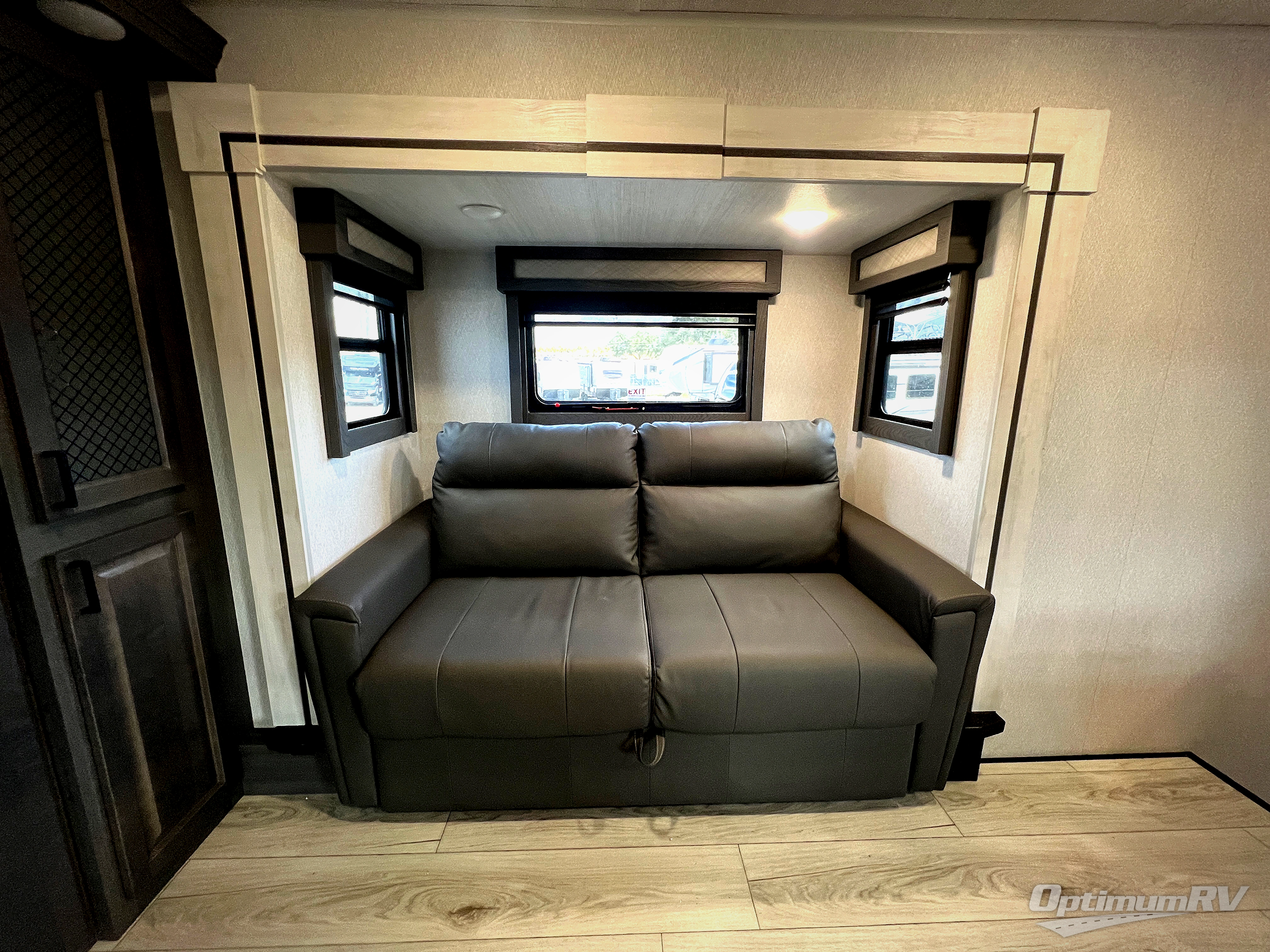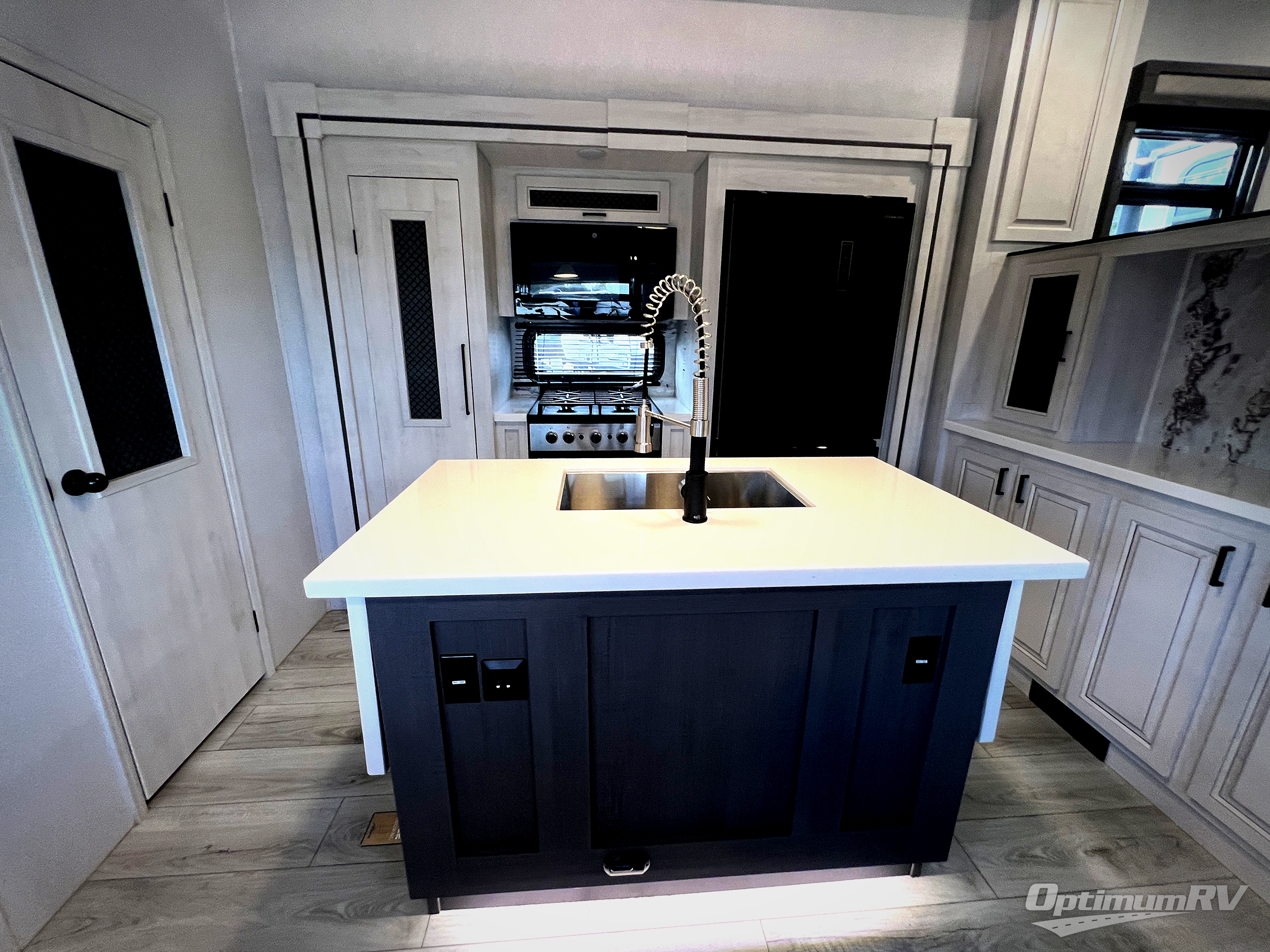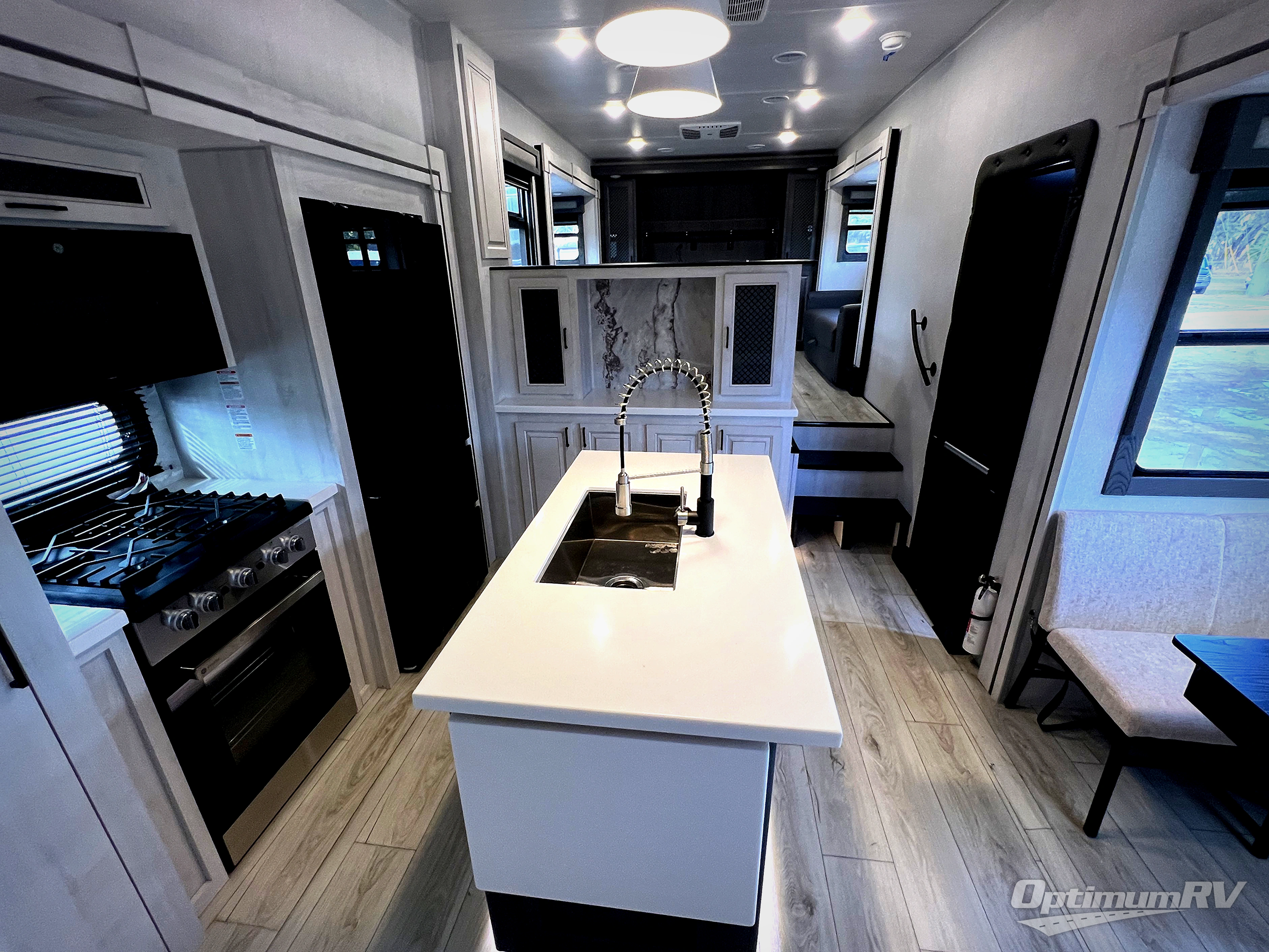 If you've been looking for a luxury fifth wheel to call your new home away from home, take a look at this Ahara! The front living area will be a favorite hangout spot with its dual hide-a-bed sofa, theater seating, and 65" TV with a fireplace. And since there are dual opposing slides here, your guests will have plenty of space to fold down the sofas at night for a great night's rest. If you're looking for your bedroom, head to the back and you'll enjoy a king bed slide out, a dresser with TV, two closets, plus your own full rear bath. The dual bath sinks are sure to come in handy when you're both getting ready for bed, and the spacious shower with a skylight will provide natural light as you clean up in the morning. There is even a closet with washer and dryer prep if you plan to go full-time. In the morning you can prepare breakfast on the four burner cooktop or in the 30" over-the-range residential microwave, and the 16 cu. ft. 12V French door refrigerator includes a double drawer freezer to hold more food. There is a free-standing dinette, a hutch to store nice dishes, and the half bath is located off of this room for convenience!