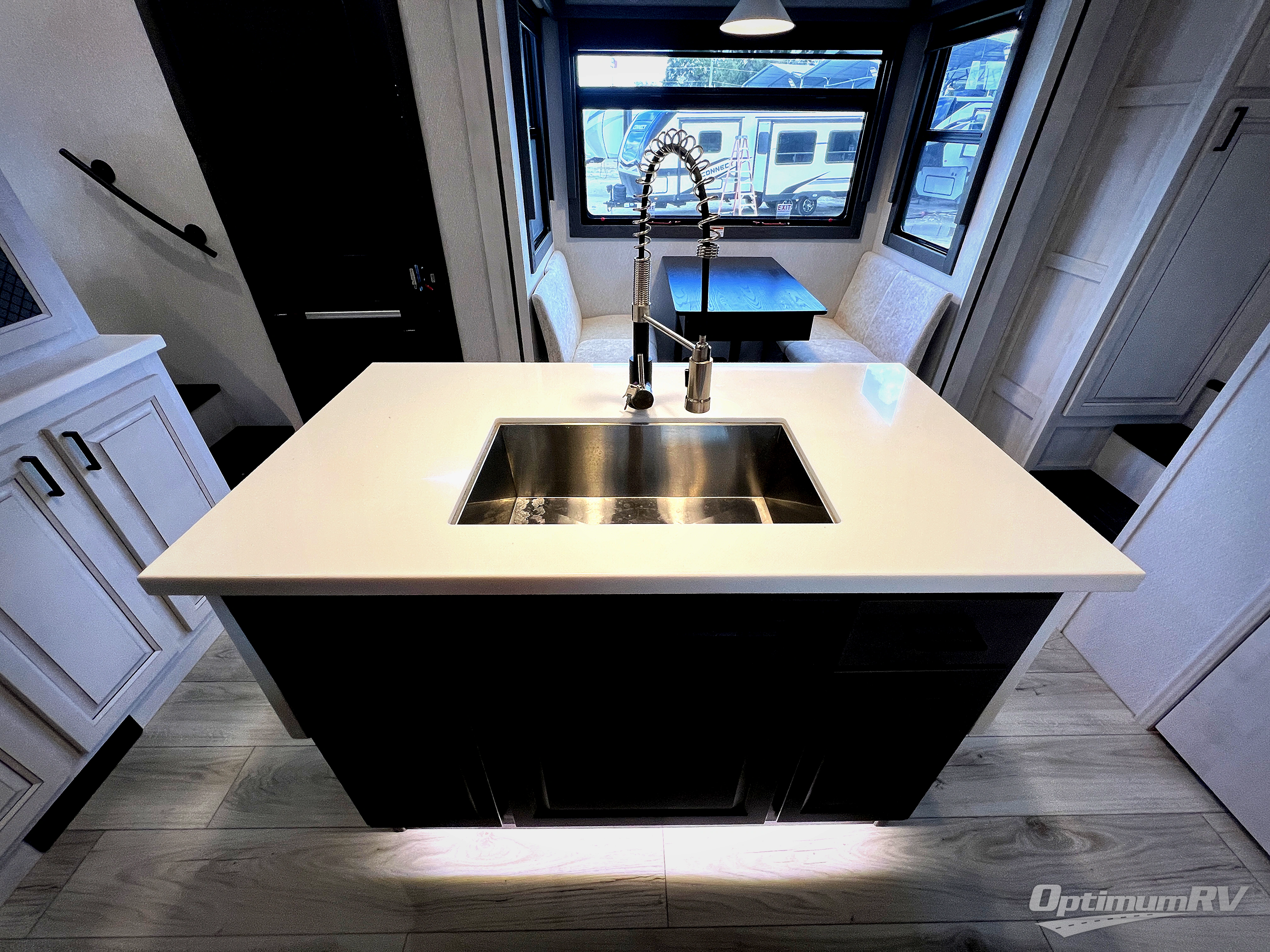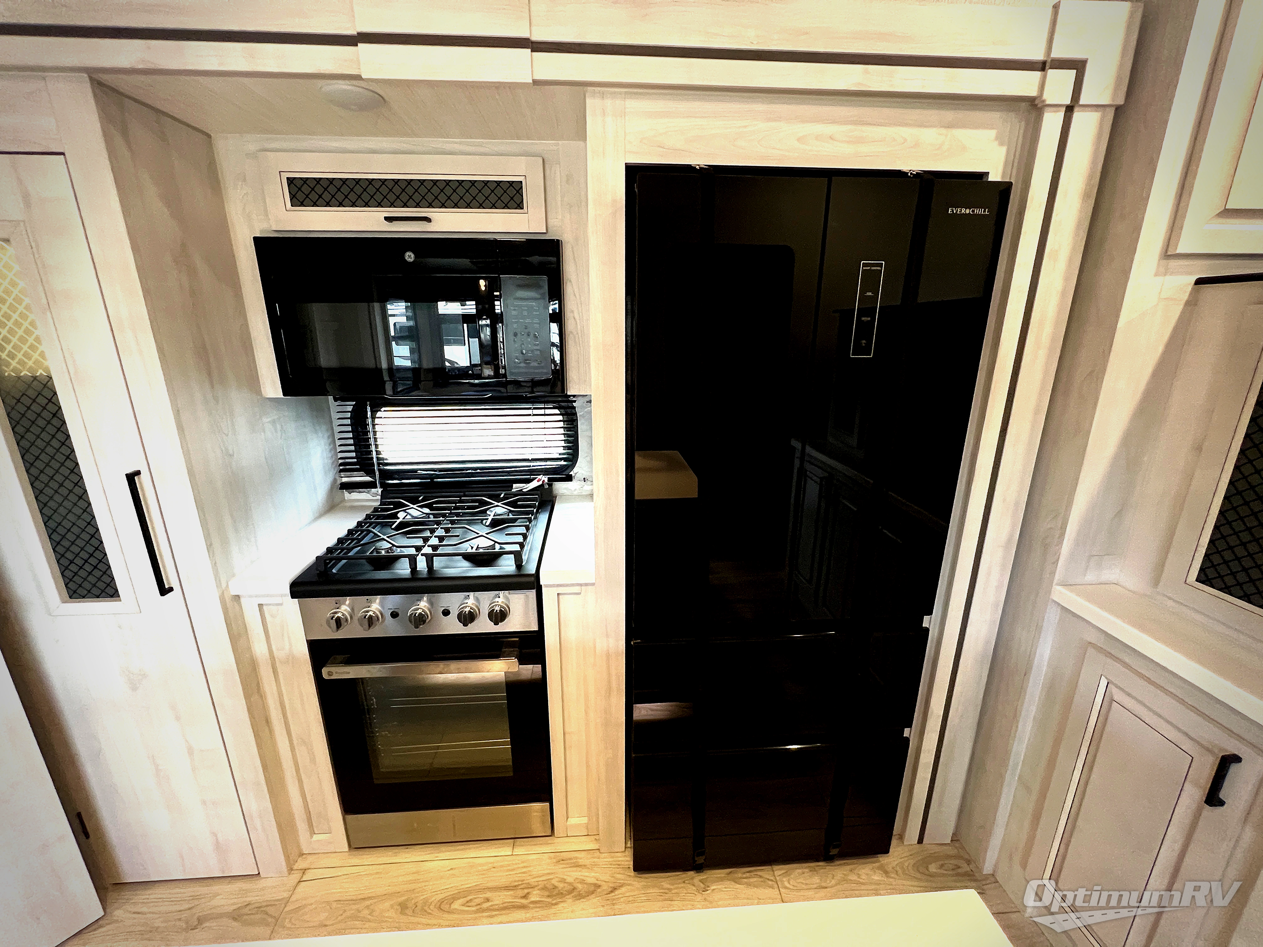 There is just too much luxury to name on the EAST TO WEST Ahara fifth wheel! These units are quite impressive, and once you see them, you'll know what we mean. The Ahara first grabs your attention with its hi-gloss gel-coated fiberglass exterior which showcases two power awnings with LED lights, an LP quick connect, an exterior cable/satellite hookup, and a universal all-in-one docking station. For towing, you'll find a MORryde CRE 3000 suspension, Dexter Gladiator thick-wall 7,000-LB axles with Nev-R-Adjust brakes, and preparations for a rearview camera. Traveling during all seasons is also made easy with the high-efficiency triple A/C system, a 40,000 BTU high-capacity furnace, a heated, insulated, and enclosed underbelly and dump valves with circulating heat, and Radiant Technology Composites insulation in the roof, front cap, and underbelly.