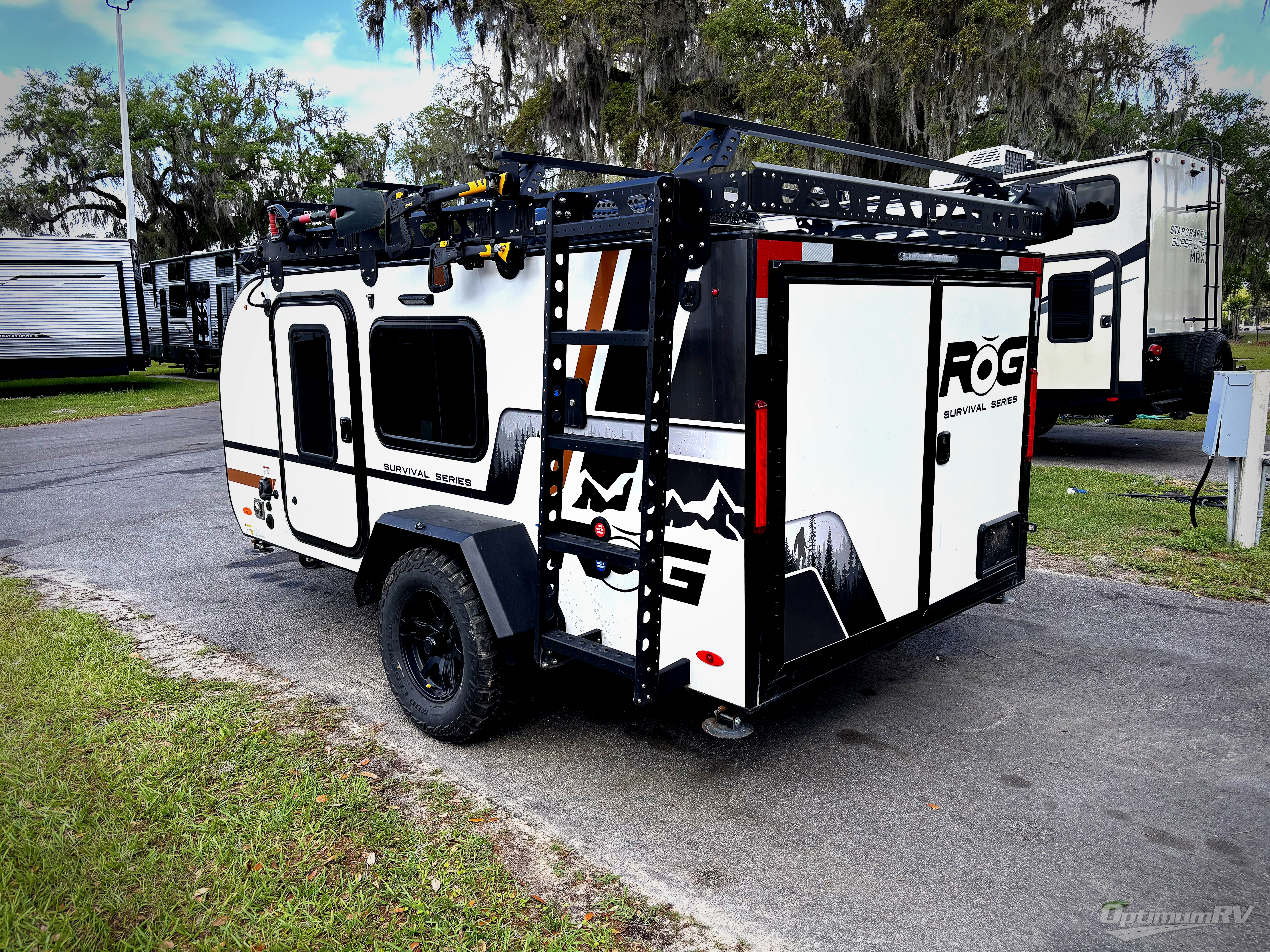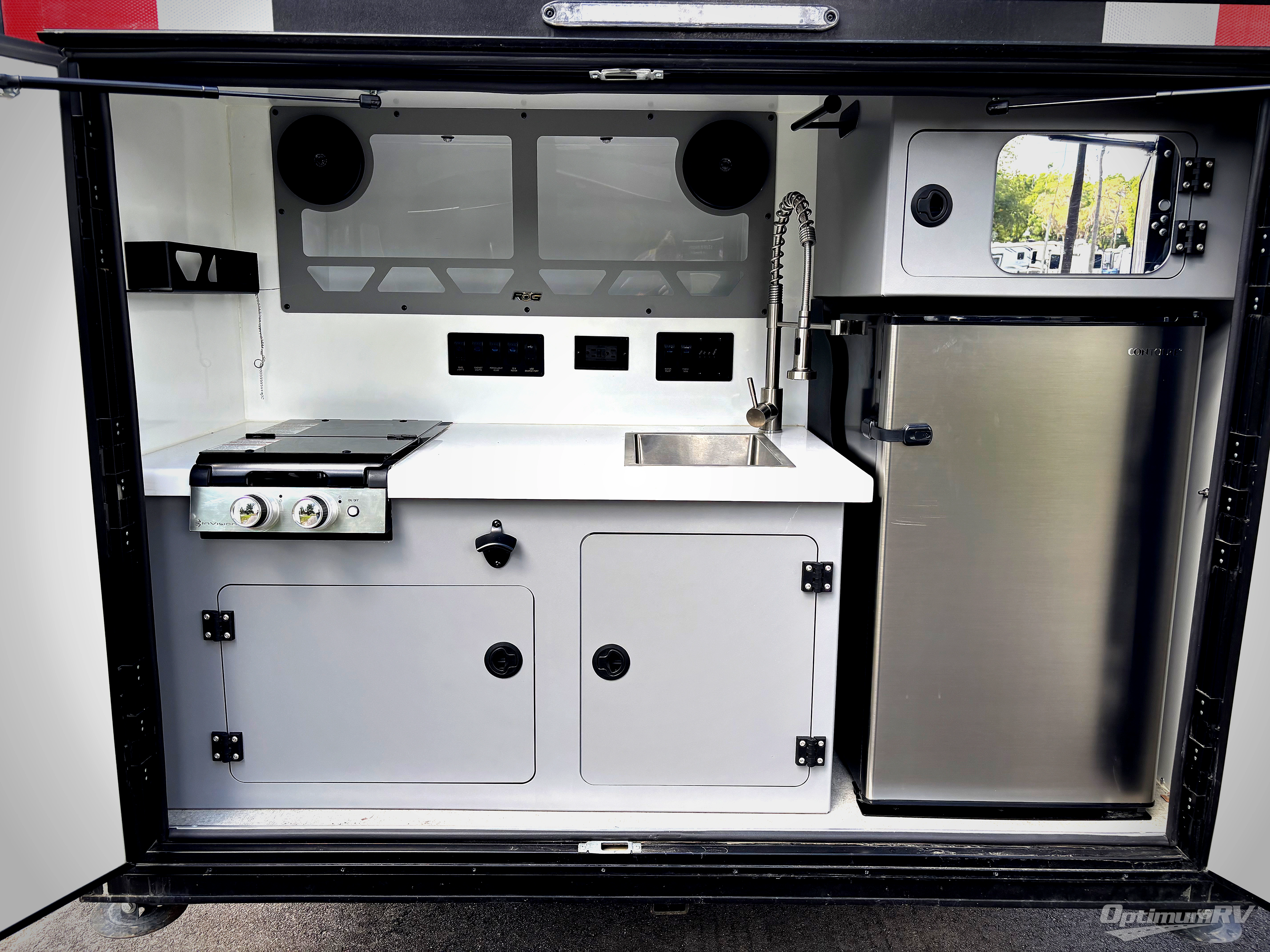 You will be so excited to test out this ROG travel trailer for yourself! The interior has great storage solutions to keep your camp gear secure. The rear outdoor kitchen has convenient amenities to help you eat well while you're away. You'll find a two-burner stove with cast-iron grates and a 3.3 cu. ft. 12V refrigerator to cook and store food. And the queen/futon mattress is sure to bring a great night's rest!