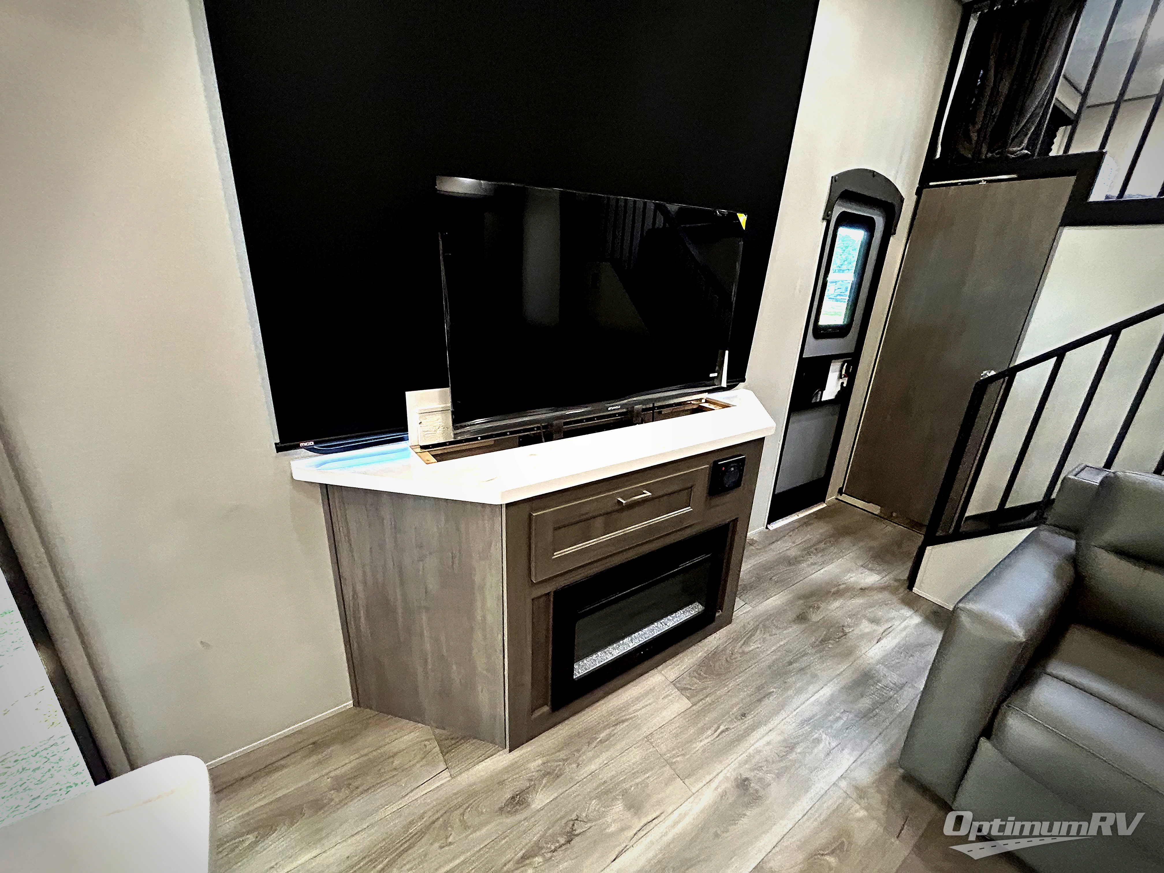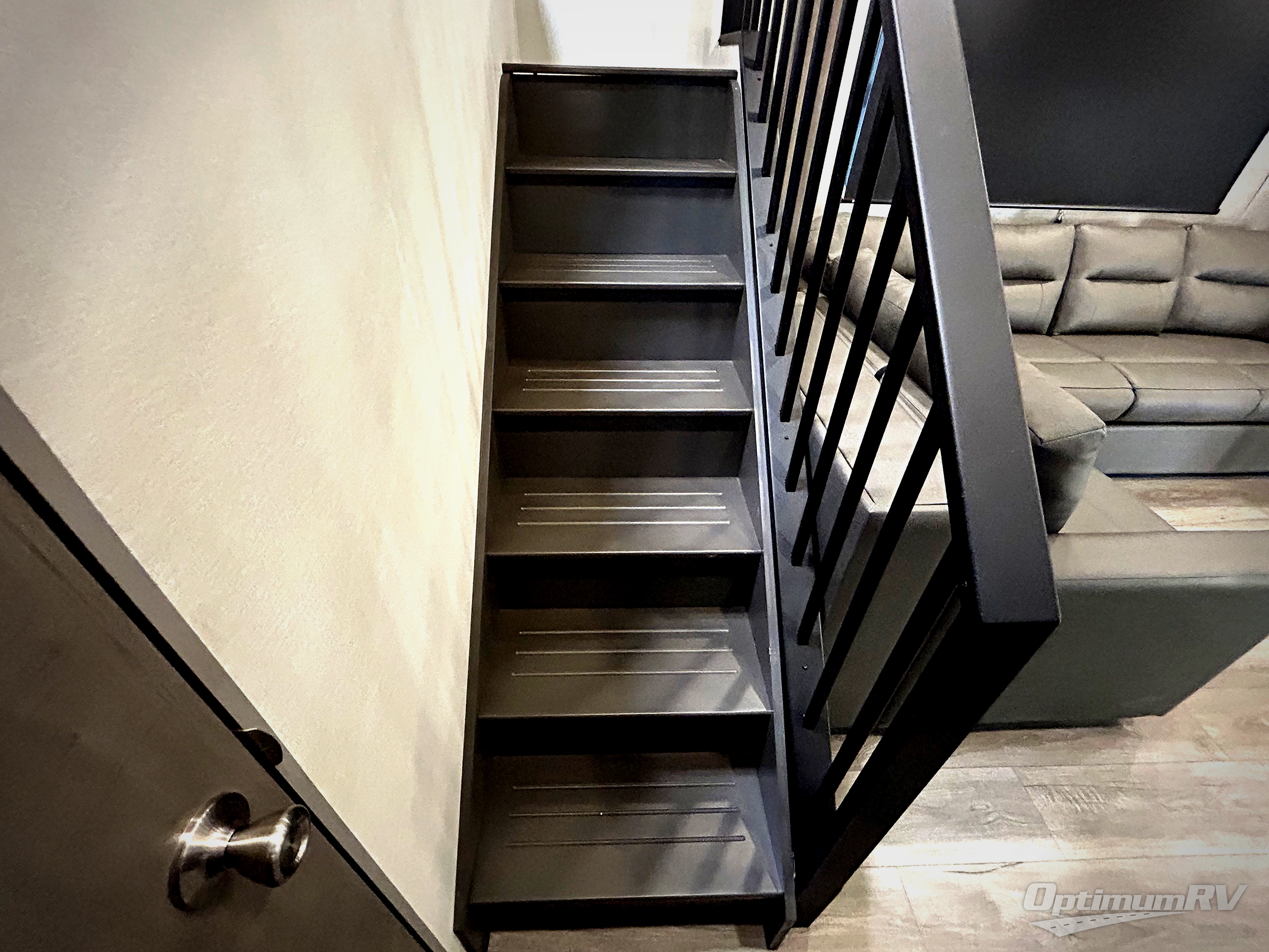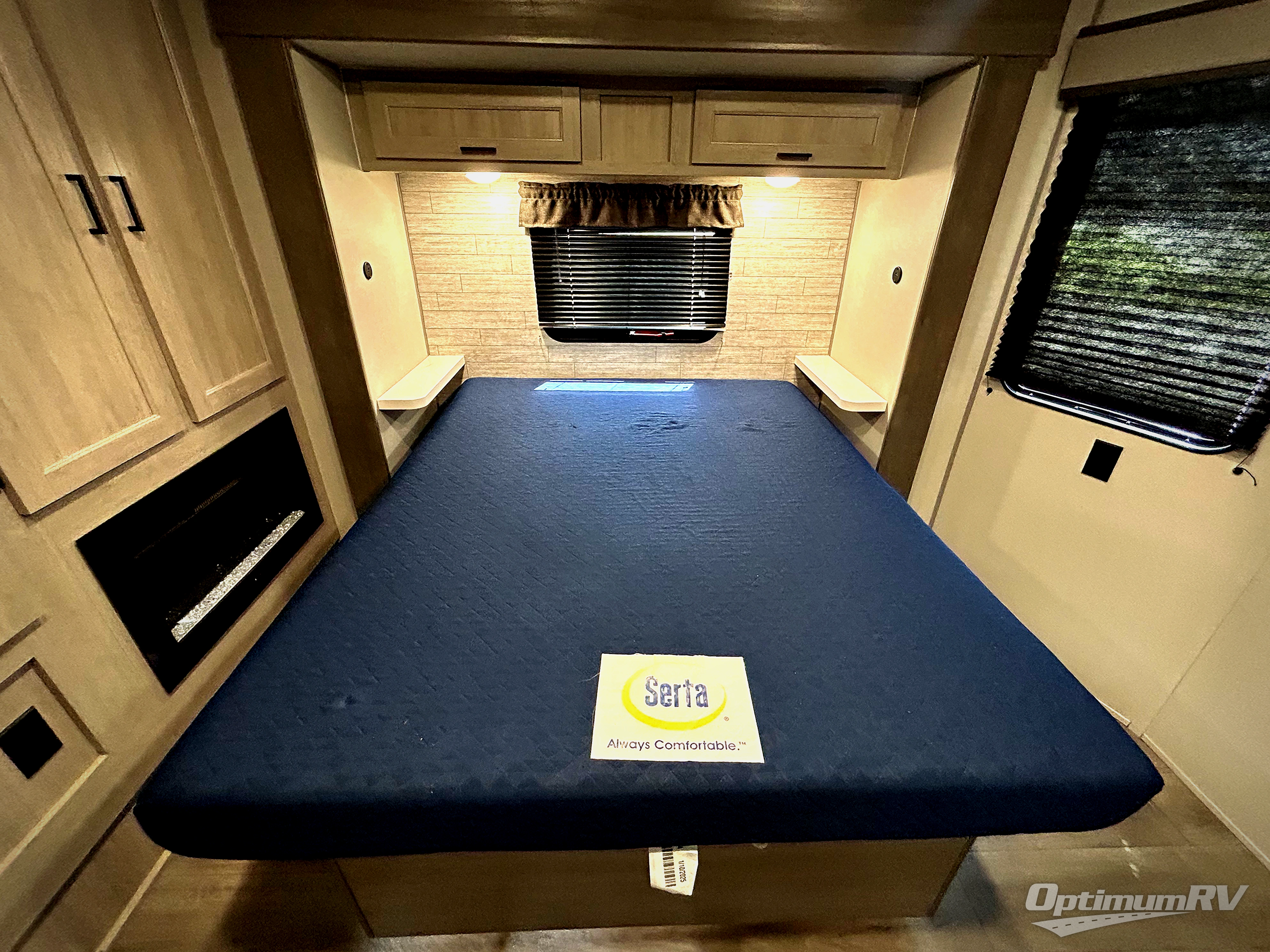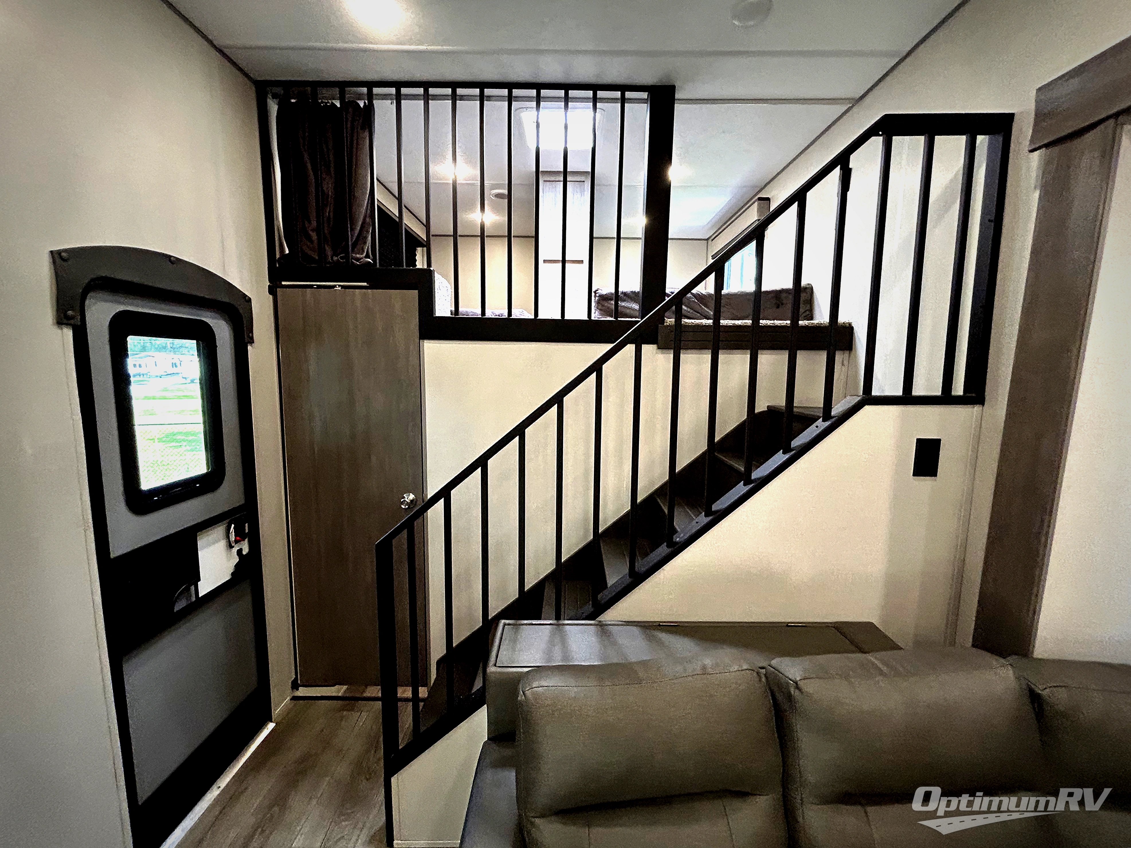 You won't believe the amount of comfort found throughout this destination trailer! The front private bedroom will provide you with your own space each night, and here you'll enjoy the RV queen bed slide out, wardrobe closets and a dresser, plus a bedroom fireplace for more comfort. The main living area is made spacious thanks to the large slide out, and the kitchen island with five bar stools will be the perfect place to dine together each day. There is also a hide-a-bed sectional sofa everyone is sure to enjoy relaxing on, and the power lift TV means you can make it a movie night! A spacious full rear bath includes a 48" x 30" shower with a seat and glass shower door and plenty of storage space to keep clean towels and bath necessities stocked. The feature you will really love on this trailer has to be the double loft areas, complete with five bunk mats in total and storage space for your guests' things; how convenient!
