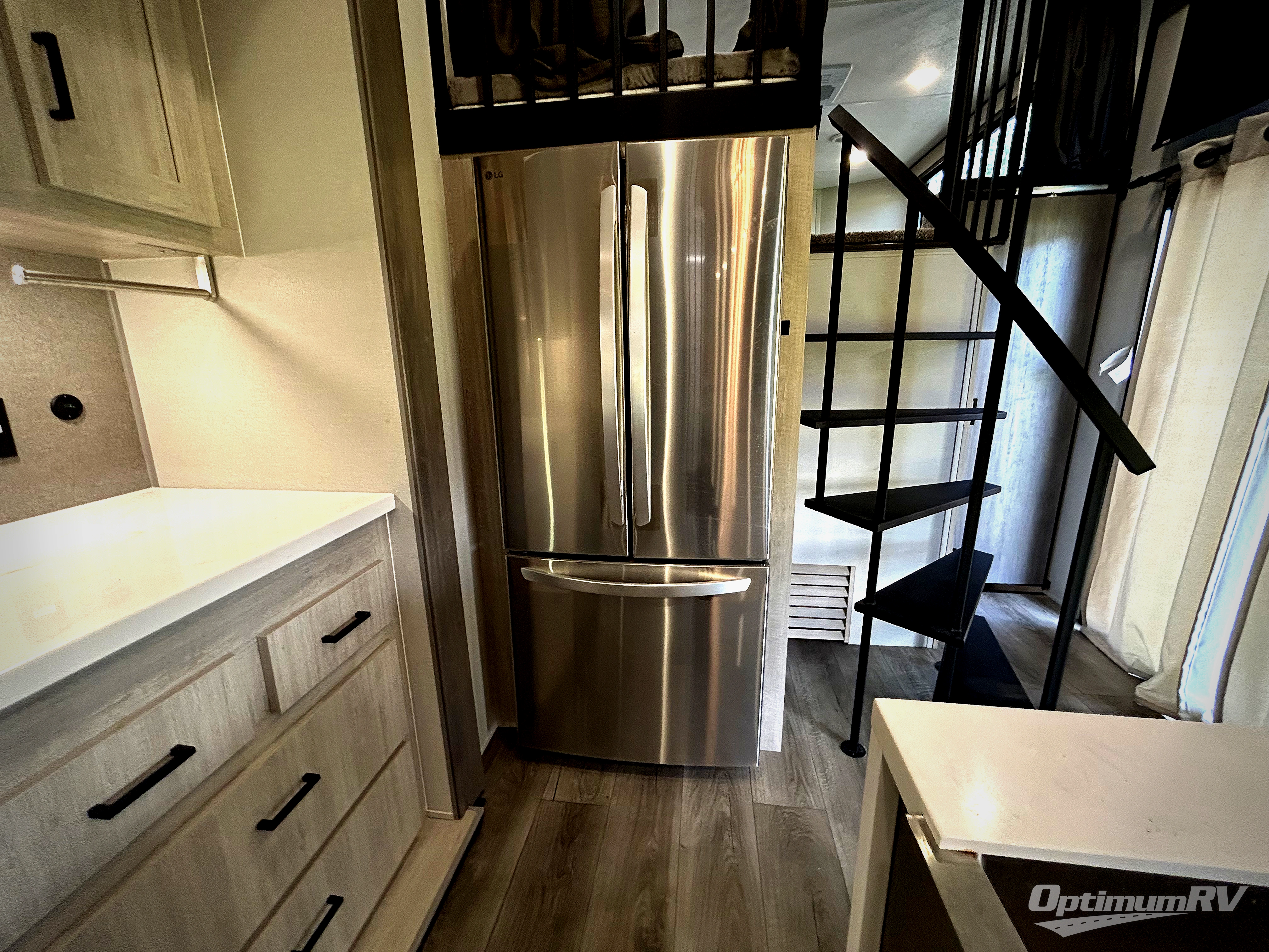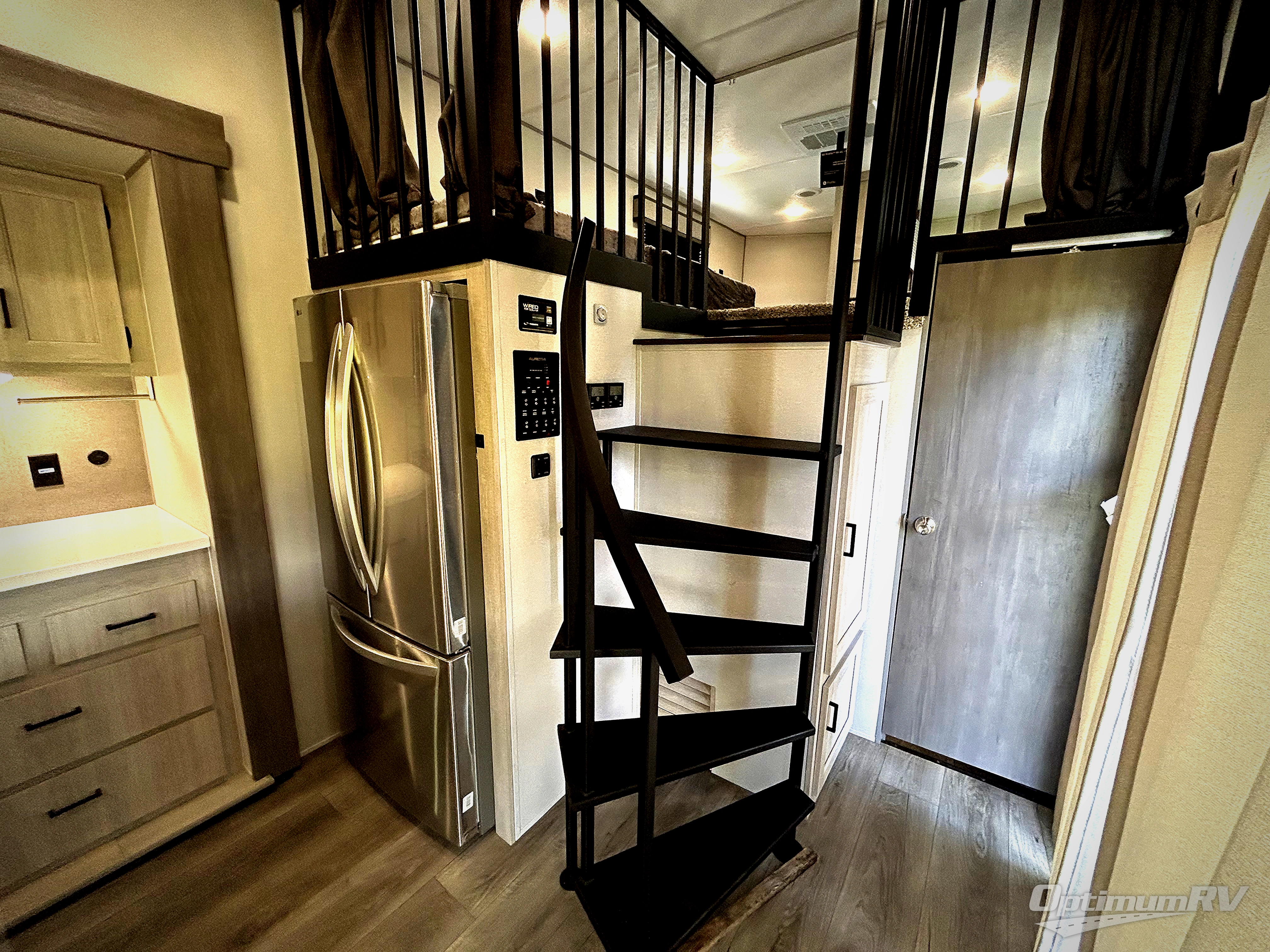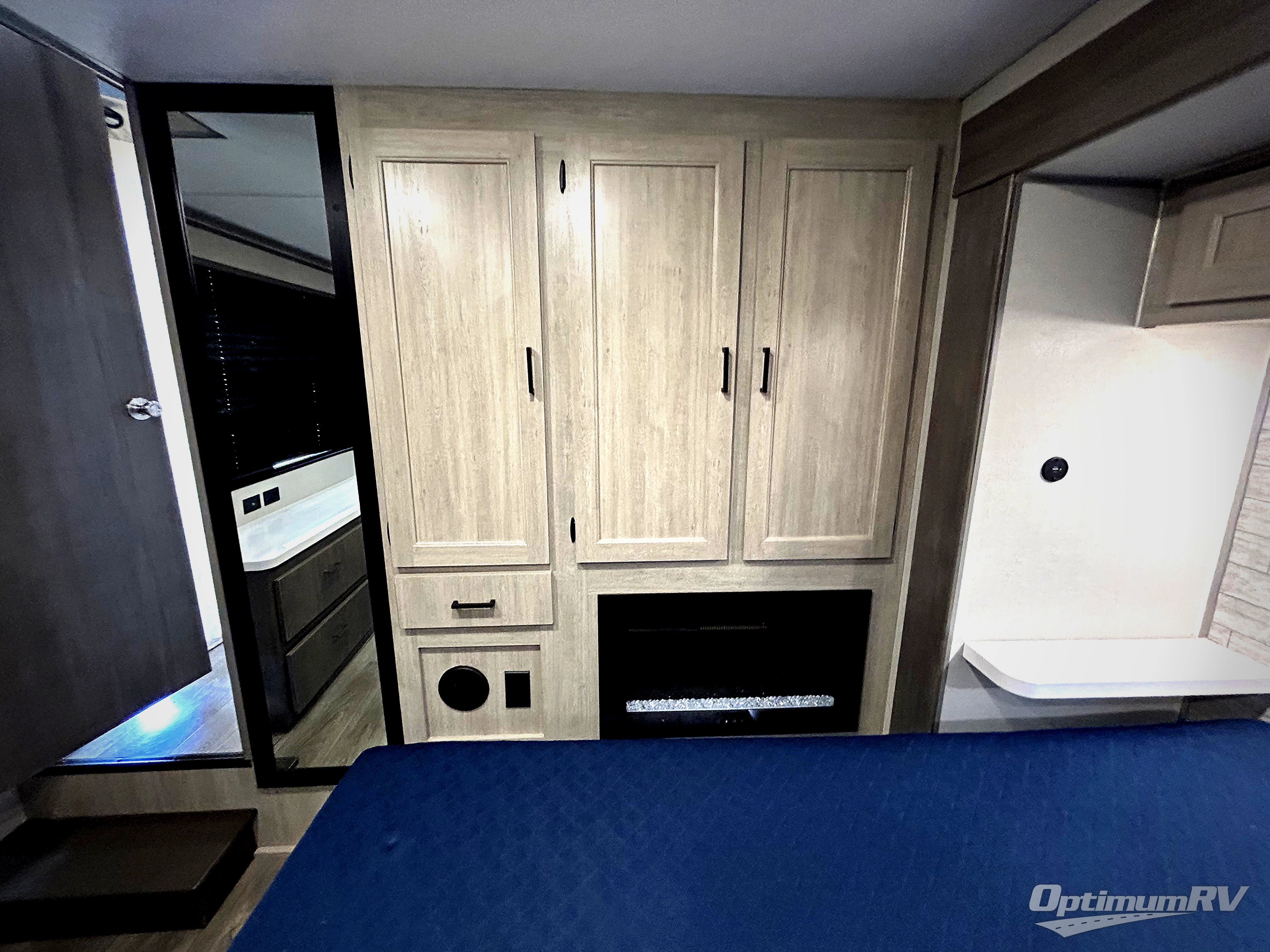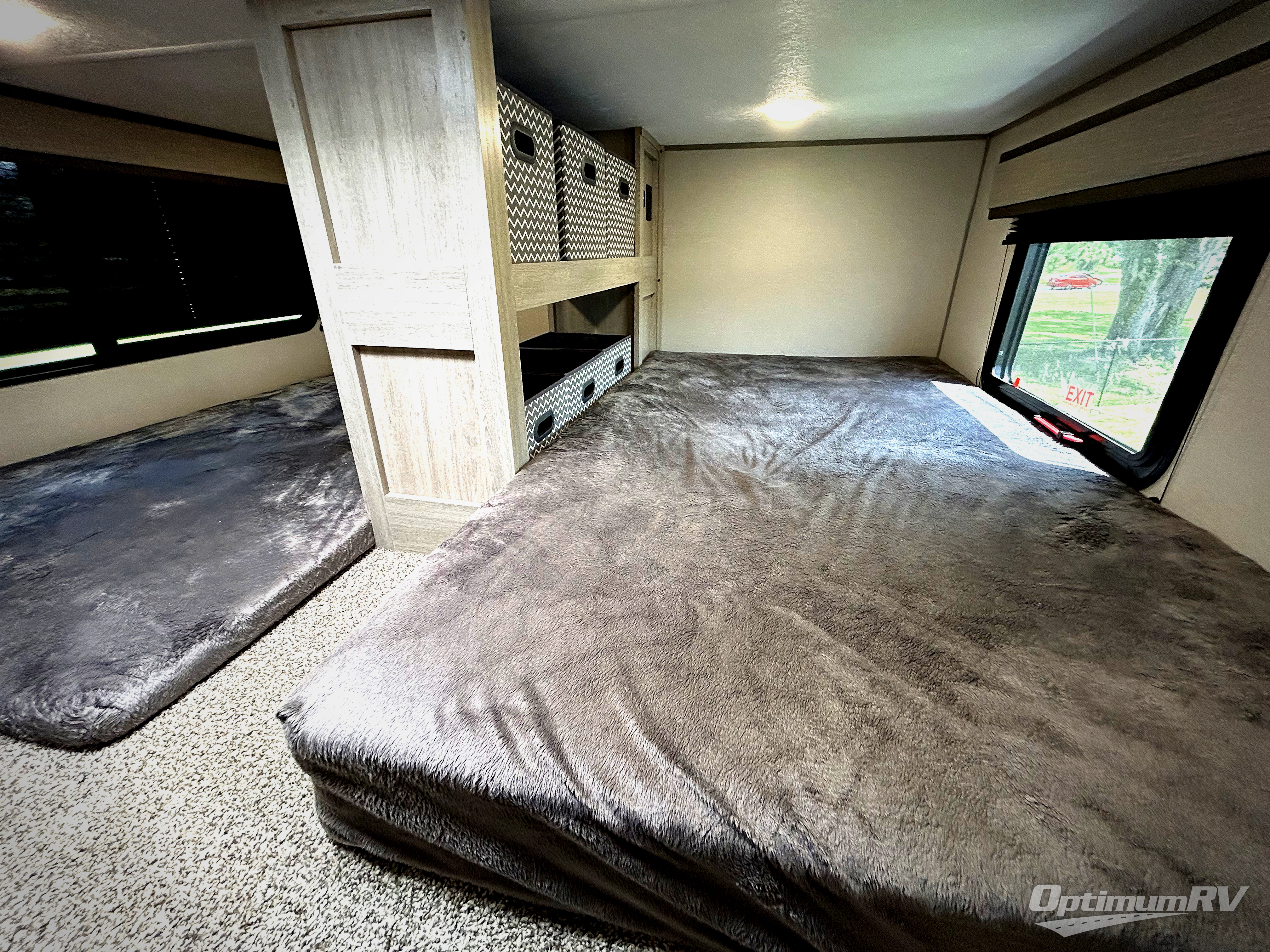 You won't believe the amount of comfort found throughout this destination trailer! The front private bedroom will provide you with your own space each night, and here you'll enjoy the RV queen bed slide out, wardrobe closets and a dresser, plus a bedroom fireplace for more comfort. The main living area is made spacious thanks to the large slide out, and the kitchen island with five bar stools will be the perfect place to dine together each day. There is also a hide-a-bed sectional sofa everyone is sure to enjoy relaxing on, and the power lift TV means you can make it a movie night! A spacious full rear bath includes a 48" x 30" shower with a seat and glass shower door and plenty of storage space to keep clean towels and bath necessities stocked. The feature you will really love on this trailer has to be the double loft areas, complete with five bunk mats in total and storage space for your guests' things; how convenient!