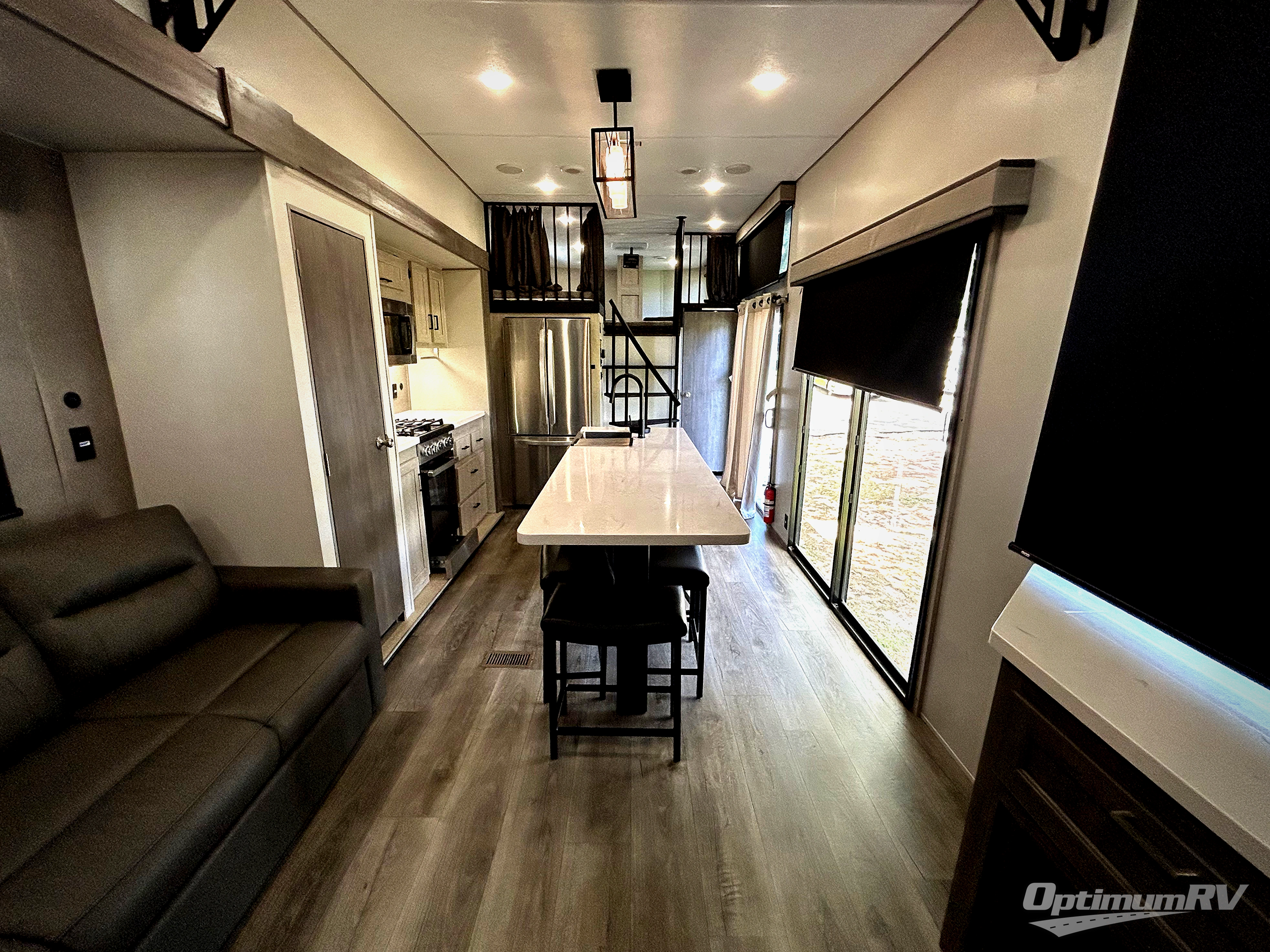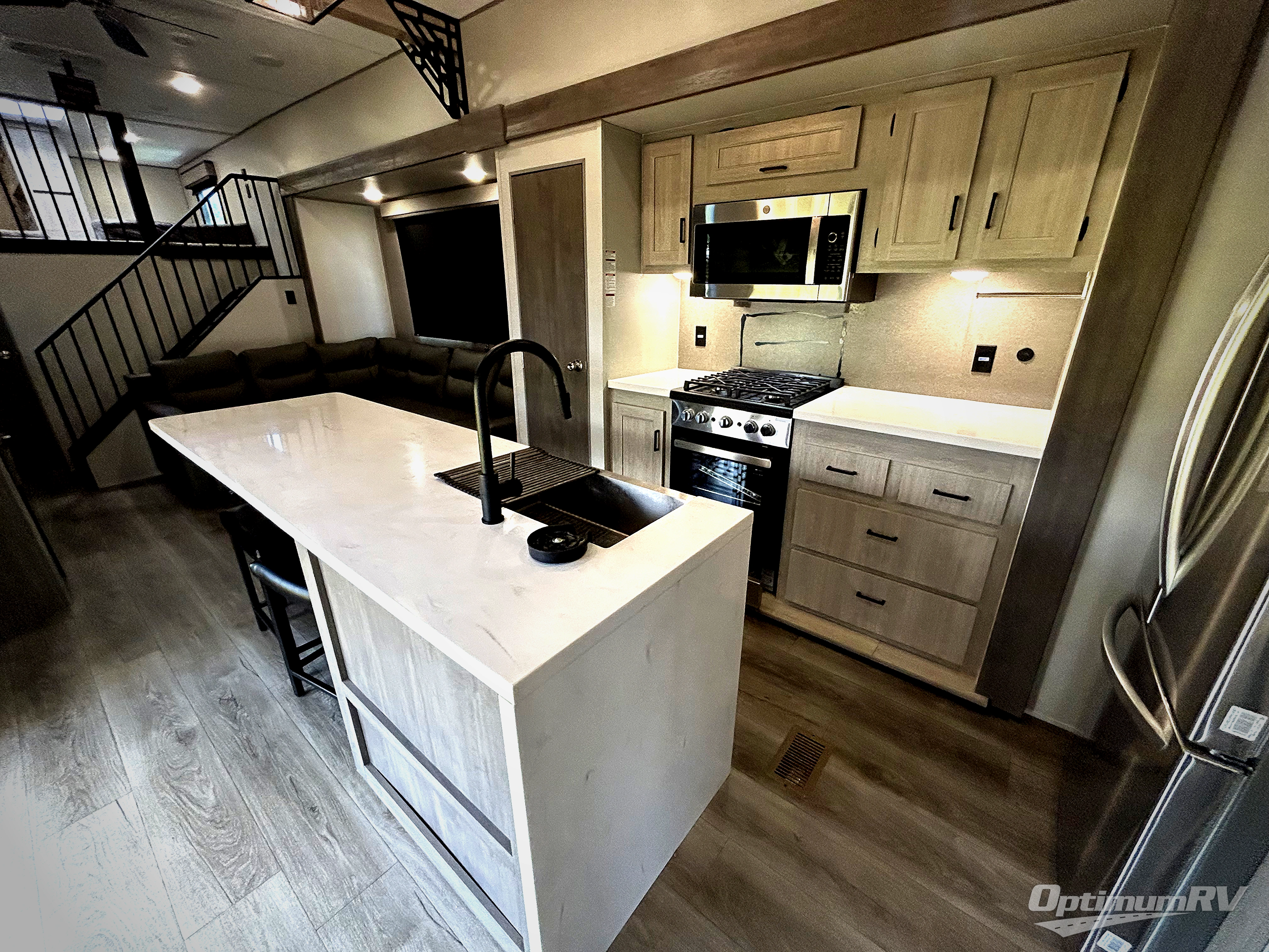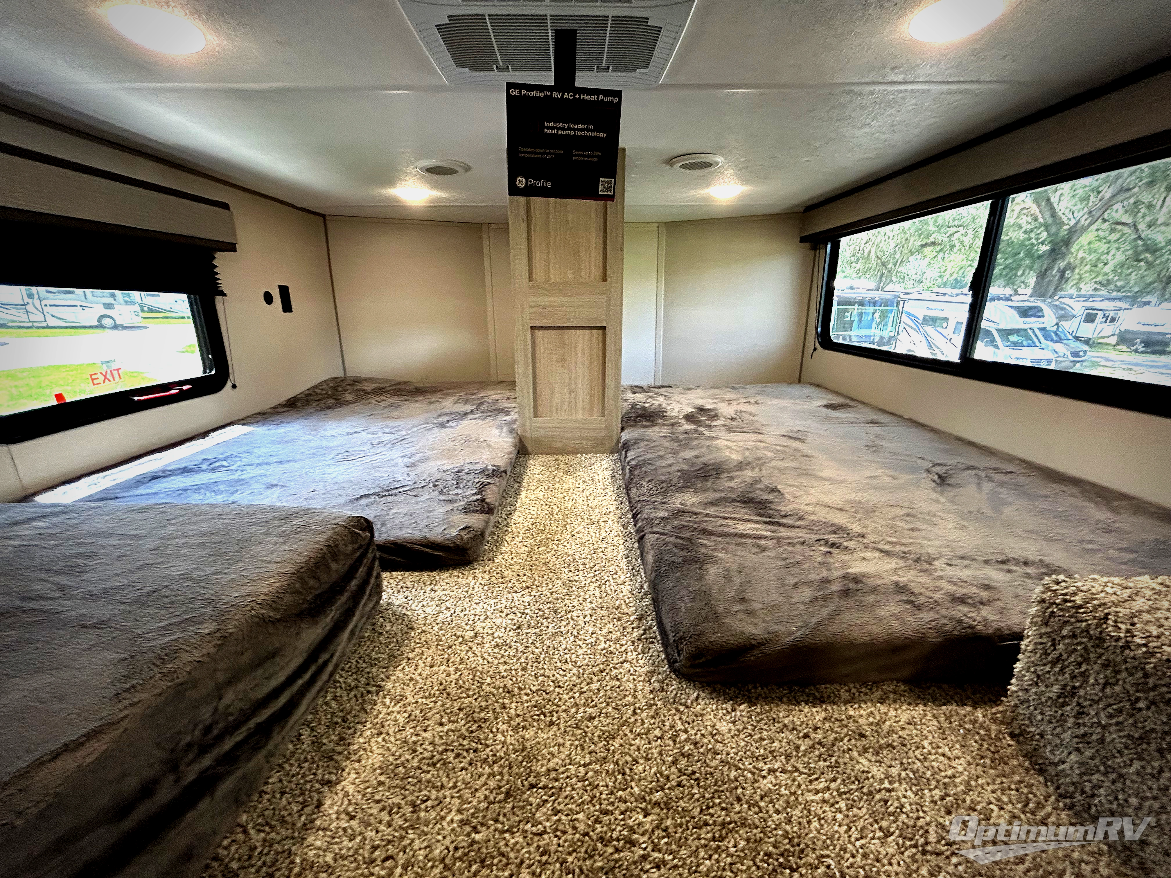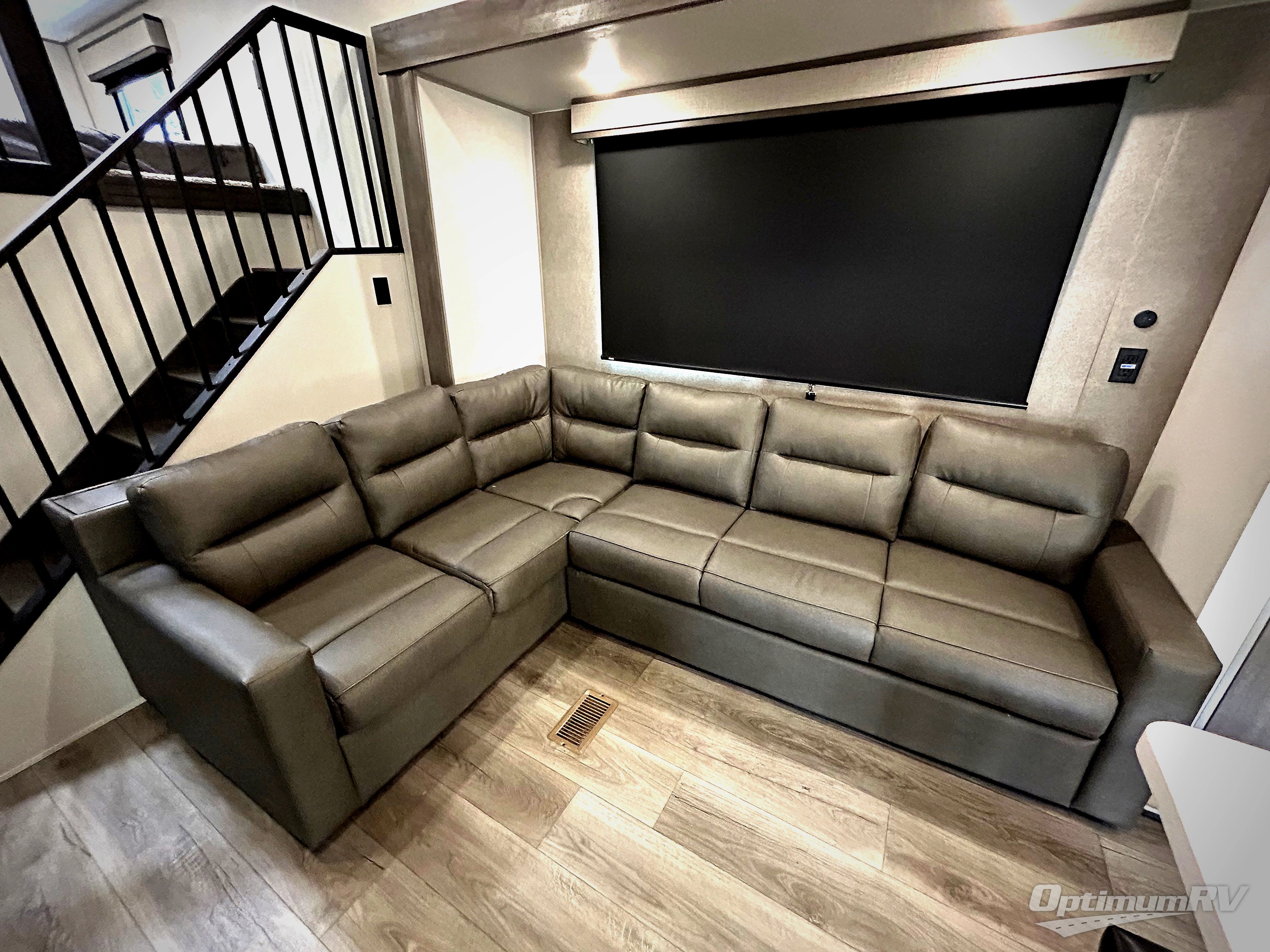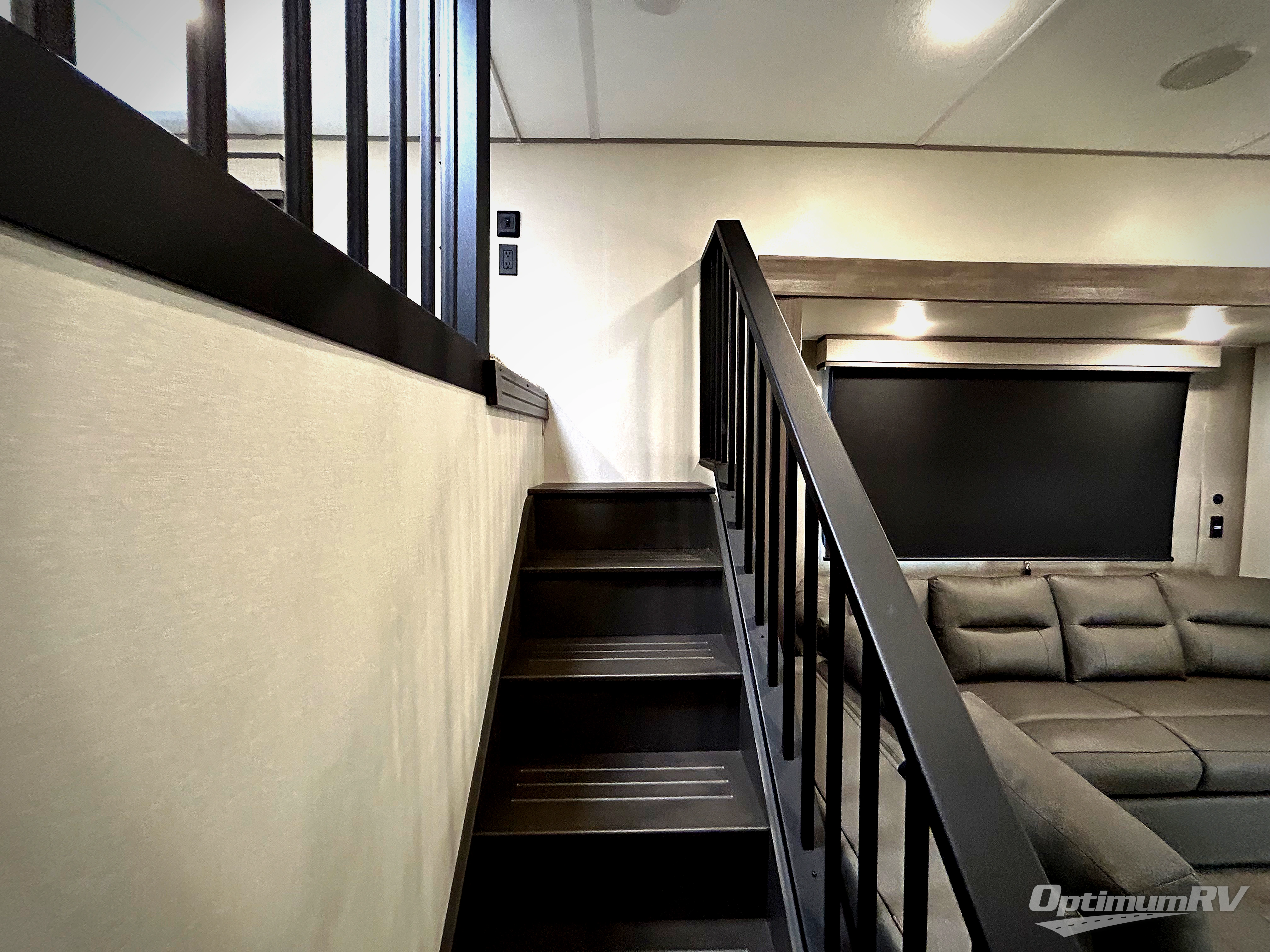 You won't believe the amount of comfort found throughout this destination trailer! The front private bedroom will provide you with your own space each night, and here you'll enjoy the RV queen bed slide out, wardrobe closets and a dresser, plus a bedroom fireplace for more comfort. The main living area is made spacious thanks to the large slide out, and the kitchen island with five bar stools will be the perfect place to dine together each day. There is also a hide-a-bed sectional sofa everyone is sure to enjoy relaxing on, and the power lift TV means you can make it a movie night! A spacious full rear bath includes a 48" x 30" shower with a seat and glass shower door and plenty of storage space to keep clean towels and bath necessities stocked. The feature you will really love on this trailer has to be the double loft areas, complete with five bunk mats in total and storage space for your guests' things; how convenient!