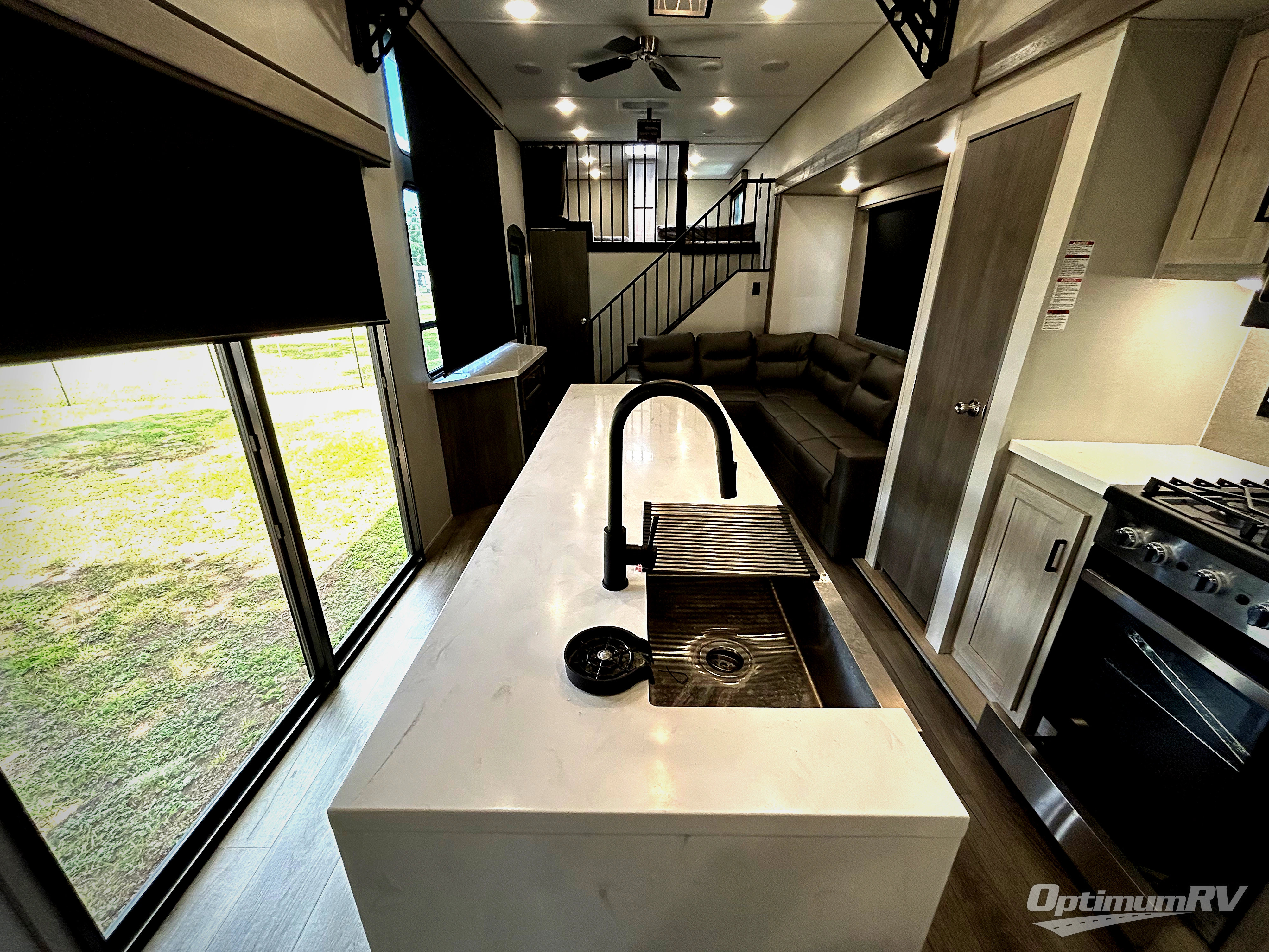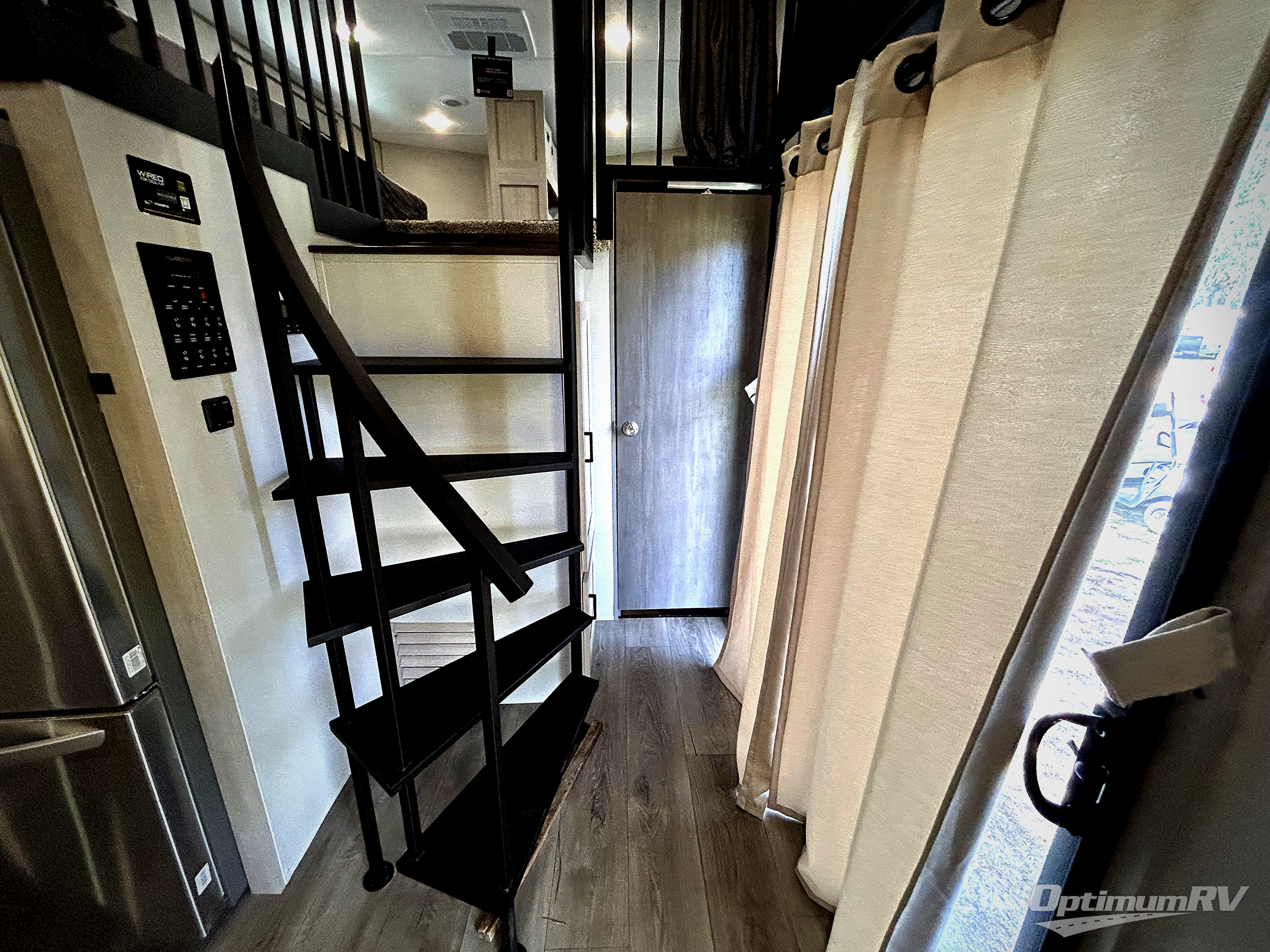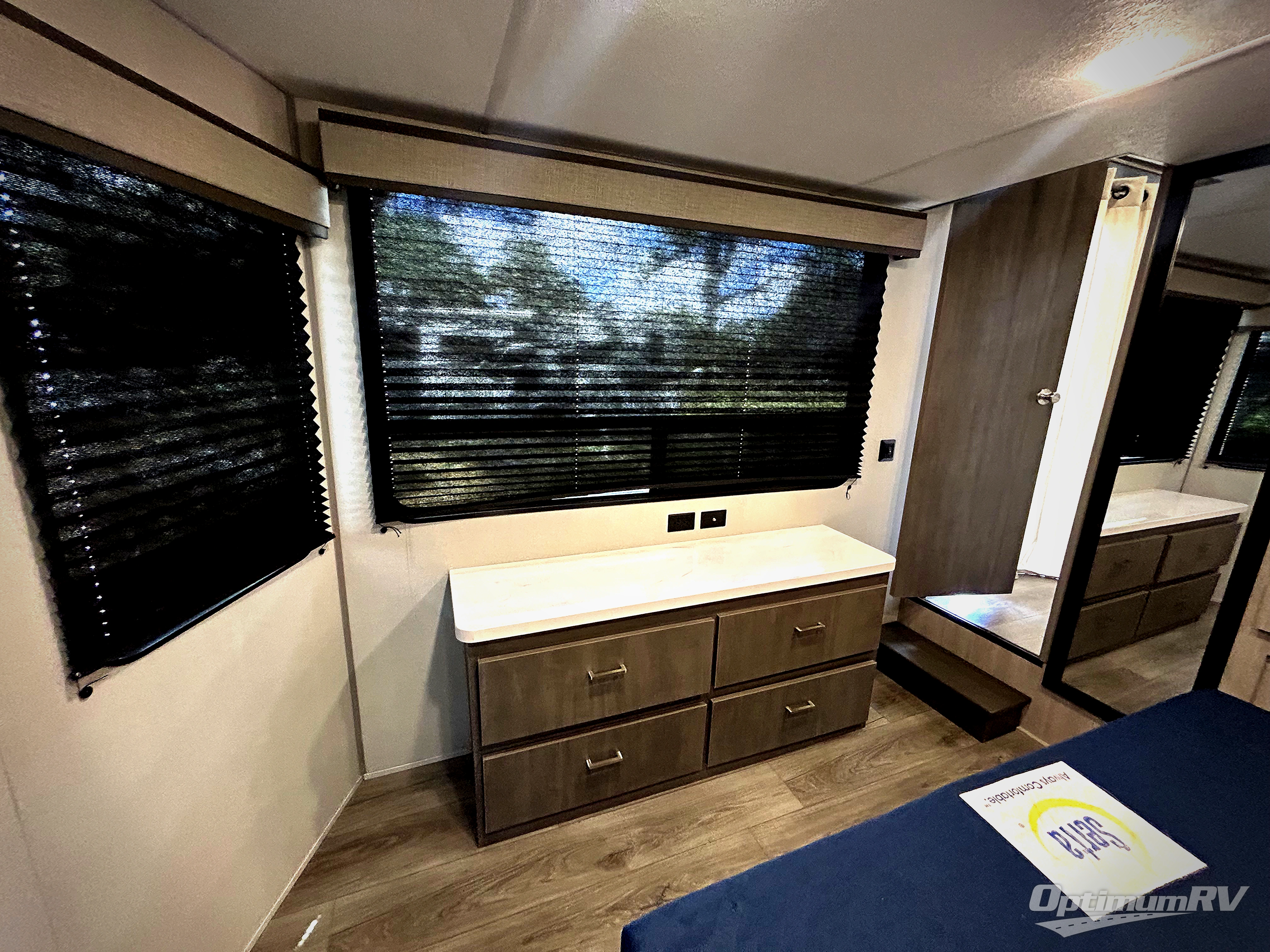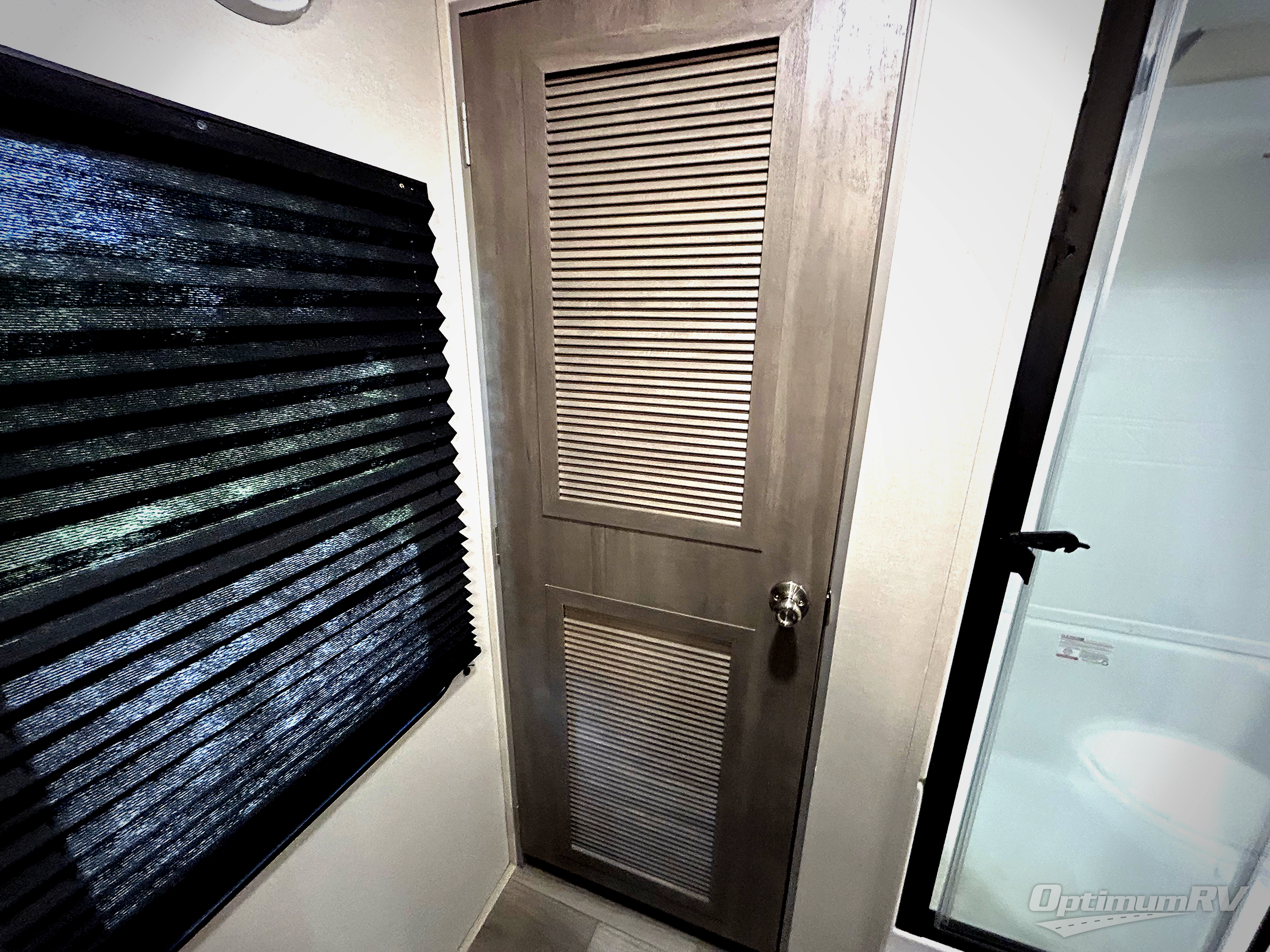 You won't believe the amount of comfort found throughout this destination trailer! The front private bedroom will provide you with your own space each night, and here you'll enjoy the RV queen bed slide out, wardrobe closets and a dresser, plus a bedroom fireplace for more comfort. The main living area is made spacious thanks to the large slide out, and the kitchen island with five bar stools will be the perfect place to dine together each day. There is also a hide-a-bed sectional sofa everyone is sure to enjoy relaxing on, and the power lift TV means you can make it a movie night! A spacious full rear bath includes a 48" x 30" shower with a seat and glass shower door and plenty of storage space to keep clean towels and bath necessities stocked. The feature you will really love on this trailer has to be the double loft areas, complete with five bunk mats in total and storage space for your guests' things; how convenient!