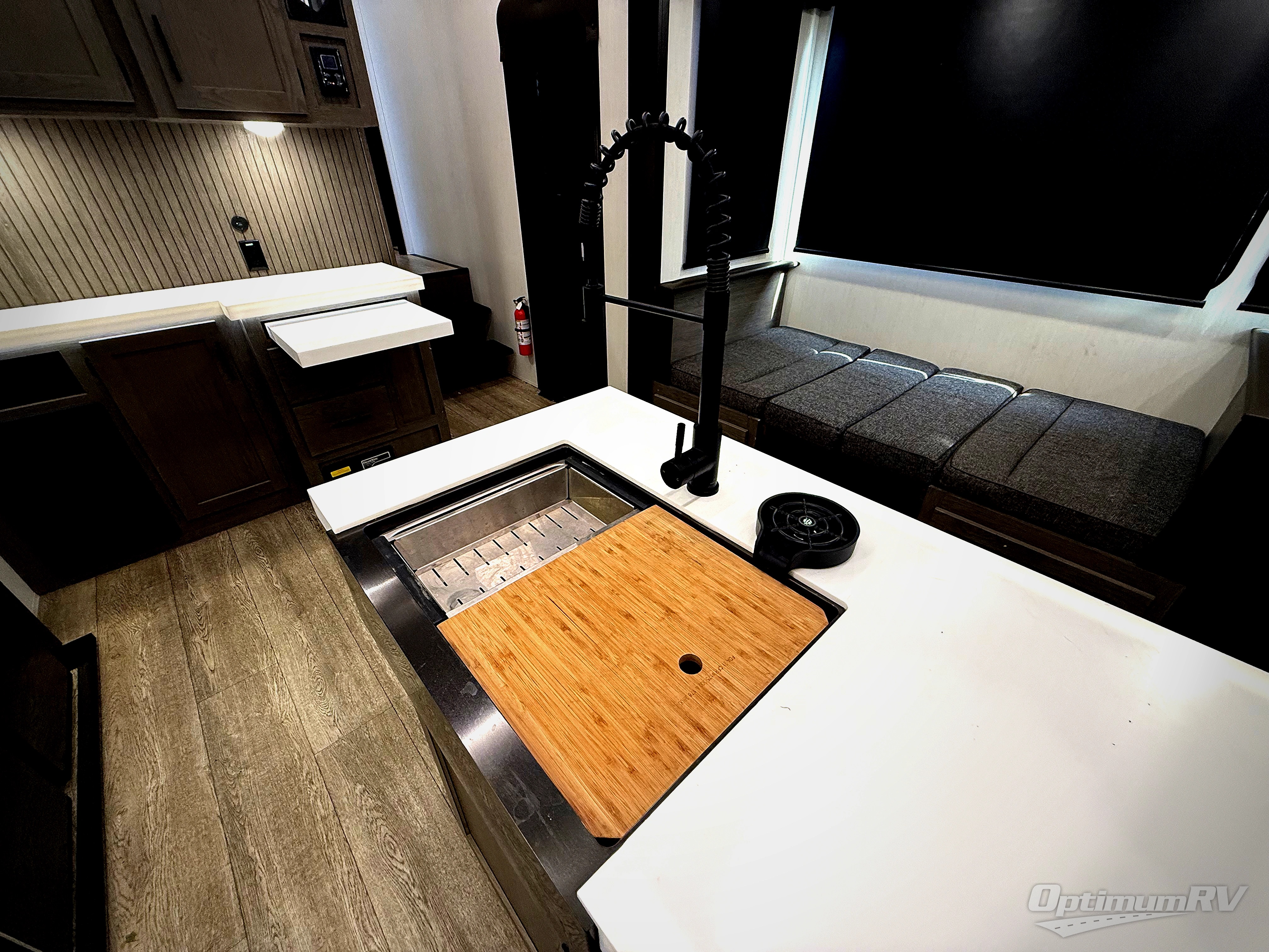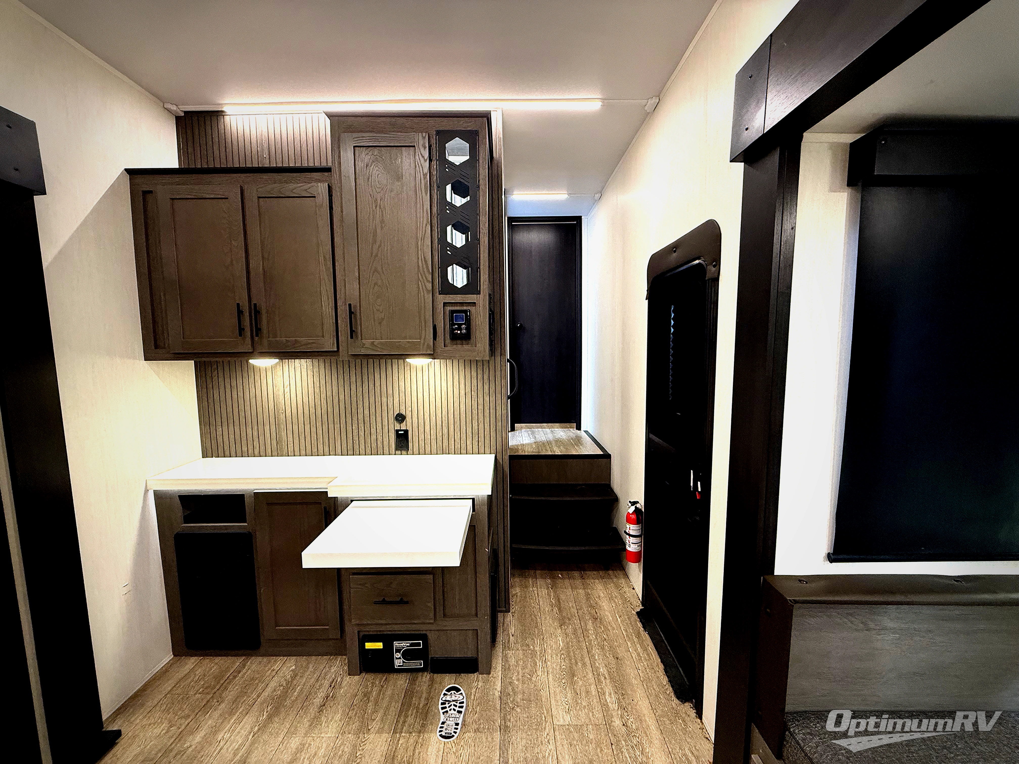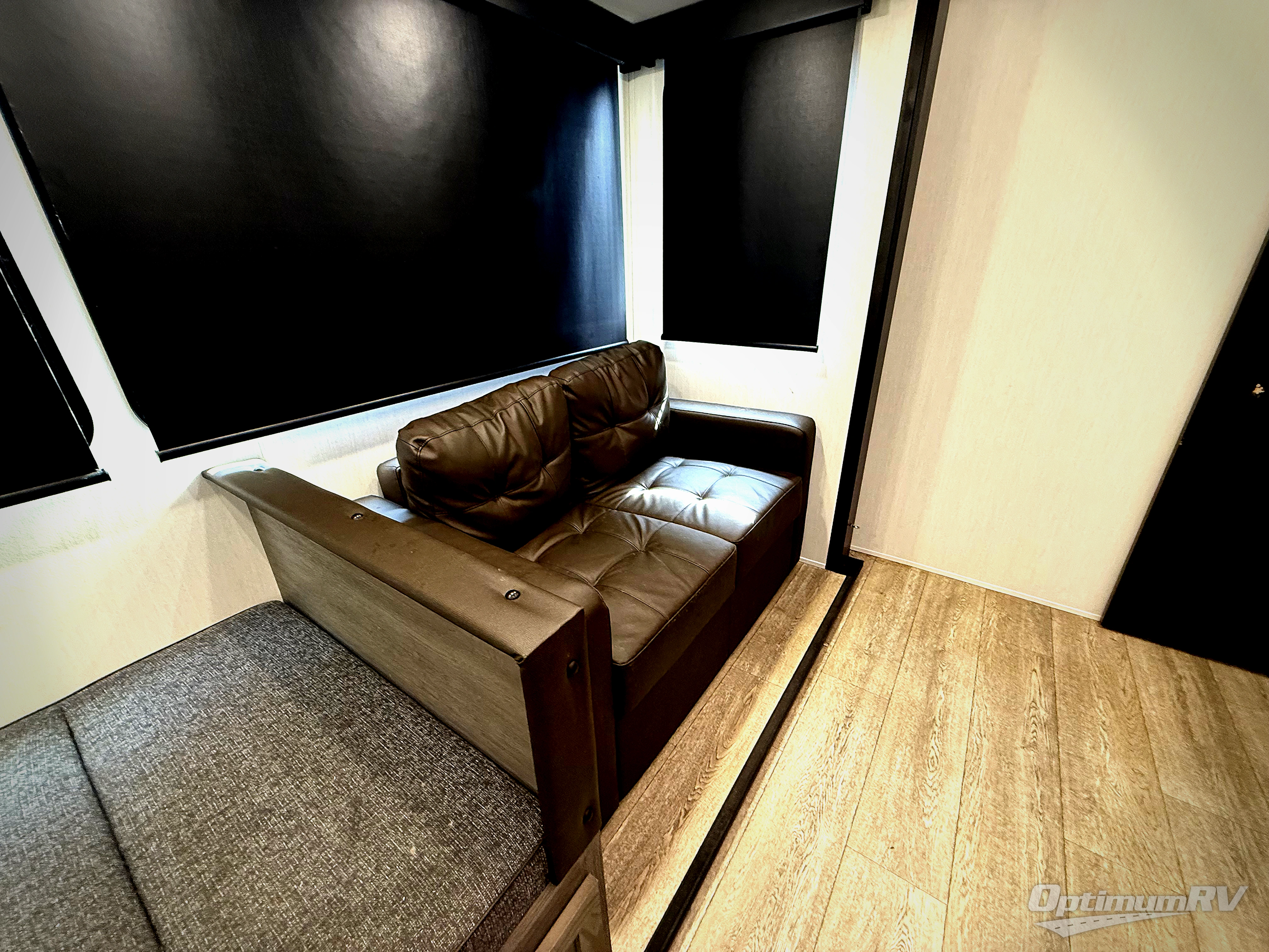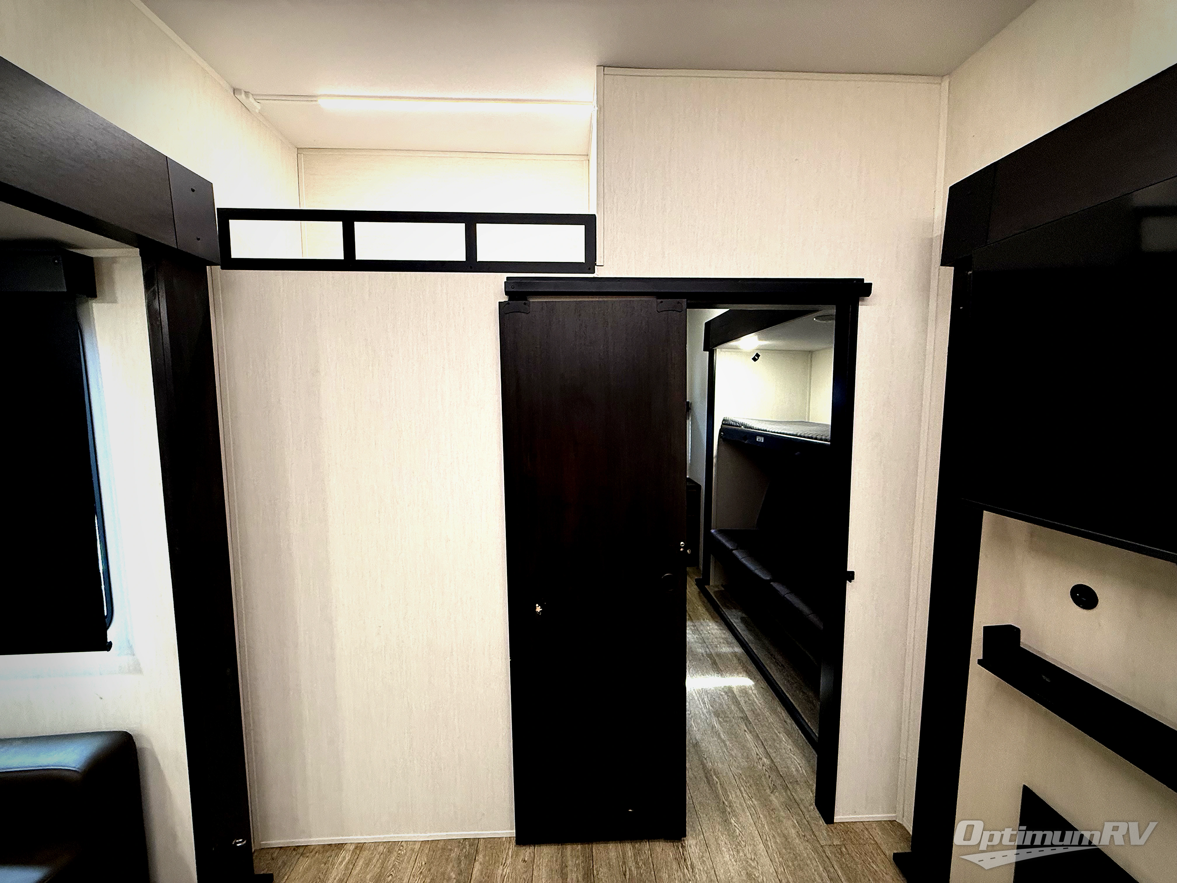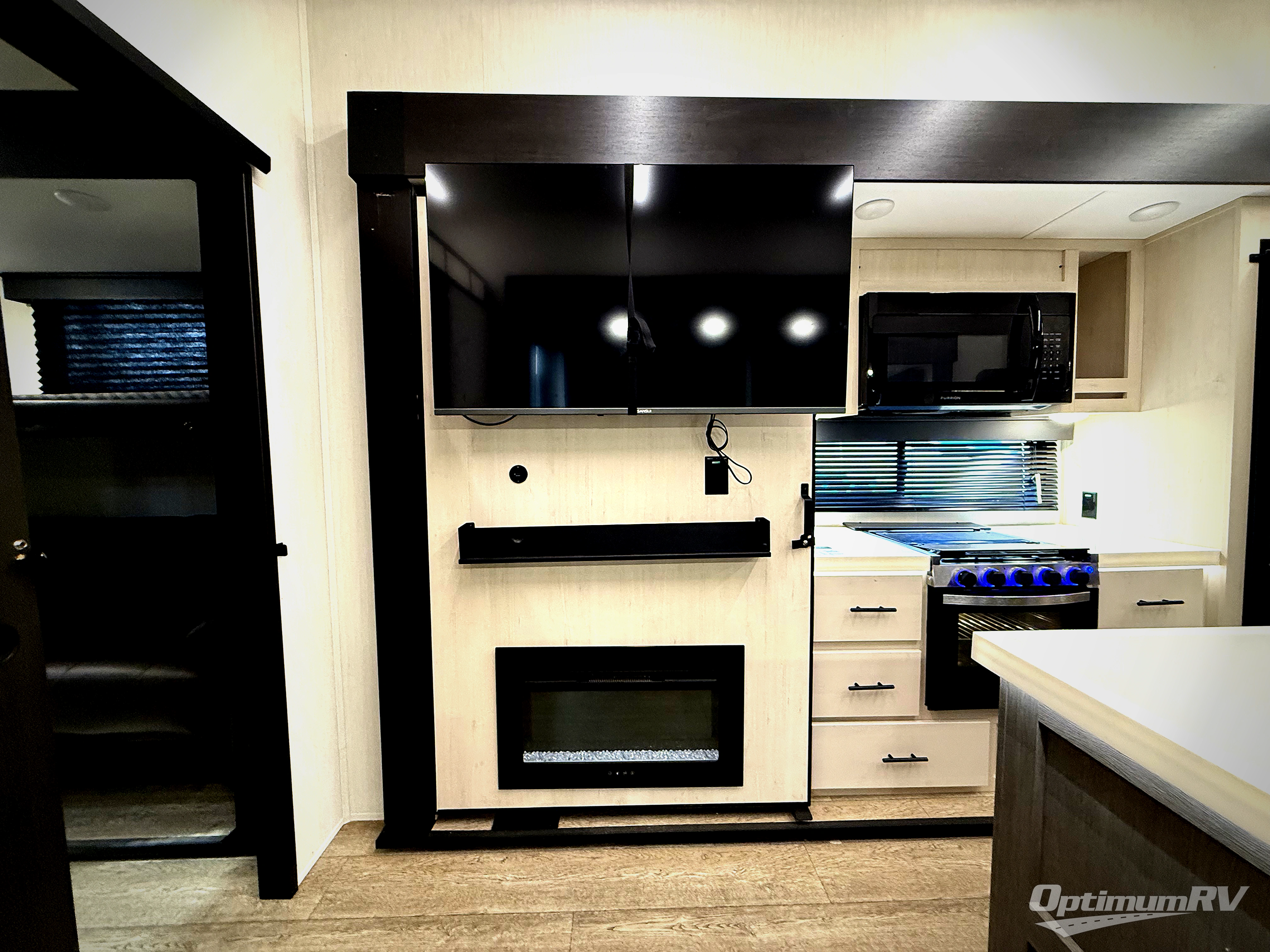 You can't beat this dual entry fifth wheel packed with luxury amenities! Your guests will love the rear private bunkhouse which maximizes sleeping capacity with a 28" x 72" bunk, 54" x 74" bunk, and jack knife sofa with a trundle! This room also has its own full bath with an exterior entry door for ultimate convenience. Up front you will find a luxurious master bedroom, with a king bed slide, fireplace, wardrobe with a sun bench, and washer/dryer prep. The full bath here features a radius shower and plenty of storage. The main kitchen and living area includes dual opposing slides, a tri-fold sofa across from the fireplace, and a dinette. The kitchen includes a 16 cu. ft. 12V residential refrigerator, a hutch, and a pantry for storage as well. Head outdoors to enjoy the exterior griddle and two exterior awnings, plus the pass-through storage!