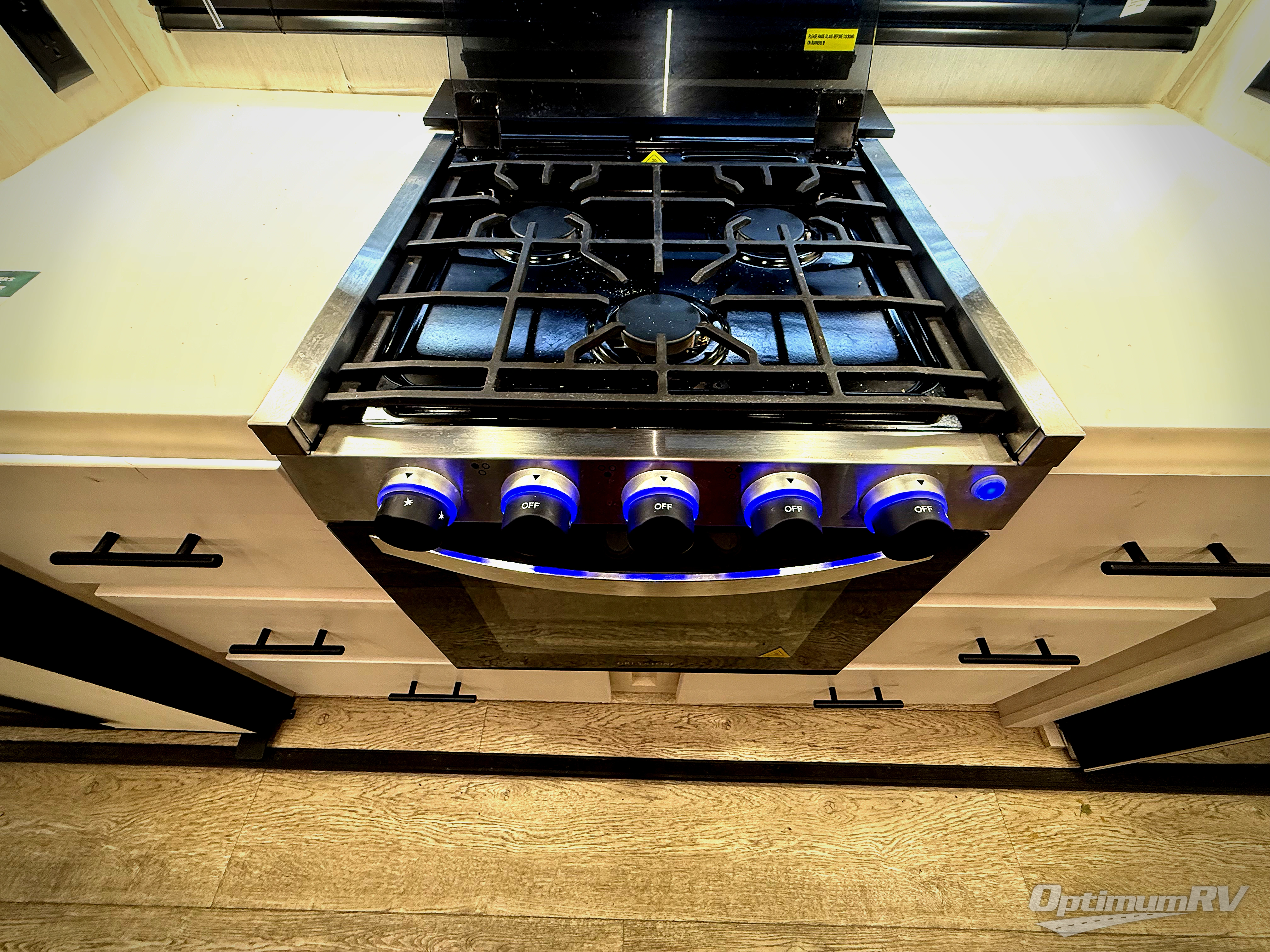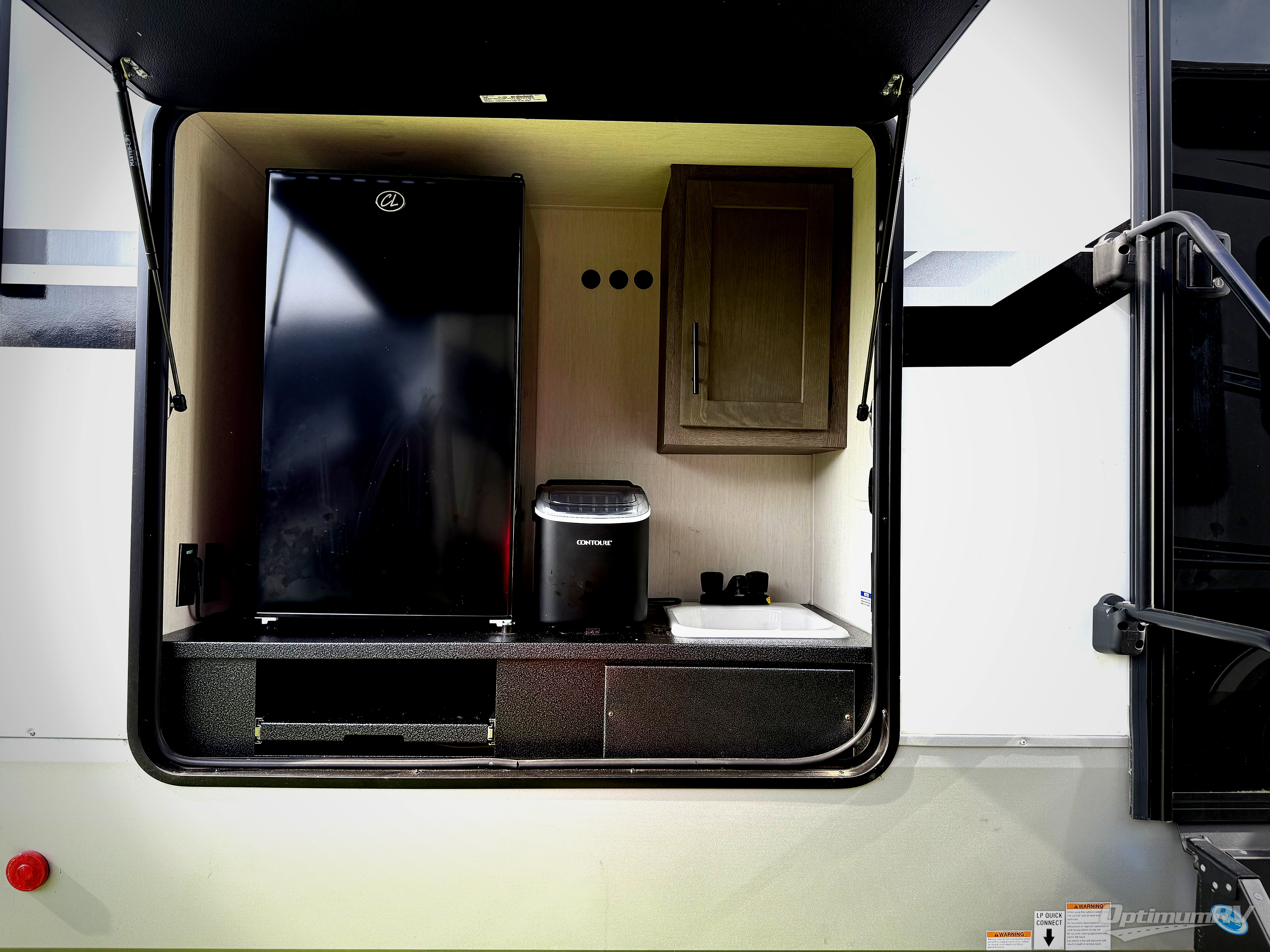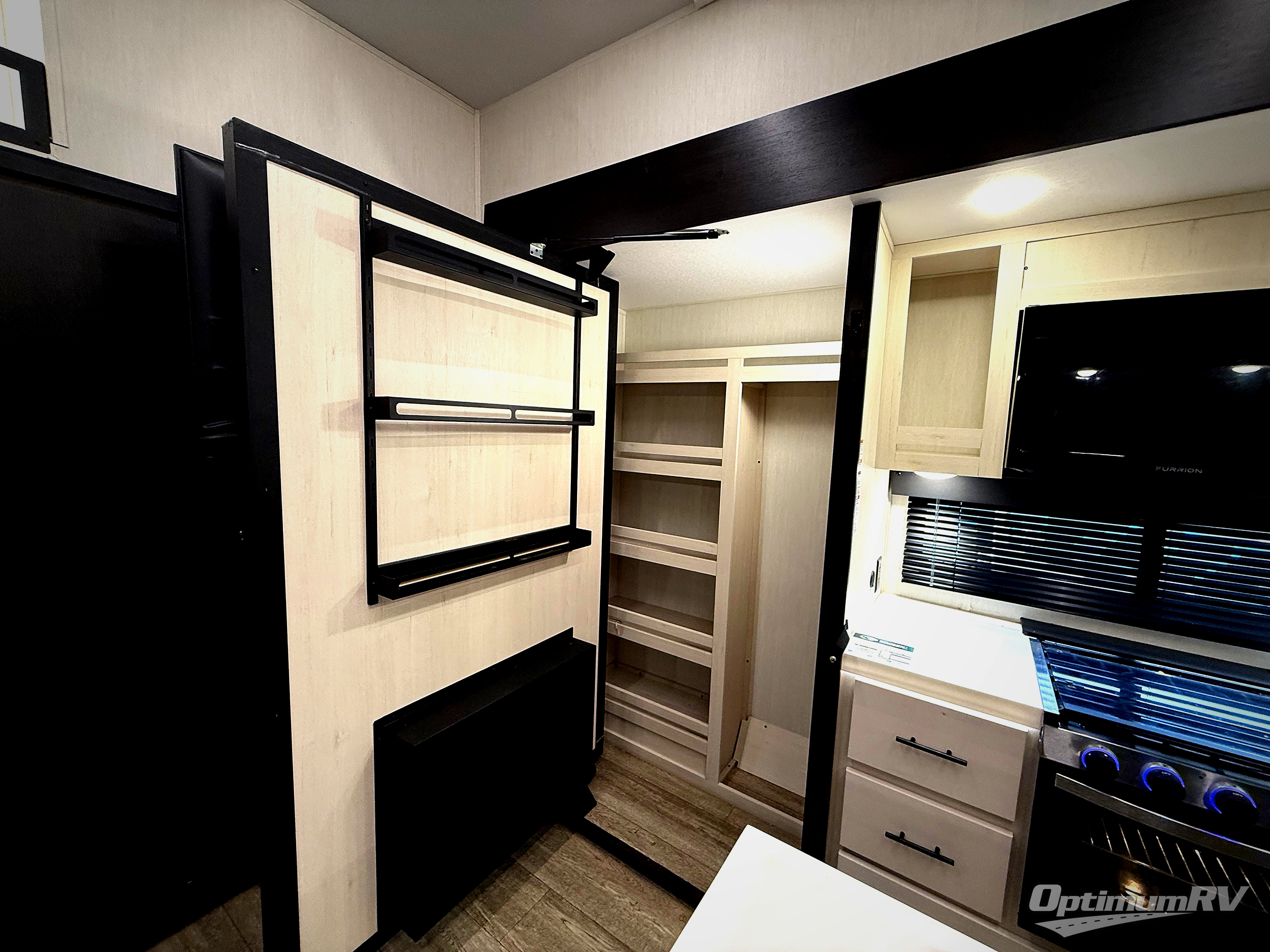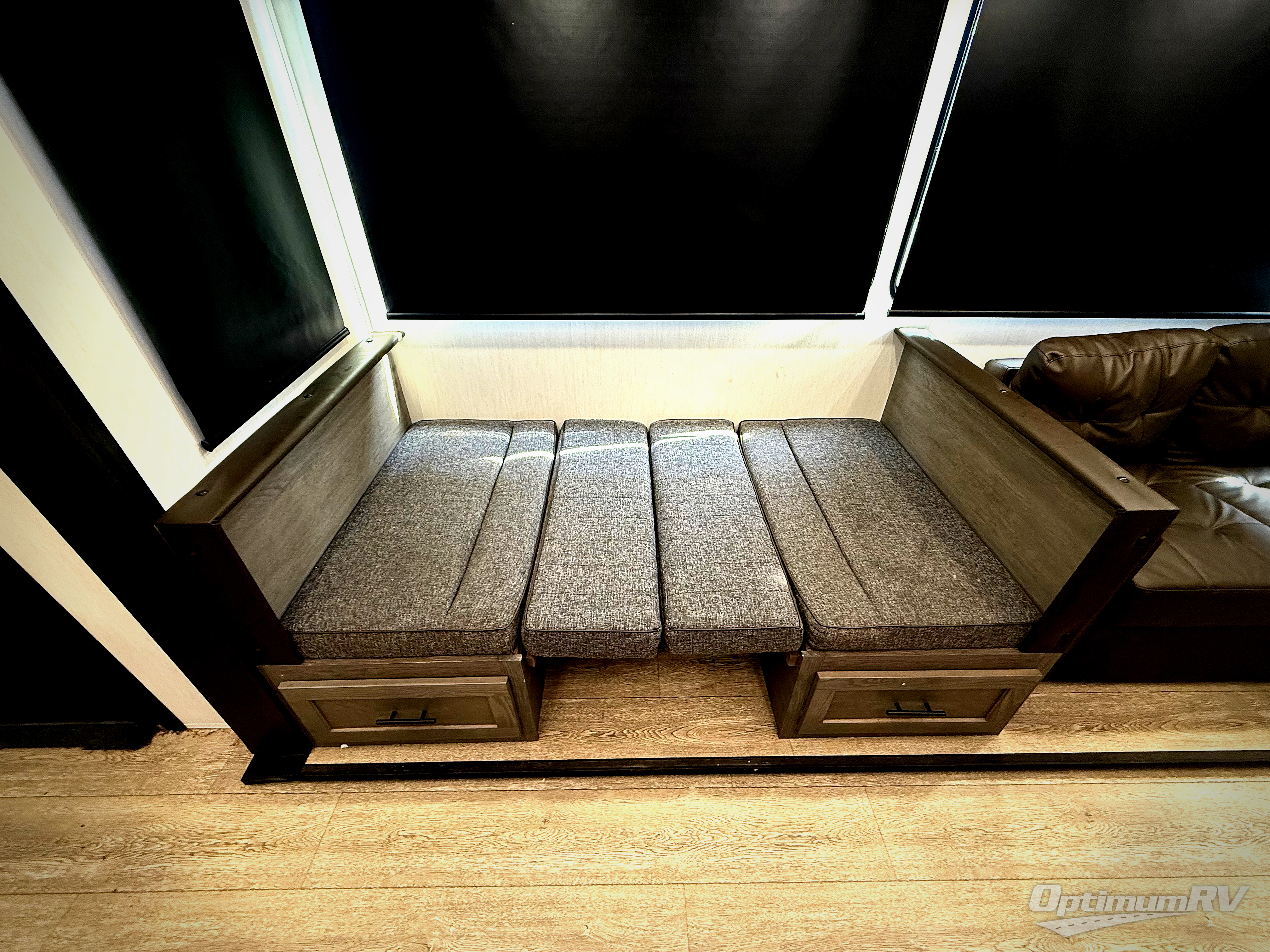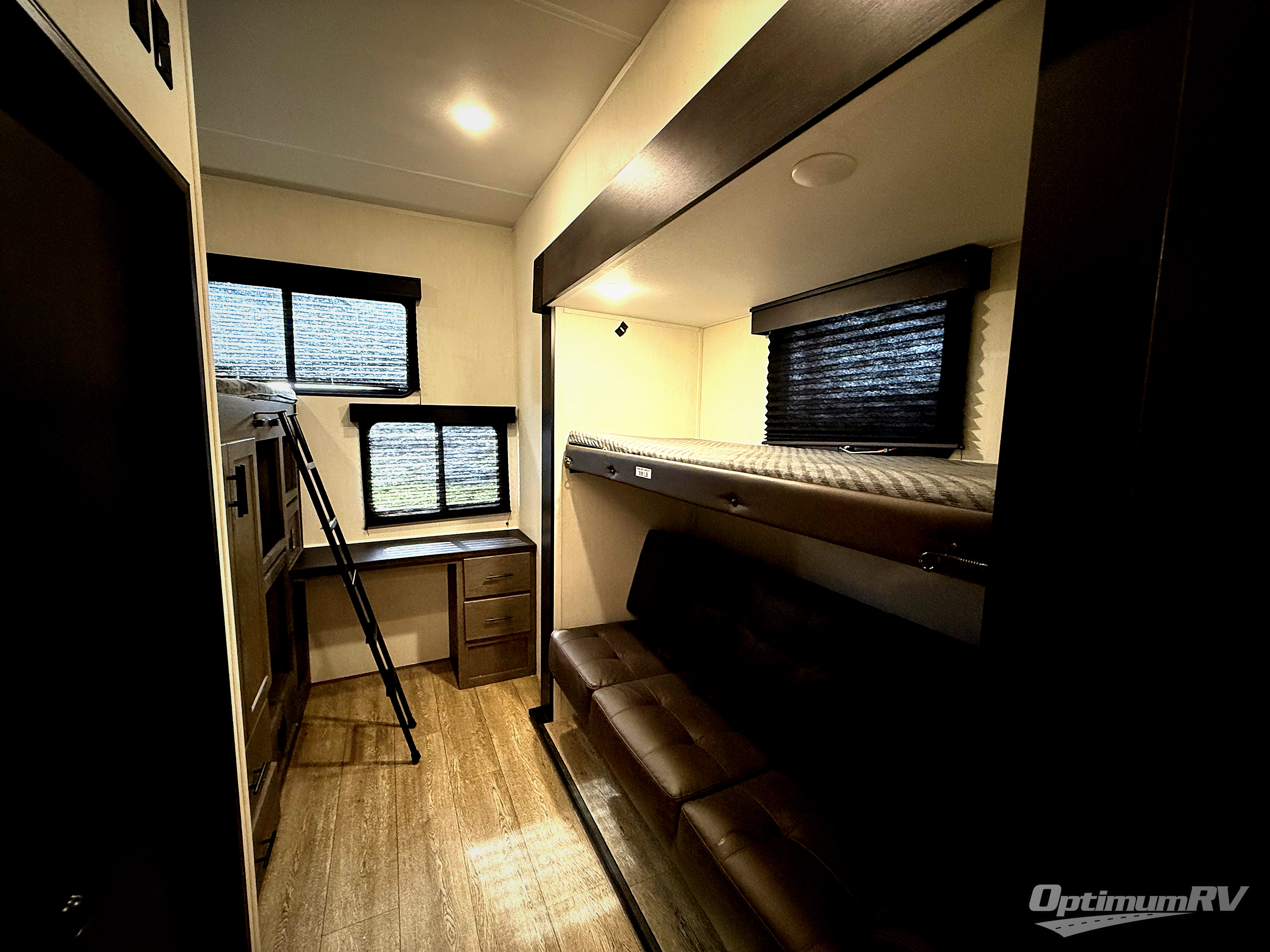 You can't beat this dual entry fifth wheel packed with luxury amenities! Your guests will love the rear private bunkhouse which maximizes sleeping capacity with a 28" x 72" bunk, 54" x 74" bunk, and jack knife sofa with a trundle! This room also has its own full bath with an exterior entry door for ultimate convenience. Up front you will find a luxurious master bedroom, with a king bed slide, fireplace, wardrobe with a sun bench, and washer/dryer prep. The full bath here features a radius shower and plenty of storage. The main kitchen and living area includes dual opposing slides, a tri-fold sofa across from the fireplace, and a dinette. The kitchen includes a 16 cu. ft. 12V residential refrigerator, a hutch, and a pantry for storage as well. Head outdoors to enjoy the exterior griddle and two exterior awnings, plus the pass-through storage!