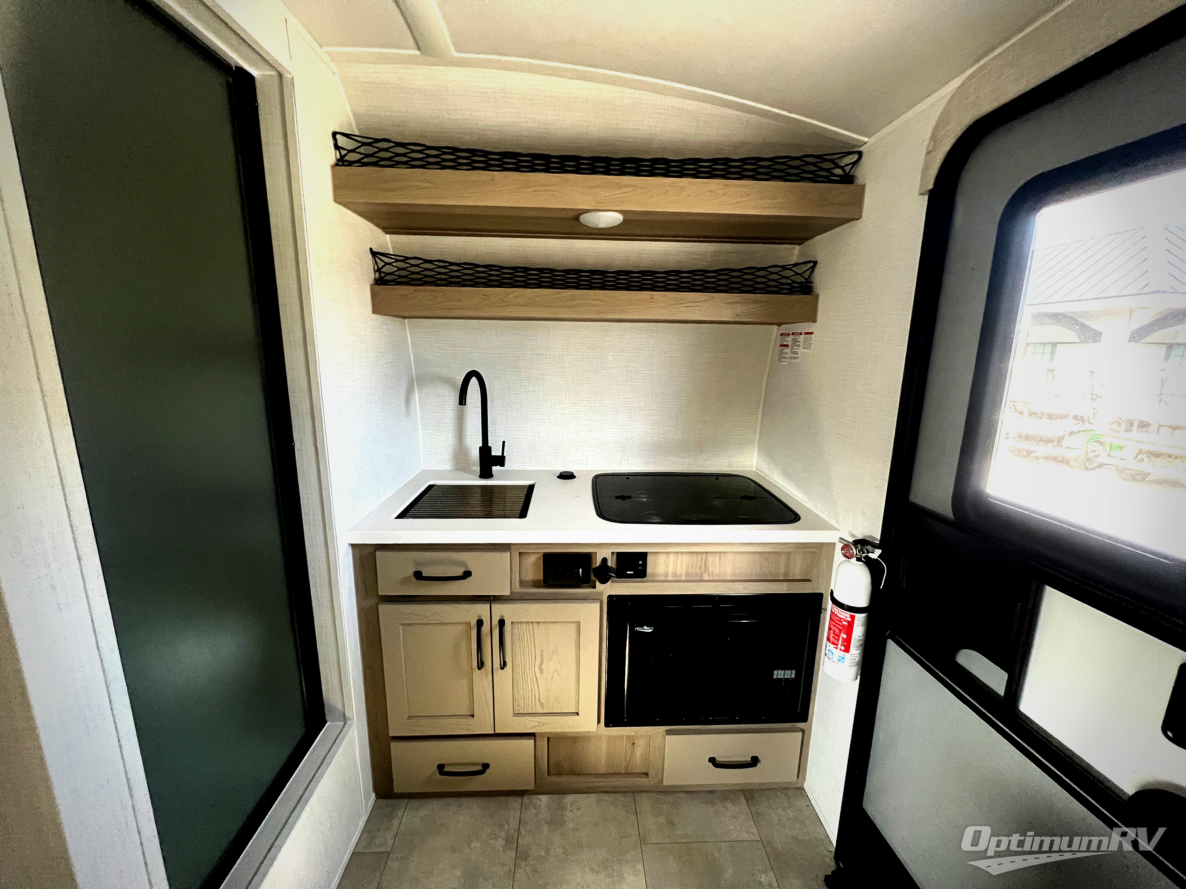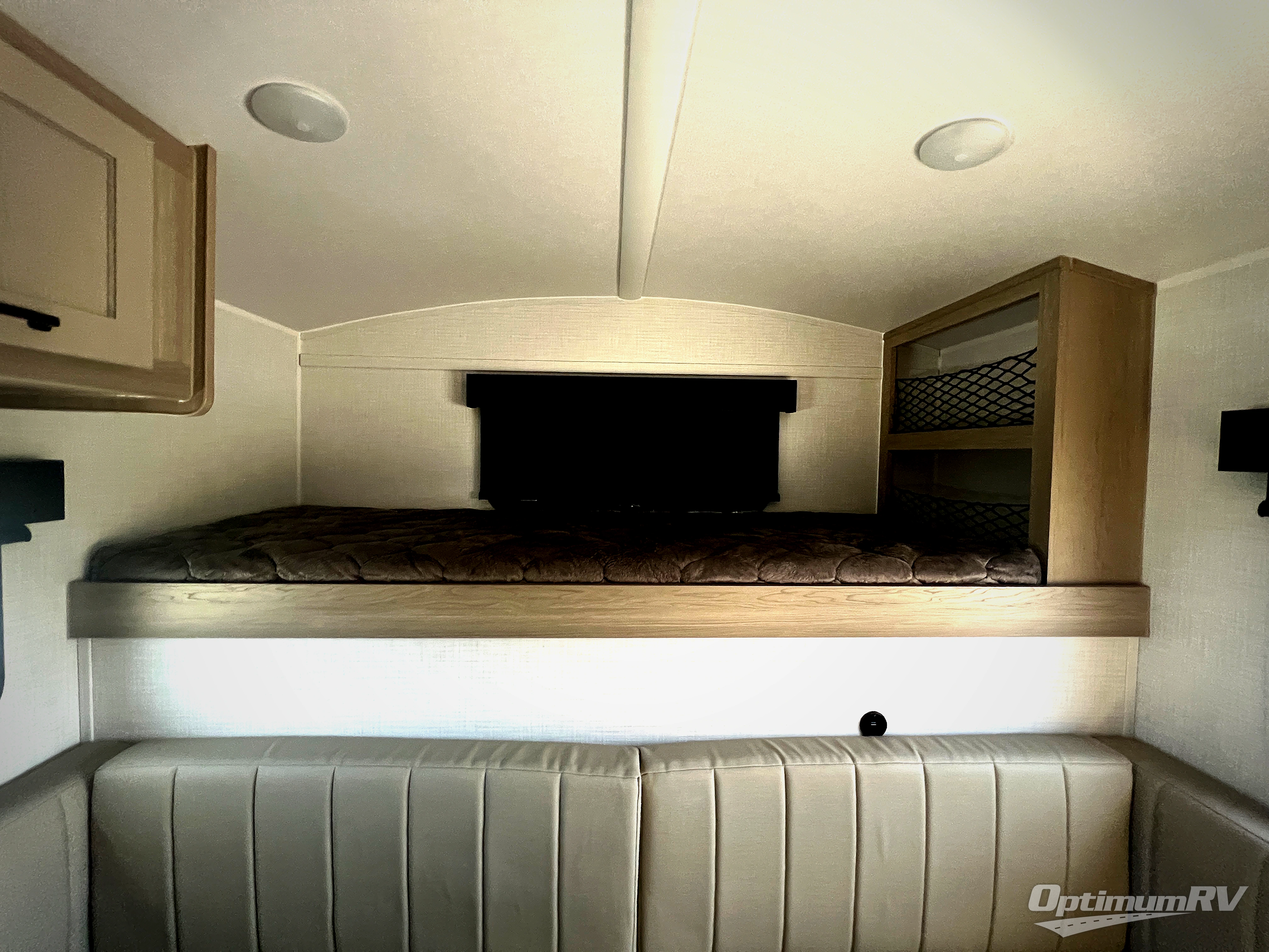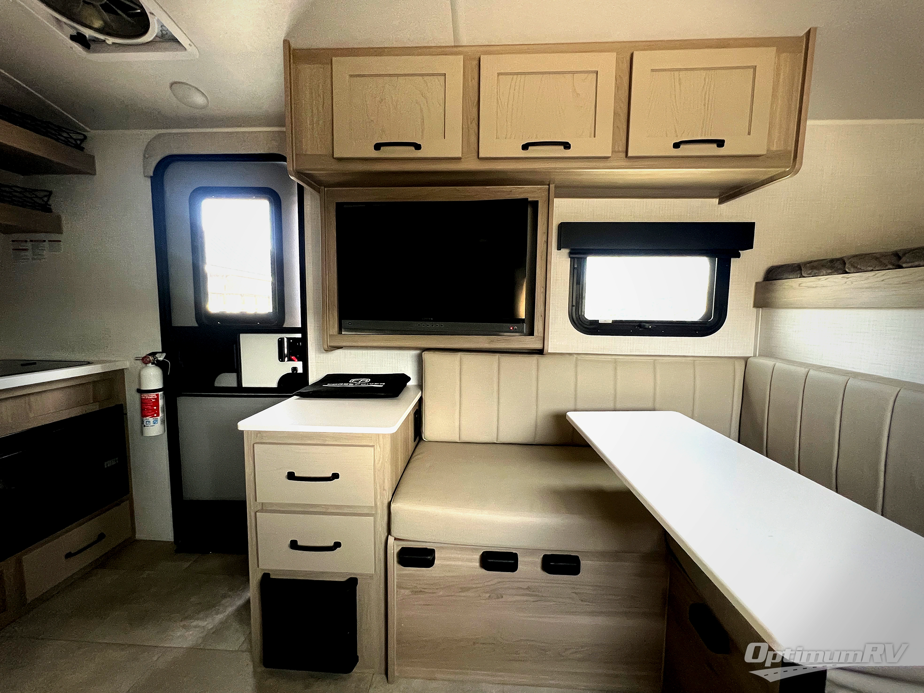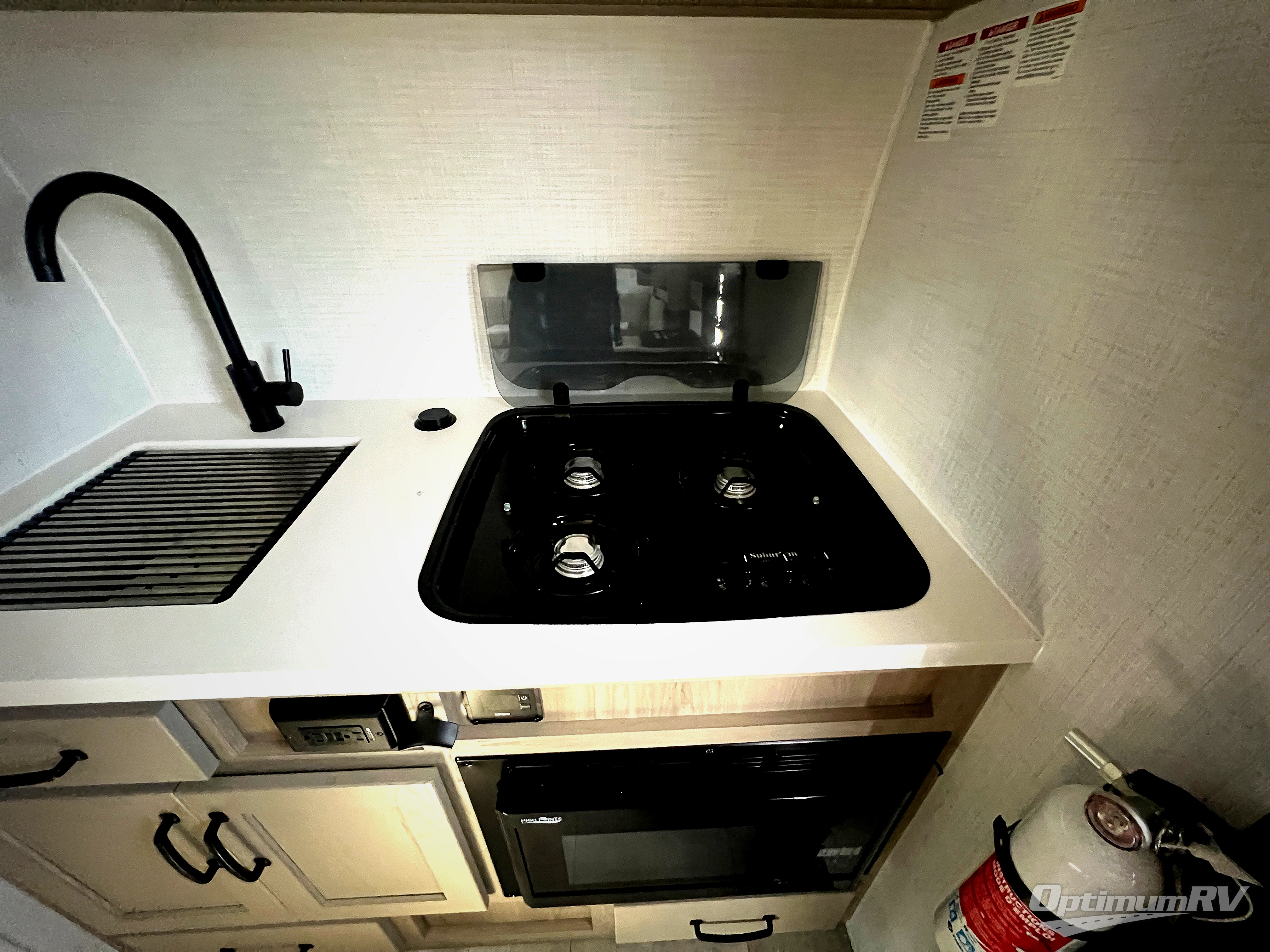 Whether you enjoy weekend trips to the woods or camping long term at the lake, this travel trailer will be perfect for your crew. There is a U-shaped dinette that can convert to sleeping space, plus a 26" x 74" bunk for an additional guest or two. You can prepare meals each day on the recessed cooktop or in the gas oven, and there is a 12V refrigerator for perishables. This model also includes an outside griddle, a 2" receiver hitch, plus a pass-through storage for fishing gear!