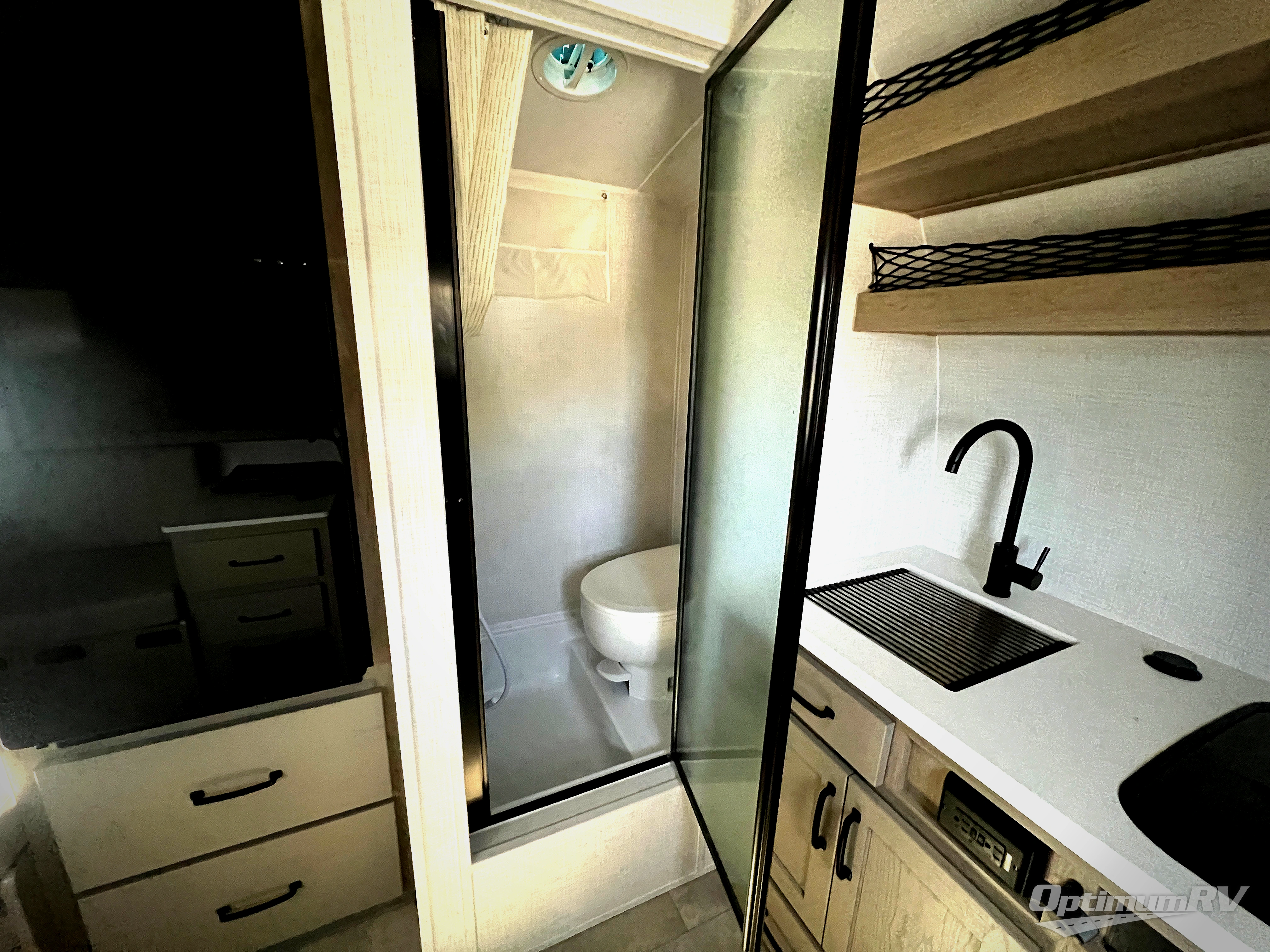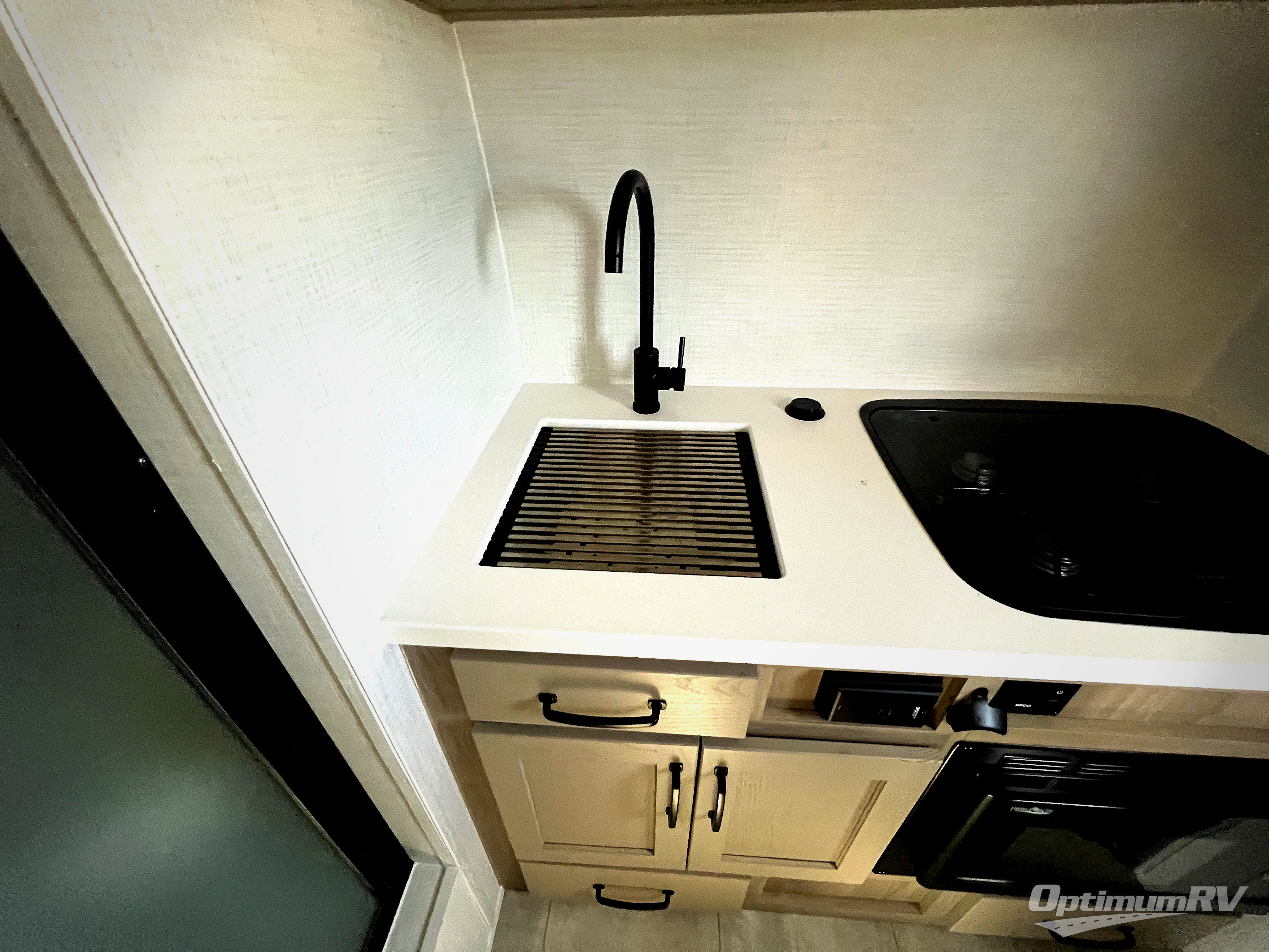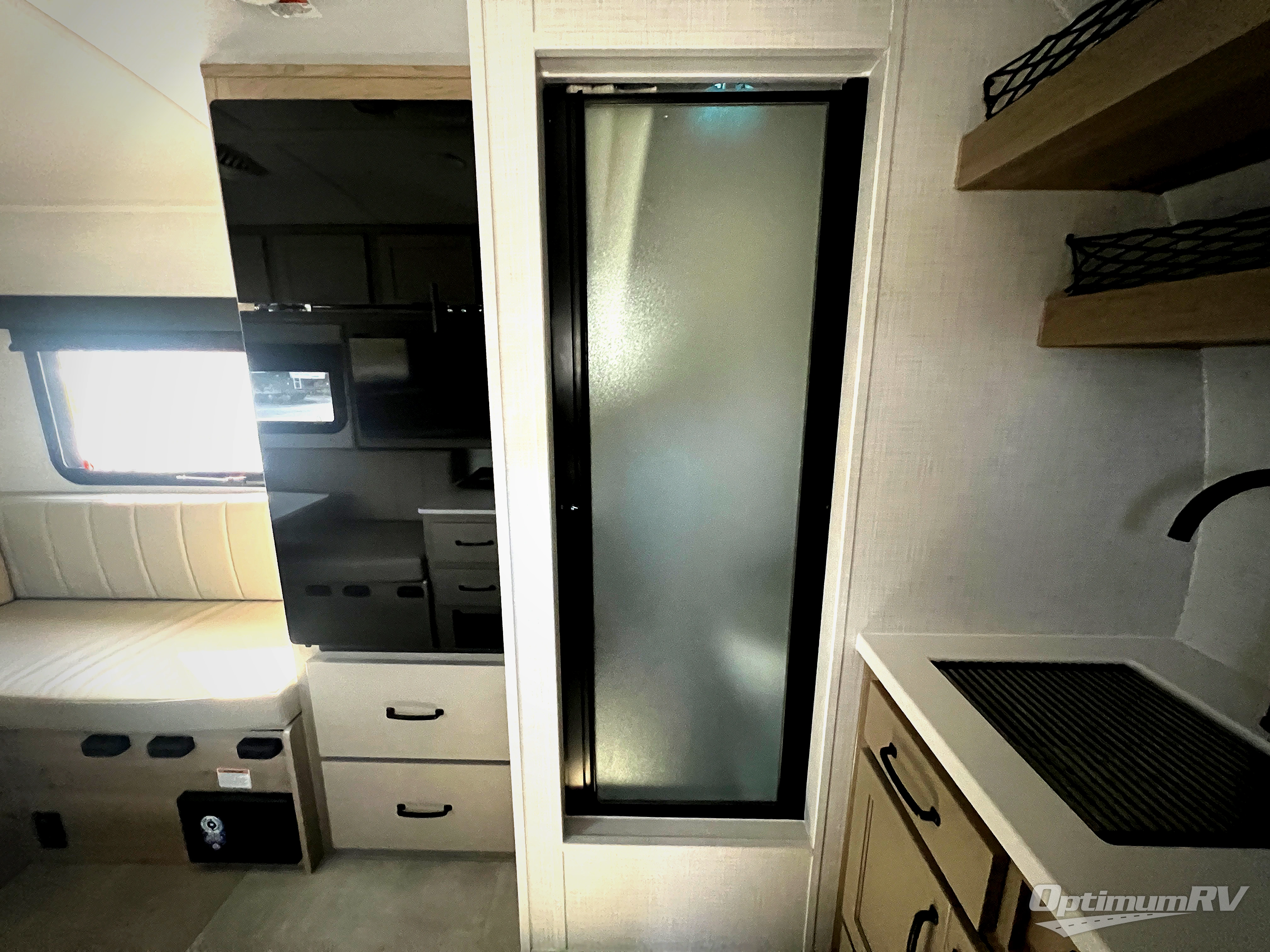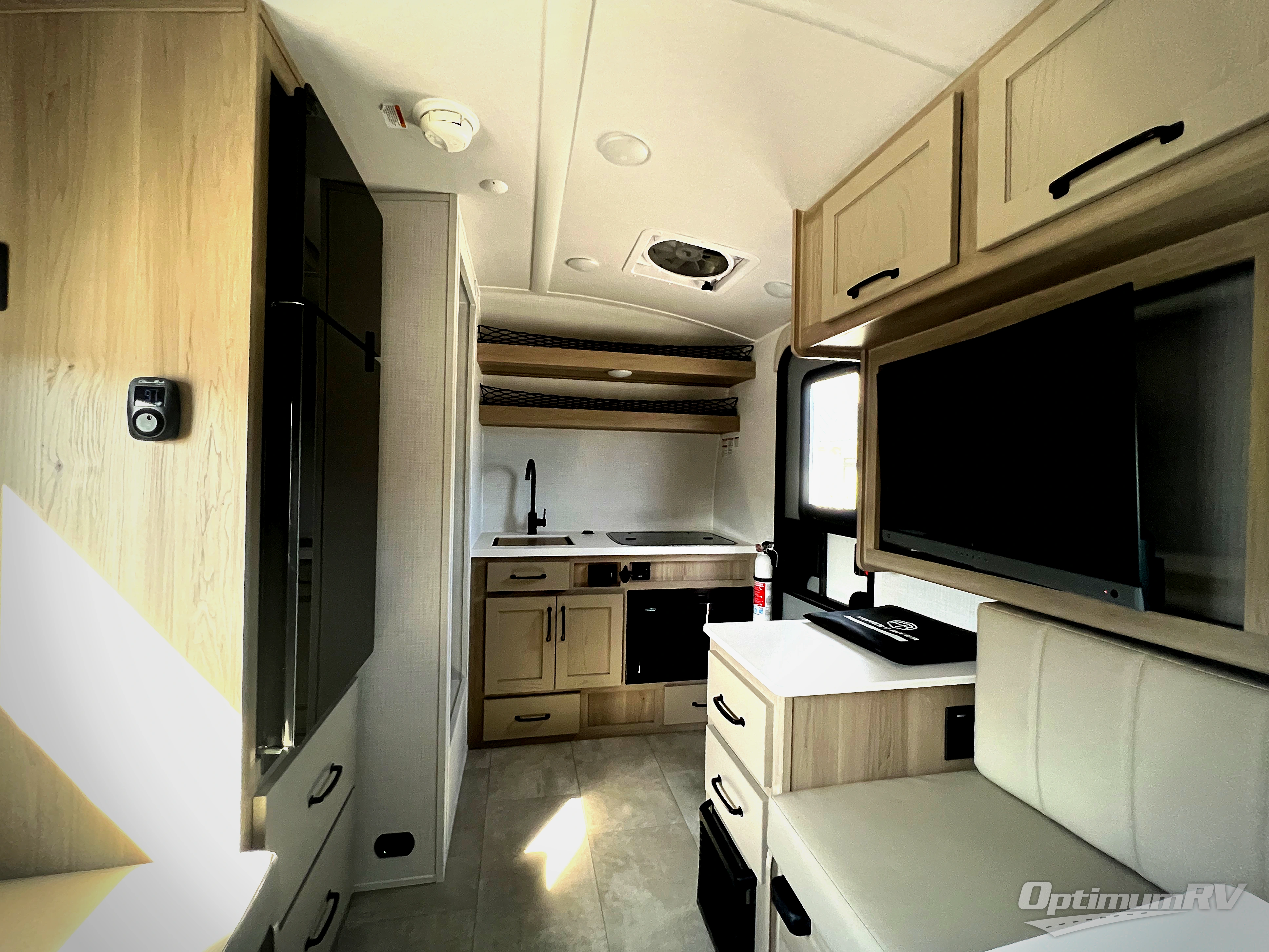 Whether you enjoy weekend trips to the woods or camping long term at the lake, this travel trailer will be perfect for your crew. There is a U-shaped dinette that can convert to sleeping space, plus a 26" x 74" bunk for an additional guest or two. You can prepare meals each day on the recessed cooktop or in the gas oven, and there is a 12V refrigerator for perishables. This model also includes an outside griddle, a 2" receiver hitch, plus a pass-through storage for fishing gear!