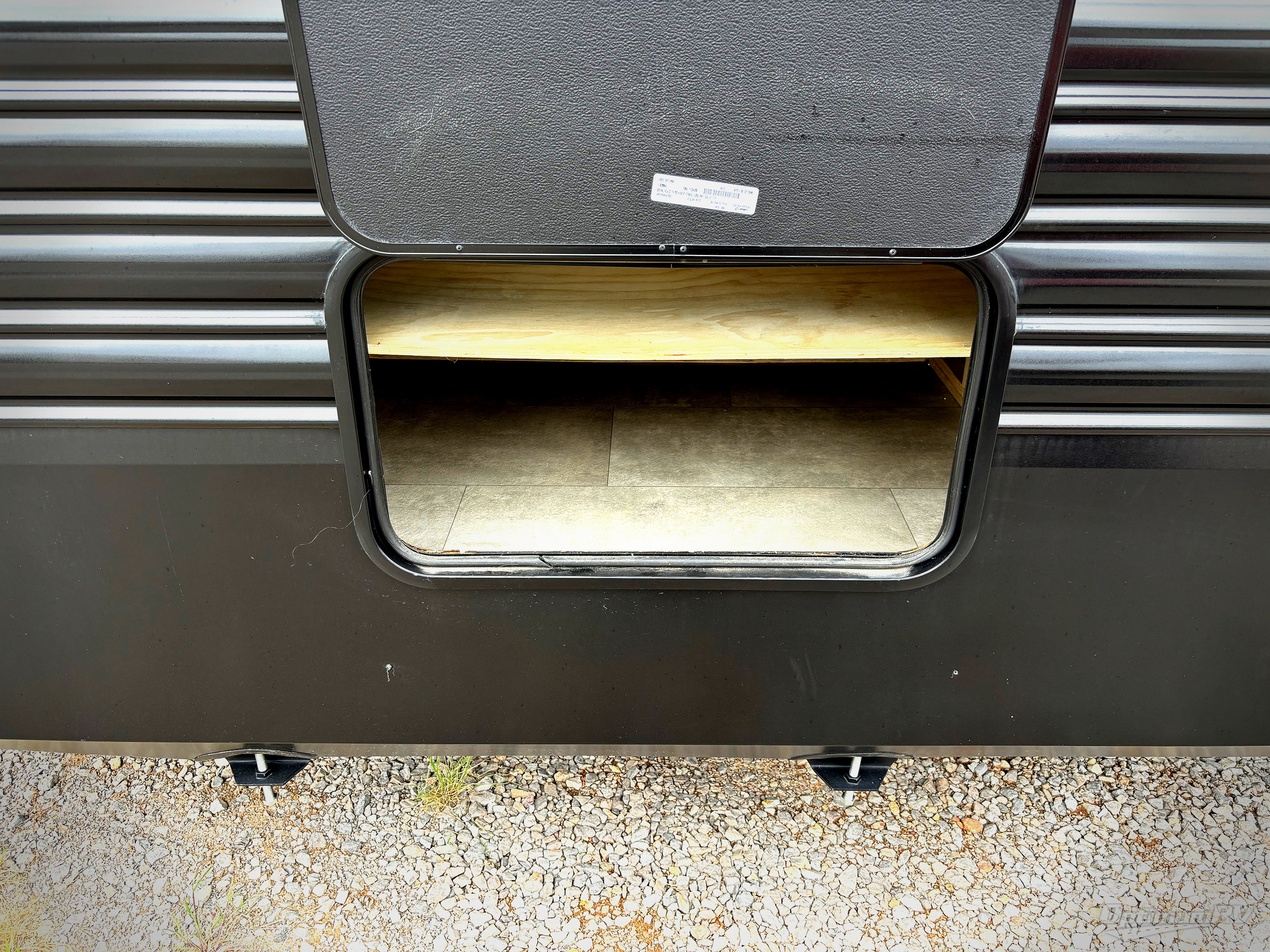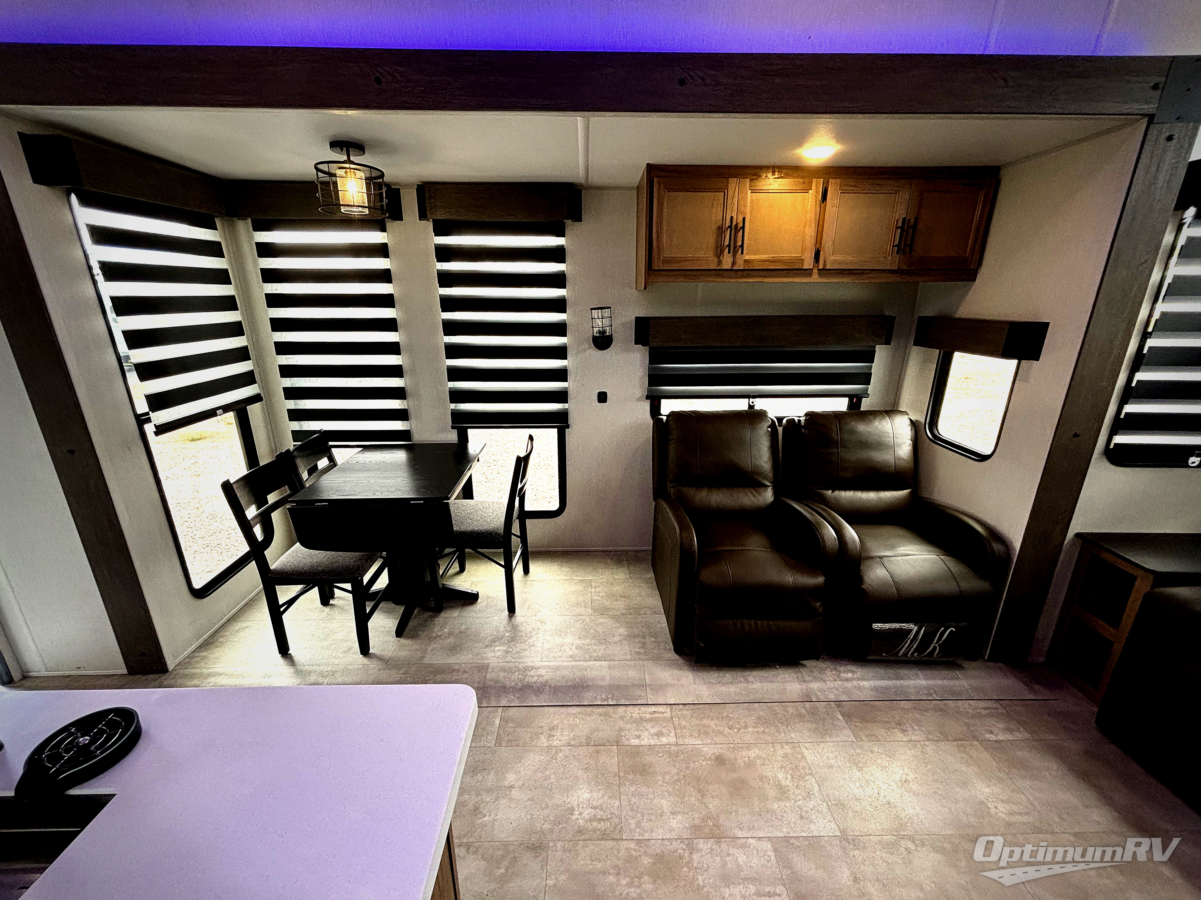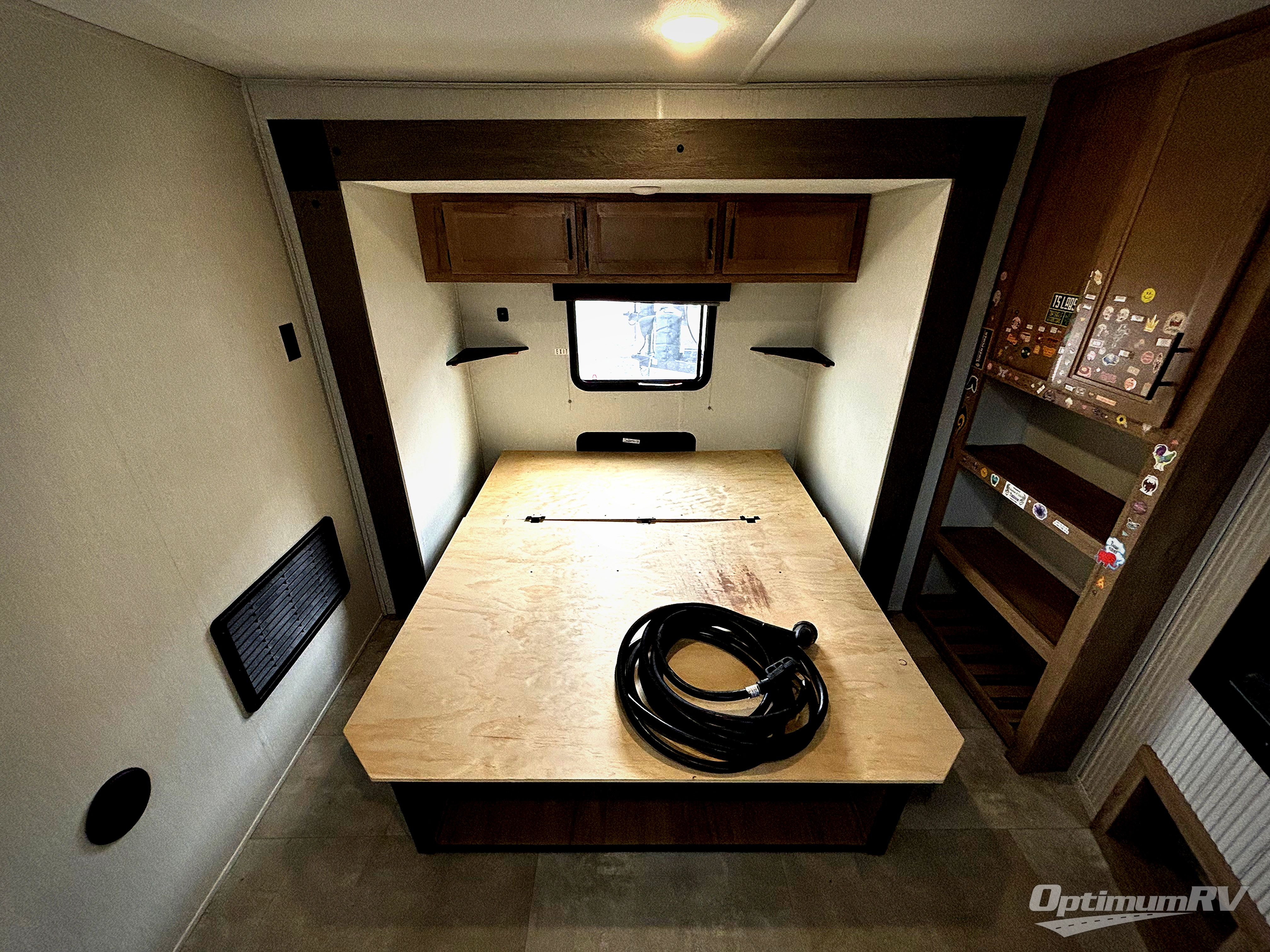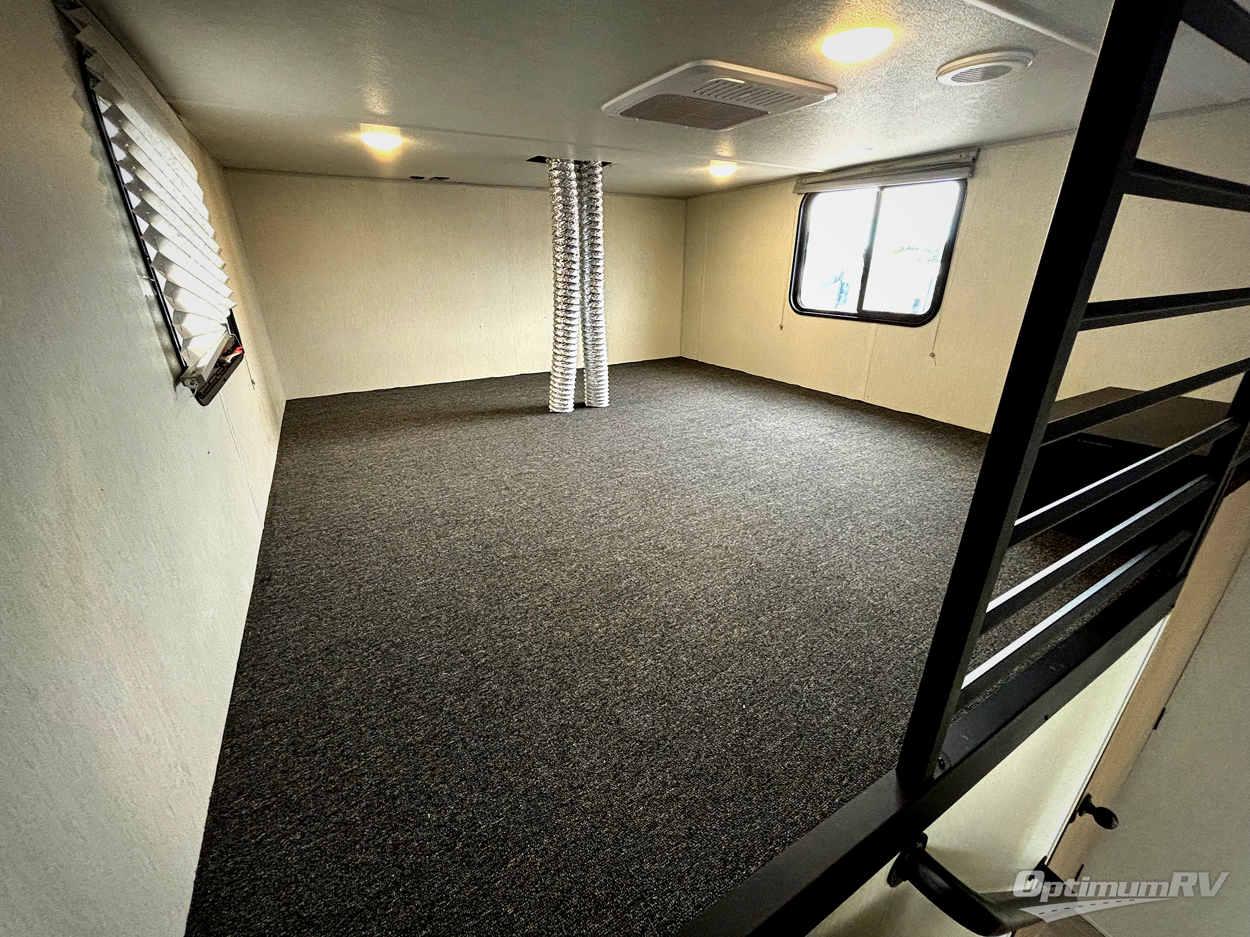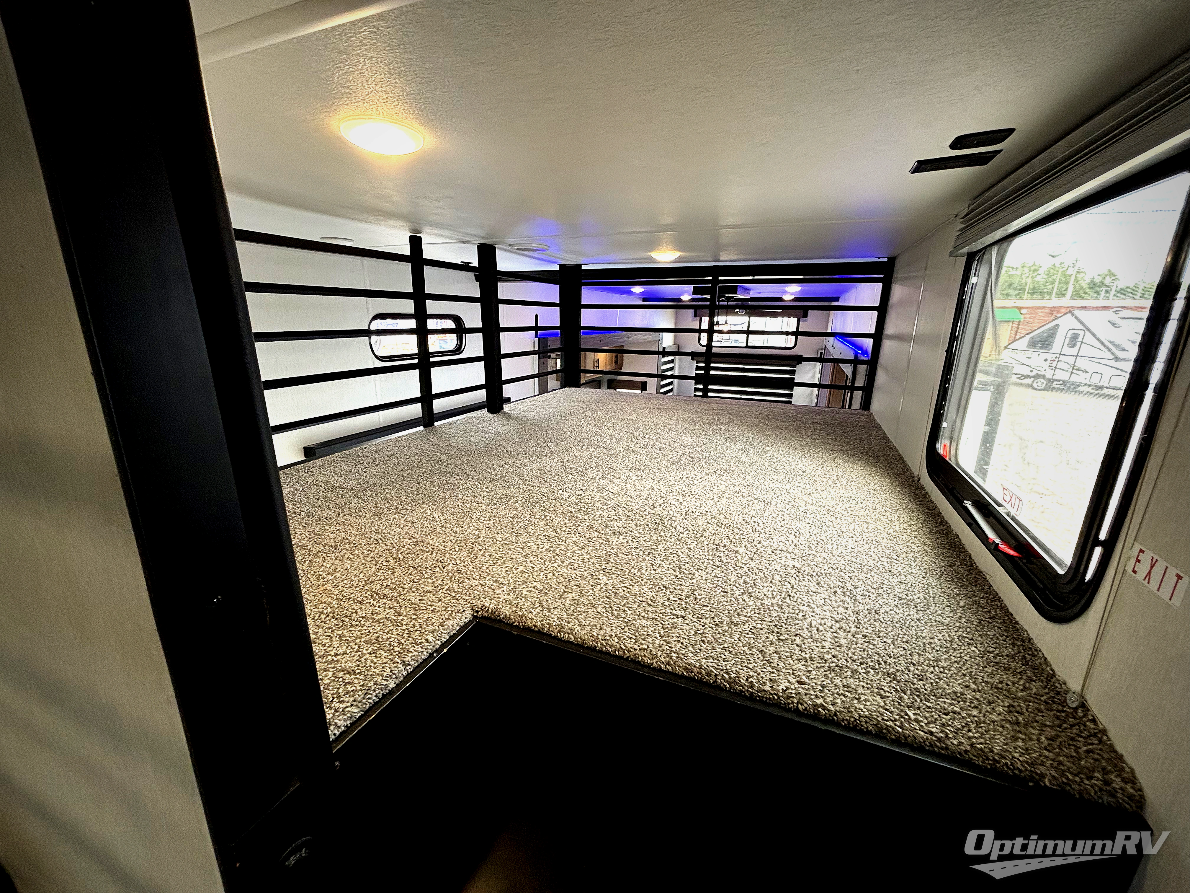 This destination trailer is an excellent and accommodating trailer that will make you feel right at home as soon as you enter through one of the two entry doors. The front private bedroom has a king bed slide and lots of storage with a wardrobe and a linen closet. There is also an entertainment center where you can add your own TV and the bedroom even has a second exterior entry door so that you can come and go as you please. Above the bedroom is where the huge loft is located. When you take the stairs up to the loft, you'll find two 36" x 74" bunk mats, cabinets, and a large open area with a railing. The main living area has a free-standing dinette with chairs, theater seats, and a hide-a-bed sofa, so you will have plenty of seating as you watch the main entertainment center.