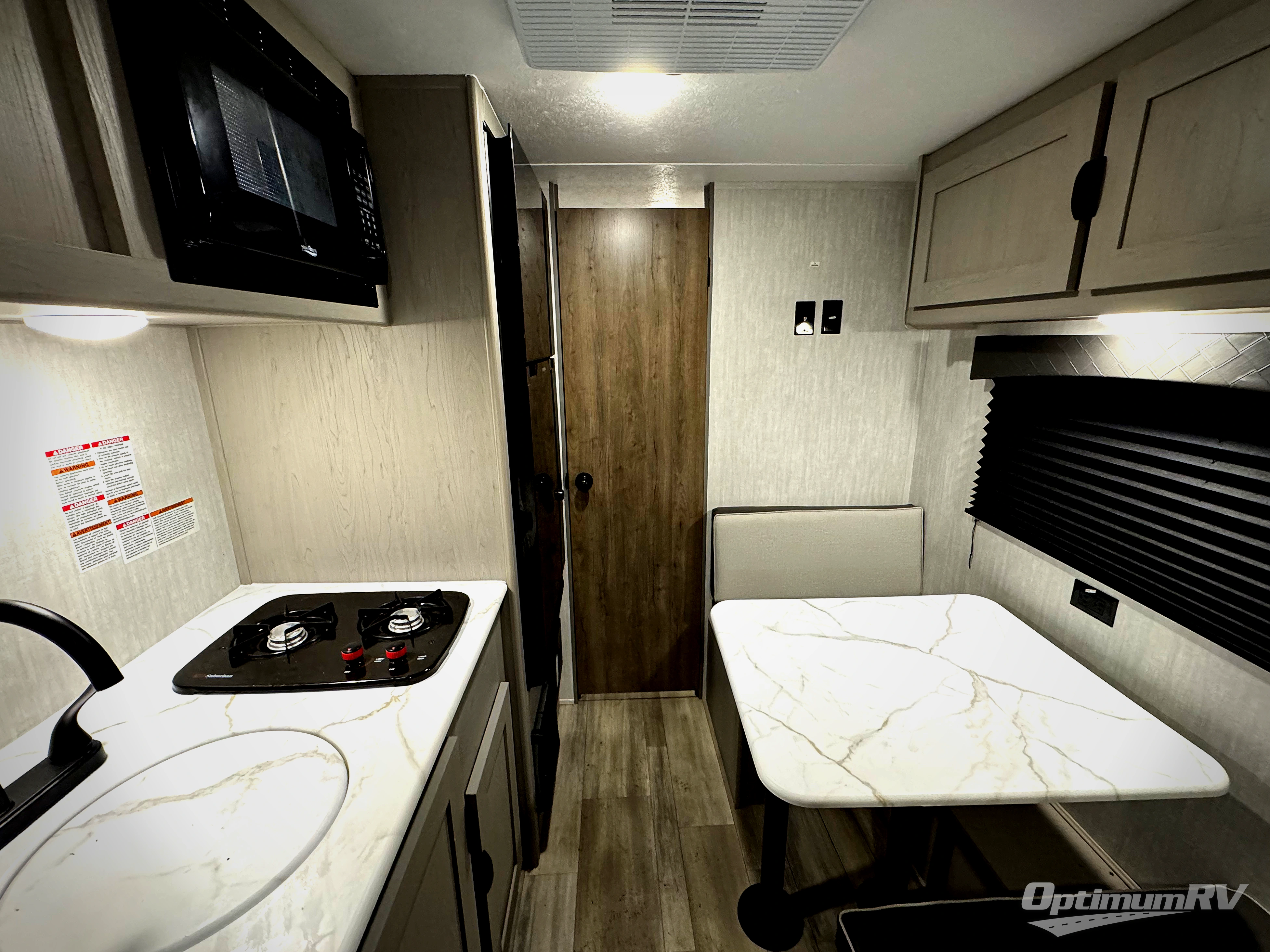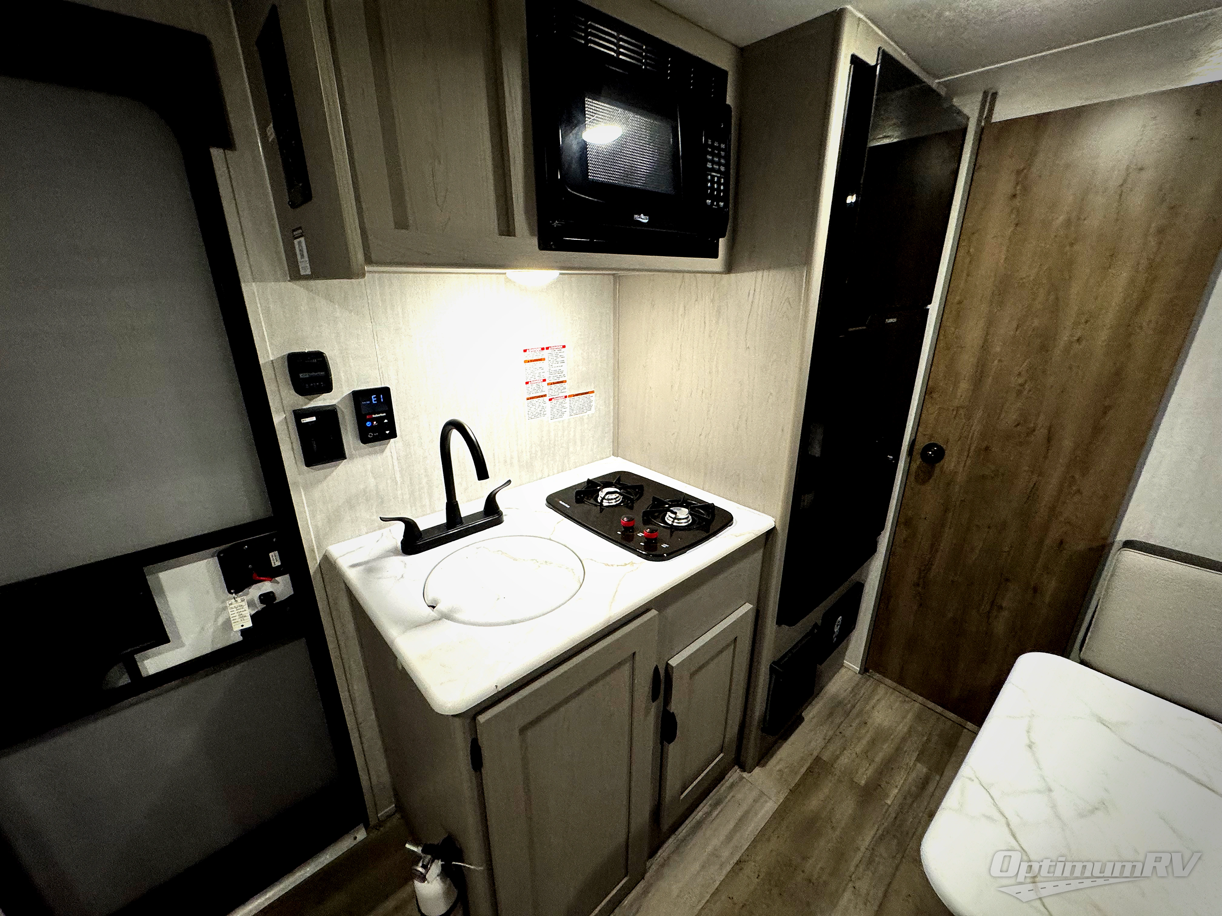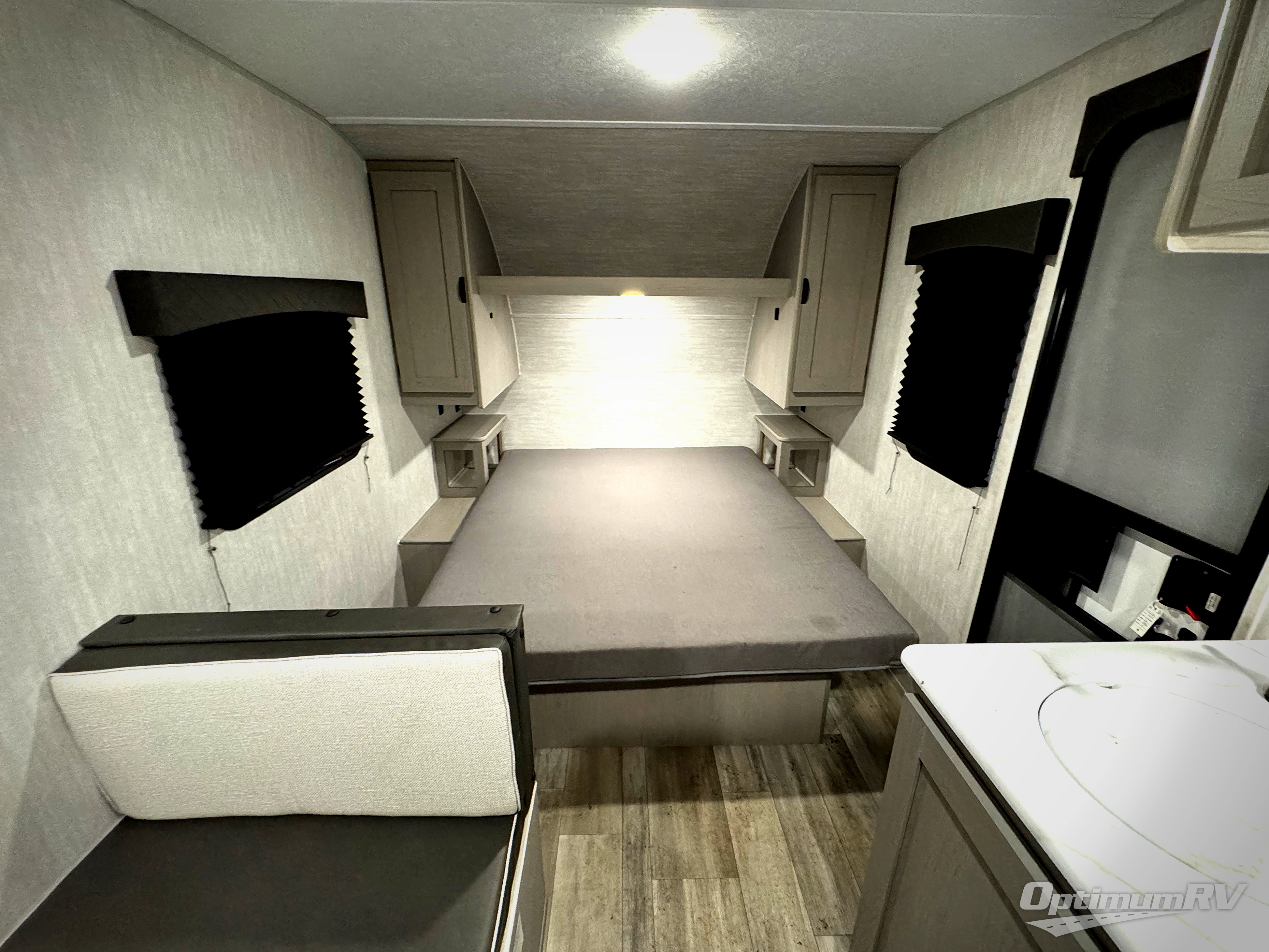 This Viking 3K Series is a cozy couples trailer or one perfect for a small family of three or four featuring a queen bed up front with overhead storage. The booth dinette also features additional storage and can be converted to sleeping space for one or two more depending on size. You will have an induction cooktop and sink with cover to provide a bit more counter space when the sink is not being used. A rear full bath including a 24" x 36" shower, toilet, and vanity with a sink, as well as an overhead medicine cabinet for your toothbrushes and other toiletries. On the outside, a 10' power patio awning will provide added protection from the sun and rain giving you added living space outside to enjoy with camp chairs. And, a front pass-through compartment for your outdoor camping gear, plus so much more!