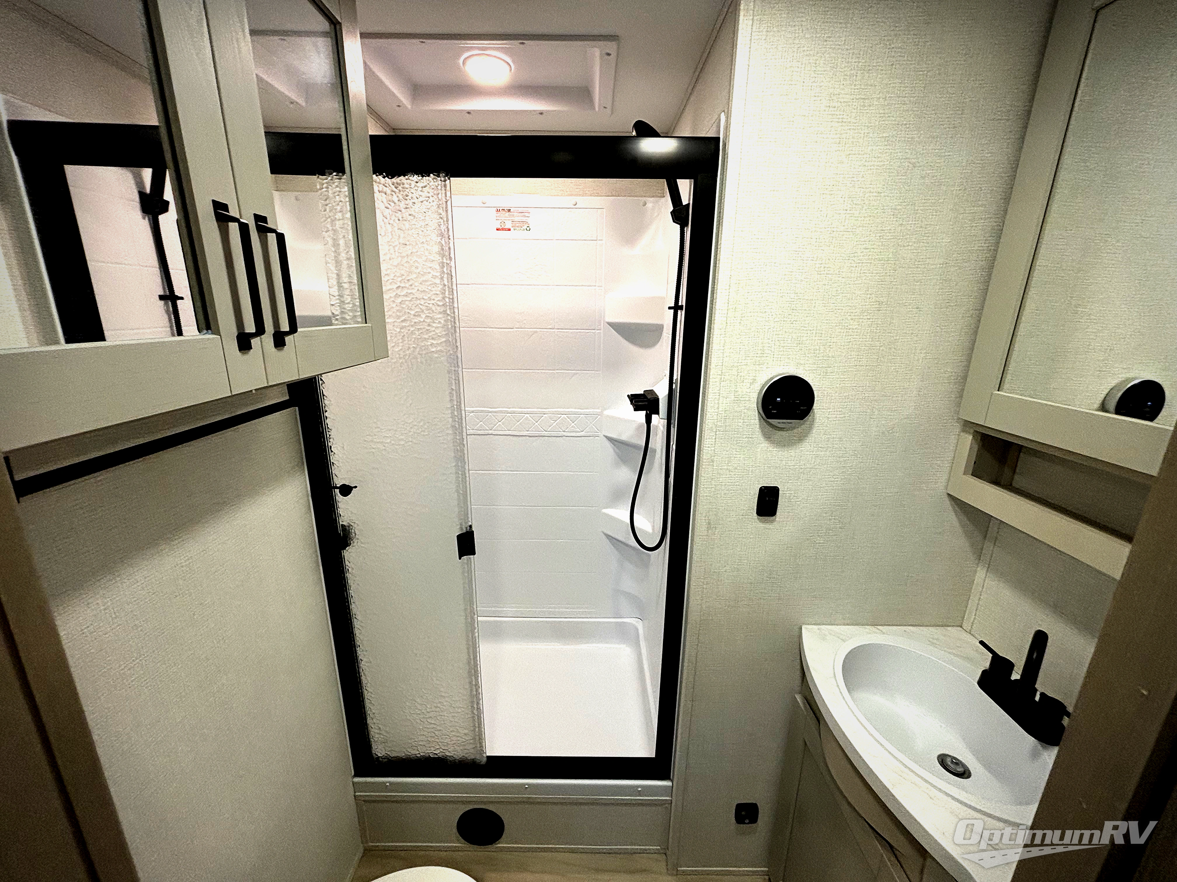 This rear living travel trailer will be perfect for extended stays at the campground or quick weekend trips to the lake! Once you've unloaded your gear from the pass-thru storage, head inside to relax on the rear tri-fold sofa with an adjustable headrest or on the theater seating across from the 40" TV and fireplace. There is also a booth dinette where you can dine together, or you can choose the optional swivel dinette. The spacious kitchen island will make meal time easier than ever, plus there is a pantry and 16 cu. ft. 12V refrigerator for food storage. The full bath is right next to the front private bedroom for easy nighttime use, and speaking of nighttime, you're sure to sleep soundly on the queen bed slide. There is also a large front closet, TV prep, plus washer and dryer prep if you choose to add these appliances.