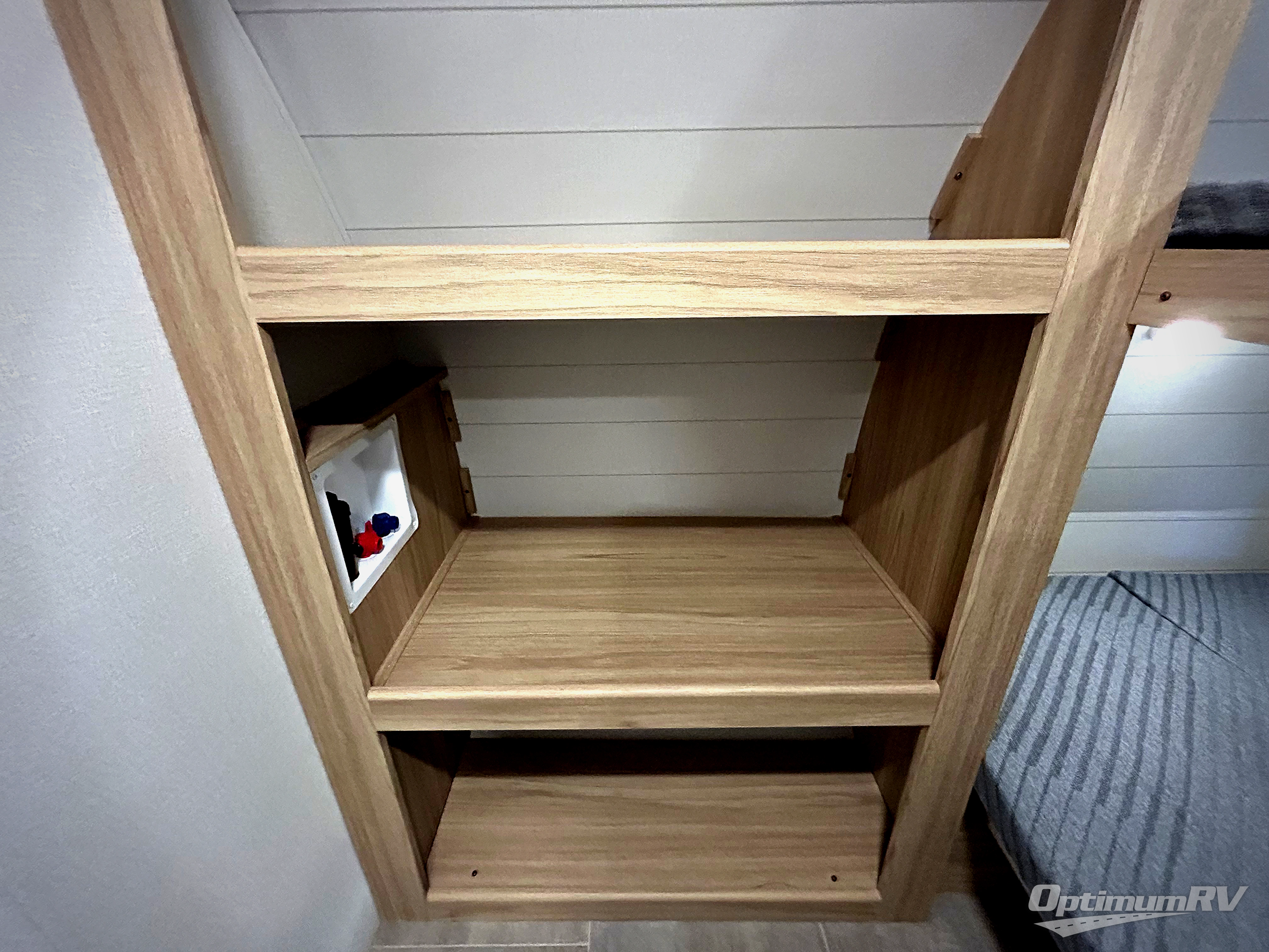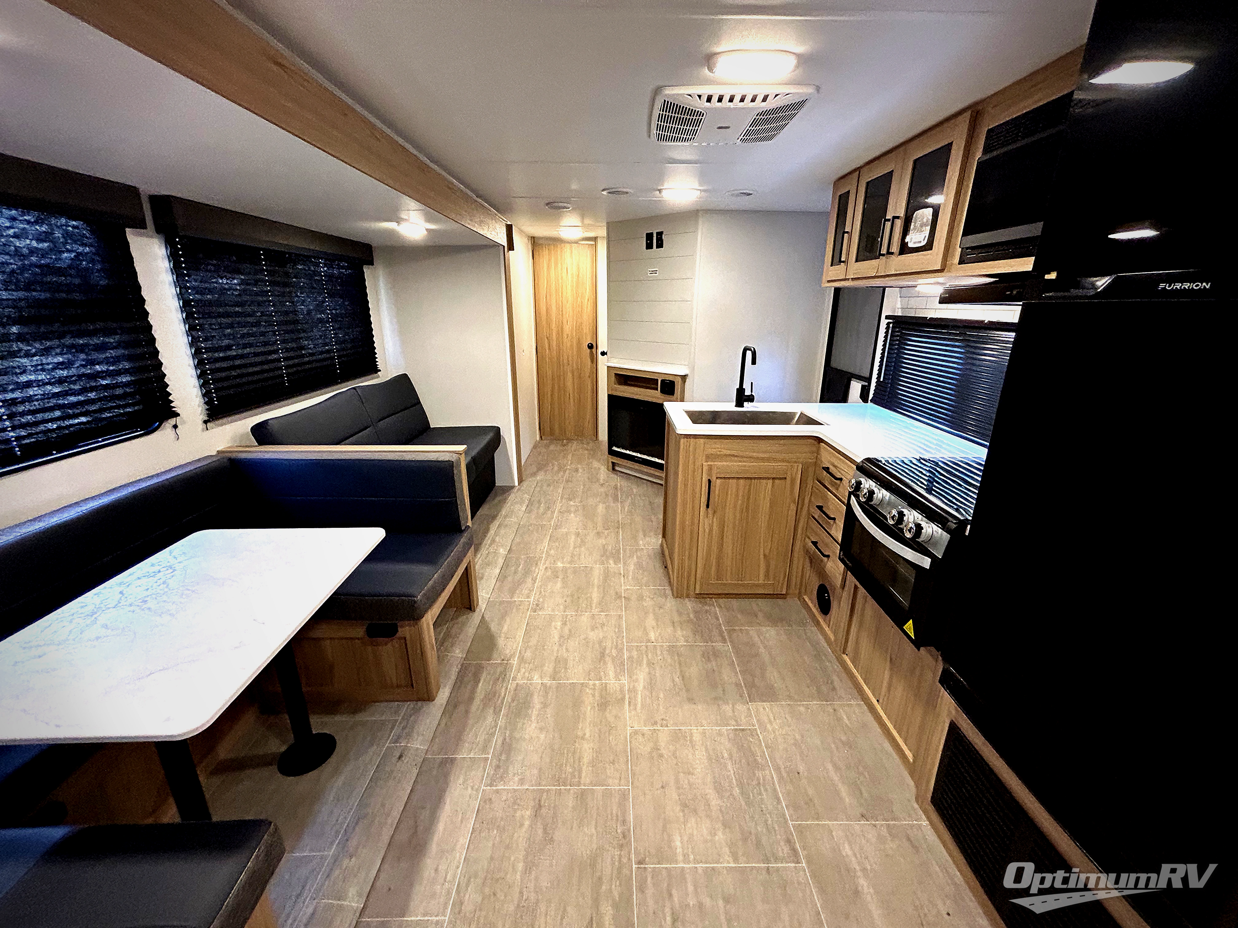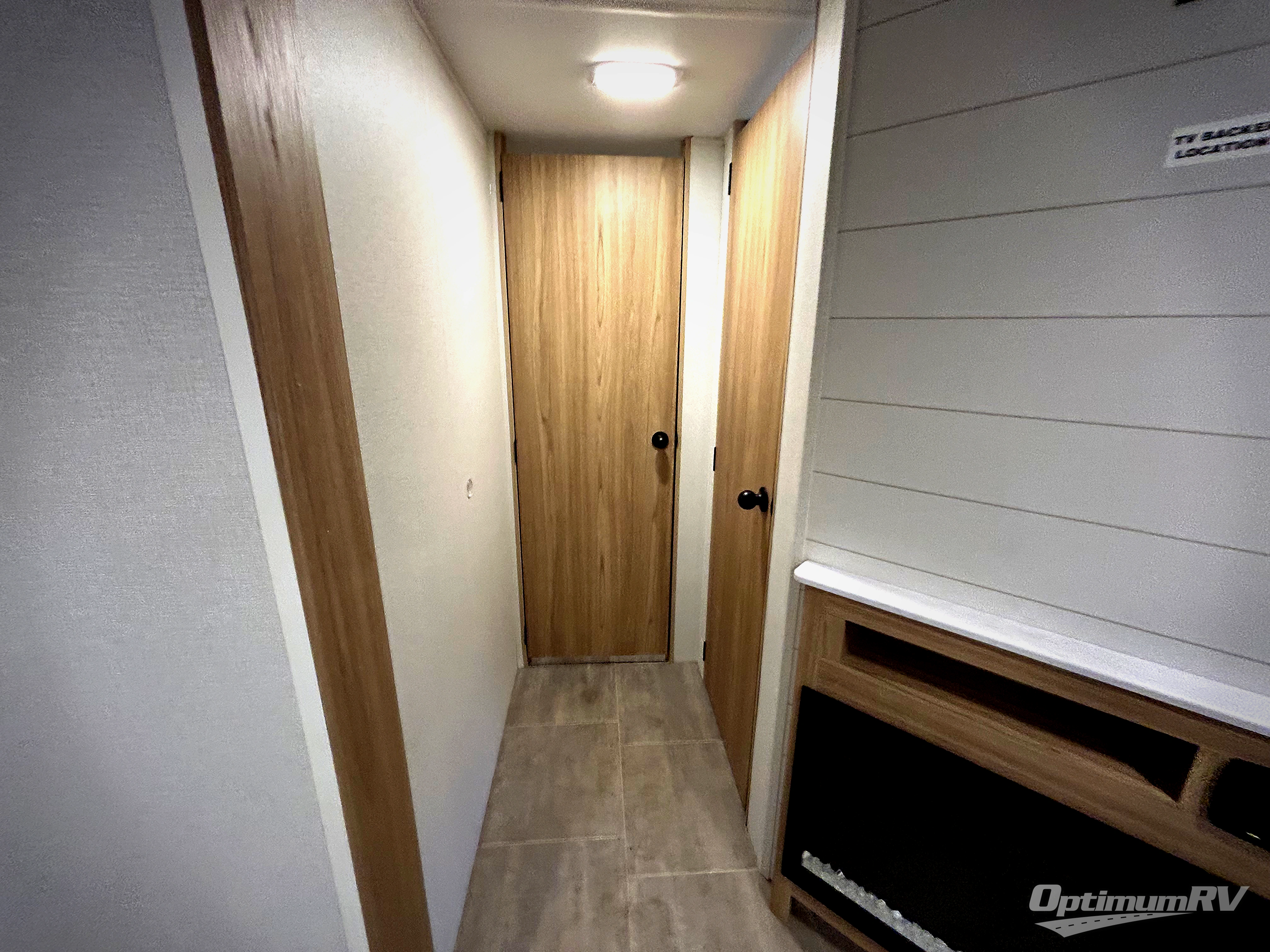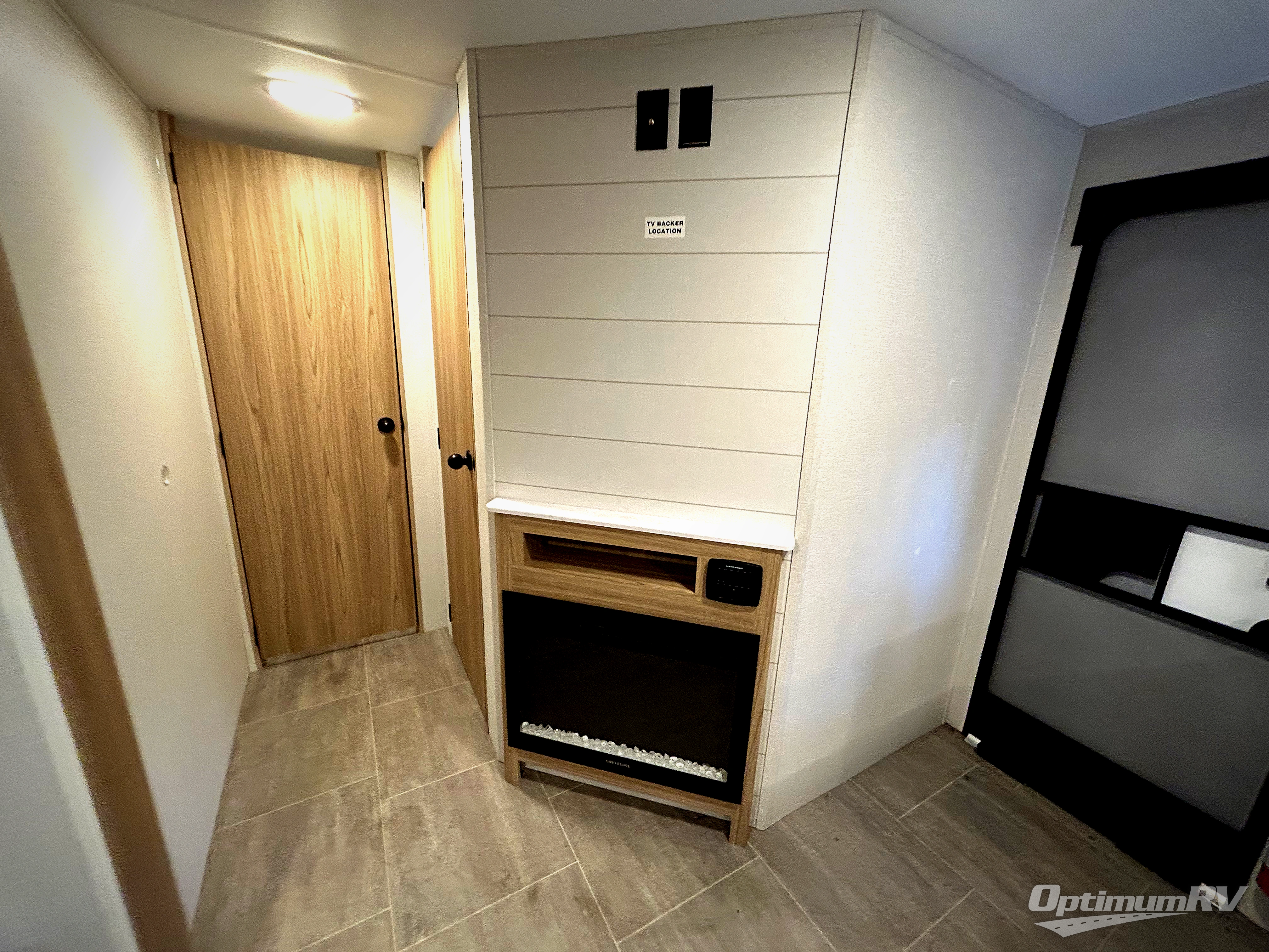 Camping just got a whole lot sweeter in this double slide out travel trailer for nine people. Your guests can stay in the front private bunkhouse that includes double-size bunks with removable lower bunks so you can easily pack in gear! You will enjoy the rear private bedroom with a queen bed slide out, a wardrobe, plus a dresser with TV prep. The main living area is spacious with its large slide out, and everyone can dine around the U-shaped dinette. There is also a sofa here and an entertainment center with a fireplace. Bring your own TV and you're ready for movie night! And check out the outdoor kitchen with a griddle for a pancake breakfast!