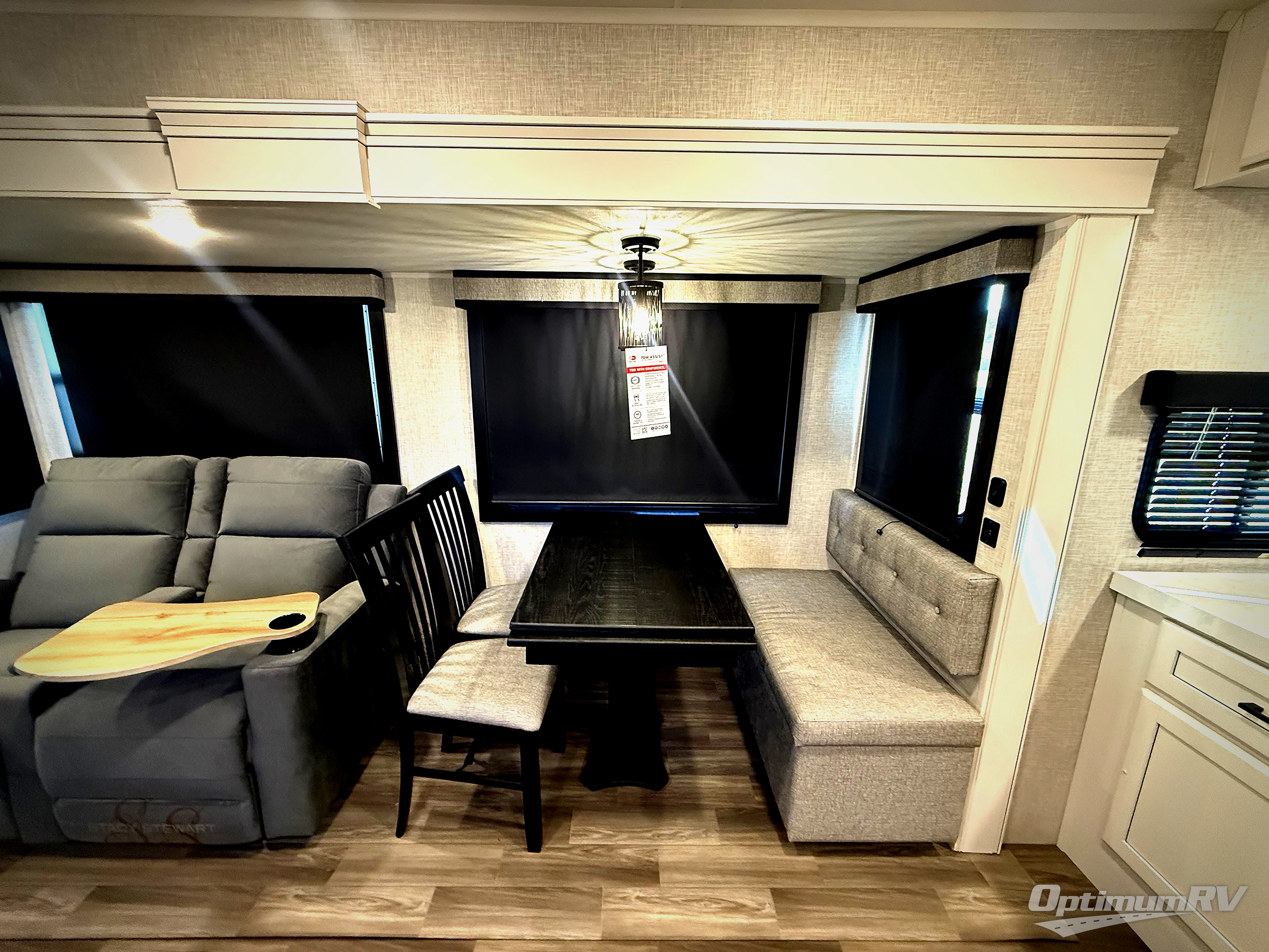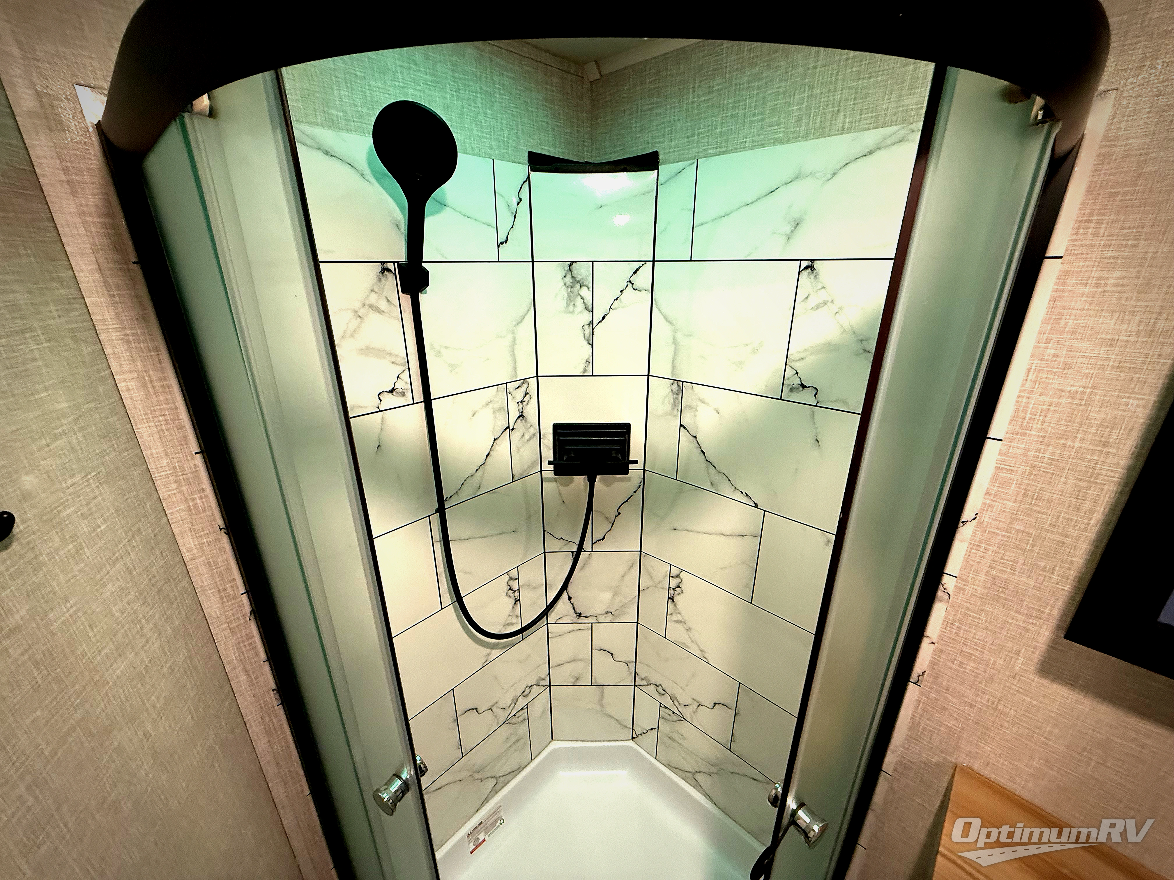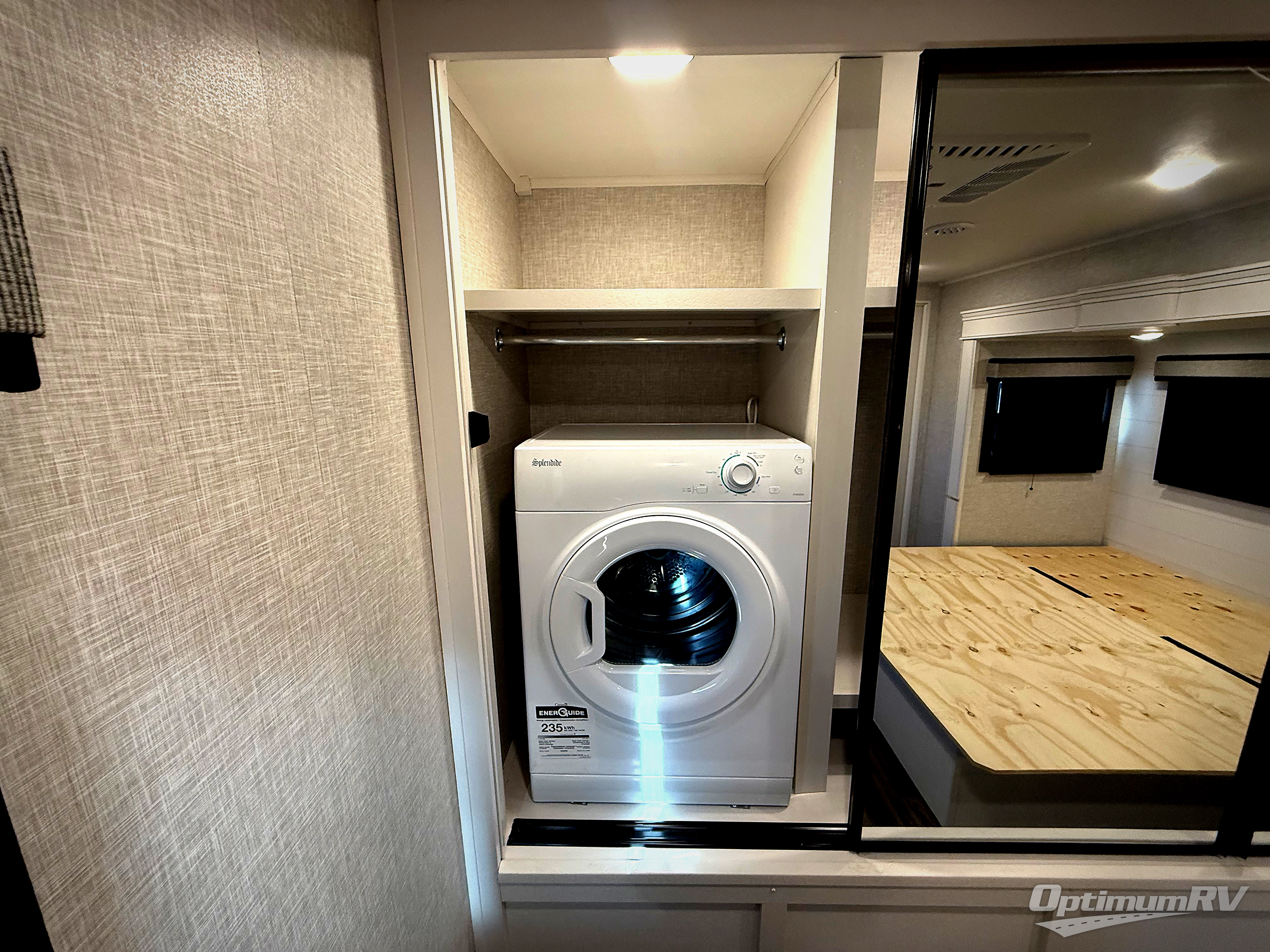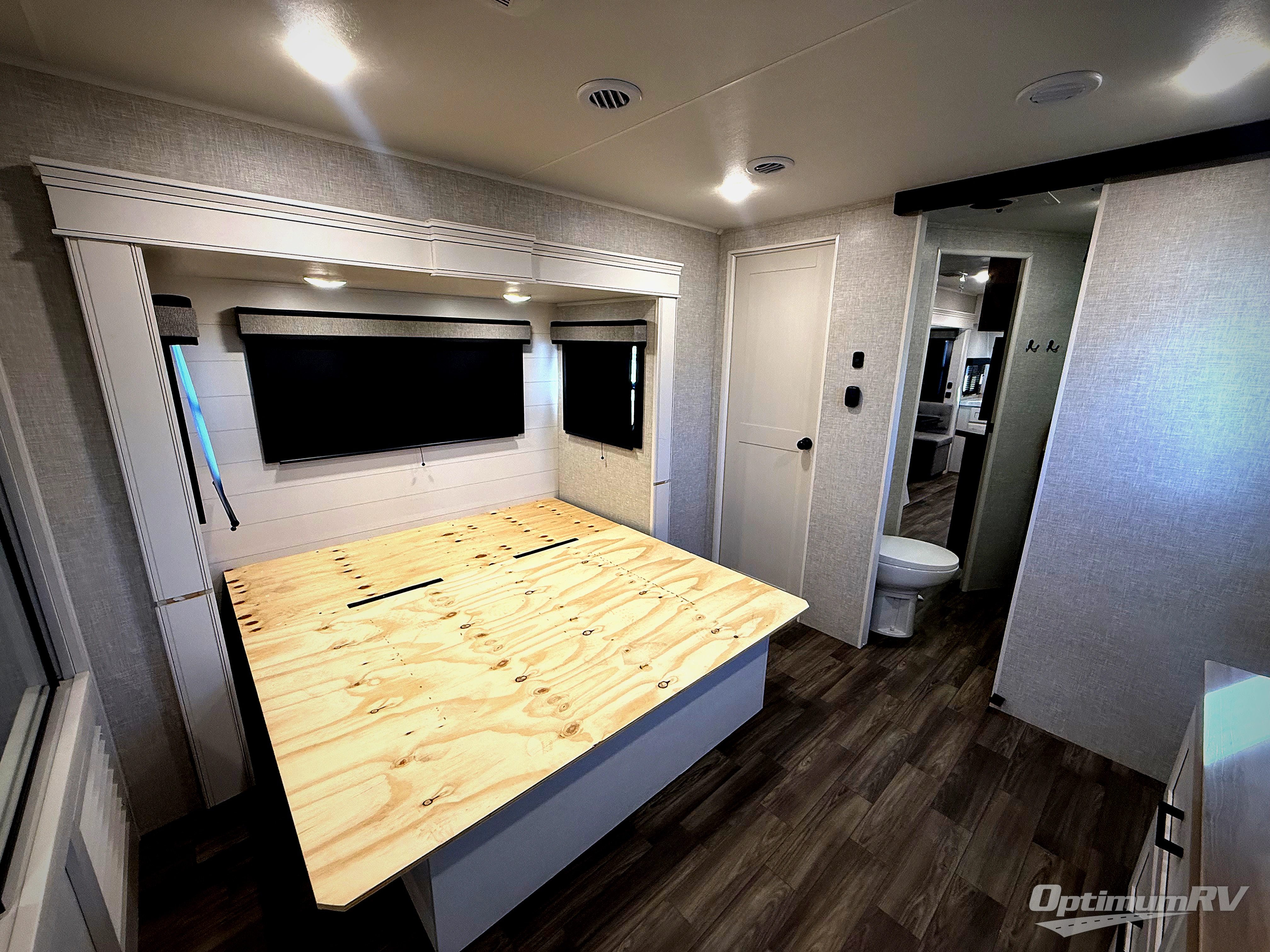 Escape the busyness of life for tranquil trips to the campground with this trailer. You will love the front kitchen with generous counter space, GE appliances, and a pantry by the entryway that can be used for food and more. If you're all hiked out, stay inside to relax on the theater seat across from the fireplace and entertainment center. There is also a free-standing table to dine at or play a game of cards. The dual entry bath will create a rear master suite, complete with a 66" x 80" Olympic queen bed across from a dresser, a private exit door, plus a full-width wardrobe with washer and dryer prep!